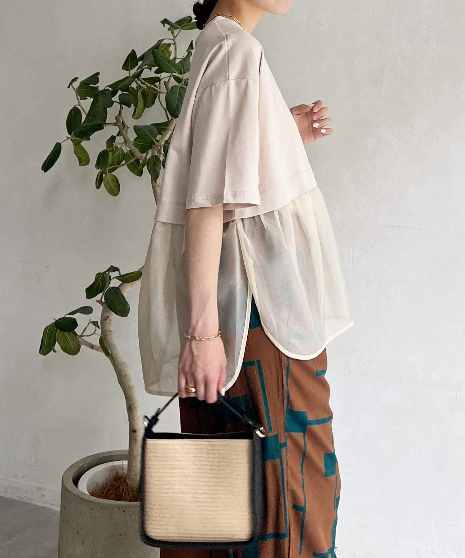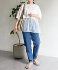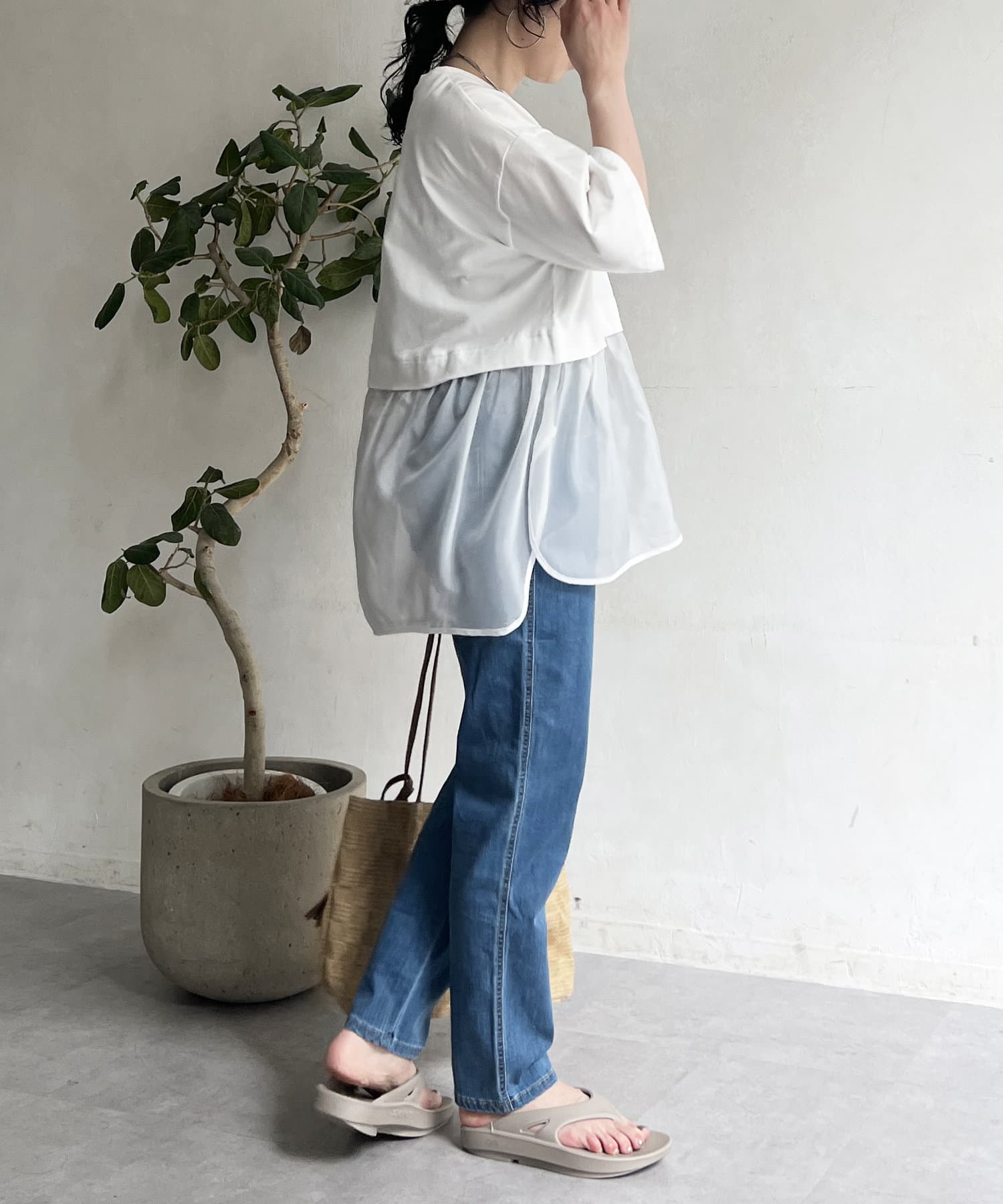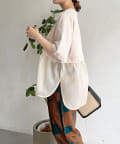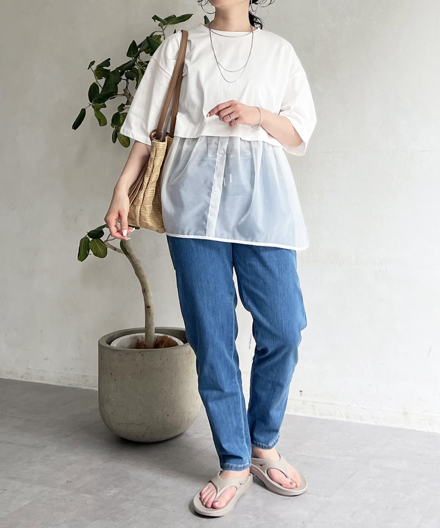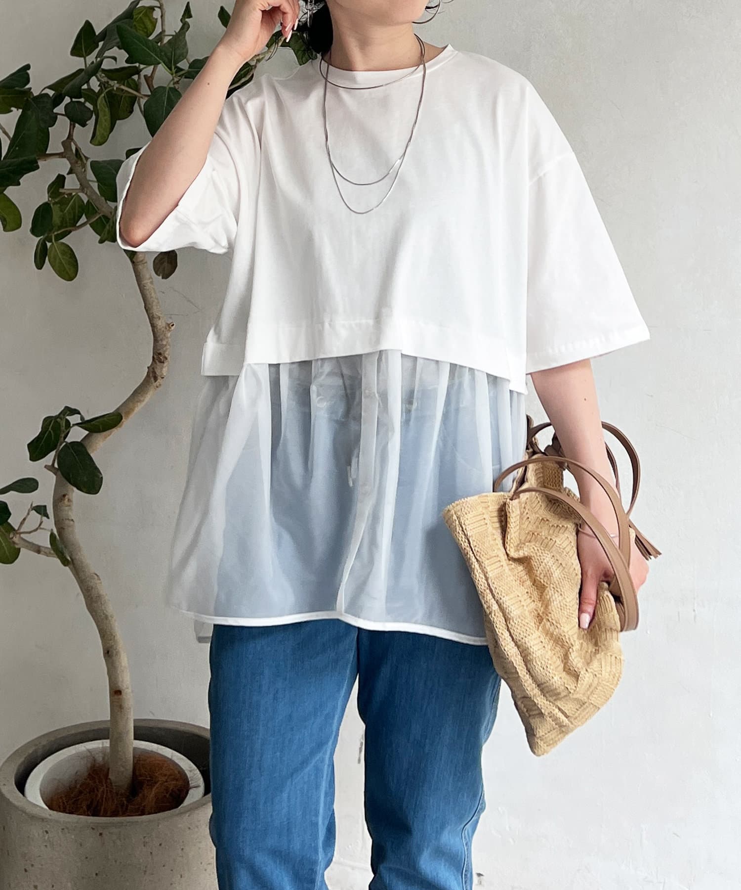 裾の透け感で軽やかさが出るので、インしなくてもすっきり見えが叶う1枚。