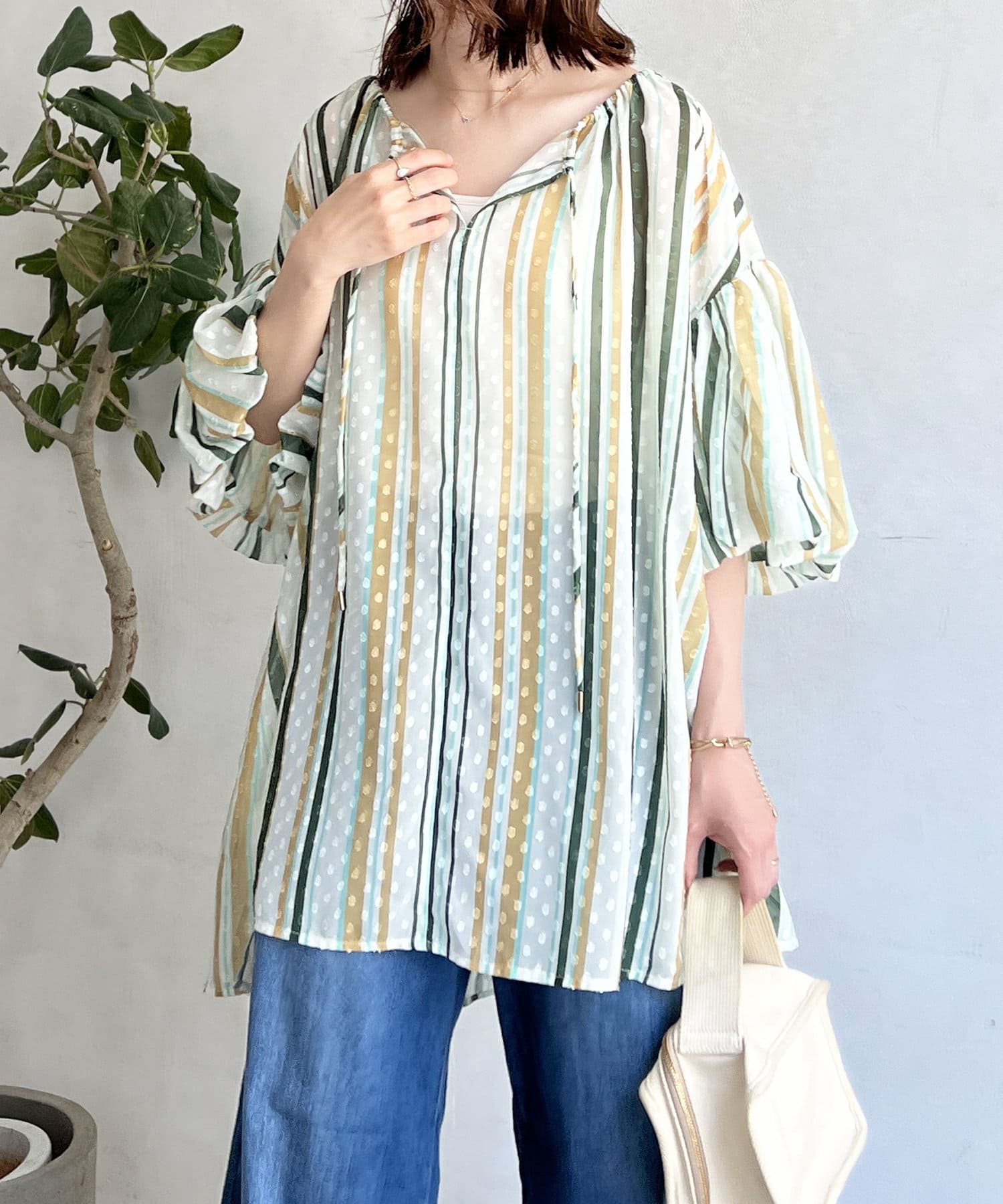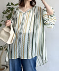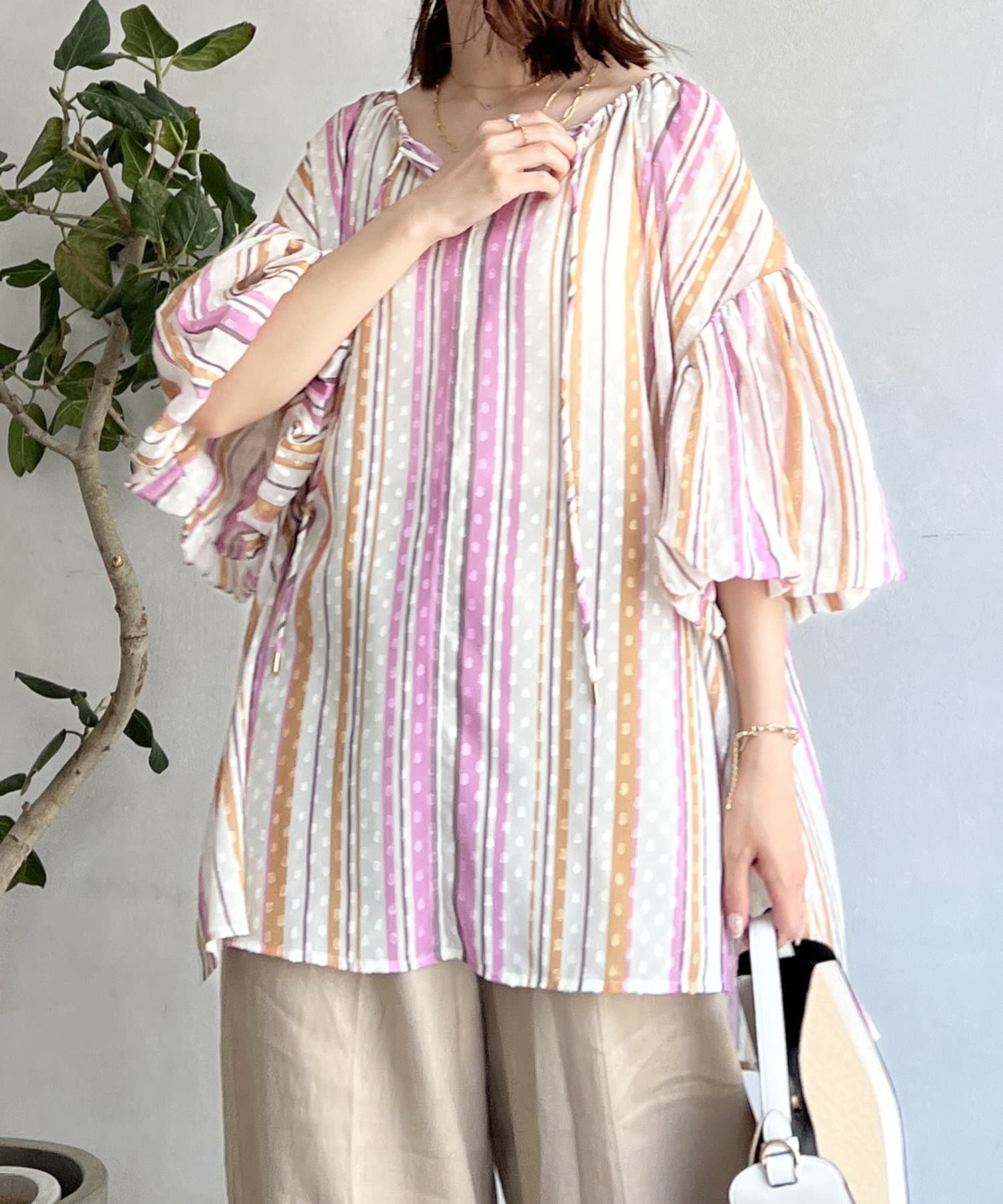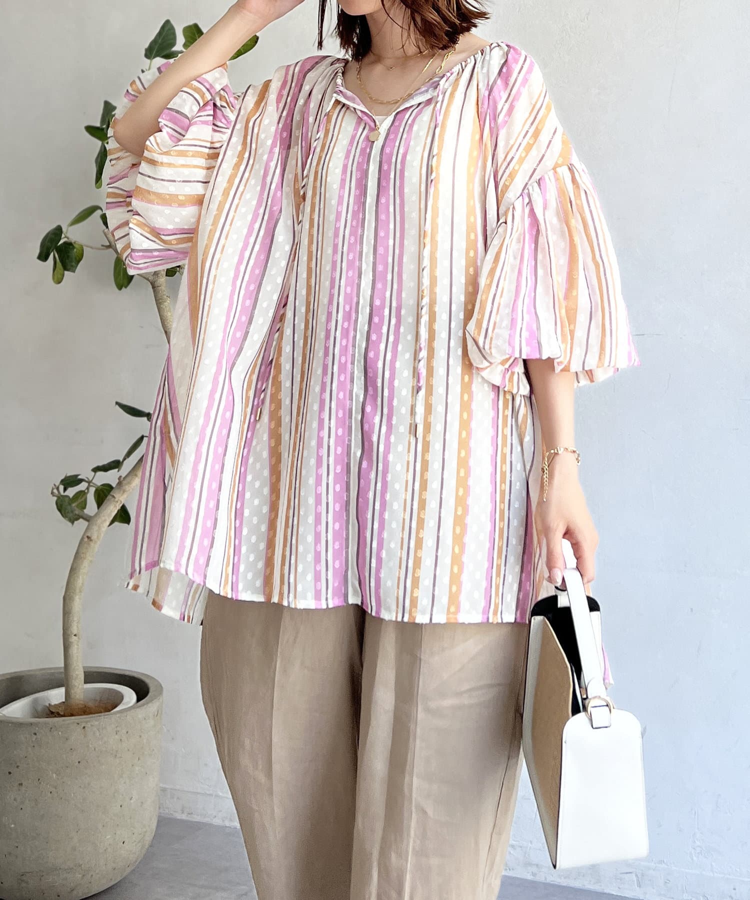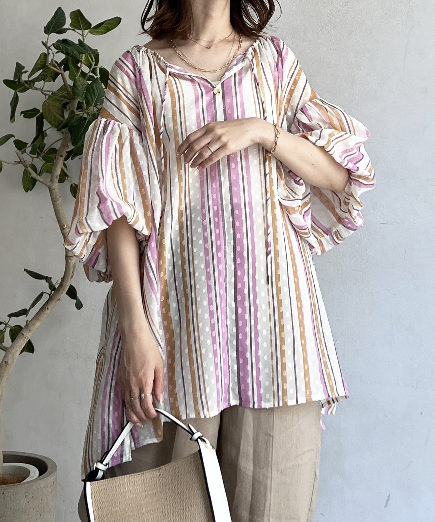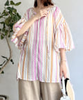 夏らしいマルチストライプが目を惹くチュニックブラウス。