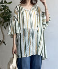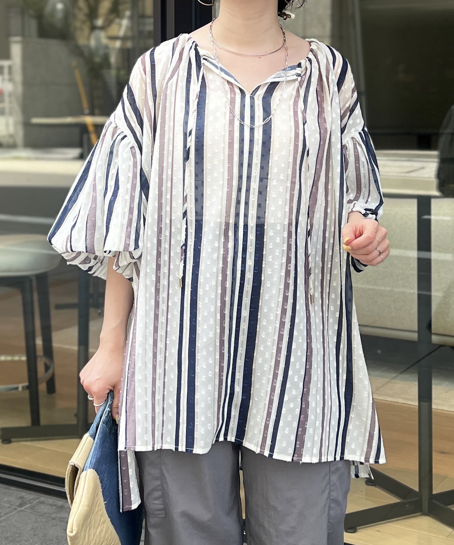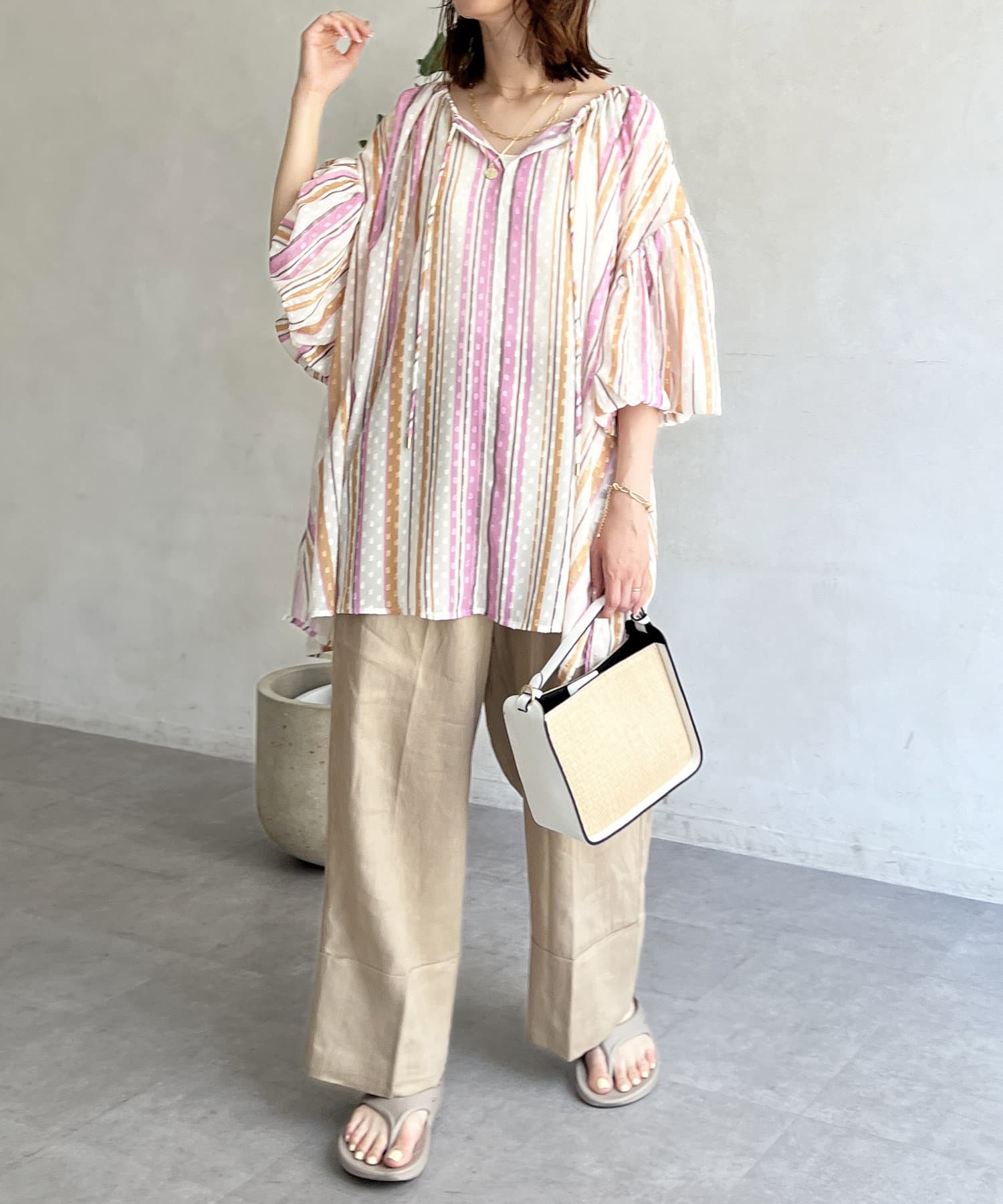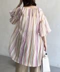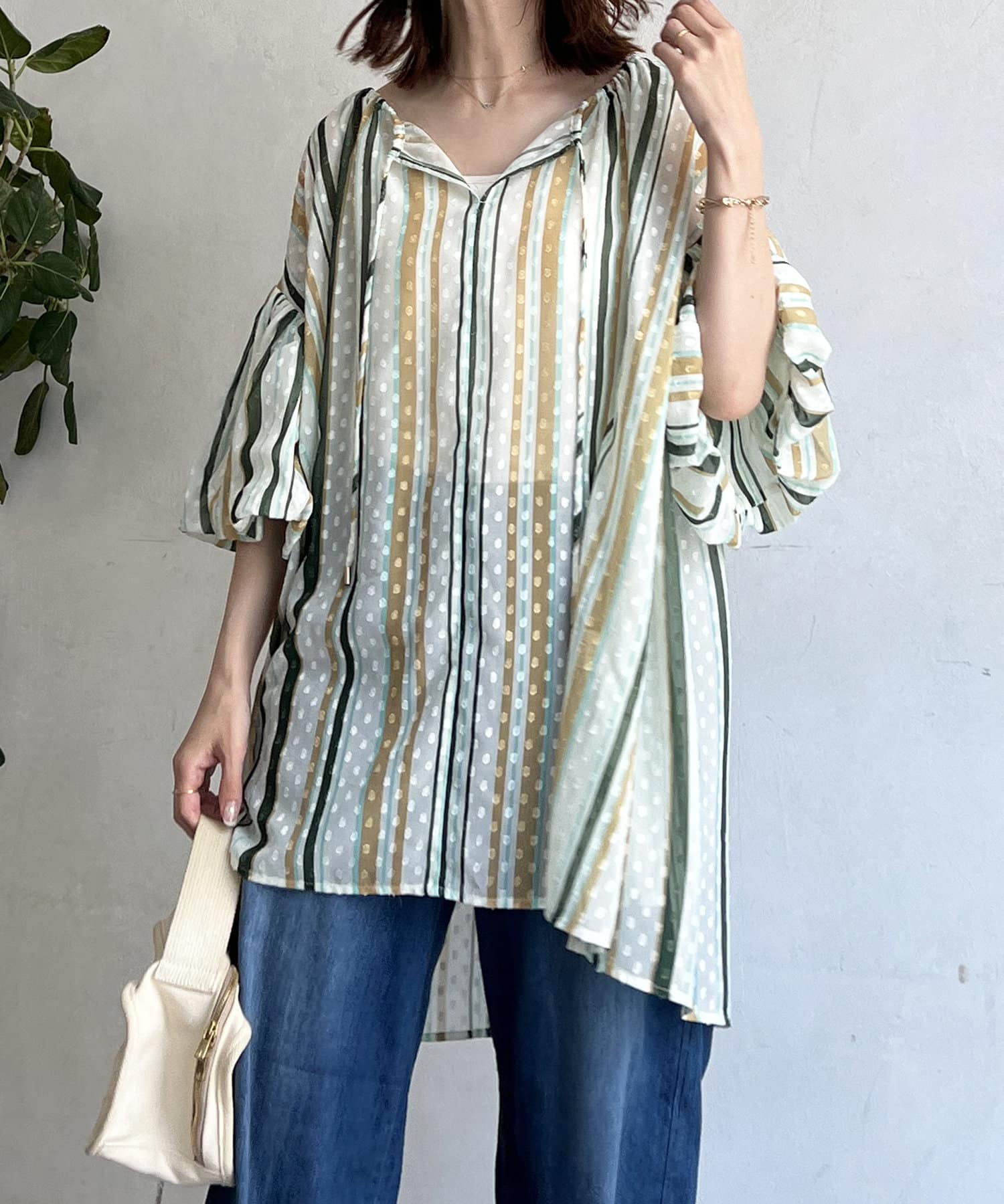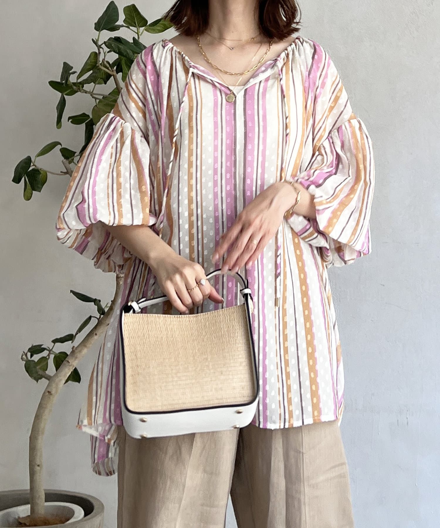 夏らしいマルチストライプが目を惹くチュニックブラウス。
