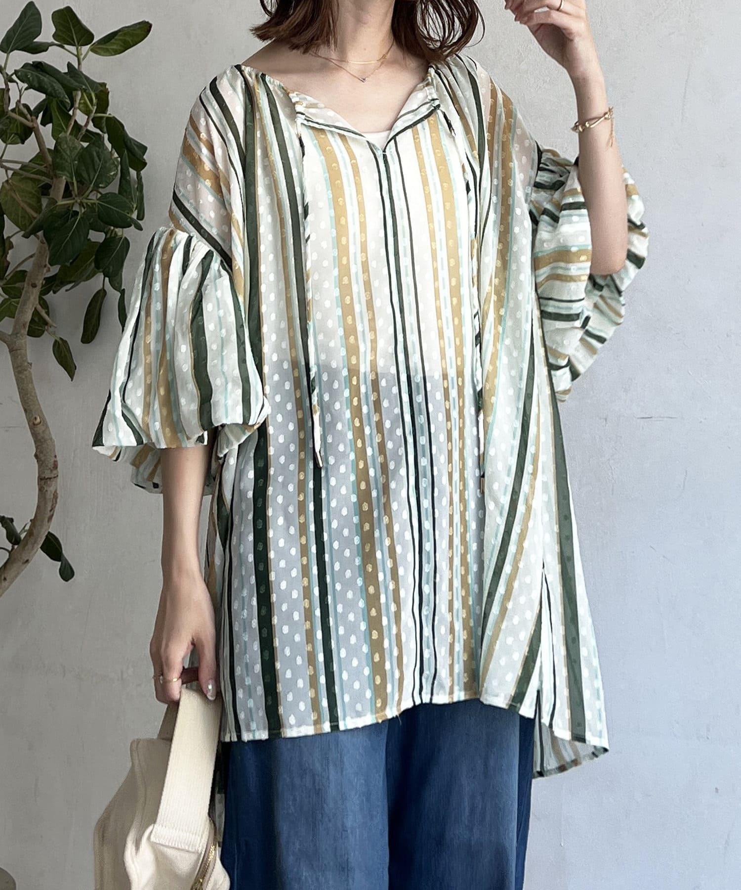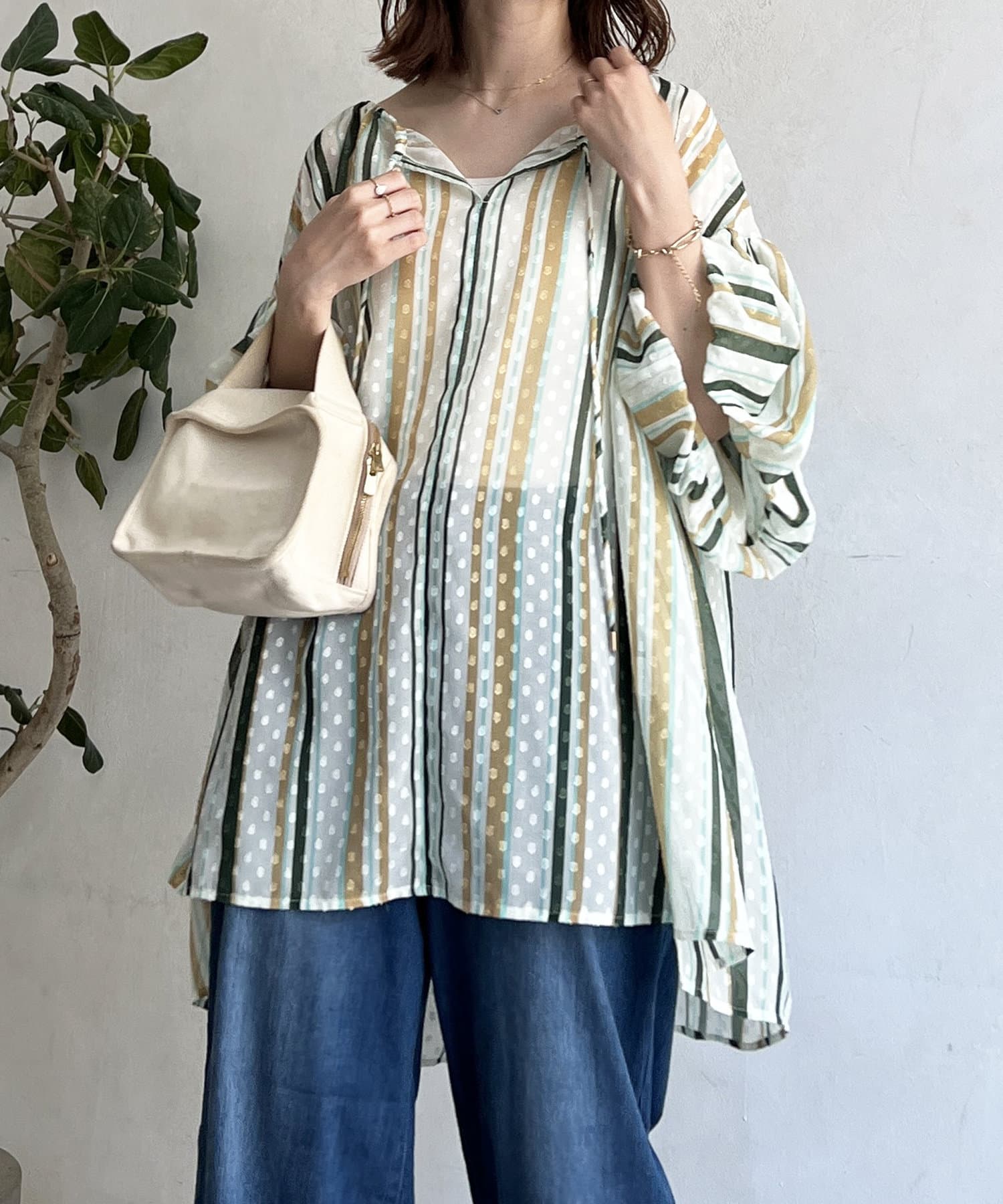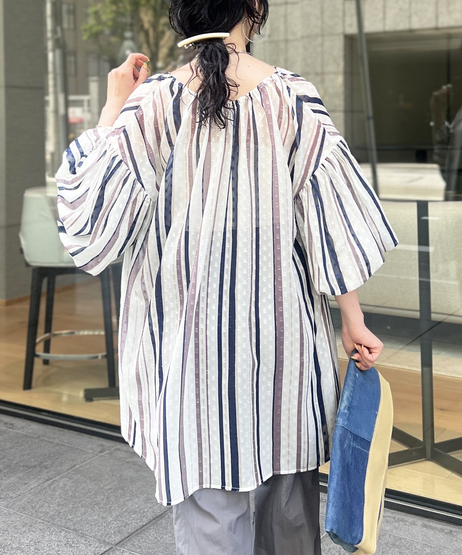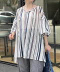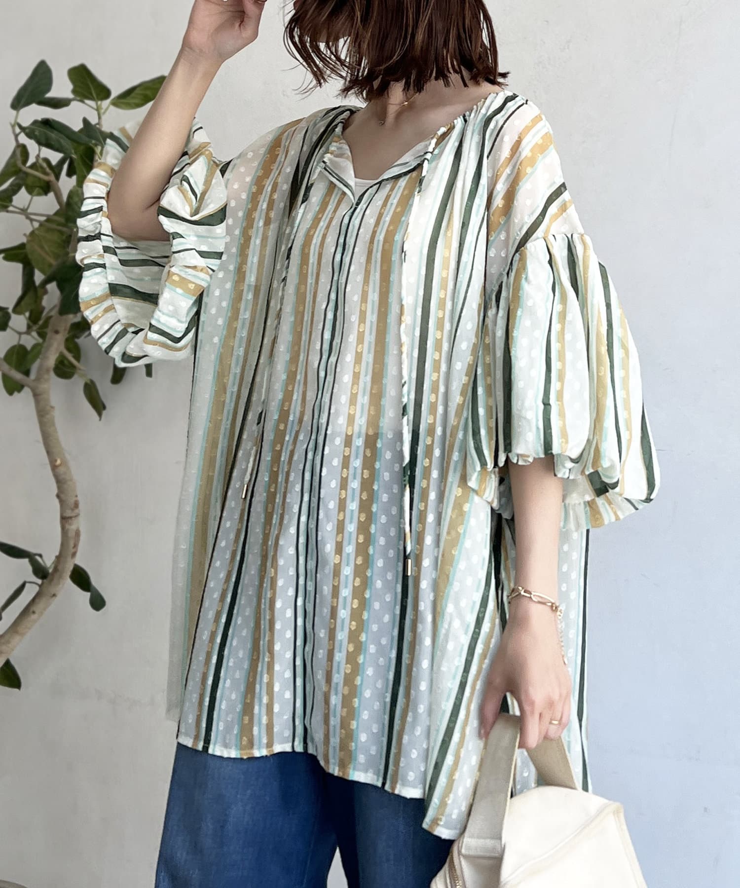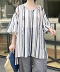 夏らしいマルチストライプが目を惹くチュニックブラウス。