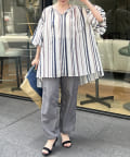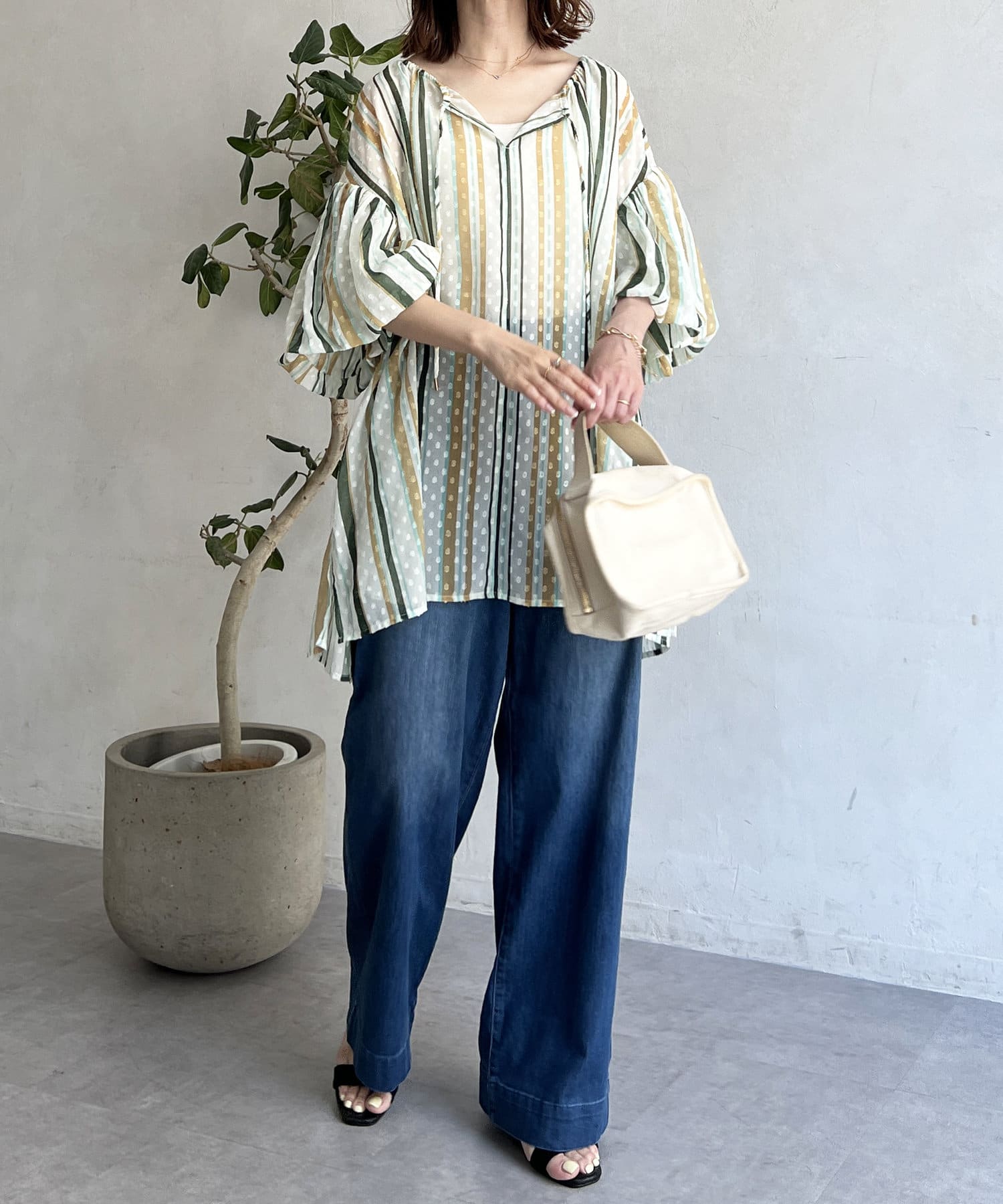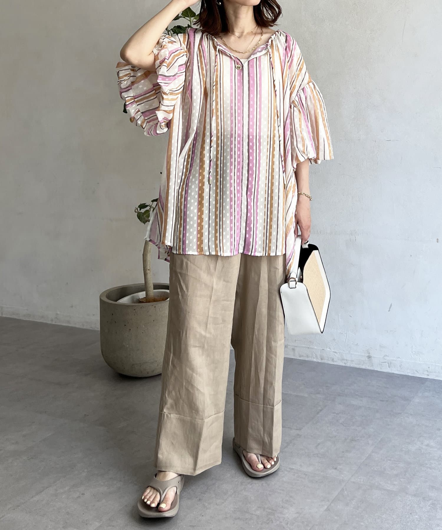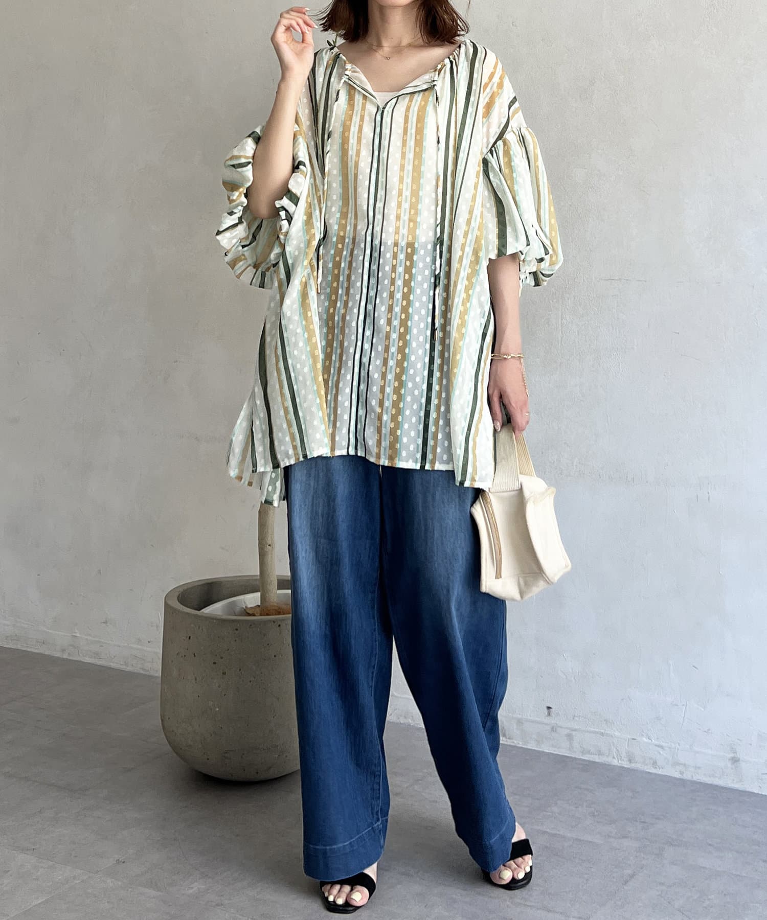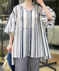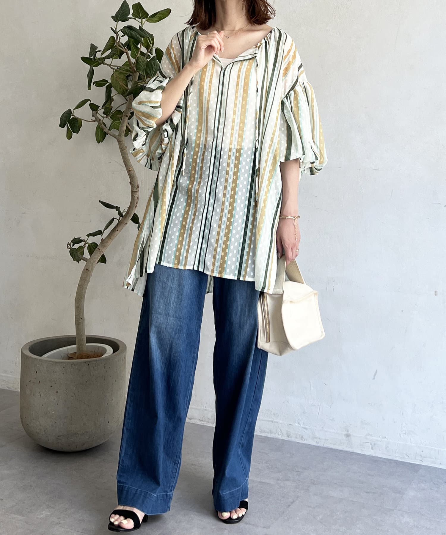 夏らしいマルチストライプが目を惹くチュニックブラウス。