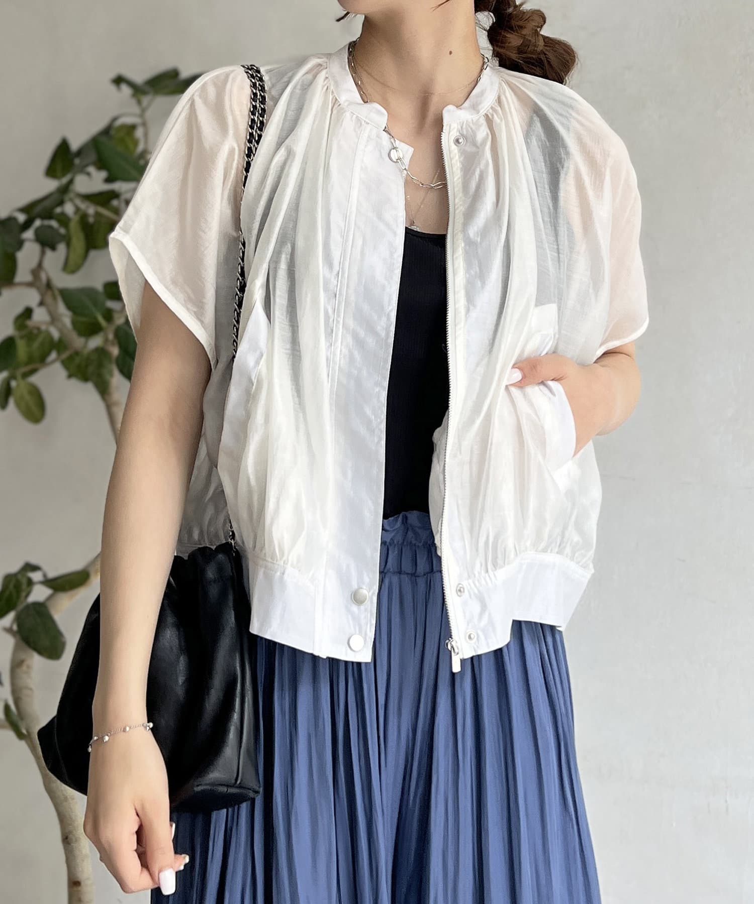 艶っとした光沢感が上品見えするシアーブルゾン。