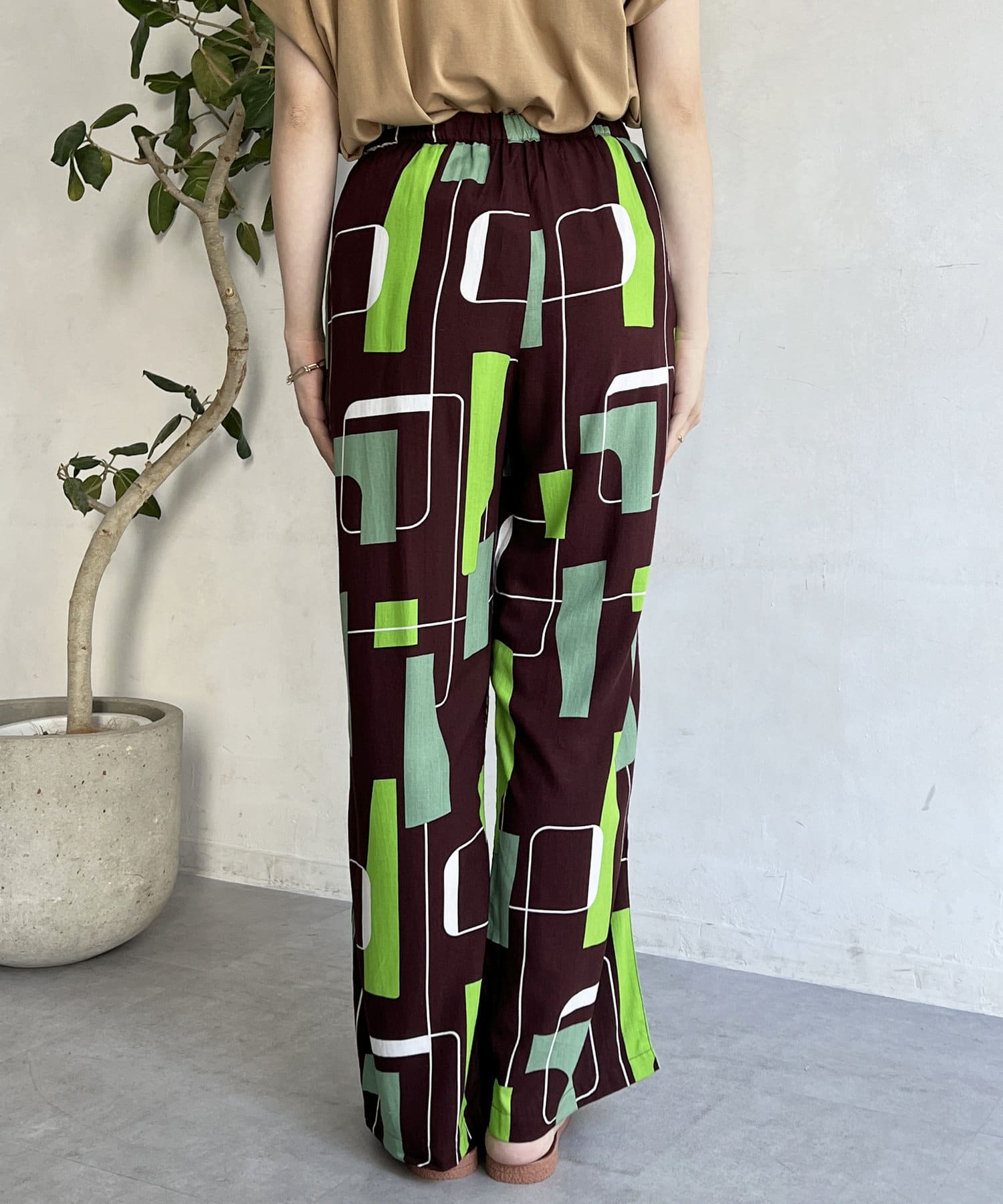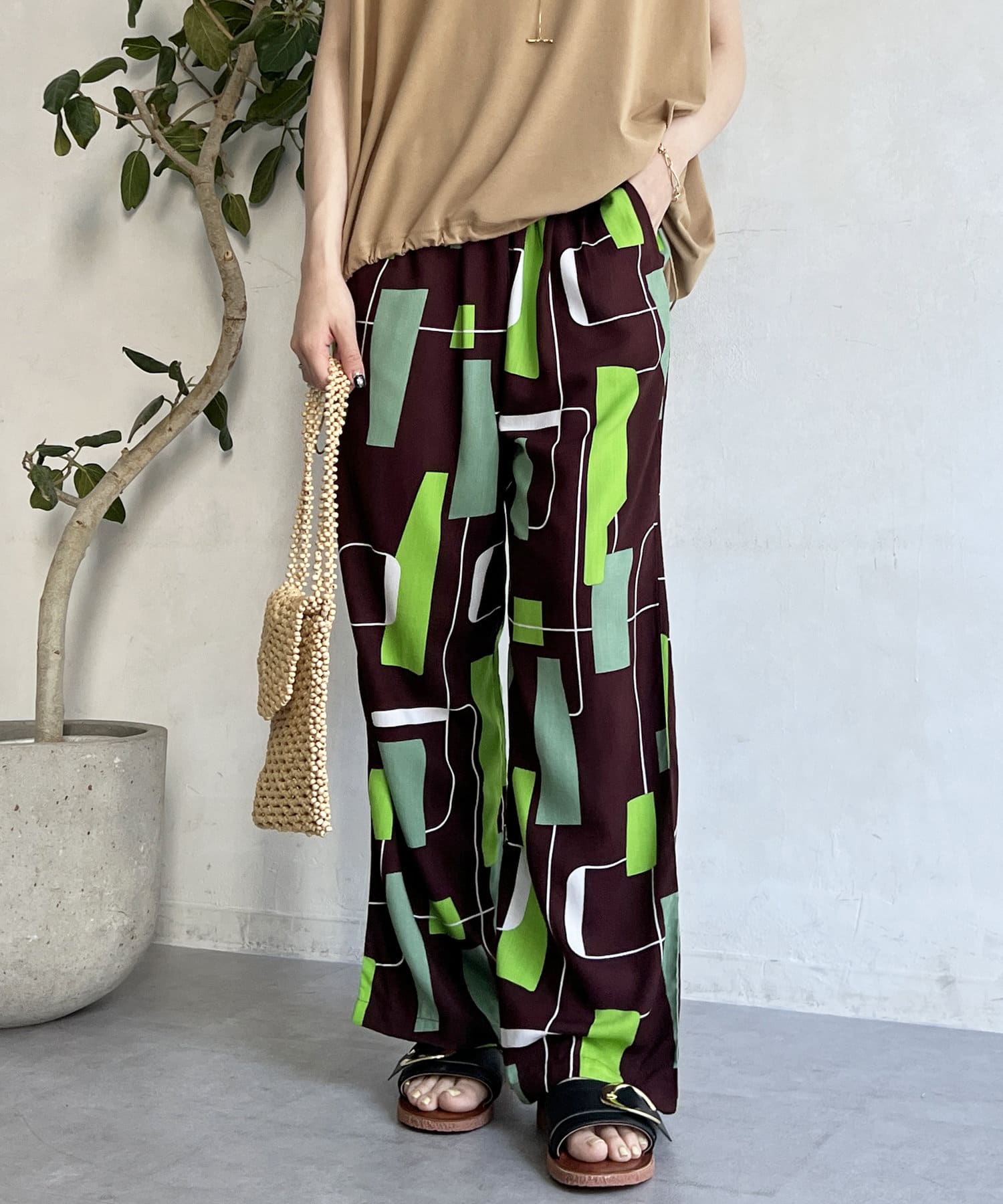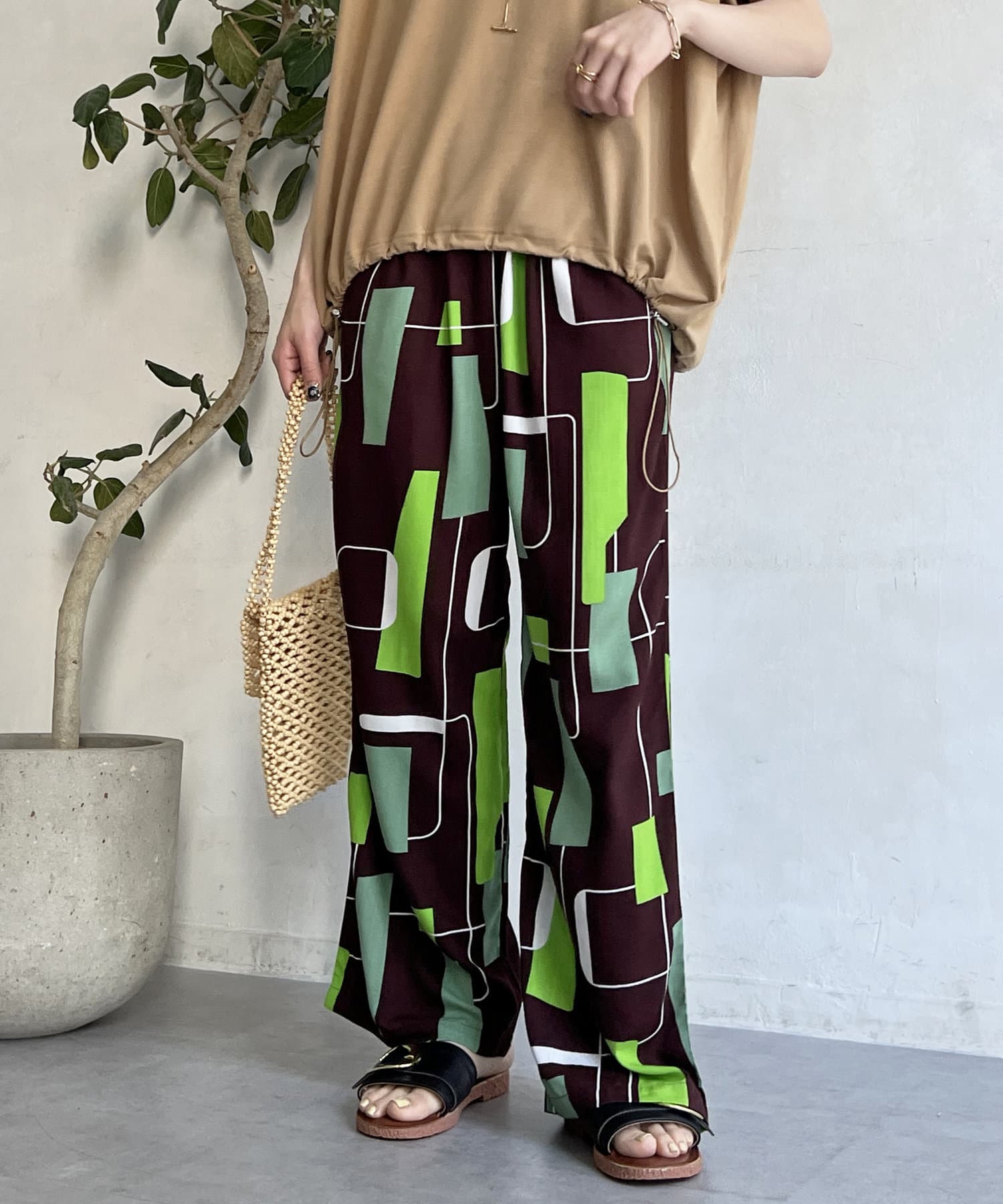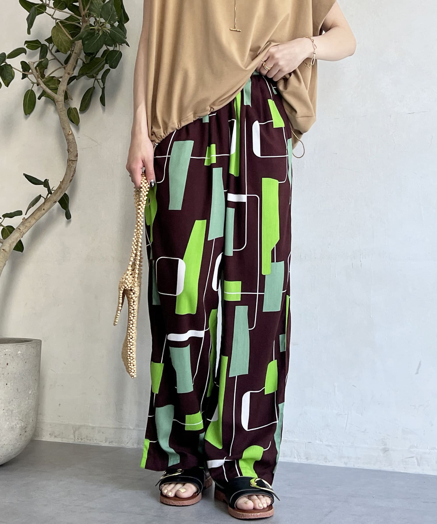 鮮やかなプリントが目を惹くイージーパンツ