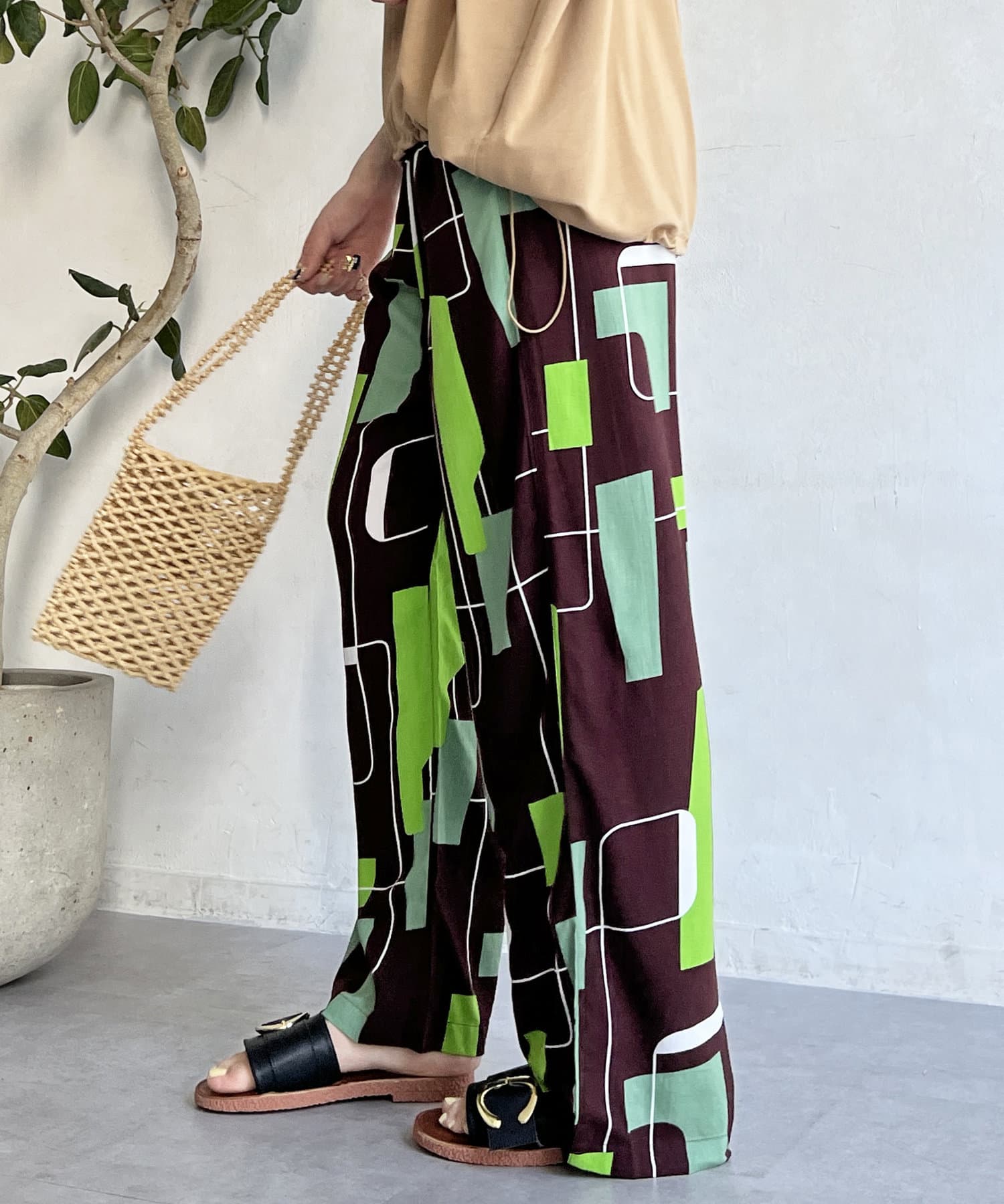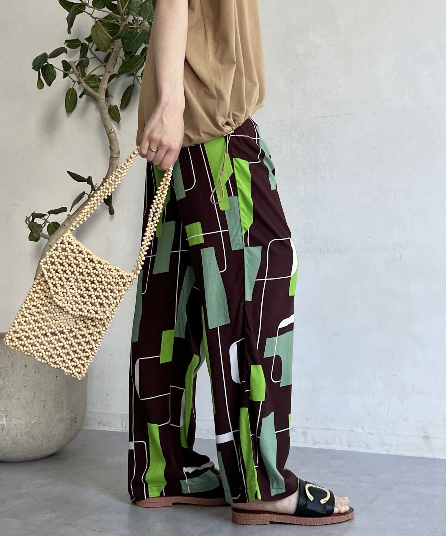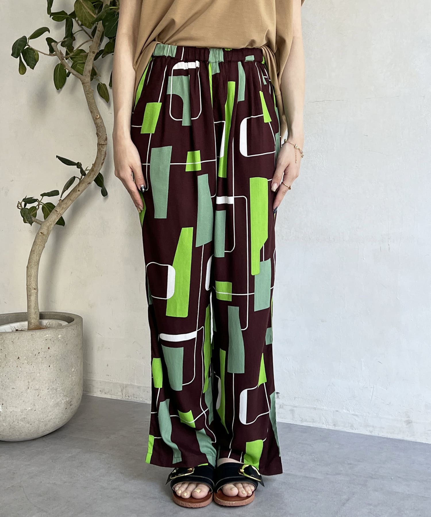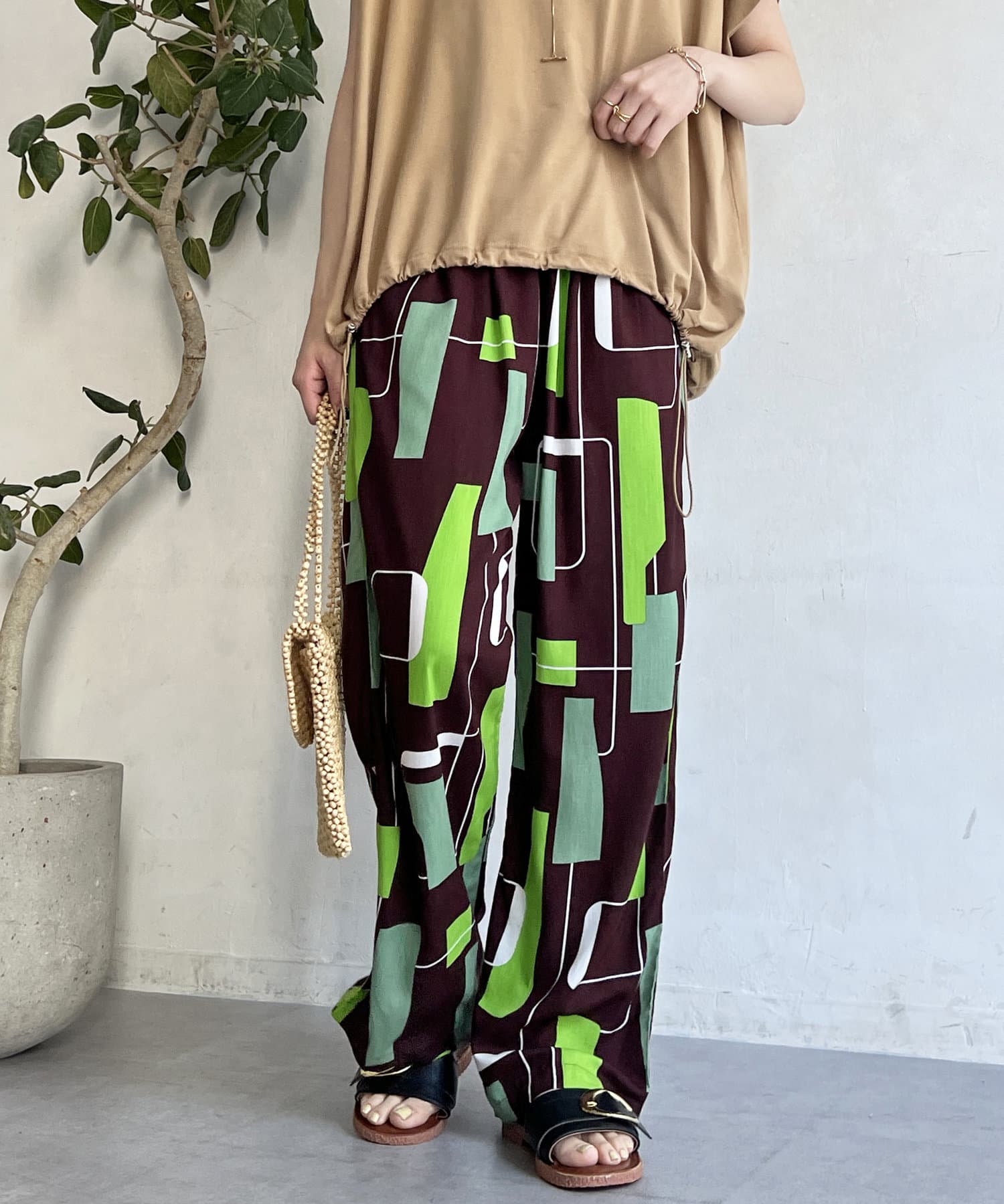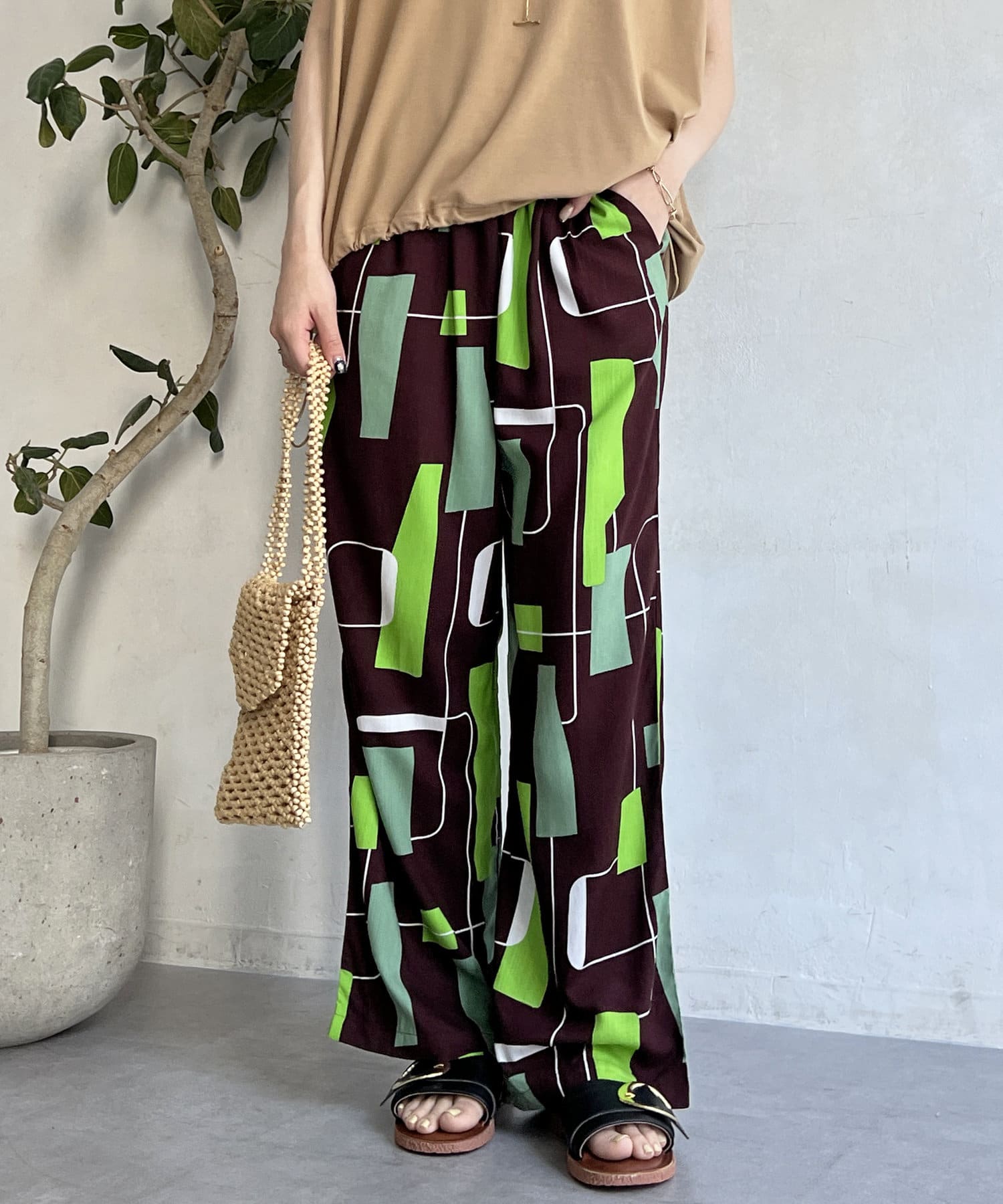 鮮やかなプリントが目を惹くイージーパンツ