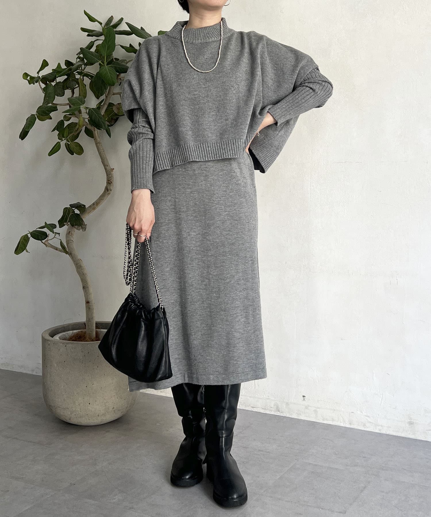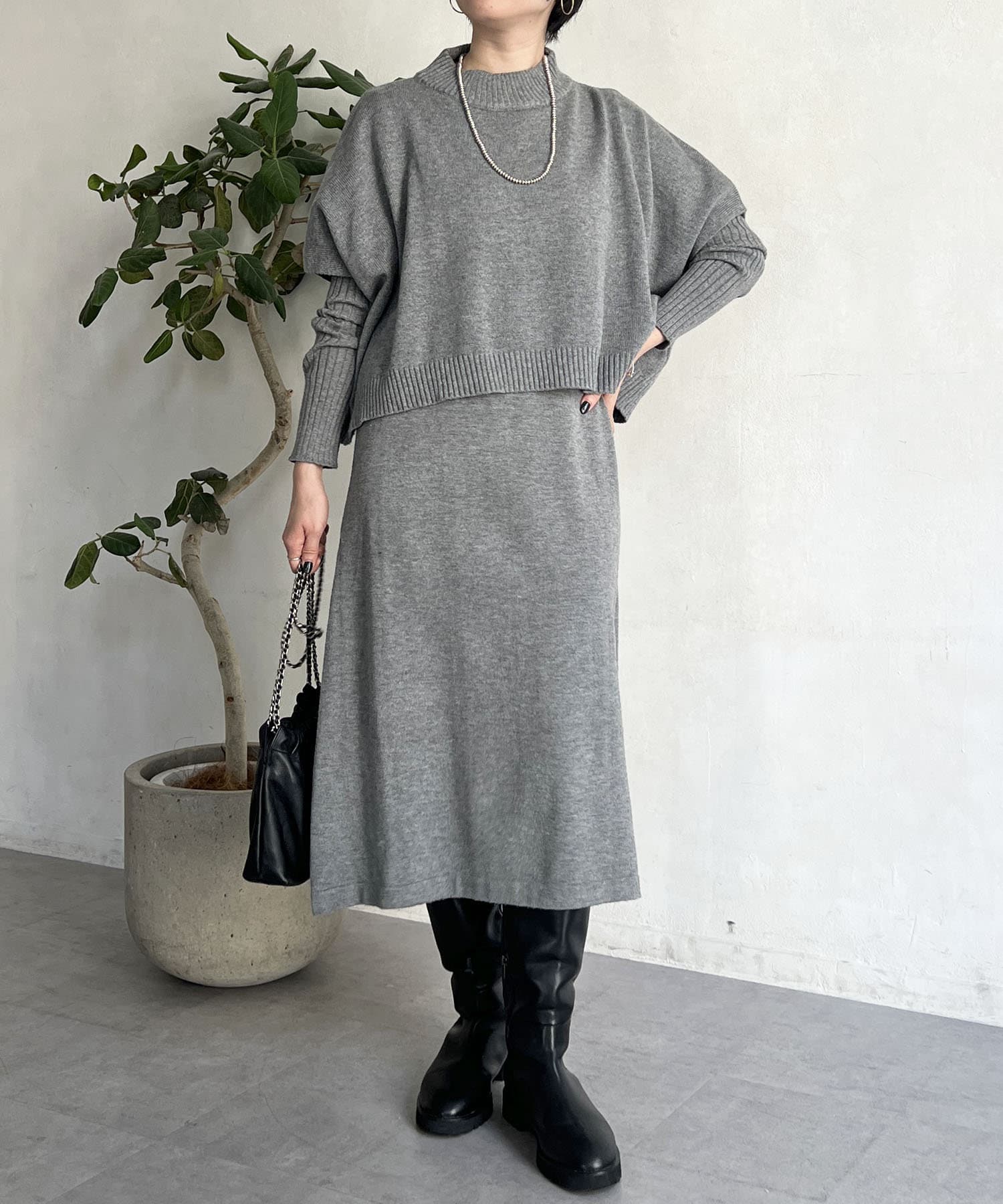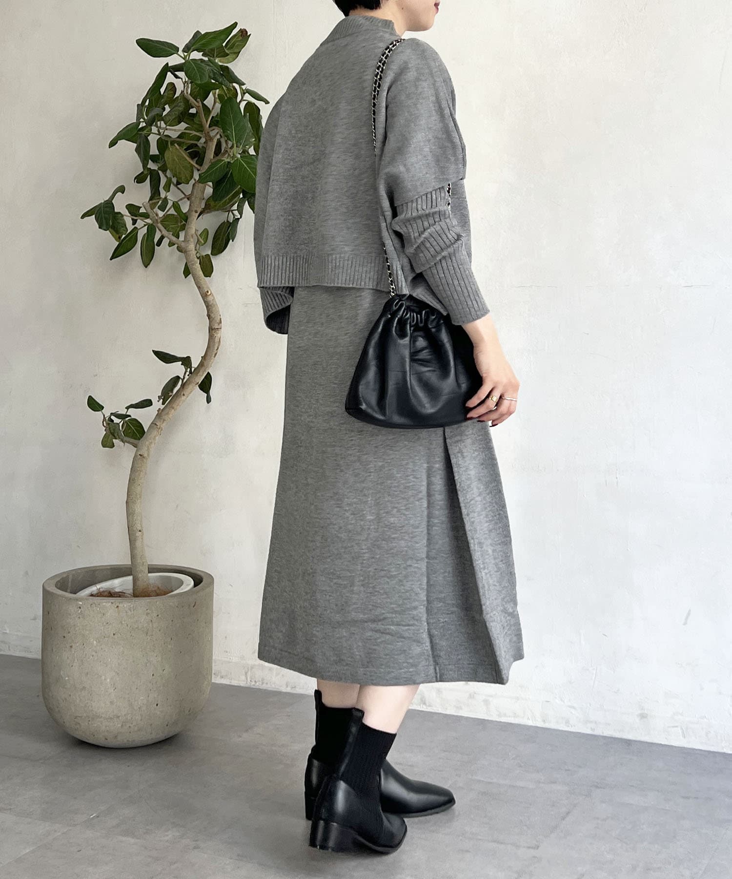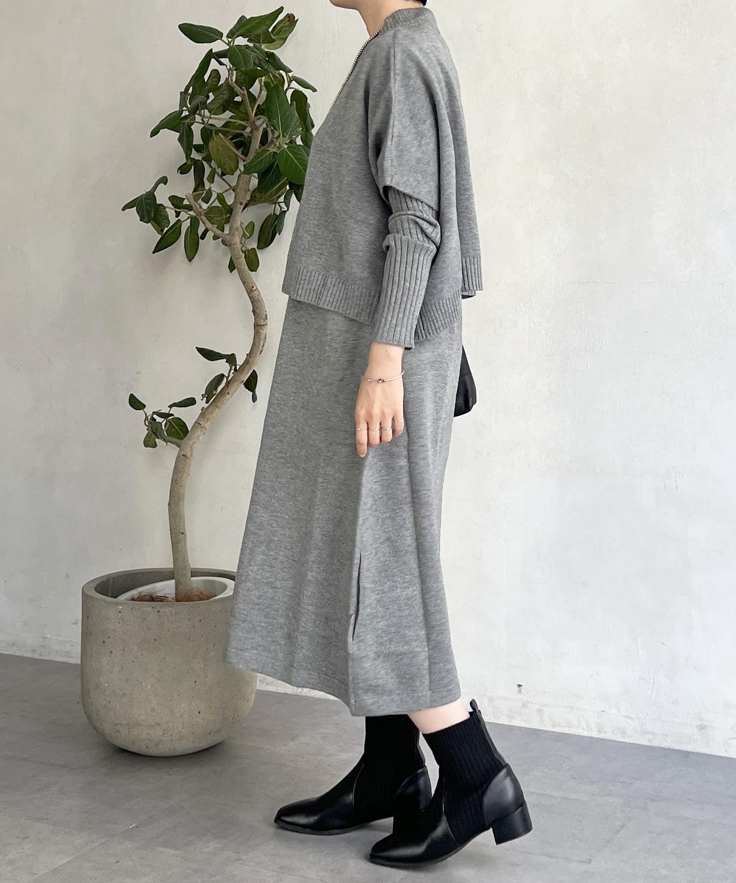 セットのショート丈トップスを合わせるとくびれラインができます◎