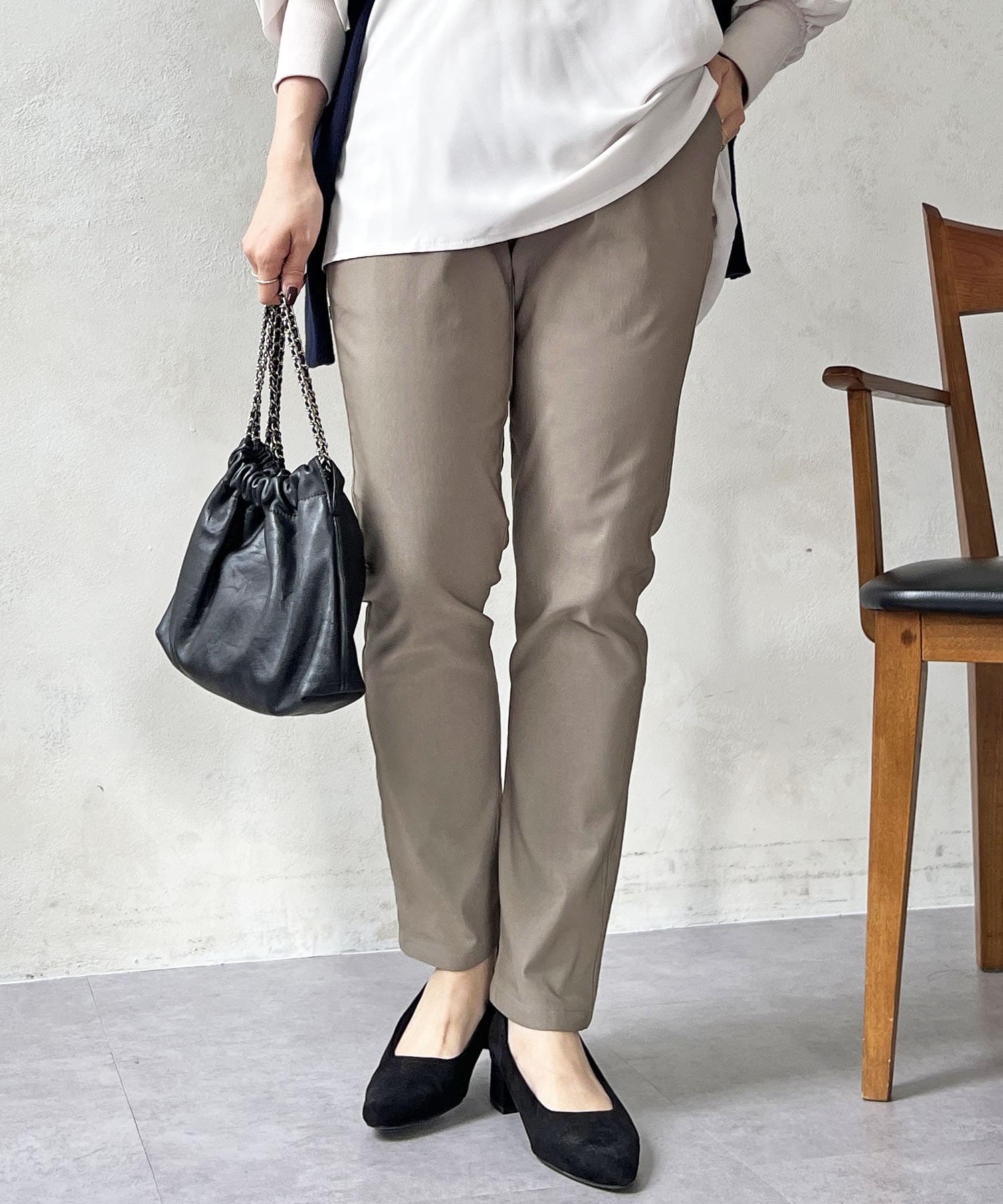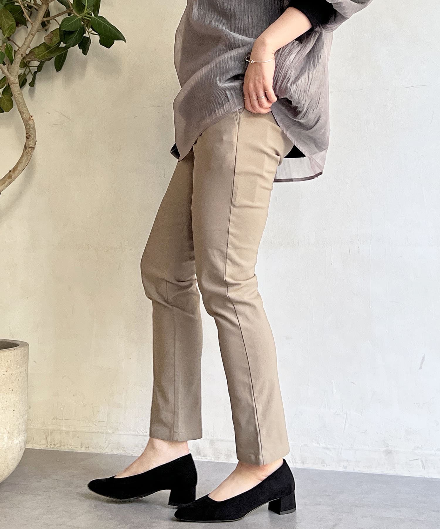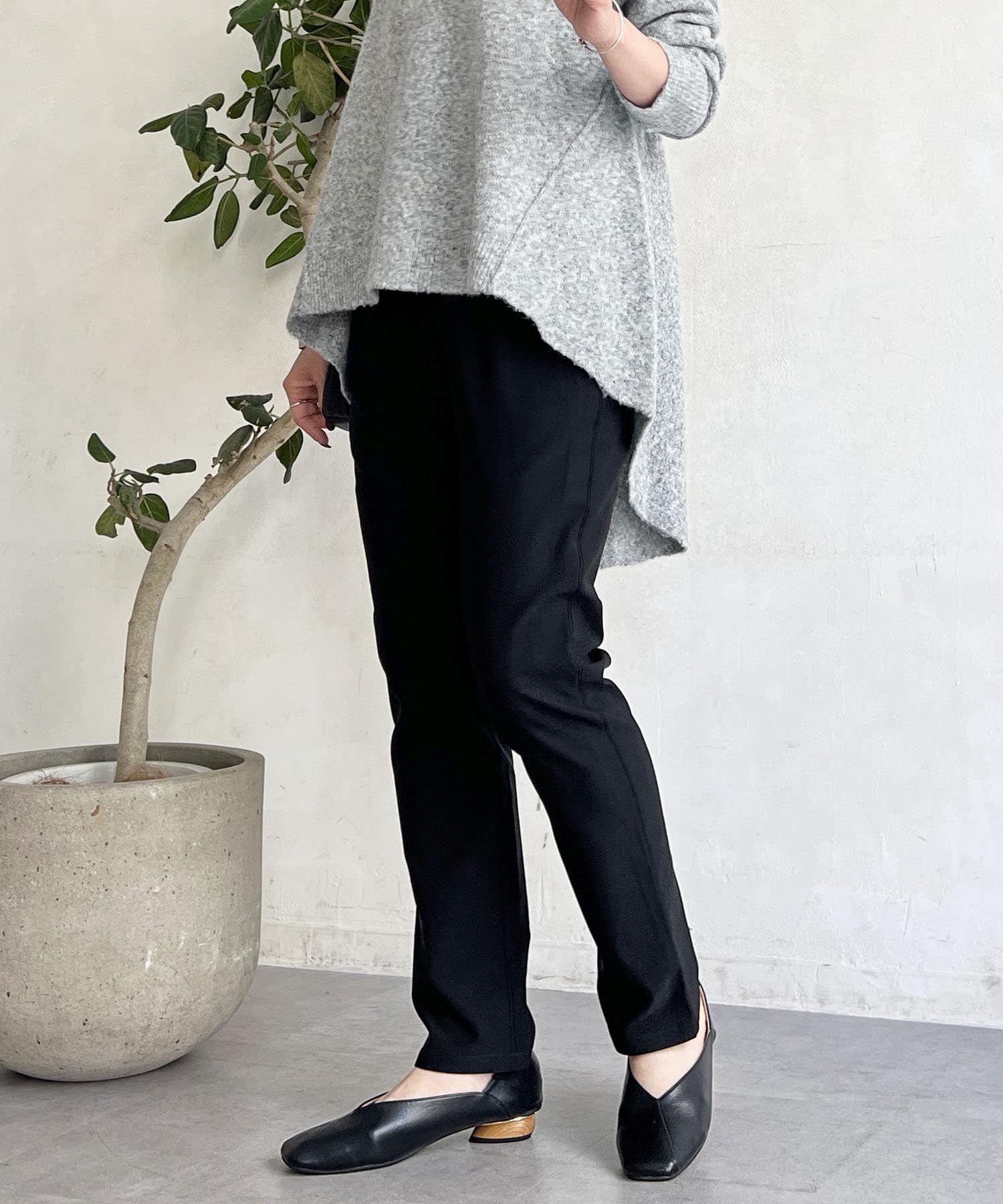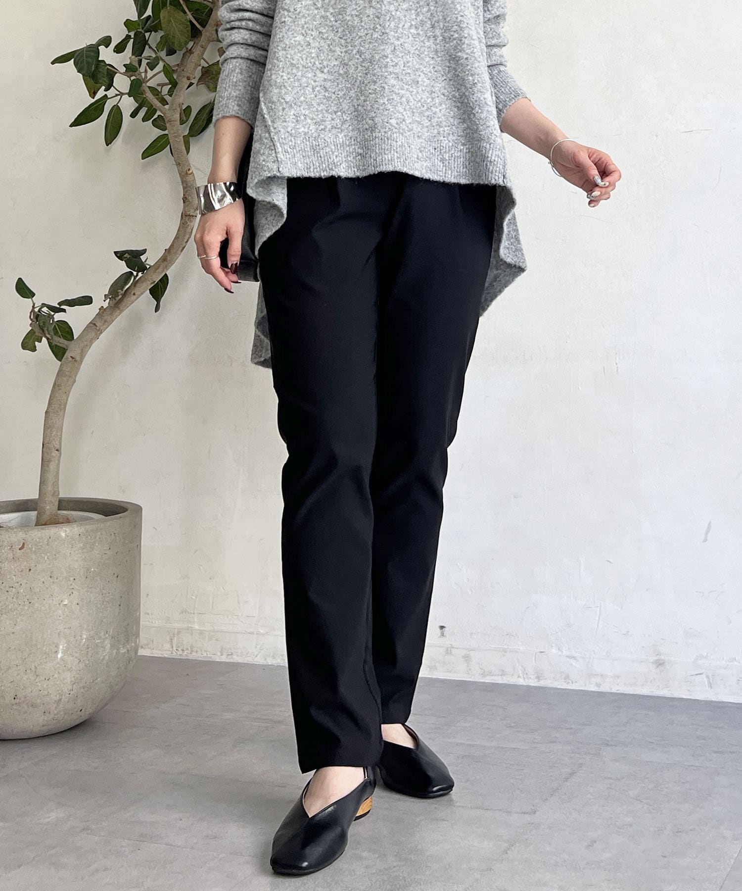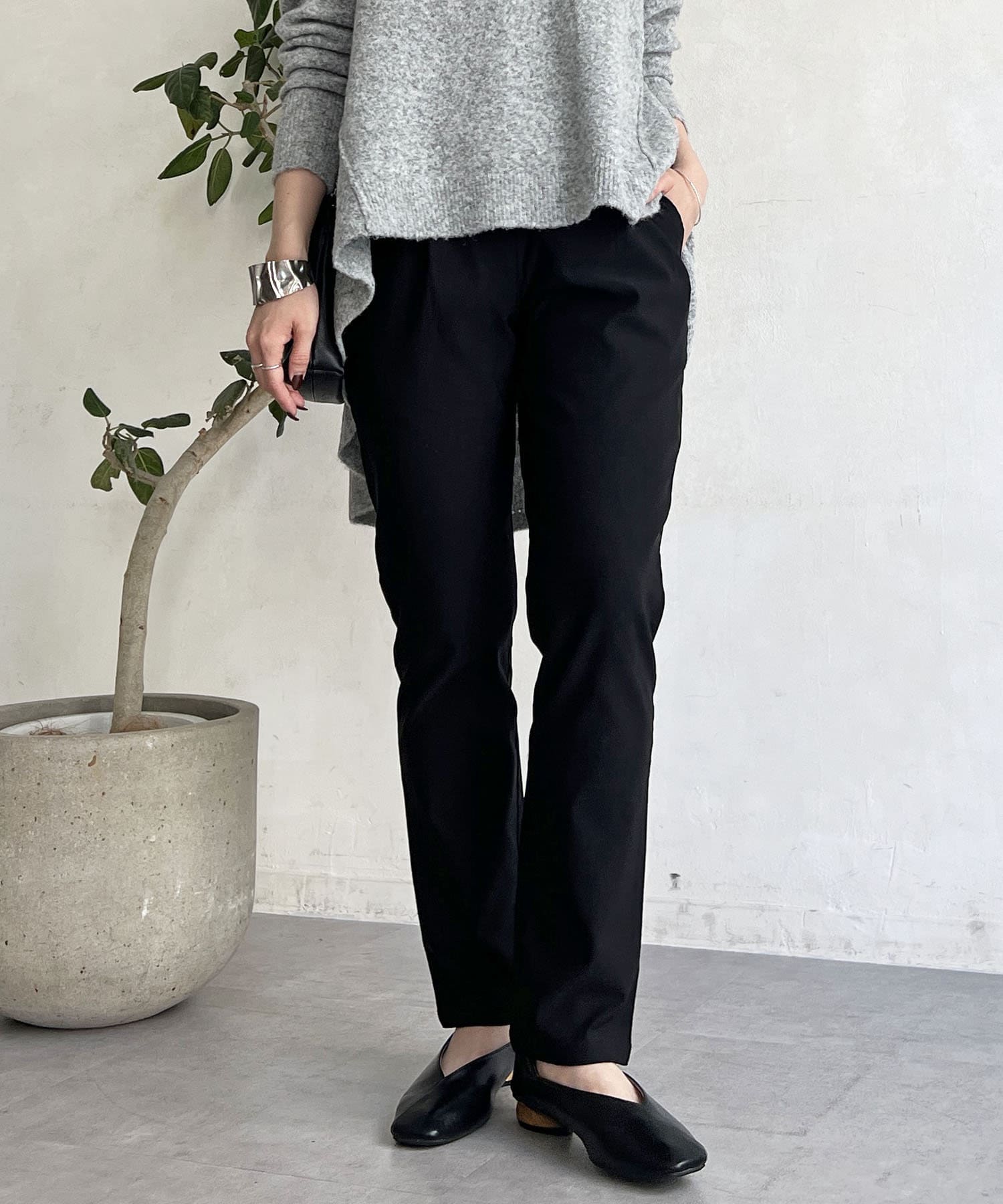 細見のパンツに見えるのに、中肉の生地で脚のラインを拾いにくく美脚見えが叶う嬉しいポイントも!