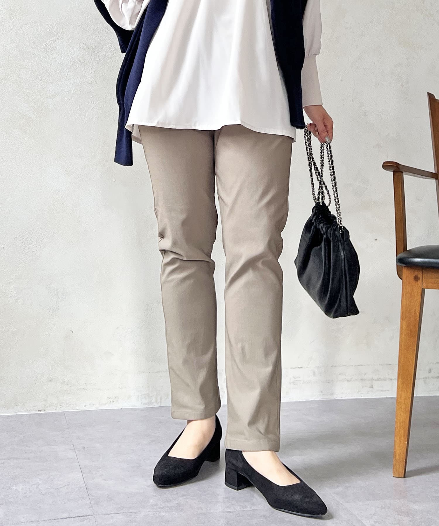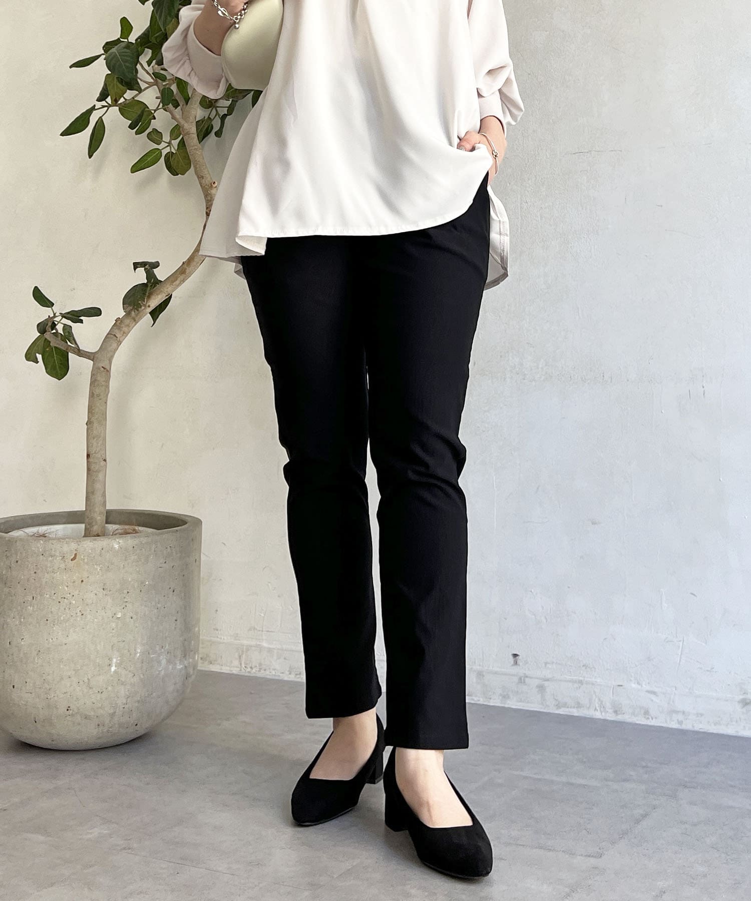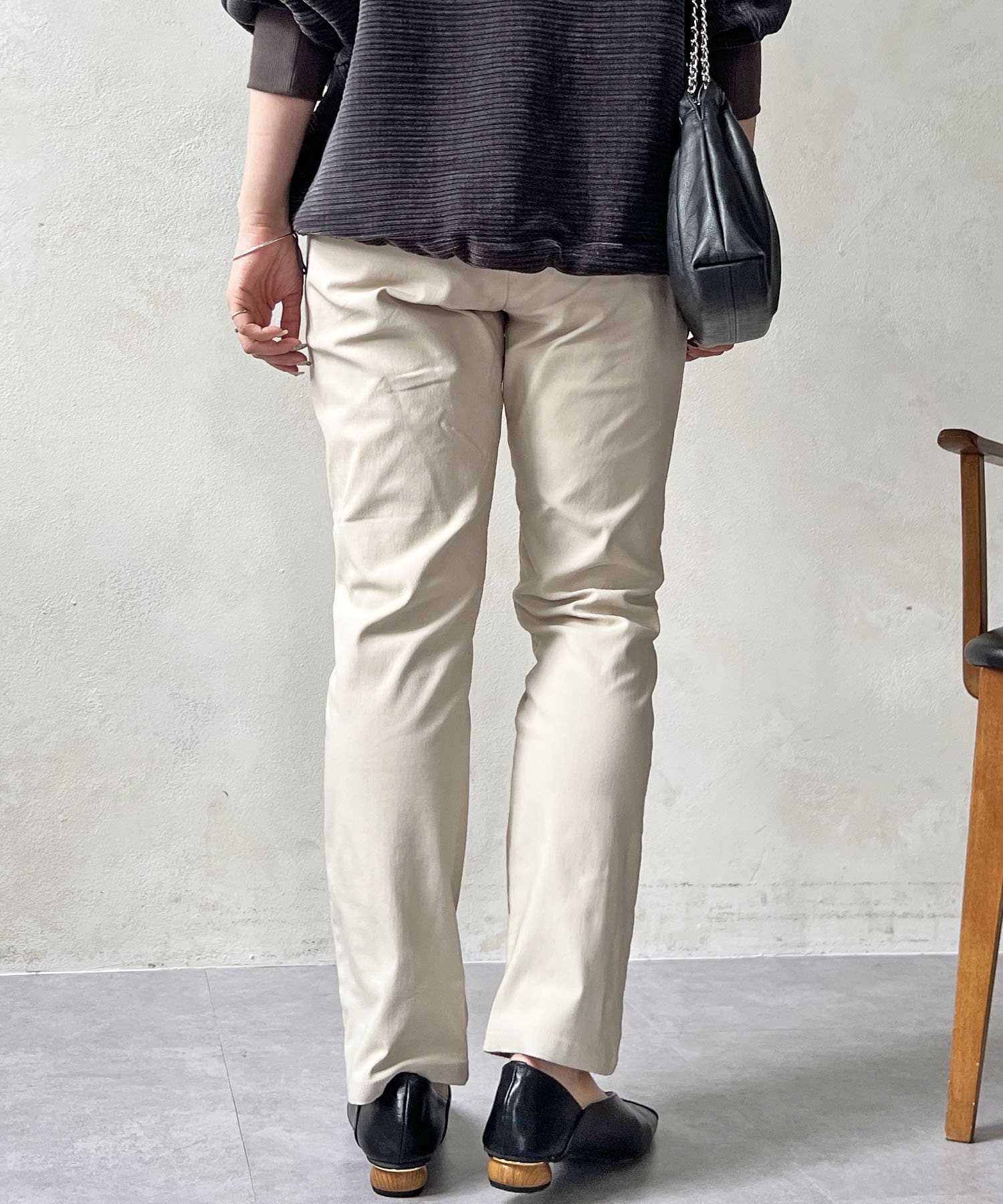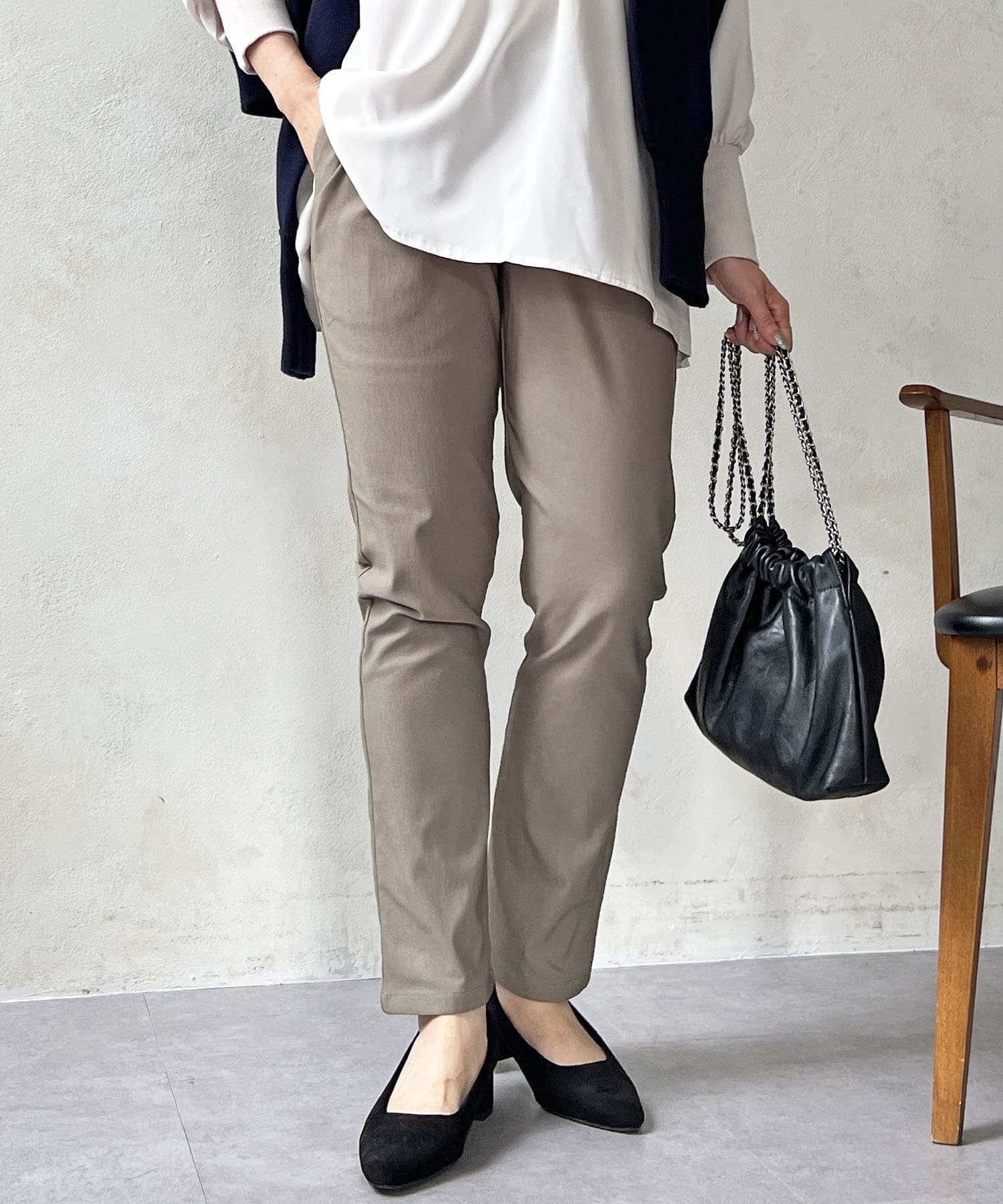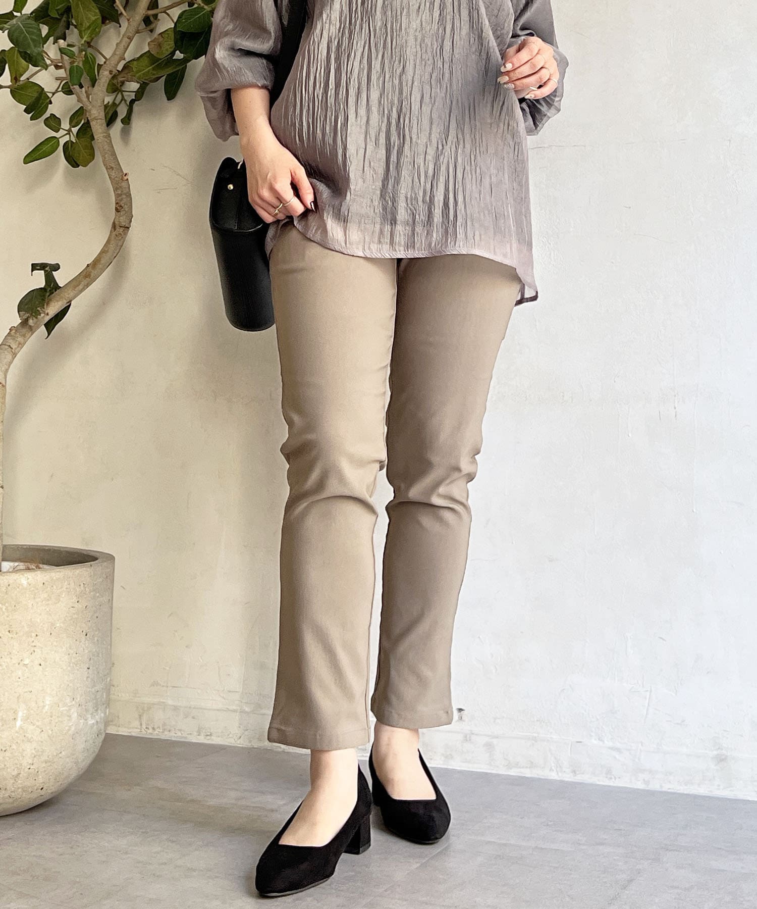 細見のパンツに見えるのに、中肉の生地で脚のラインを拾いにくく美脚見えが叶う嬉しいポイントも!