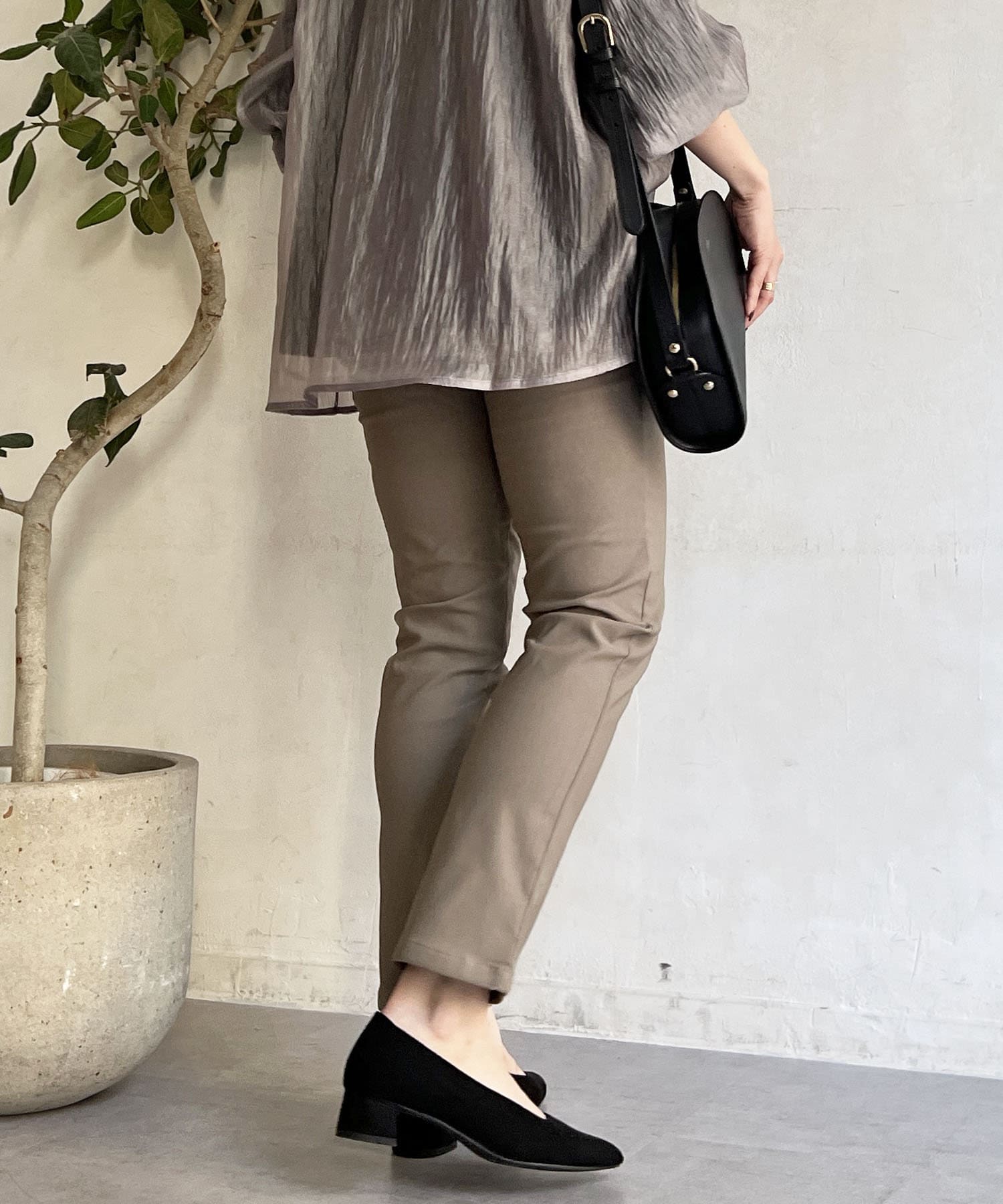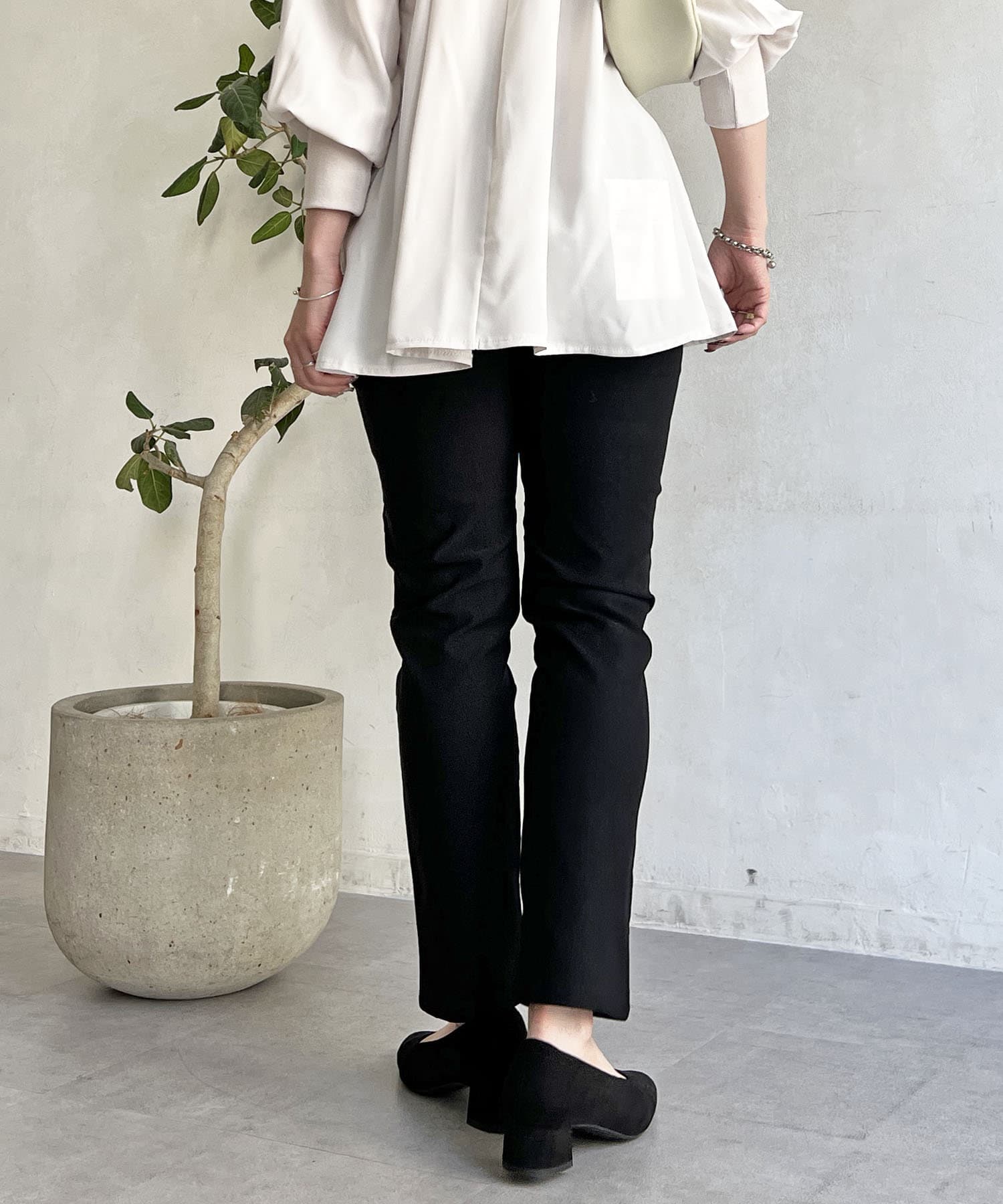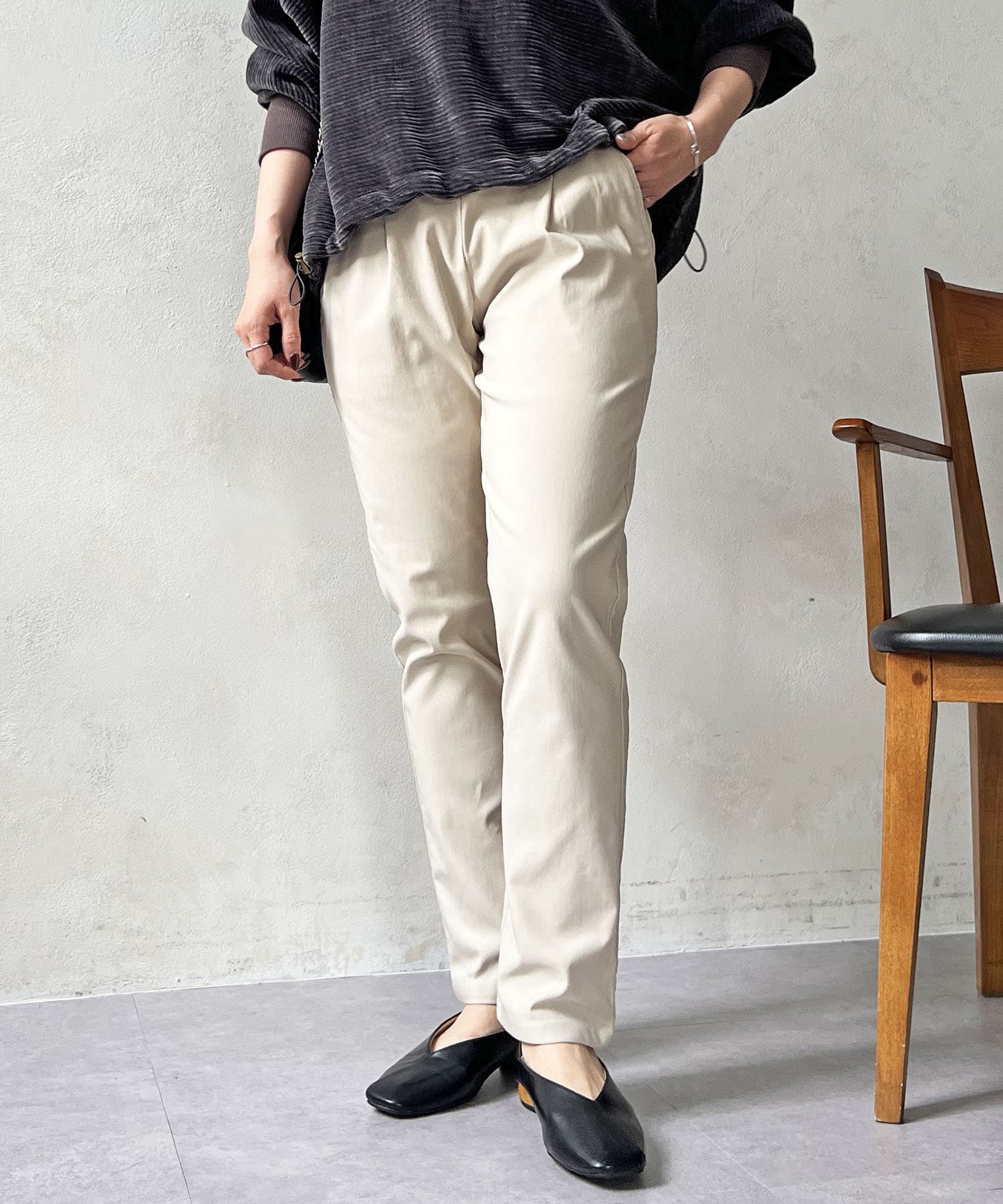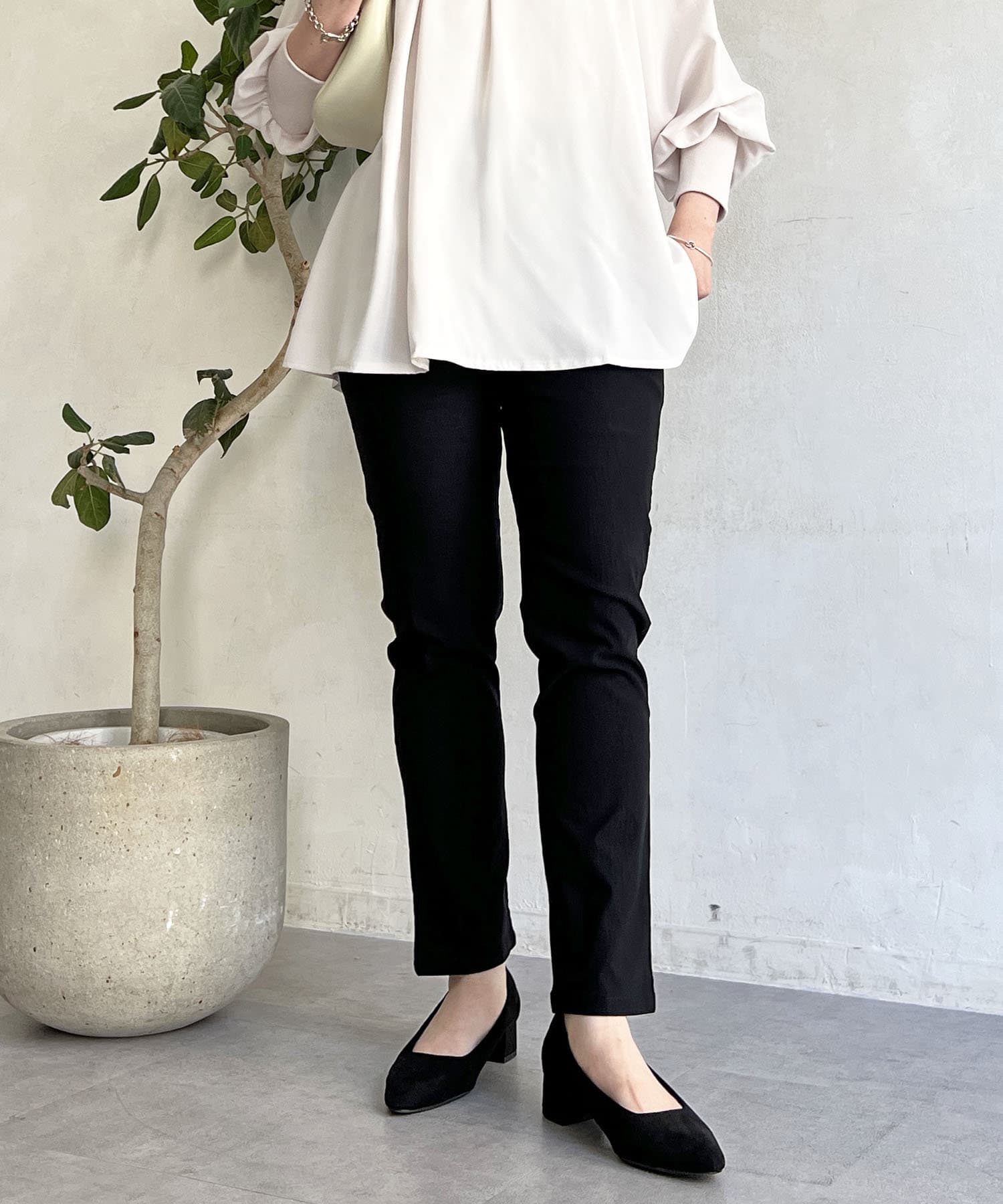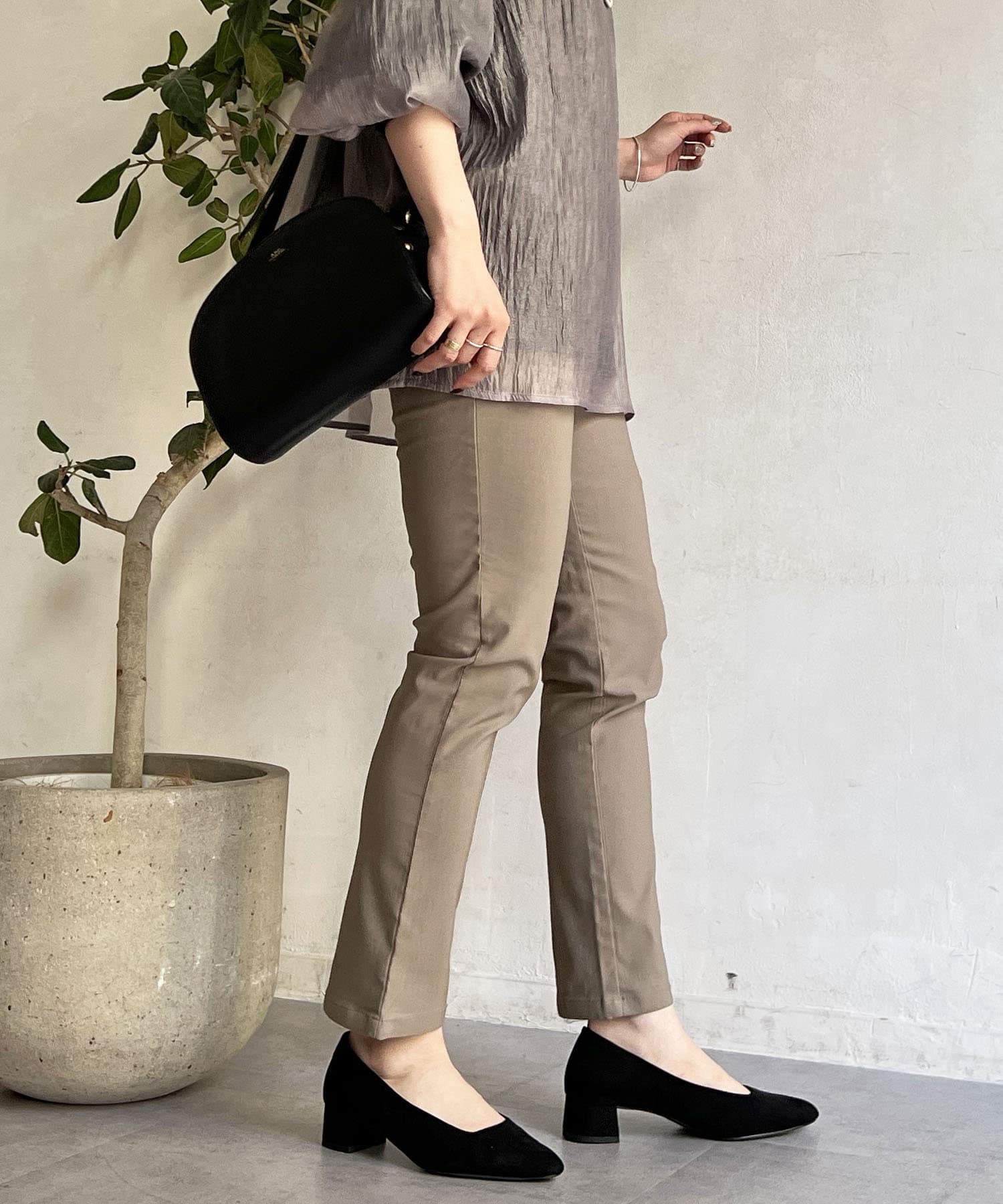 細見のパンツに見えるのに、中肉の生地で脚のラインを拾いにくく美脚見えが叶う嬉しいポイントも!