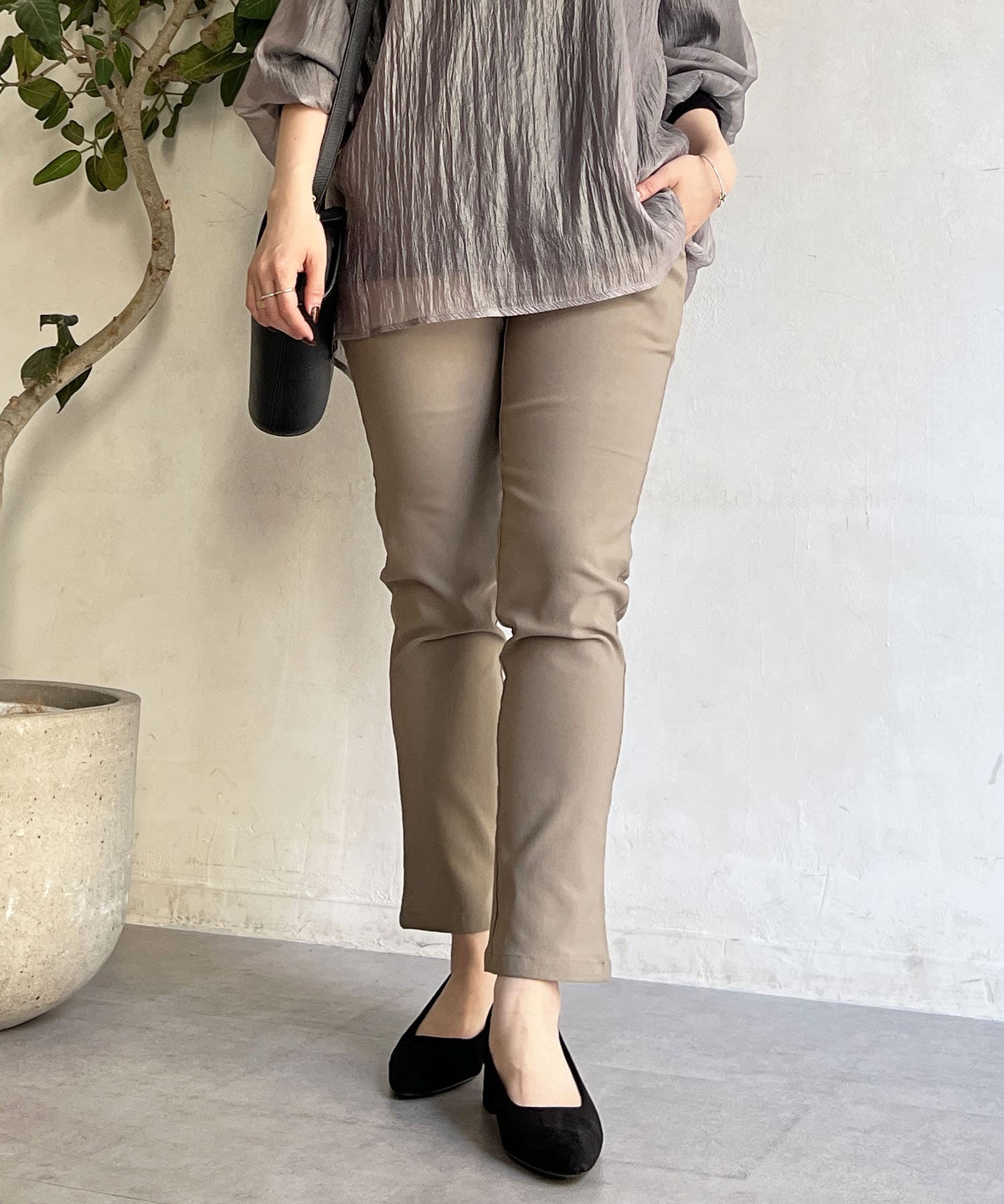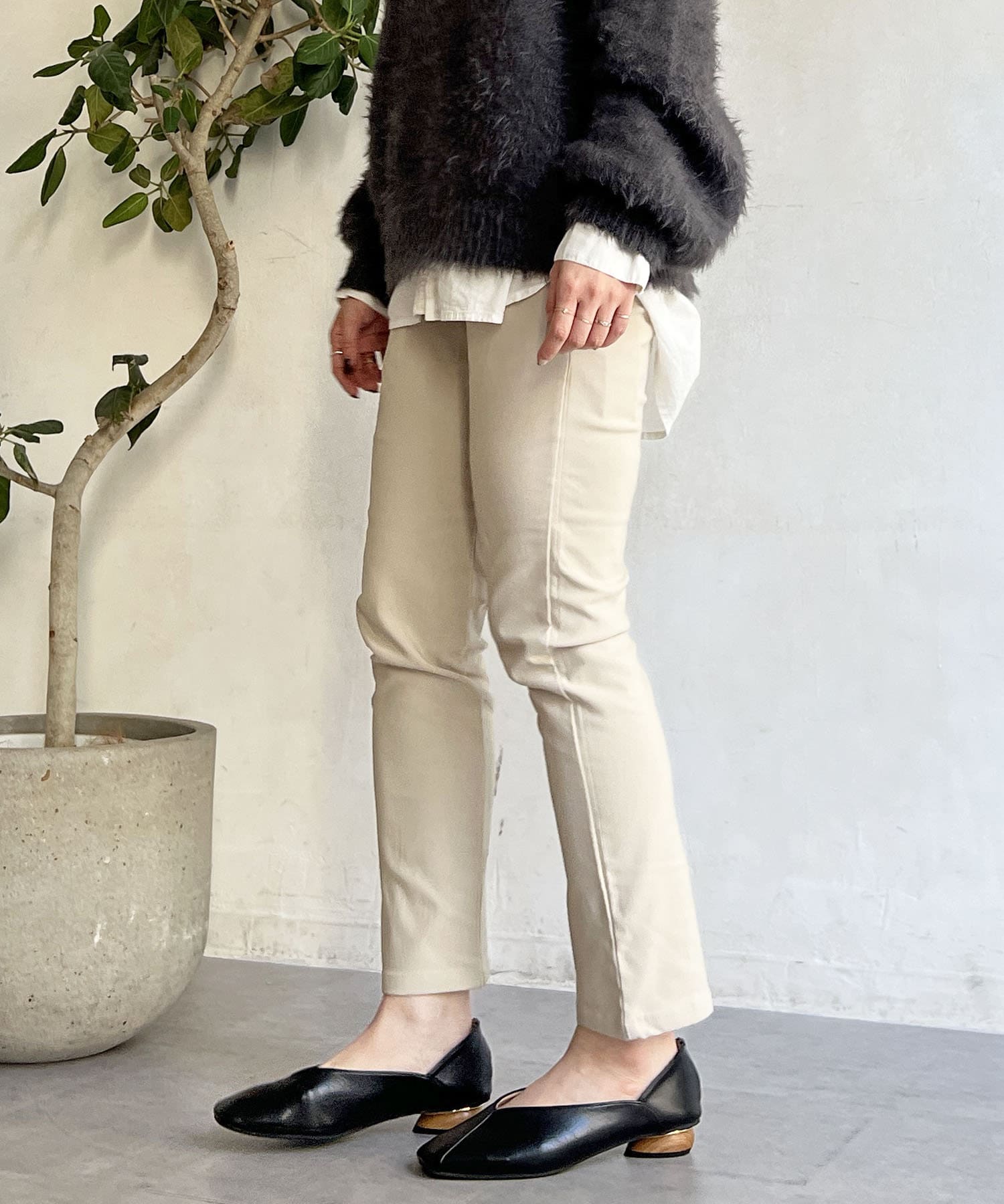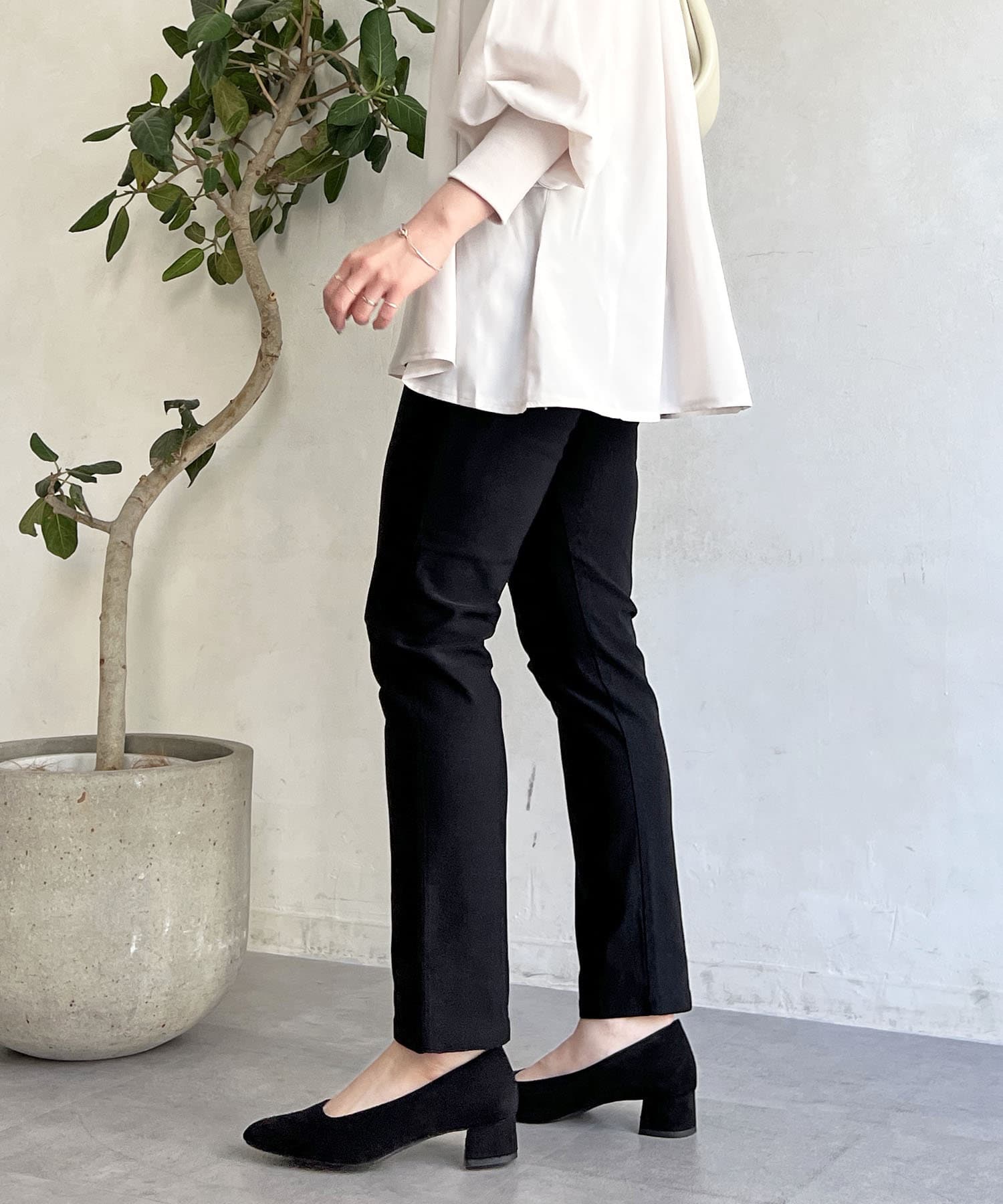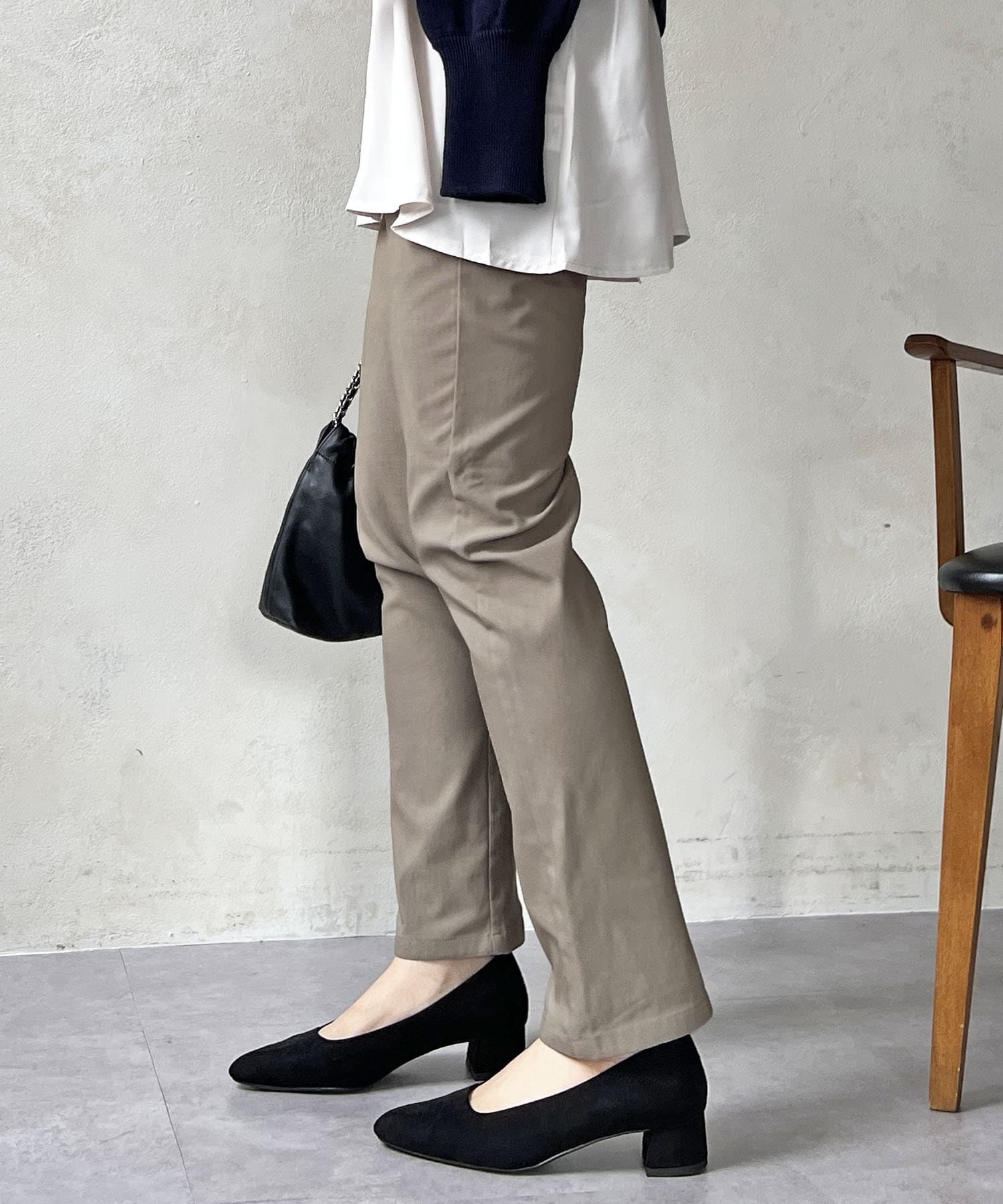 細見のパンツに見えるのに、中肉の生地で脚のラインを拾いにくく美脚見えが叶う嬉しいポイントも!