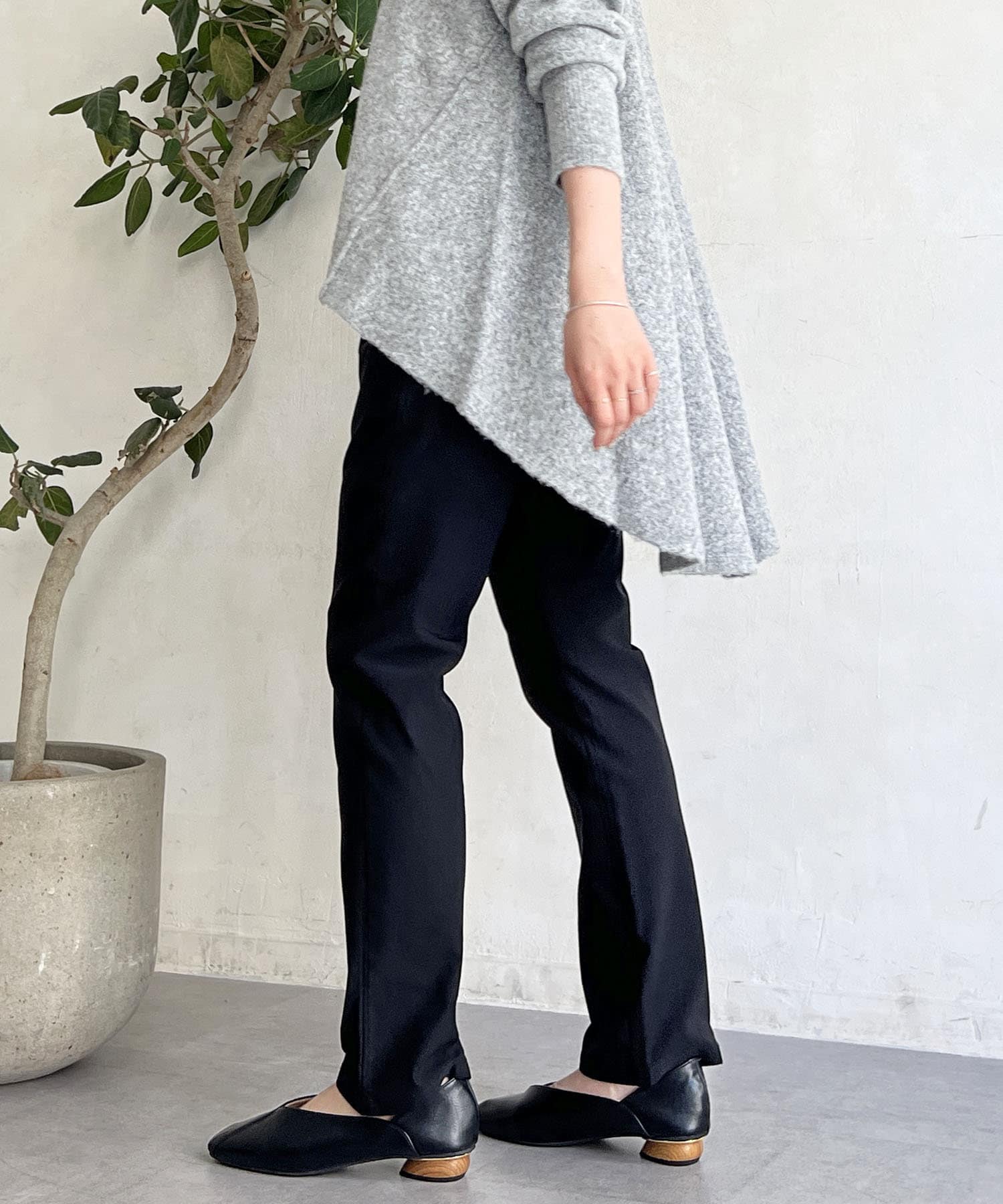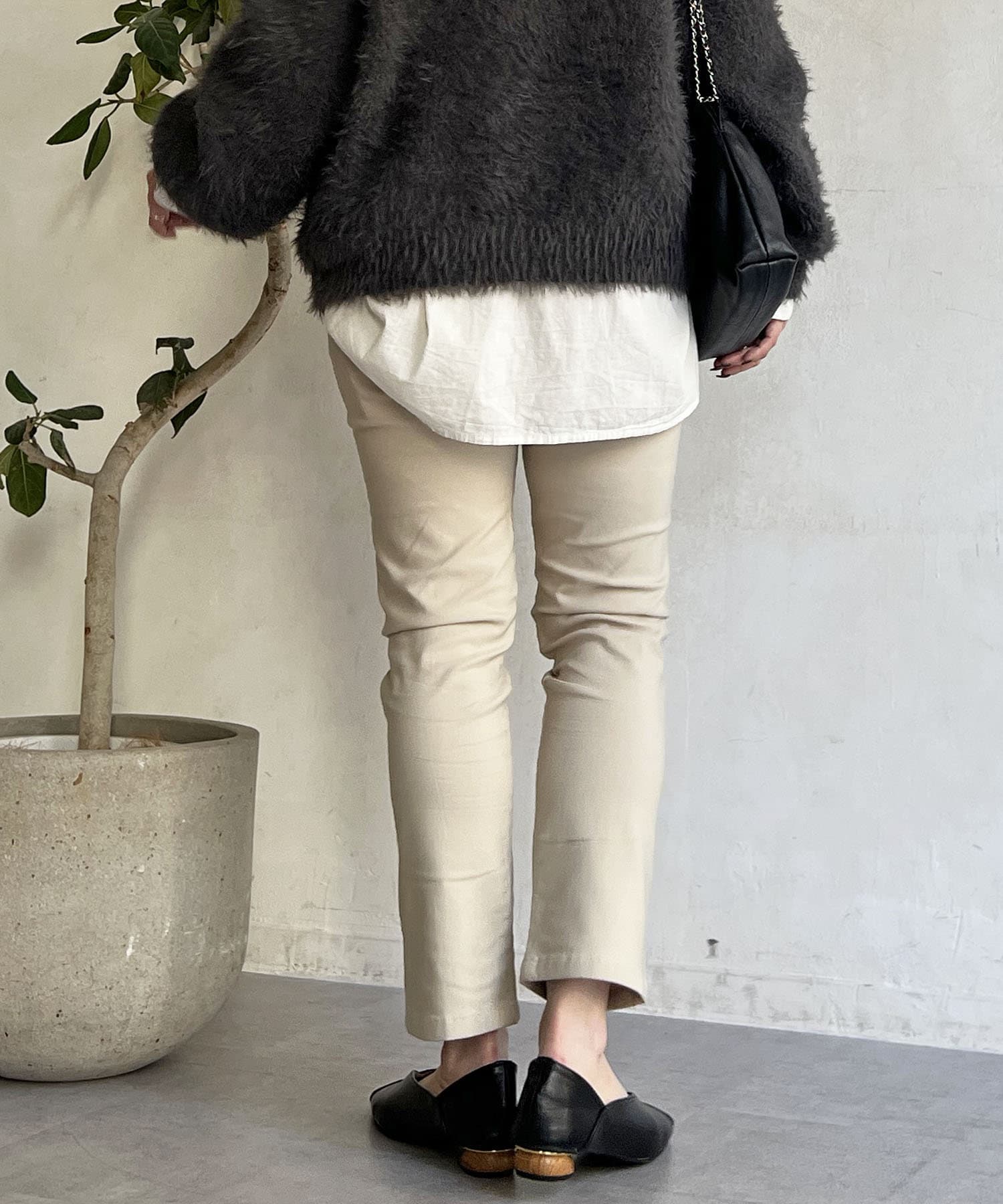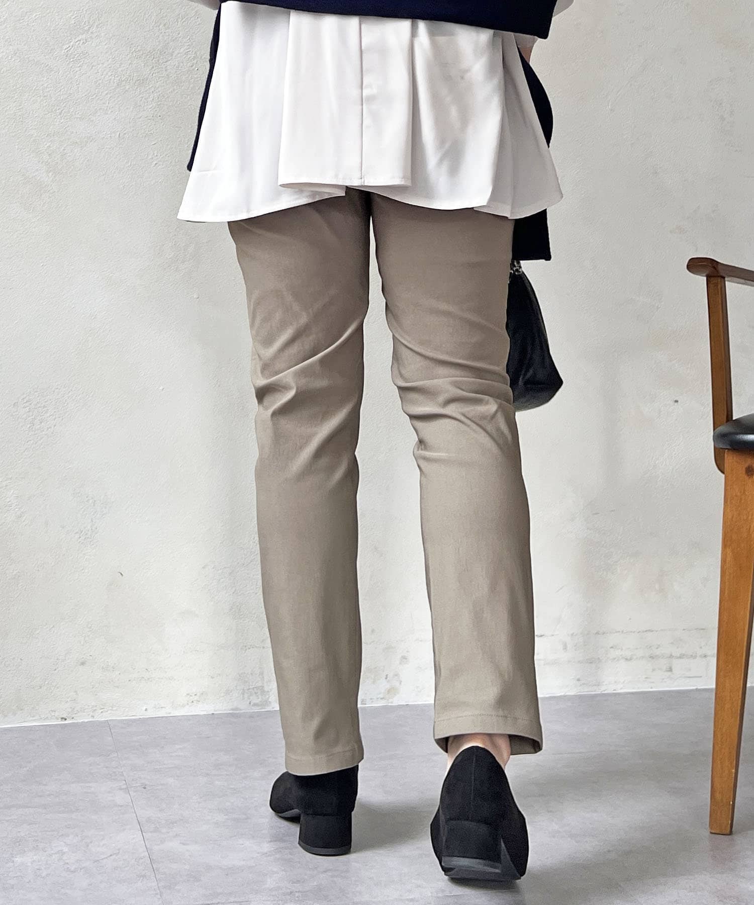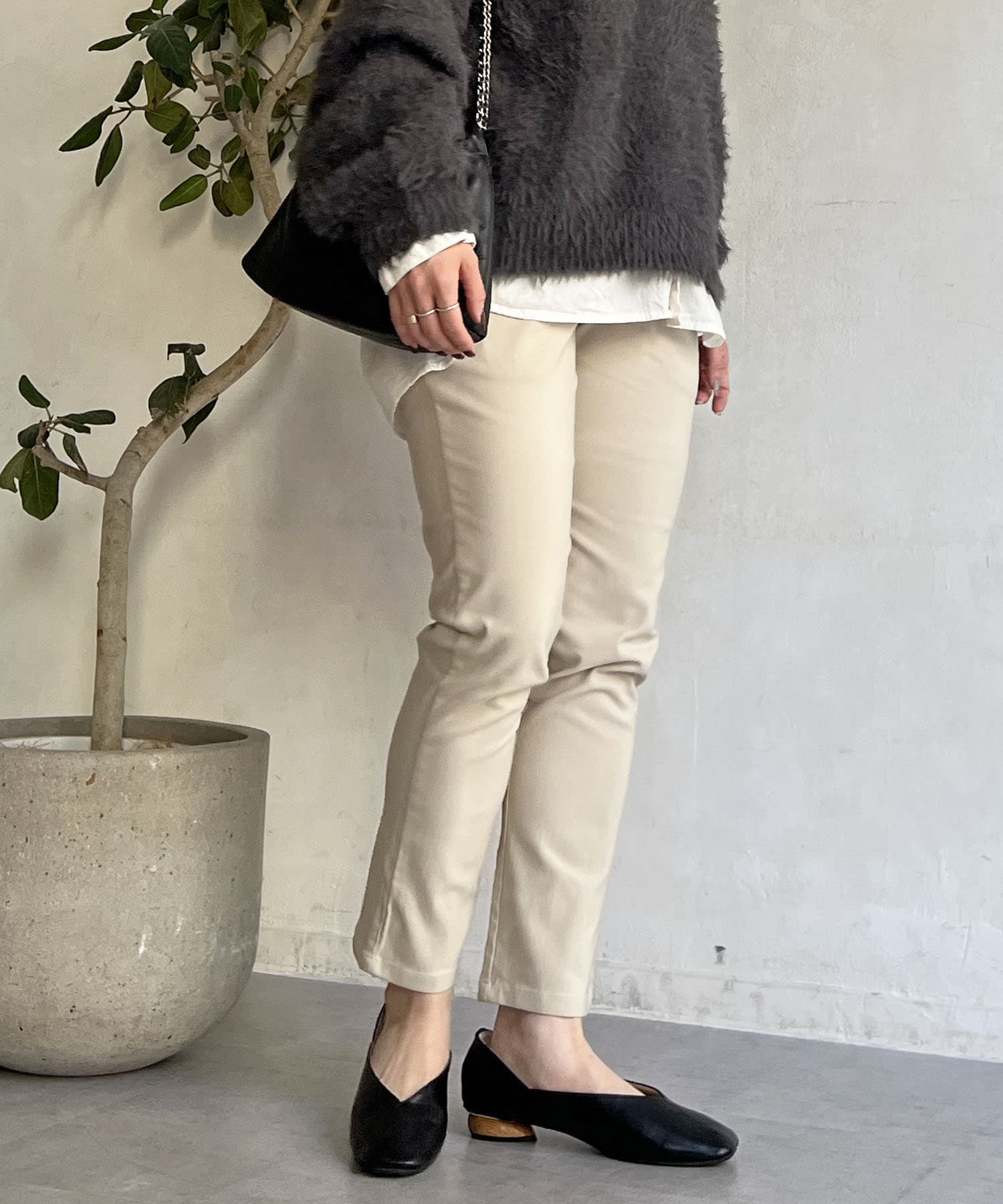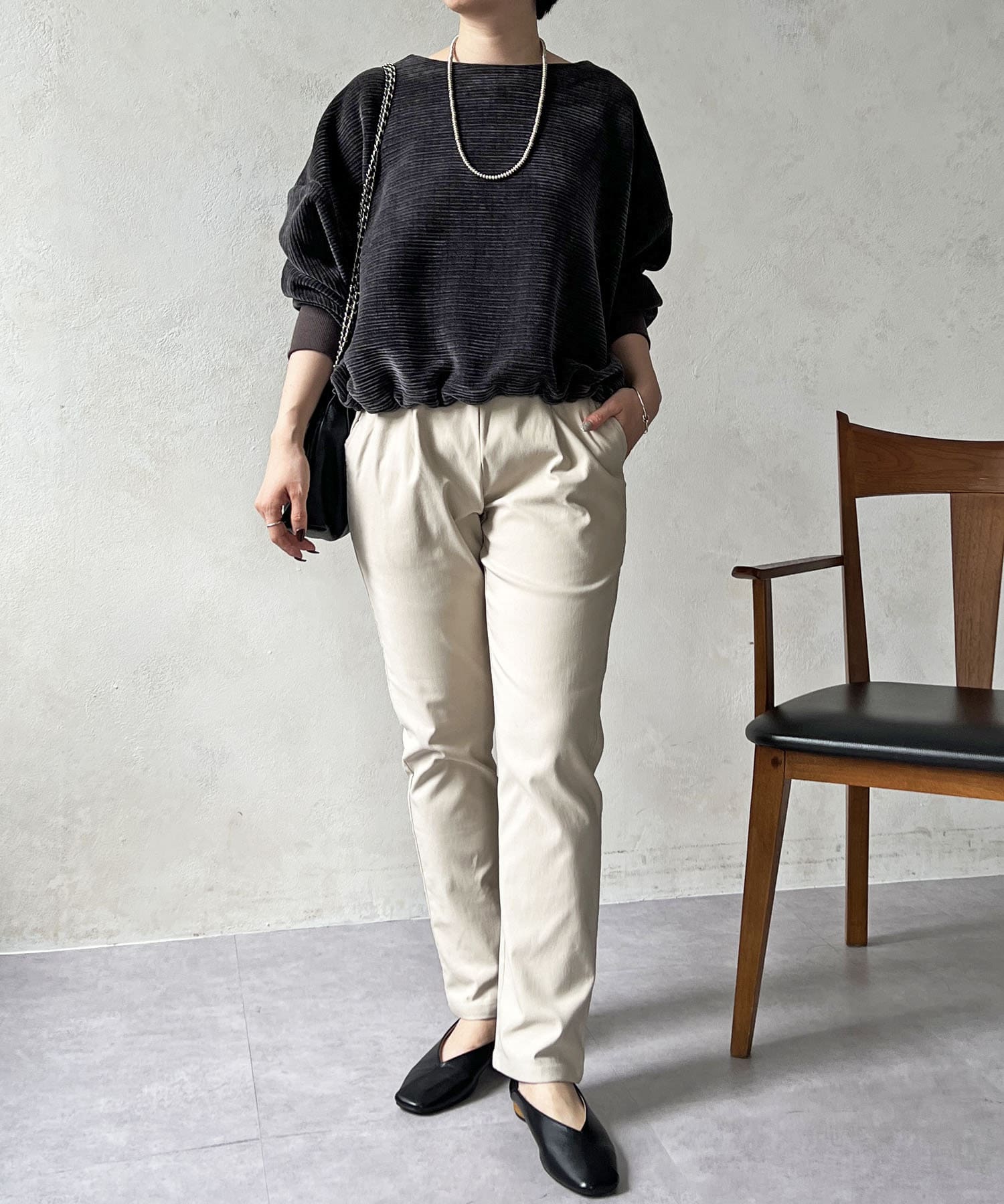 細見のパンツに見えるのに、中肉の生地で脚のラインを拾いにくく美脚見えが叶う嬉しいポイントも!