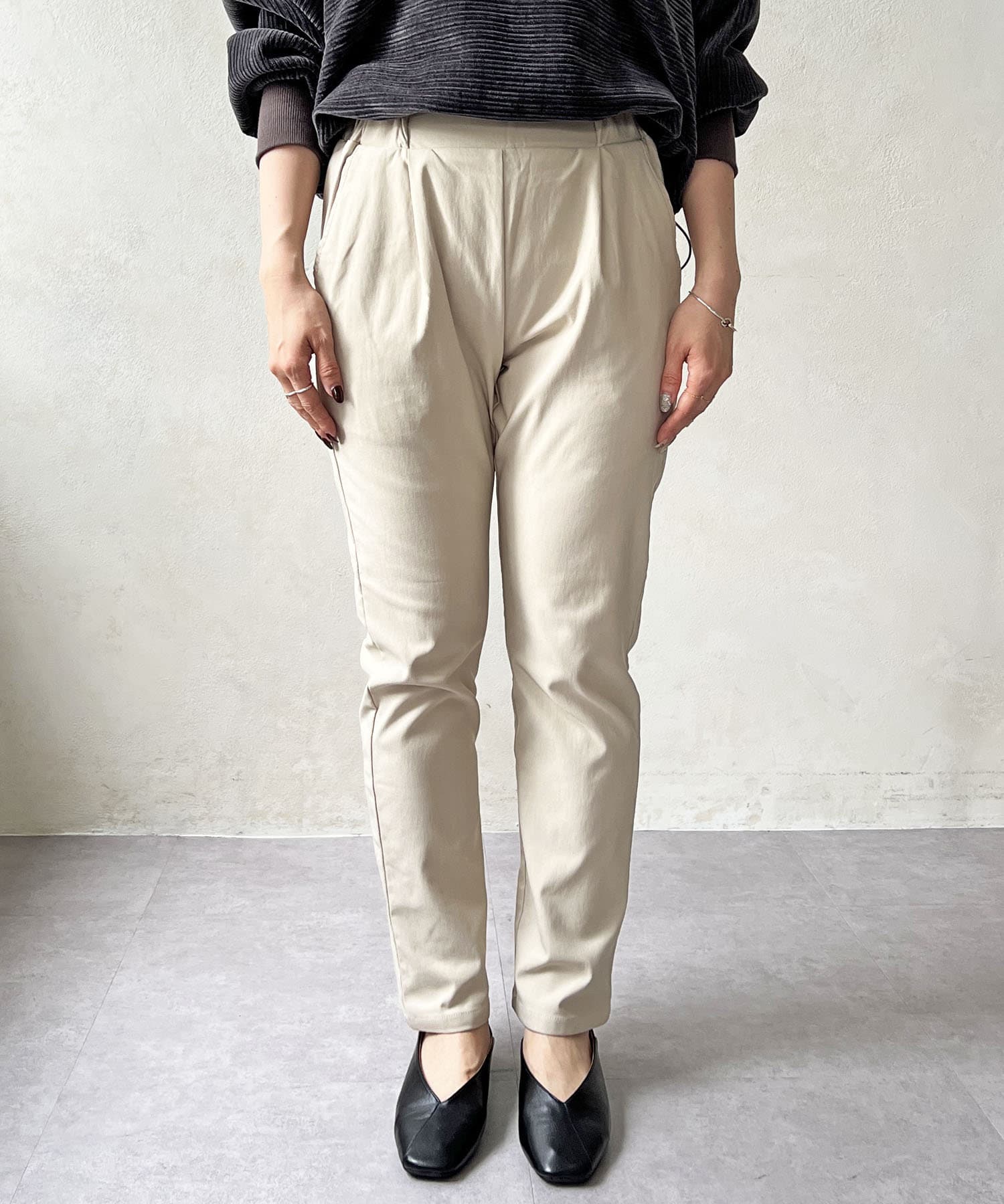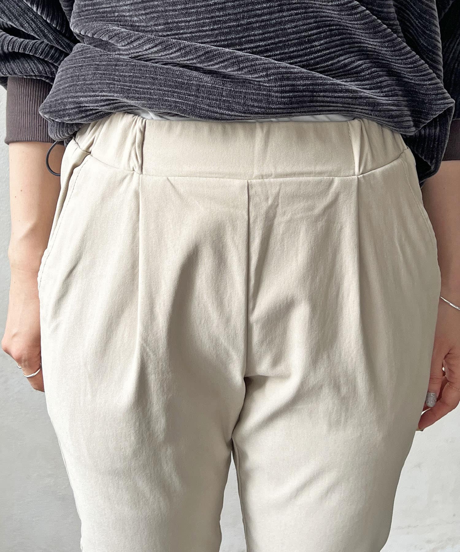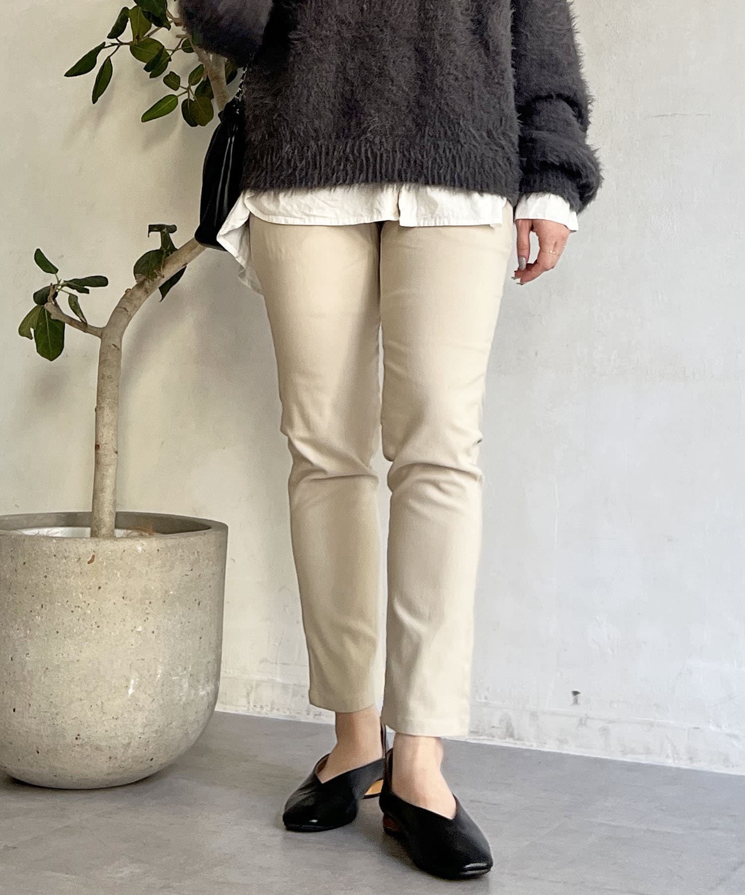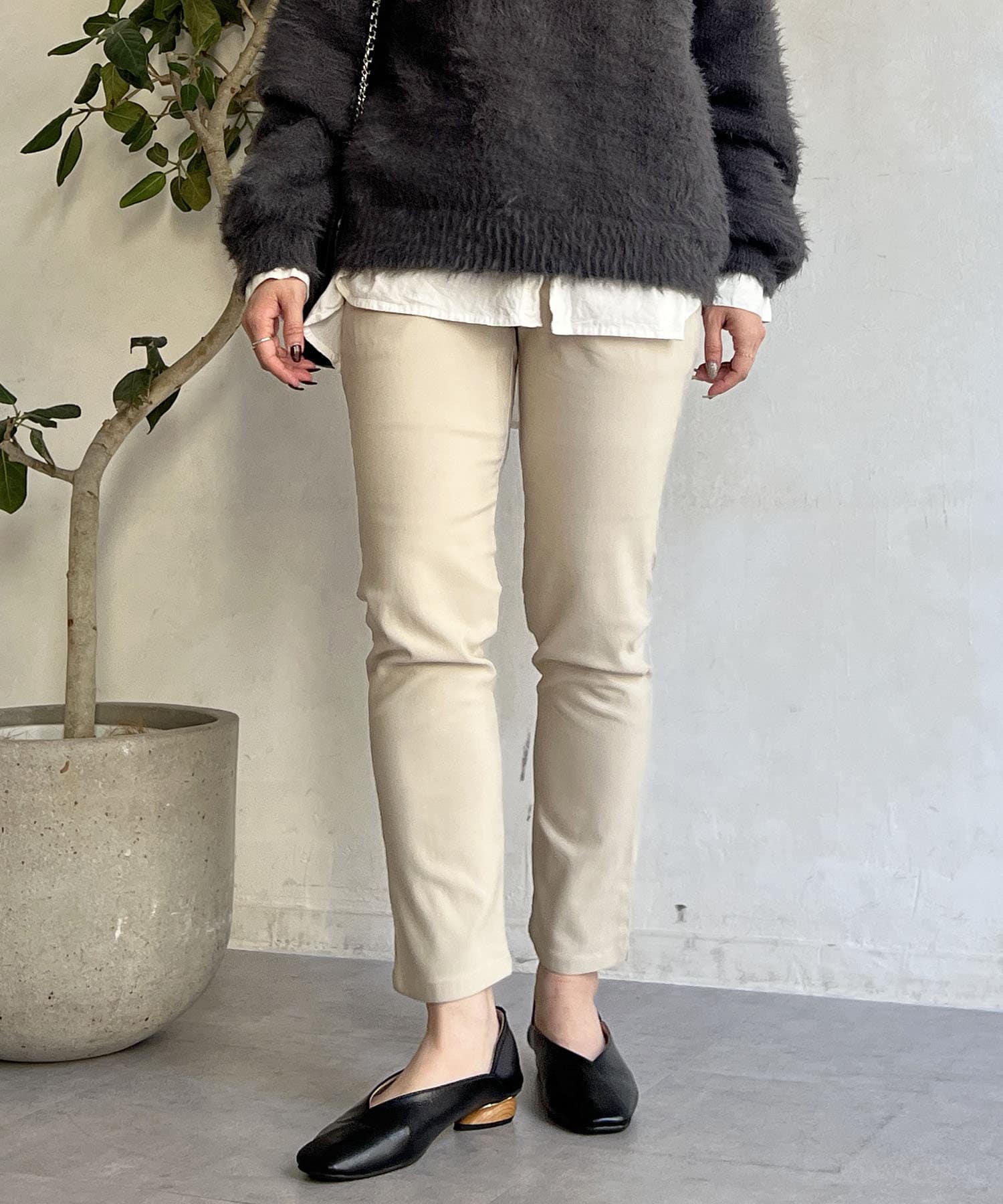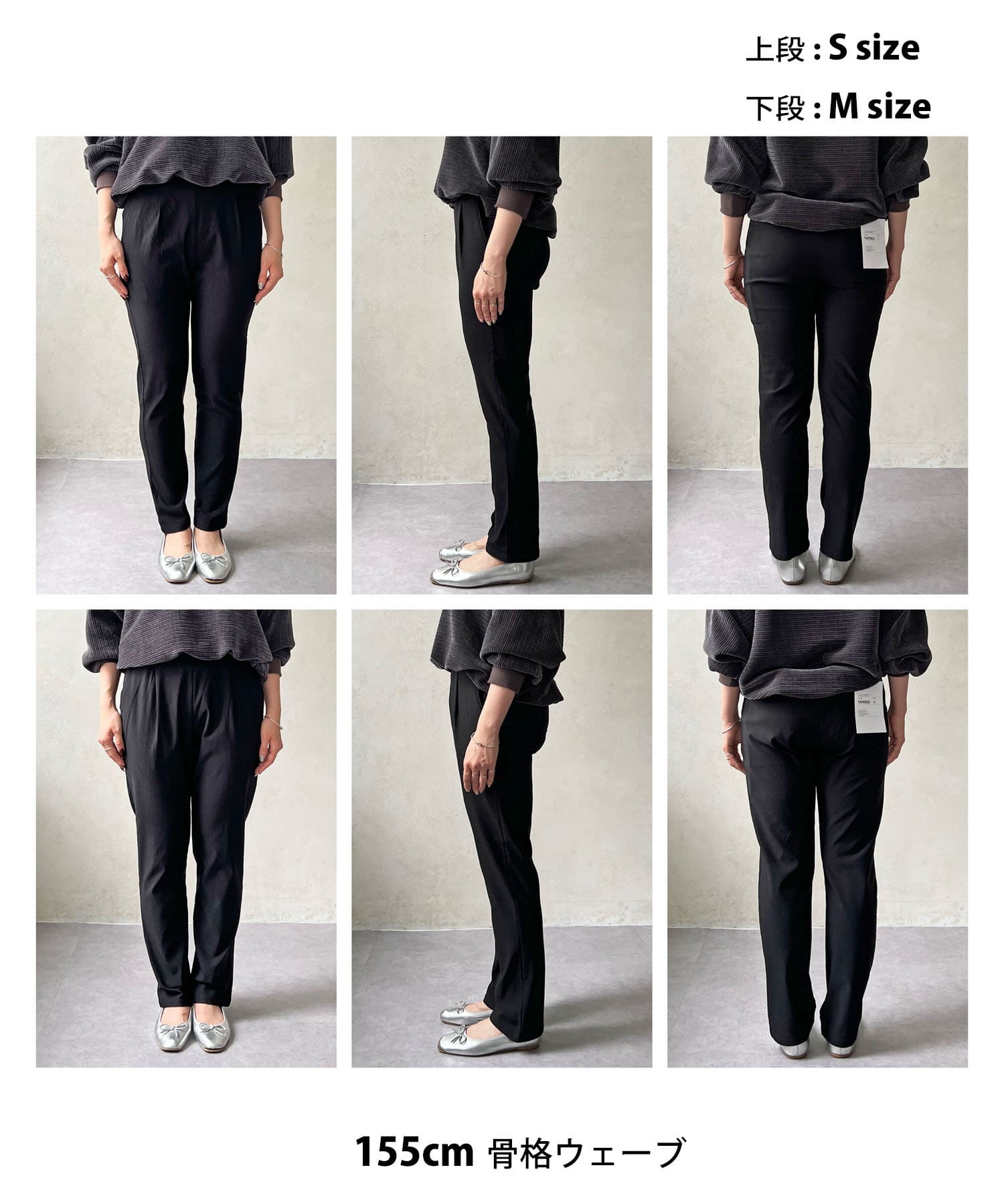 細見のパンツに見えるのに、中肉の生地で脚のラインを拾いにくく美脚見えが叶う嬉しいポイントも!