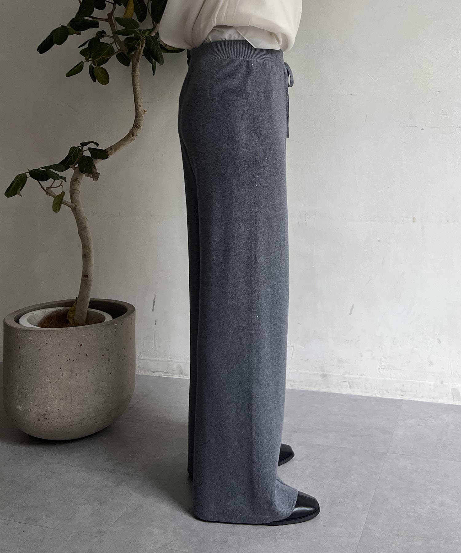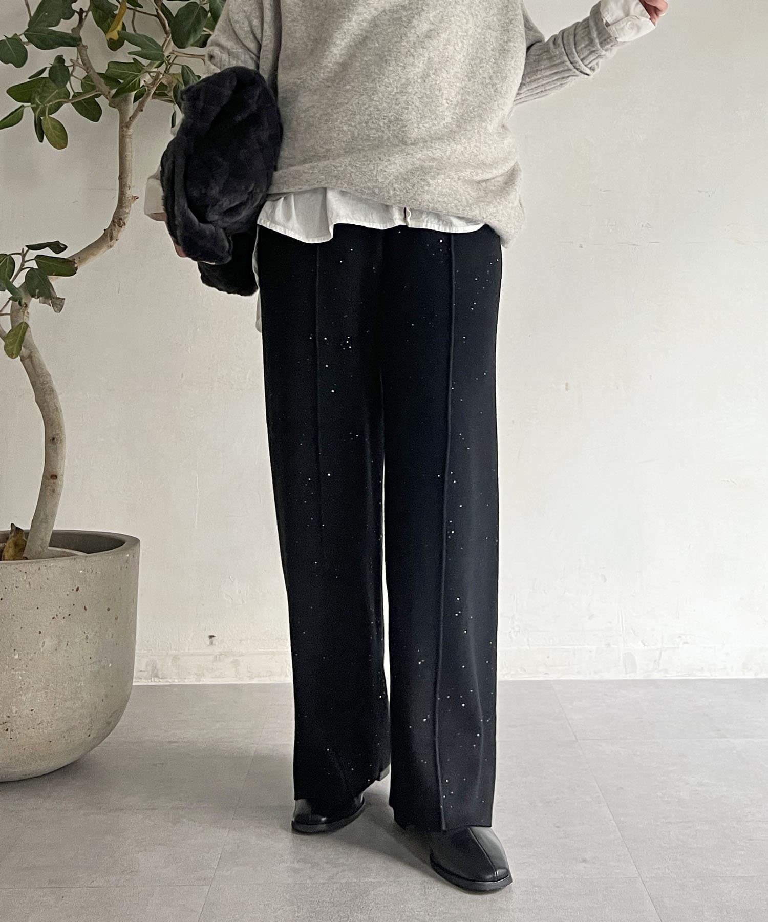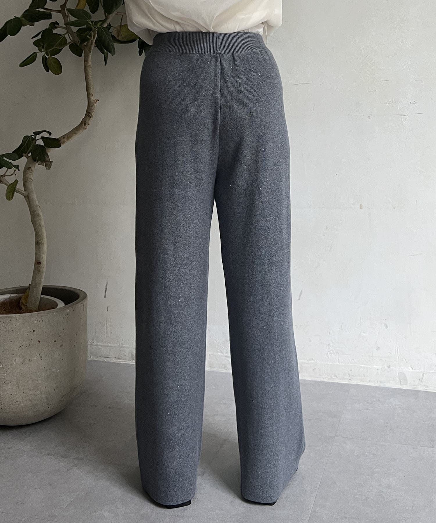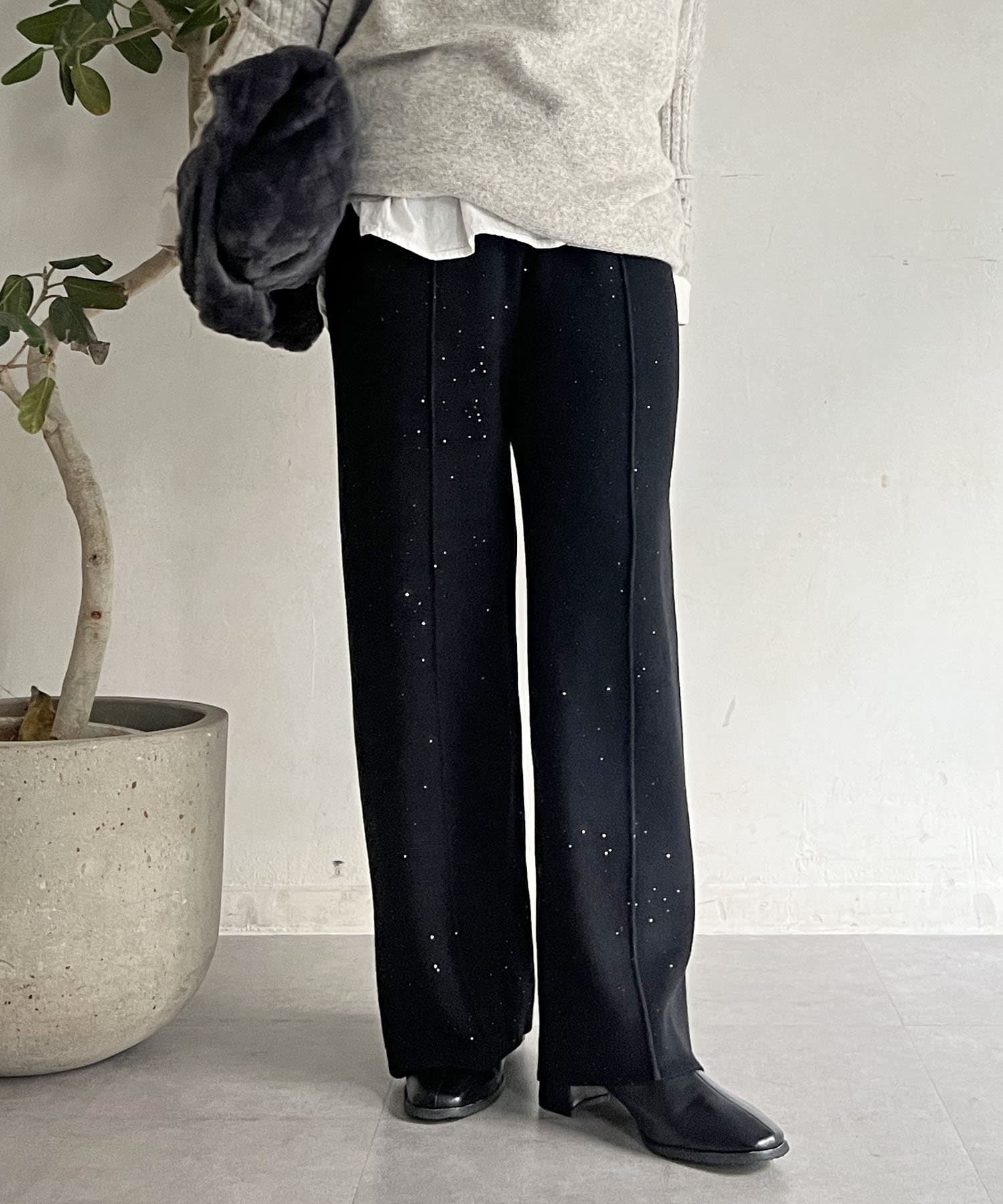 スパンコールが散りばめられたデザインで楽ちん×オシャレ見えニットパンツ