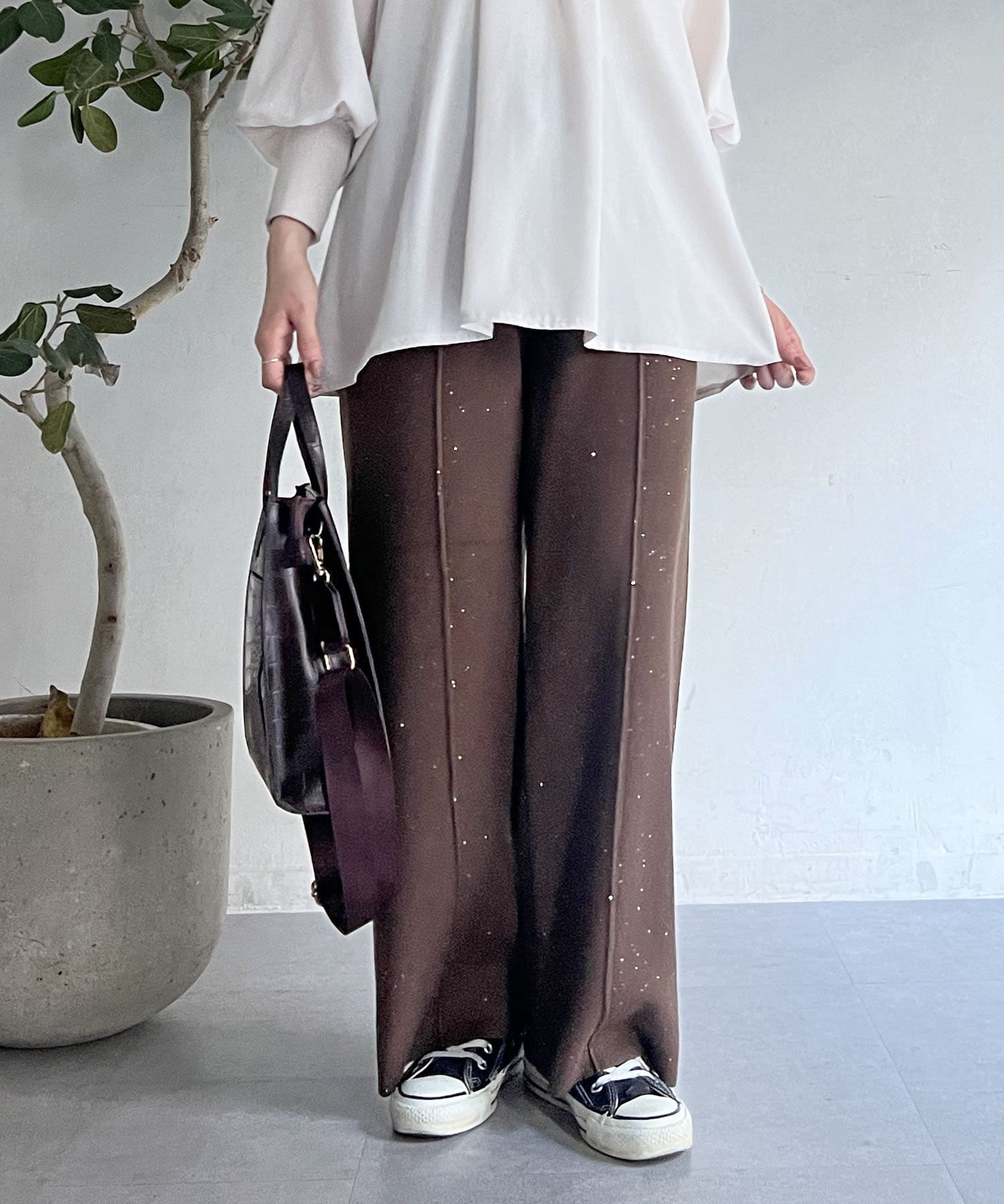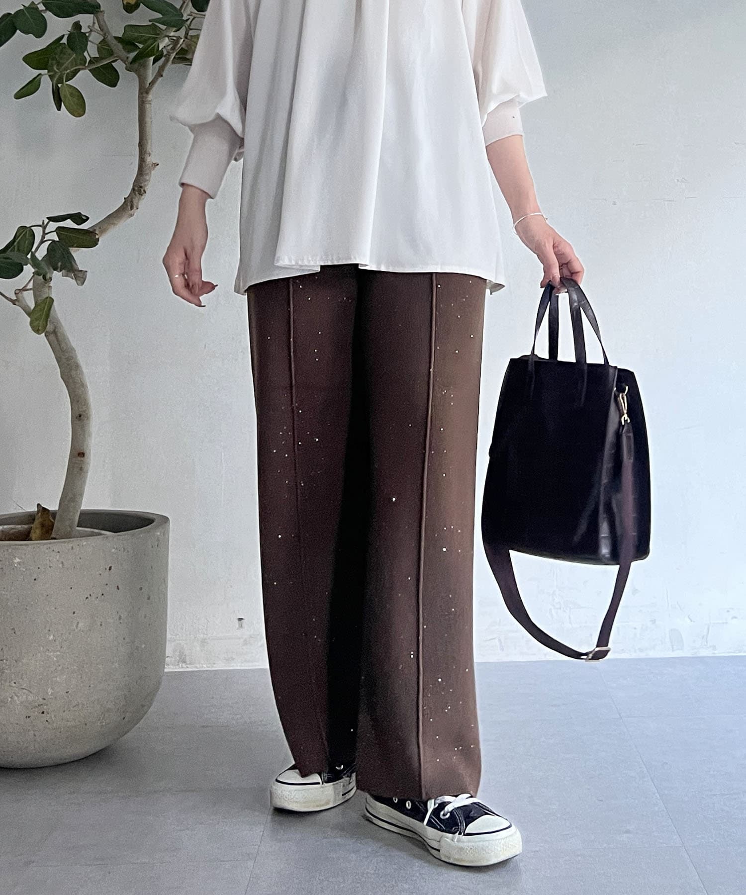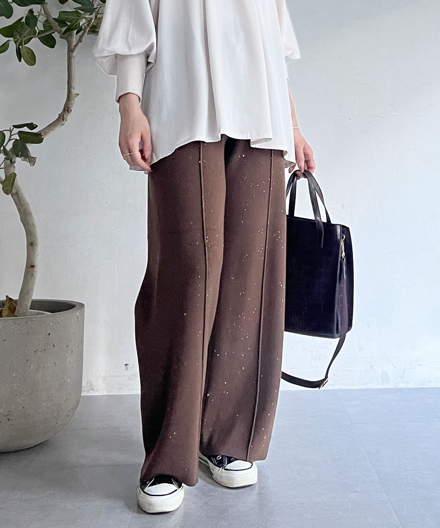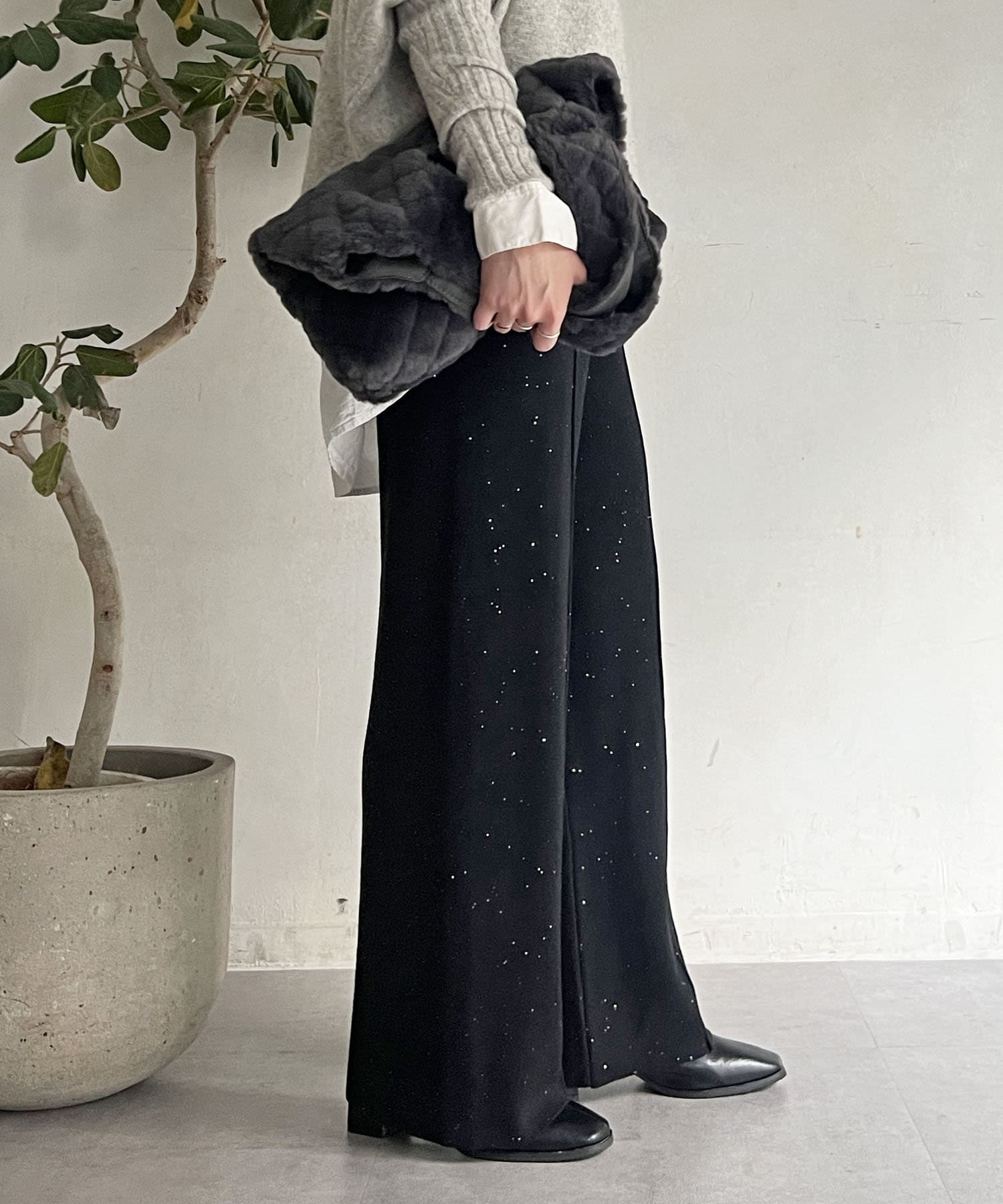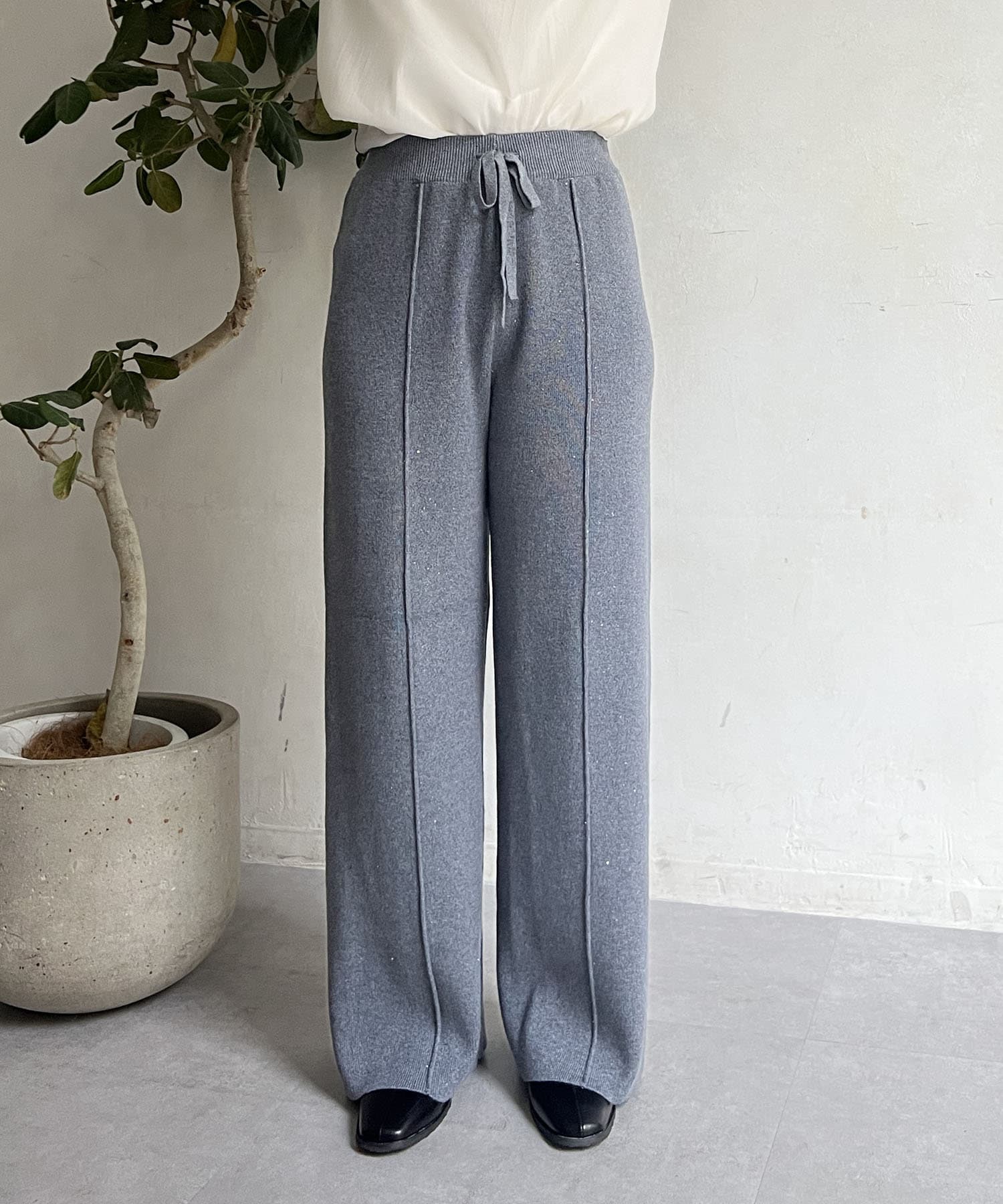 スパンコールが散りばめられたデザインで楽ちん×オシャレ見えニットパンツ