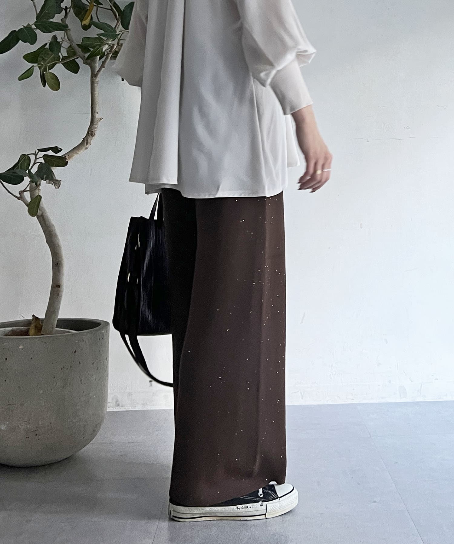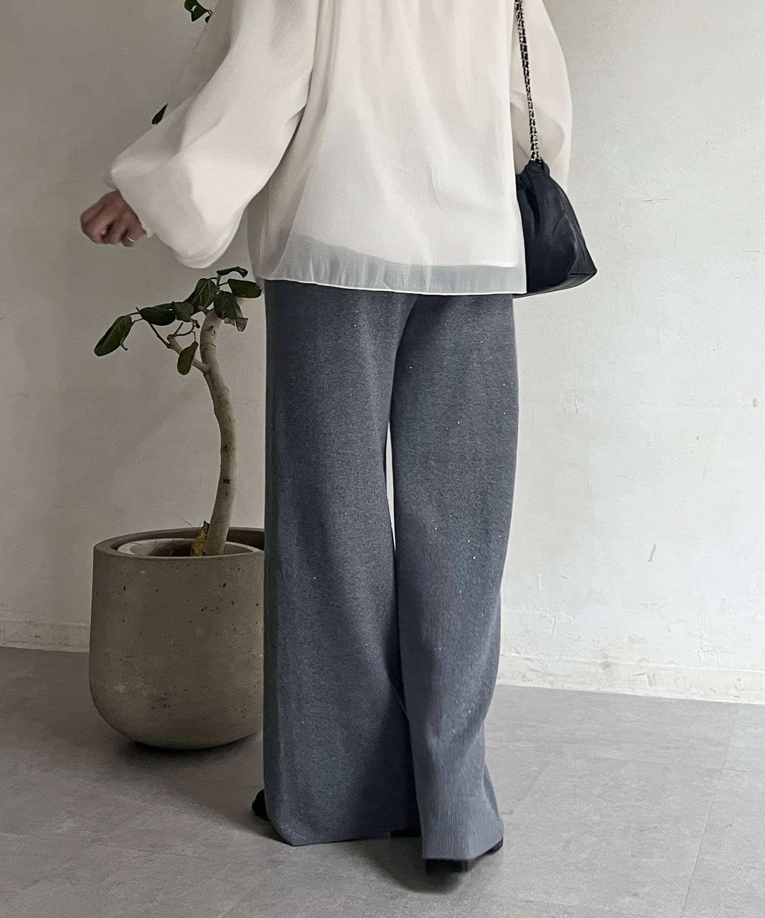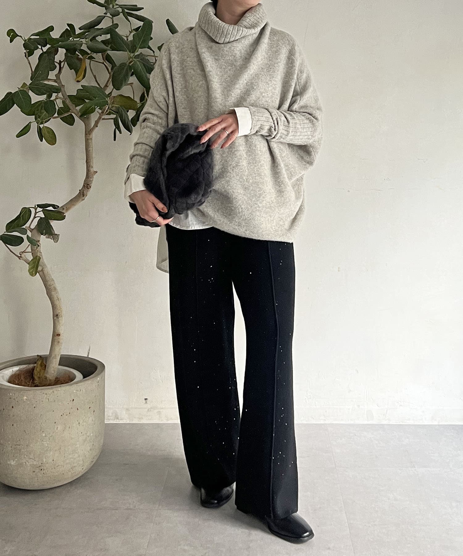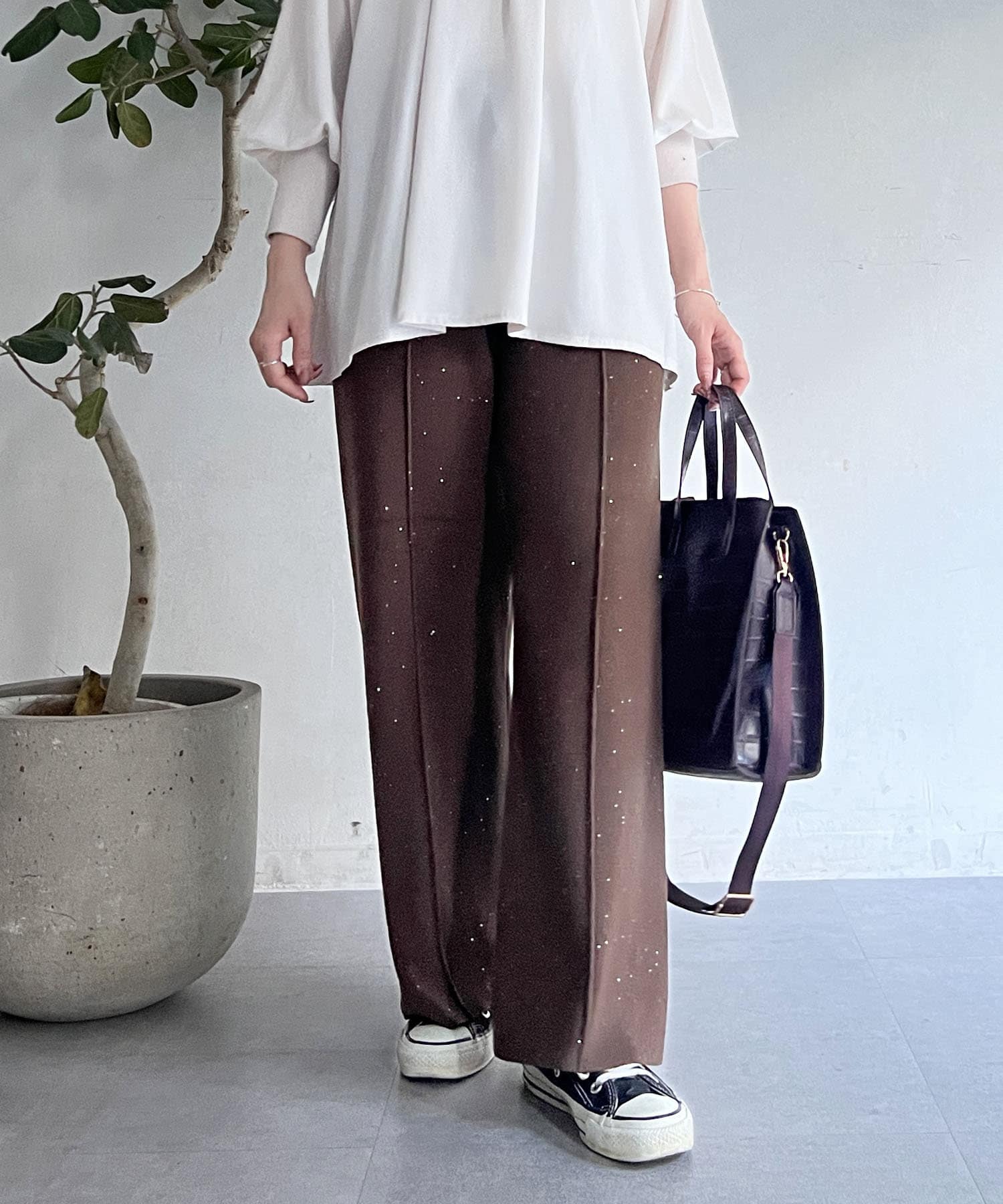 スパンコールが散りばめられたデザインで楽ちん×オシャレ見えニットパンツ