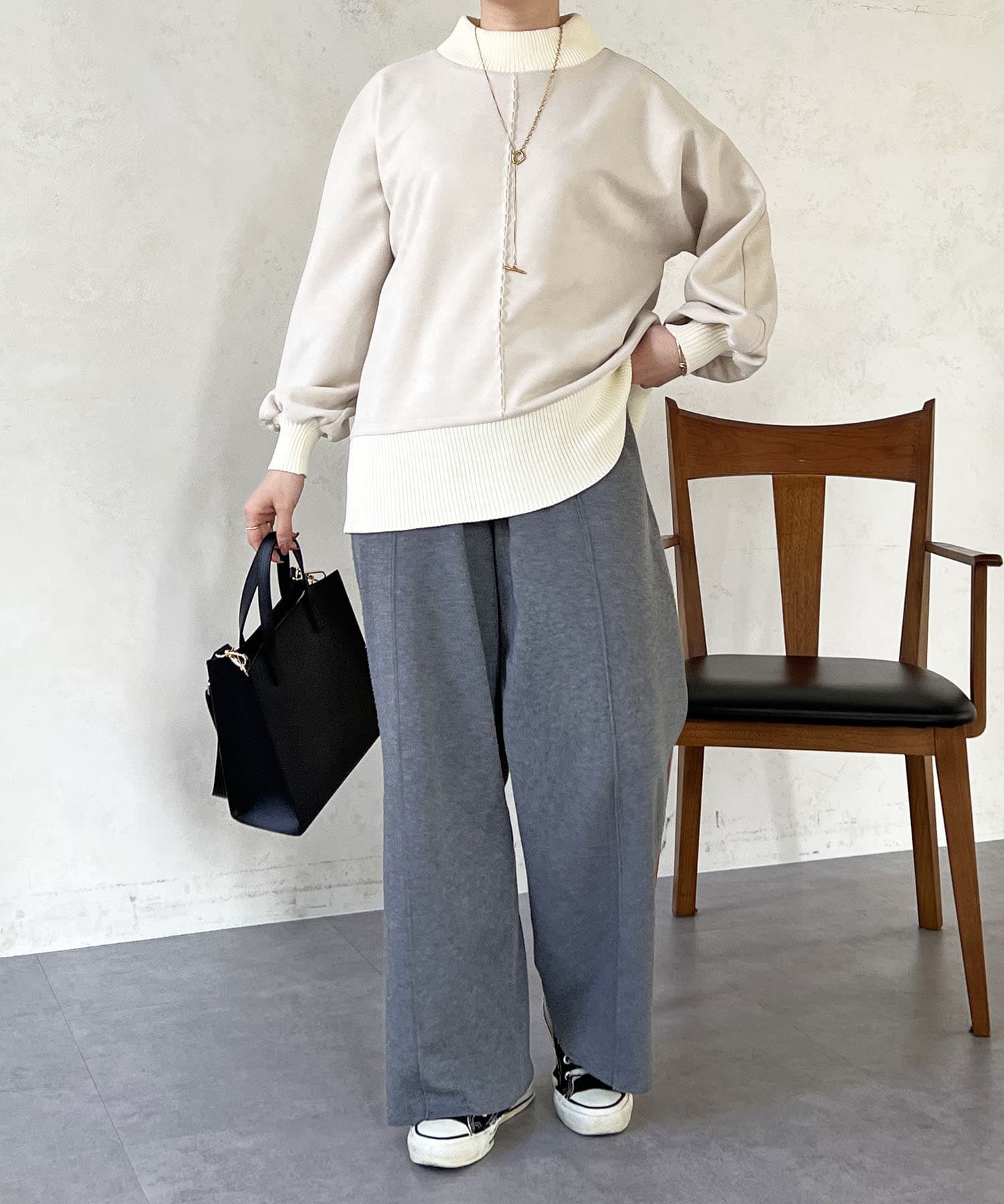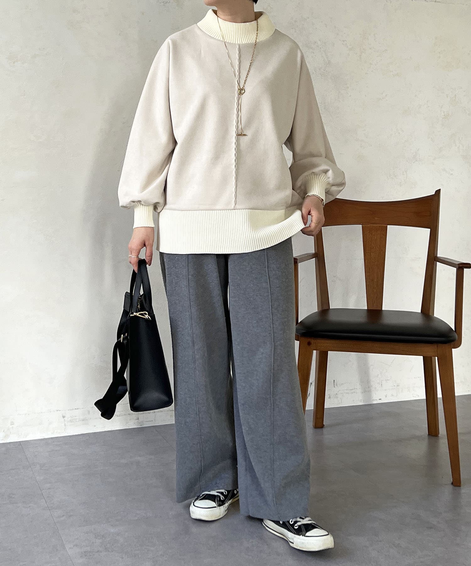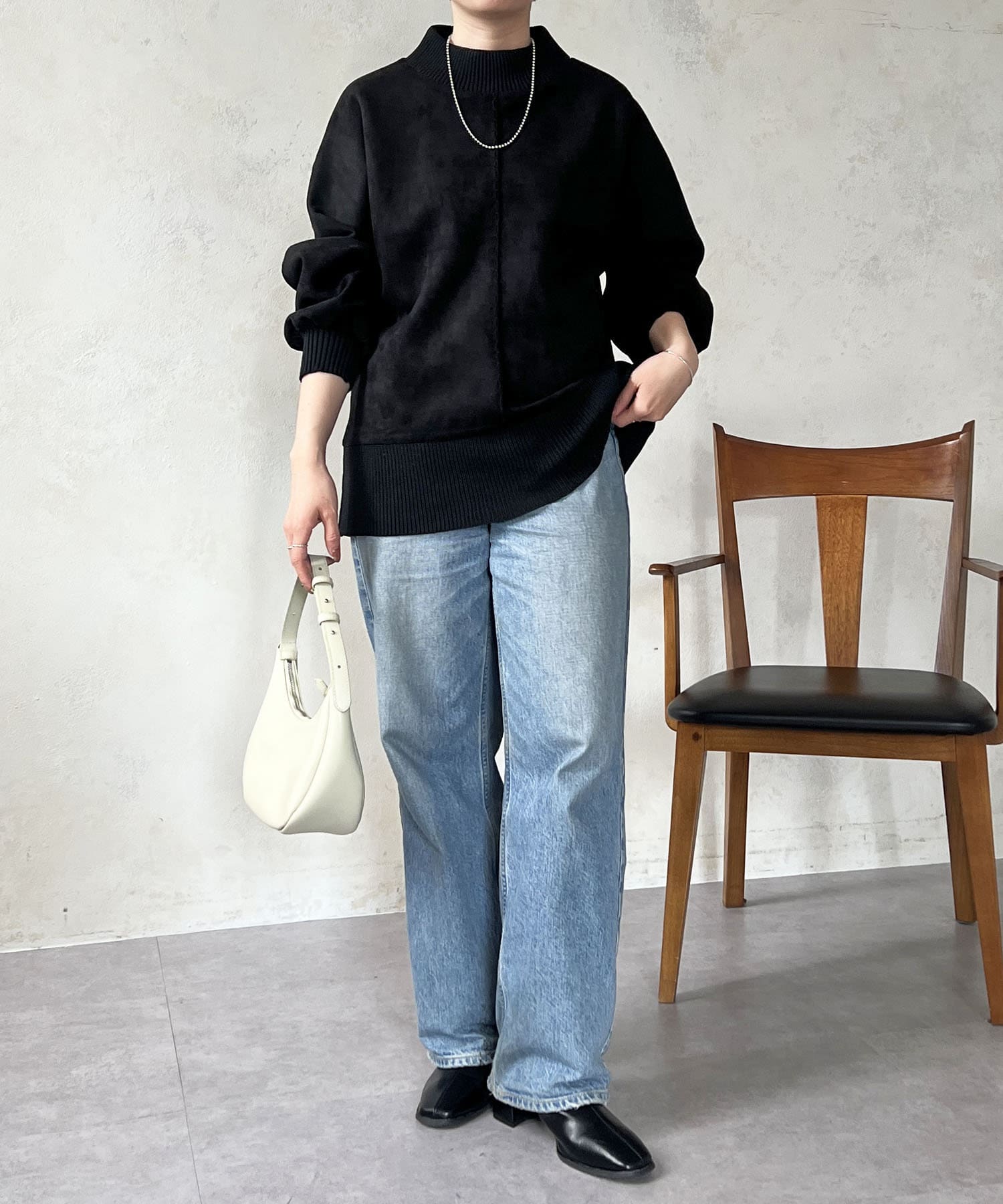 ストンとしたシルエットが甘すぎず、ボトムスとの相性抜群です。