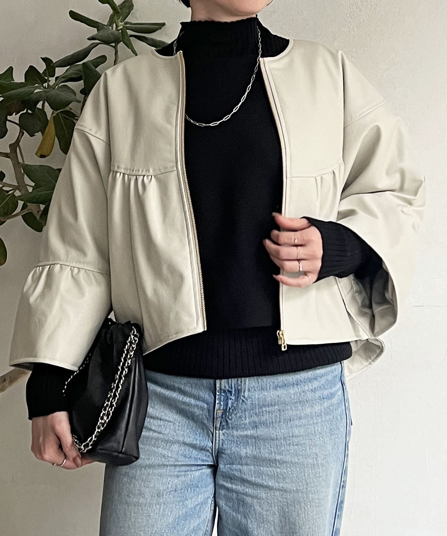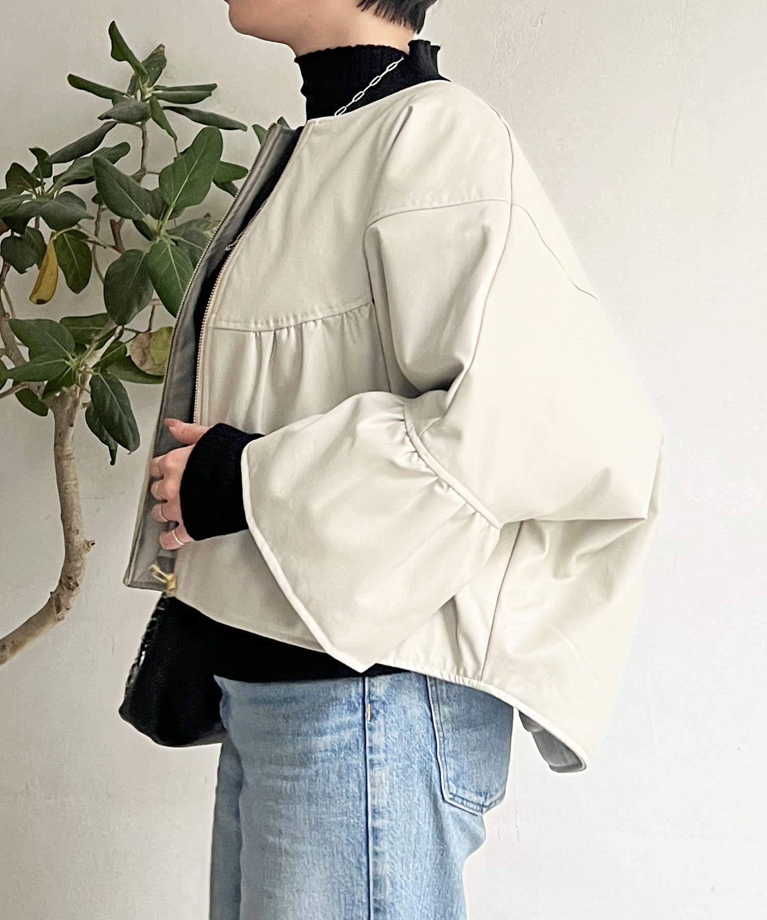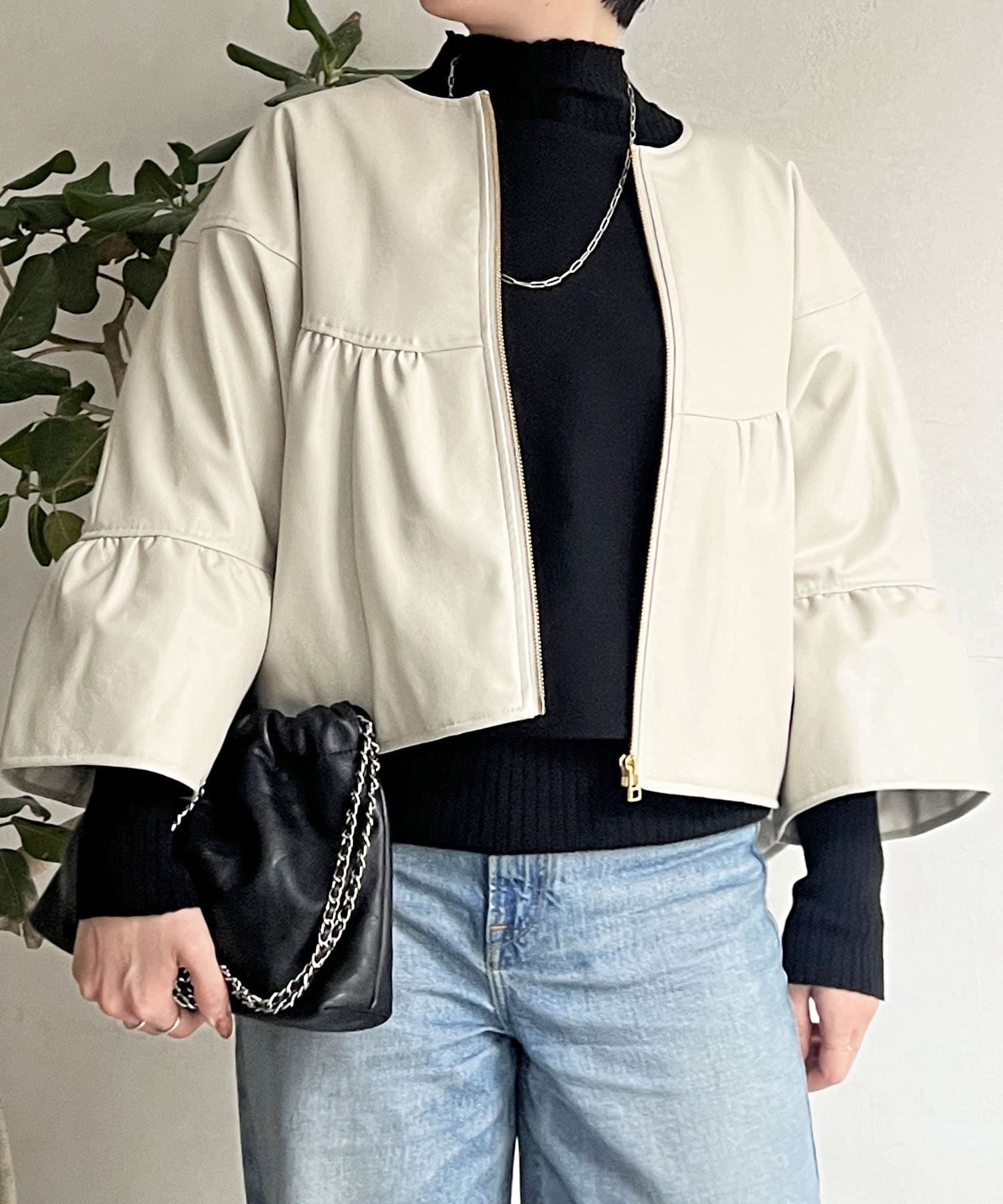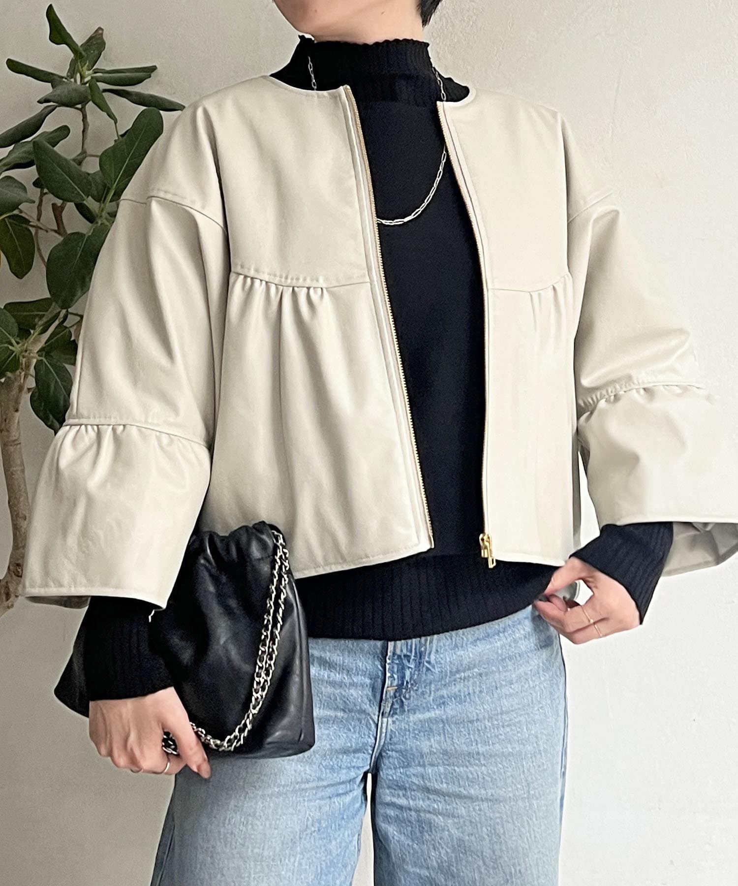 ・袖がフレアシルエットになっているので、レザージャケットでもエレガントな印象に