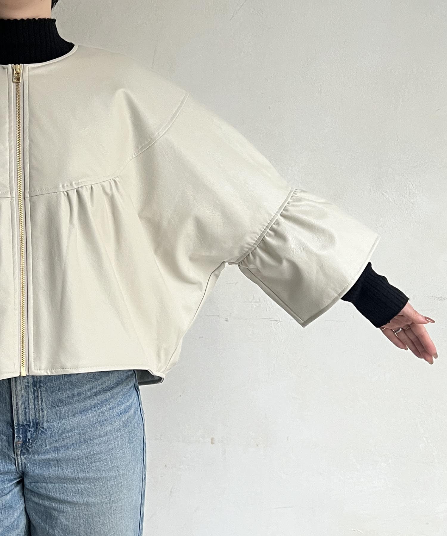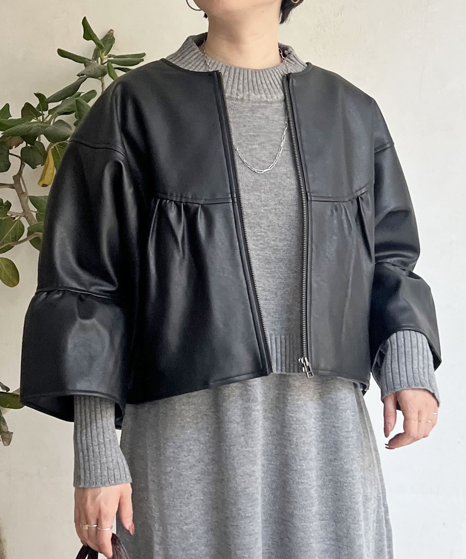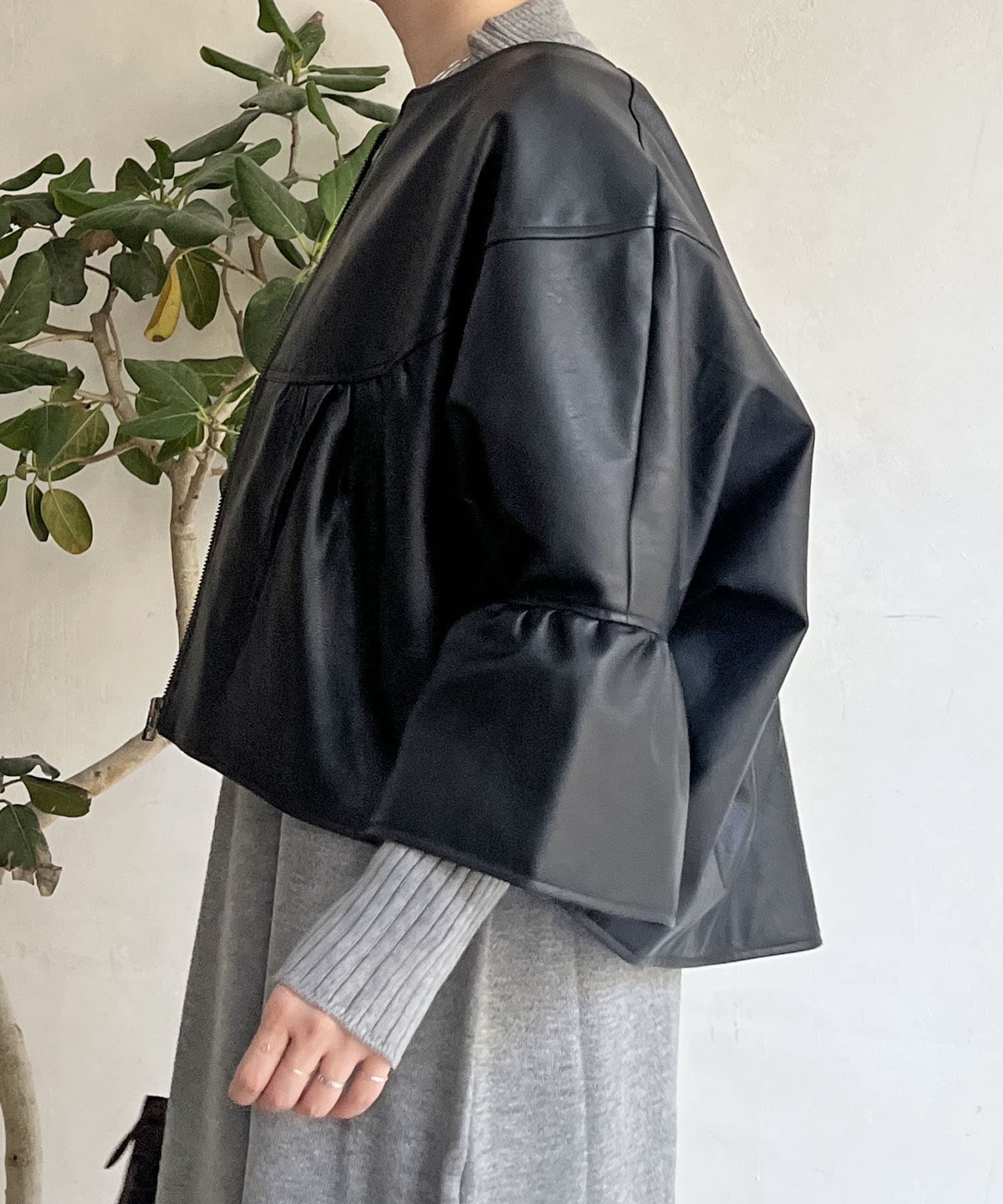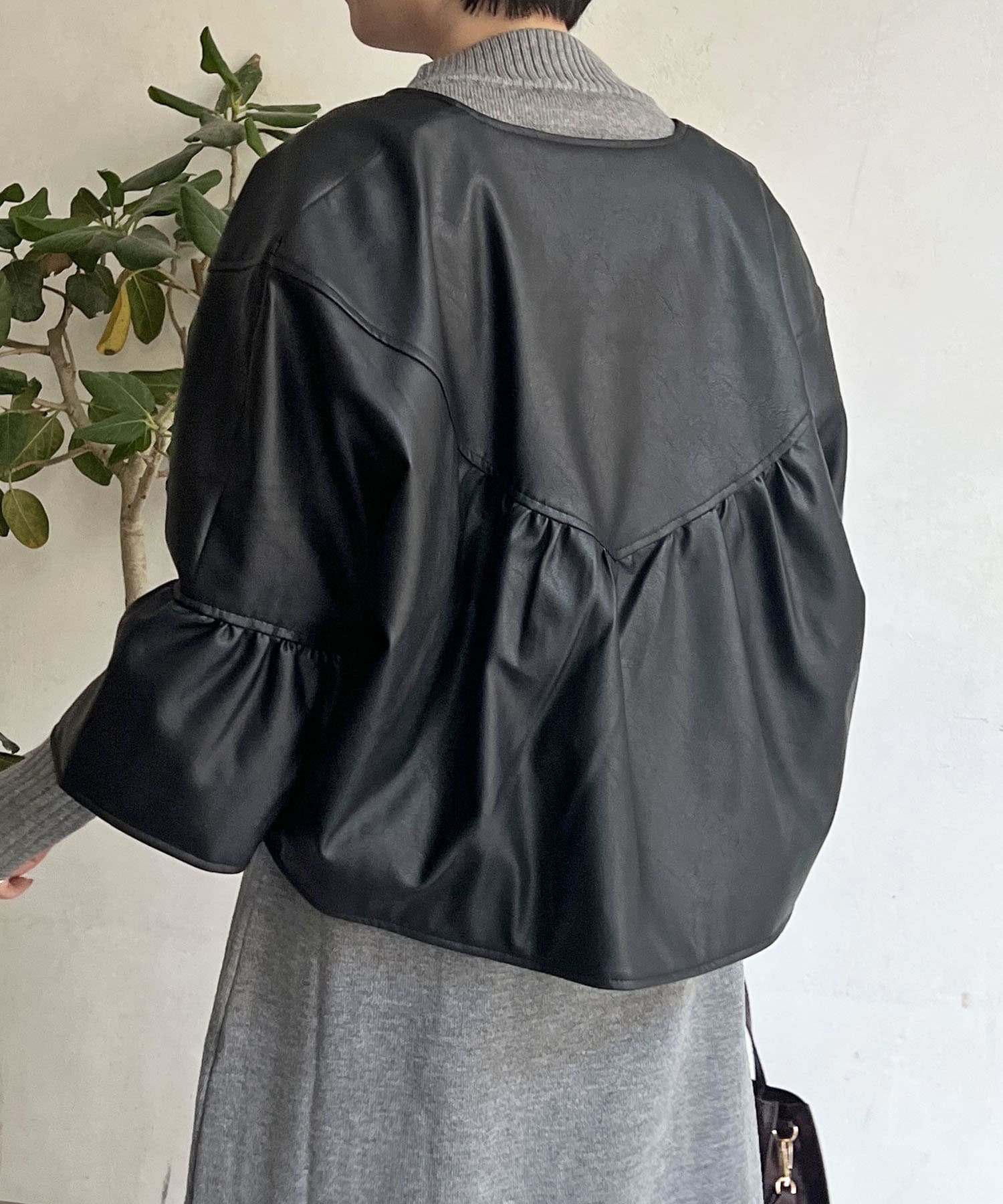 ・袖がフレアシルエットになっているので、レザージャケットでもエレガントな印象に