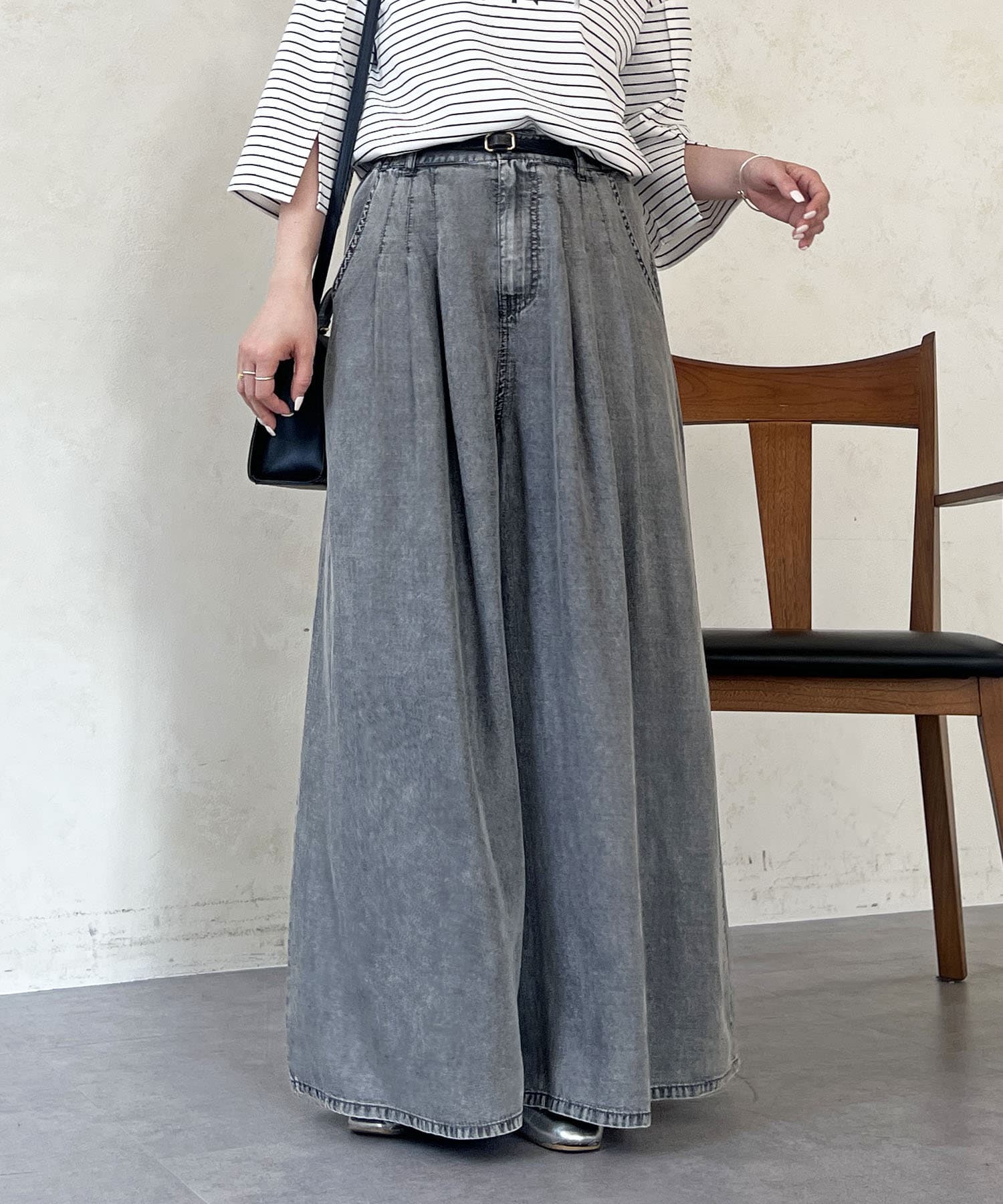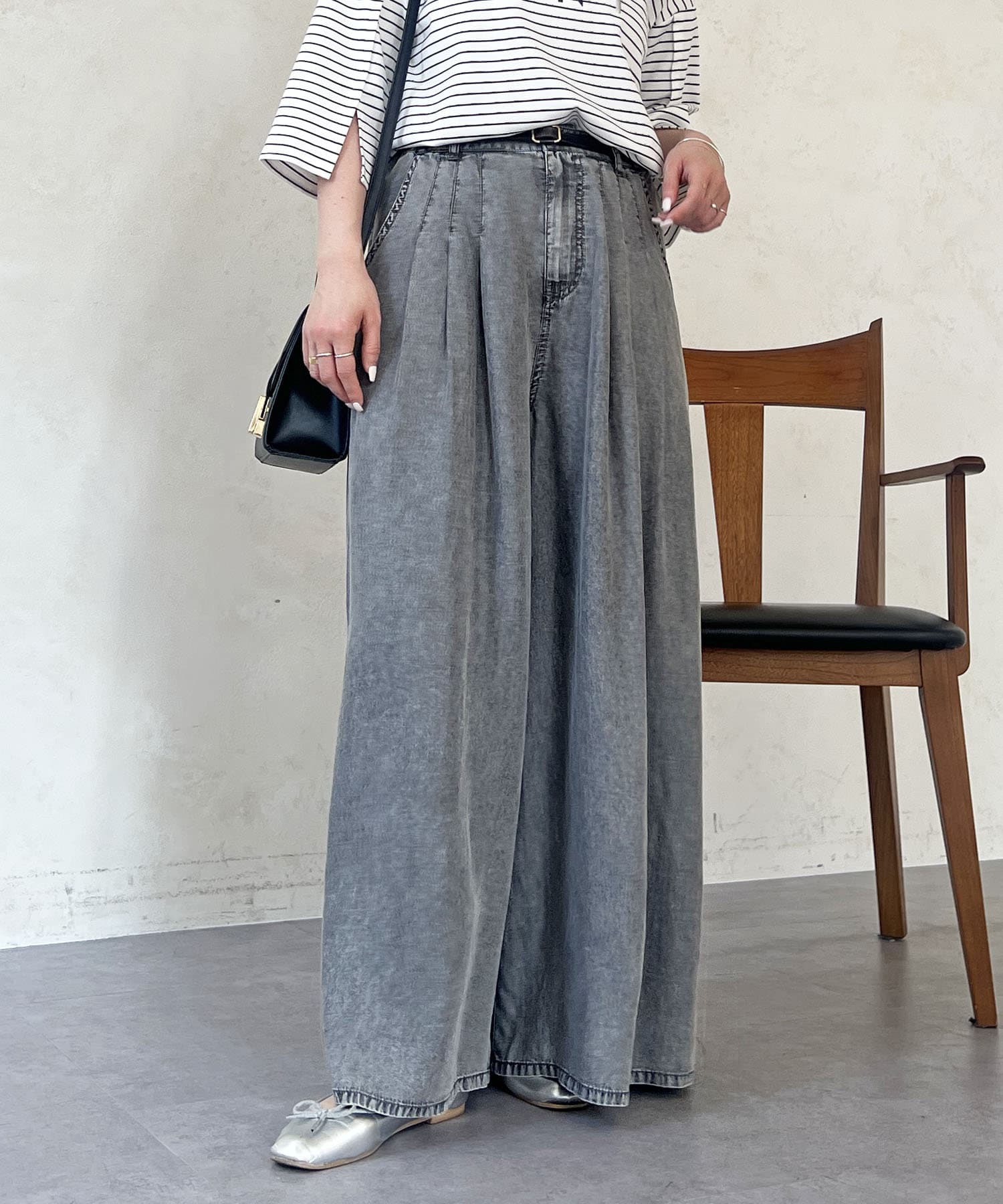 ・ウエスト位置にはタックを施し、きれいな落ち感シルエット