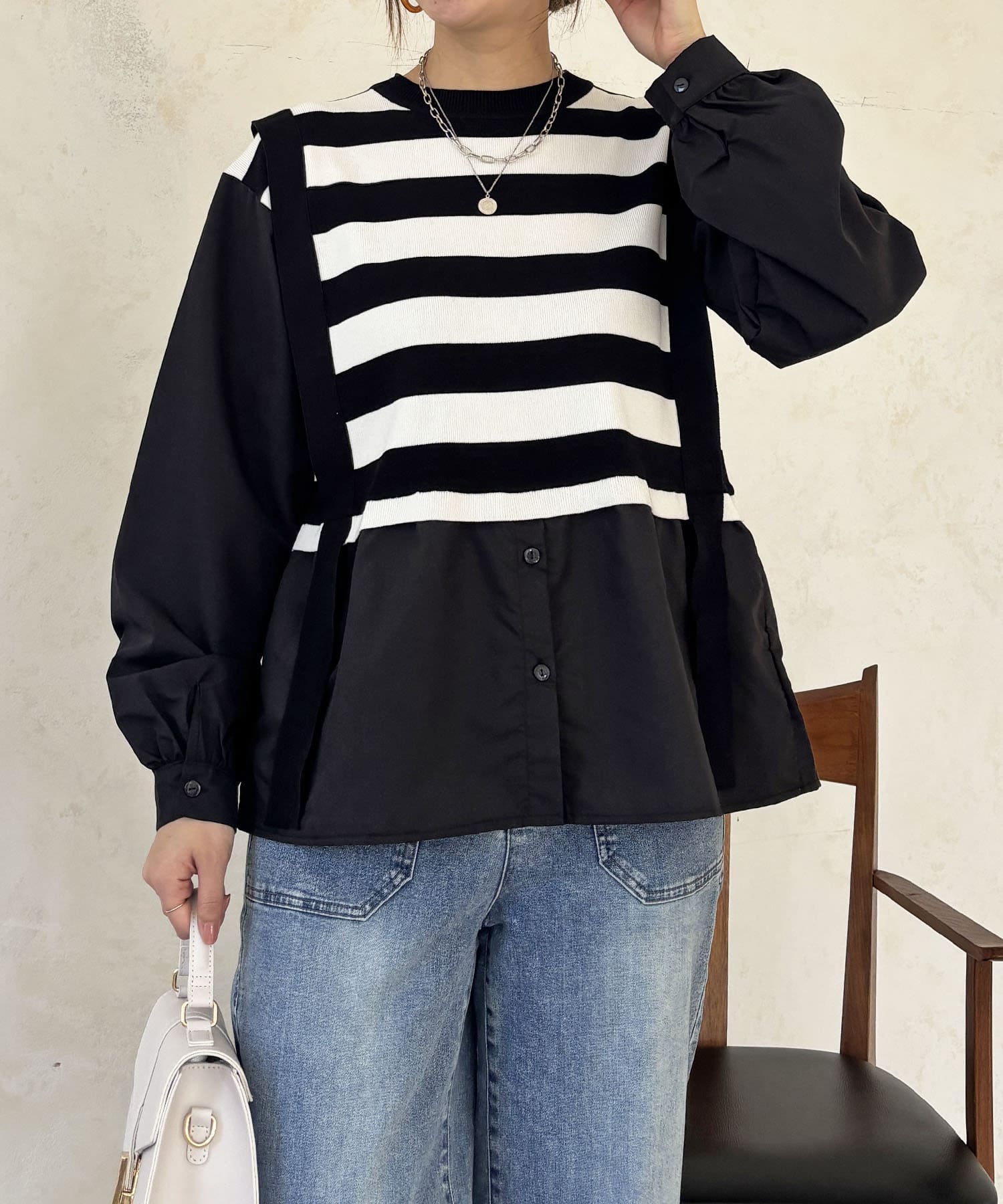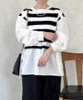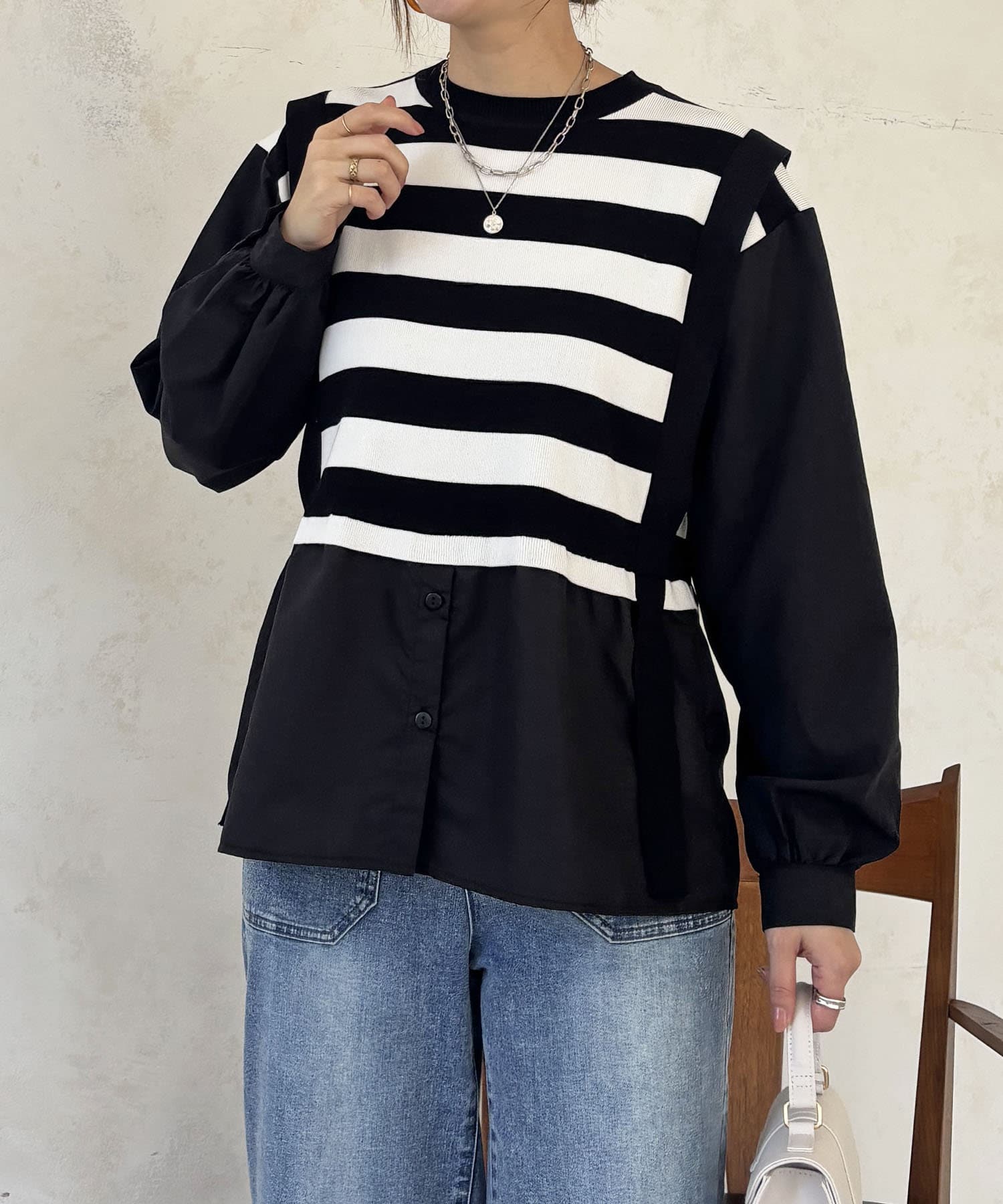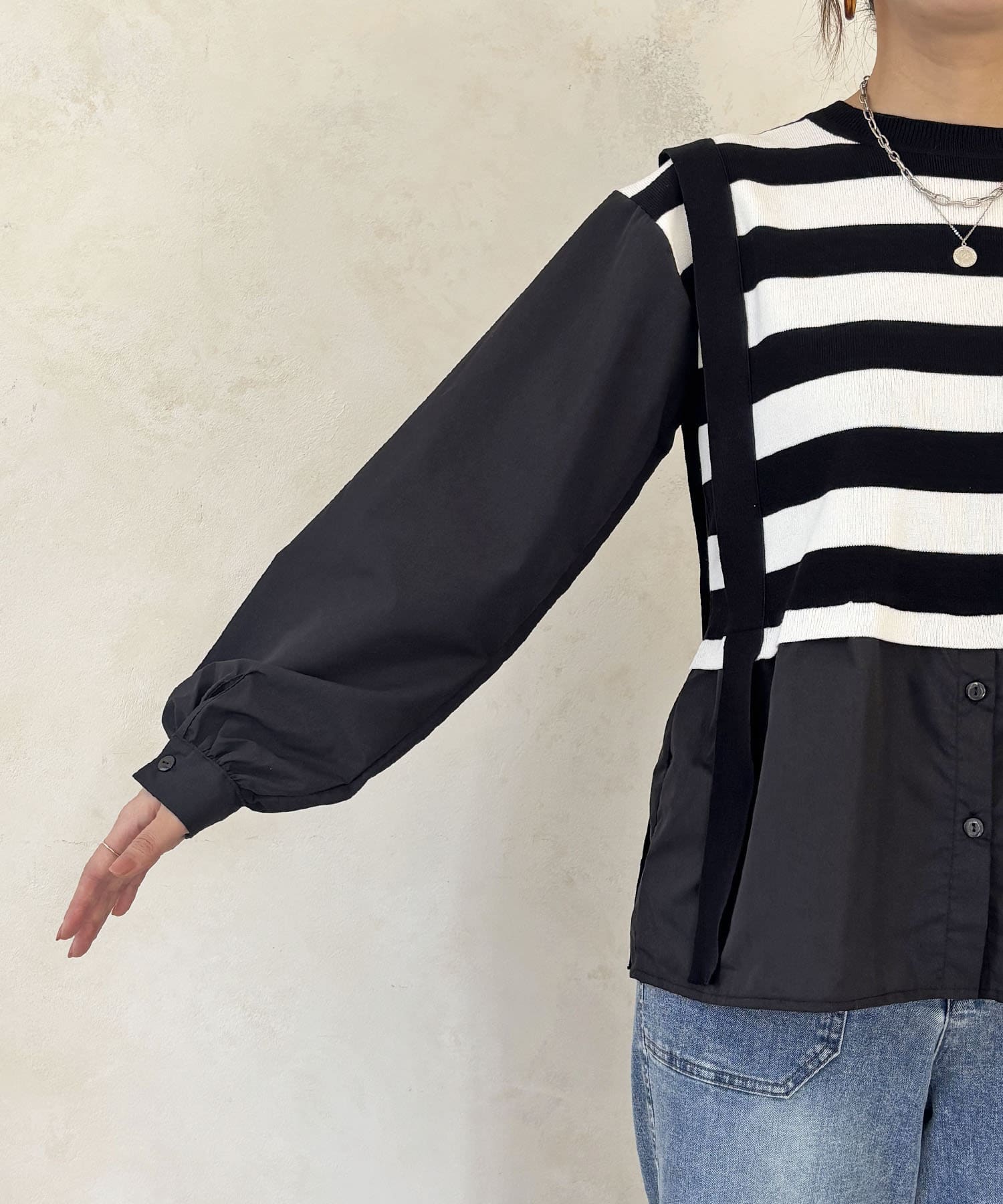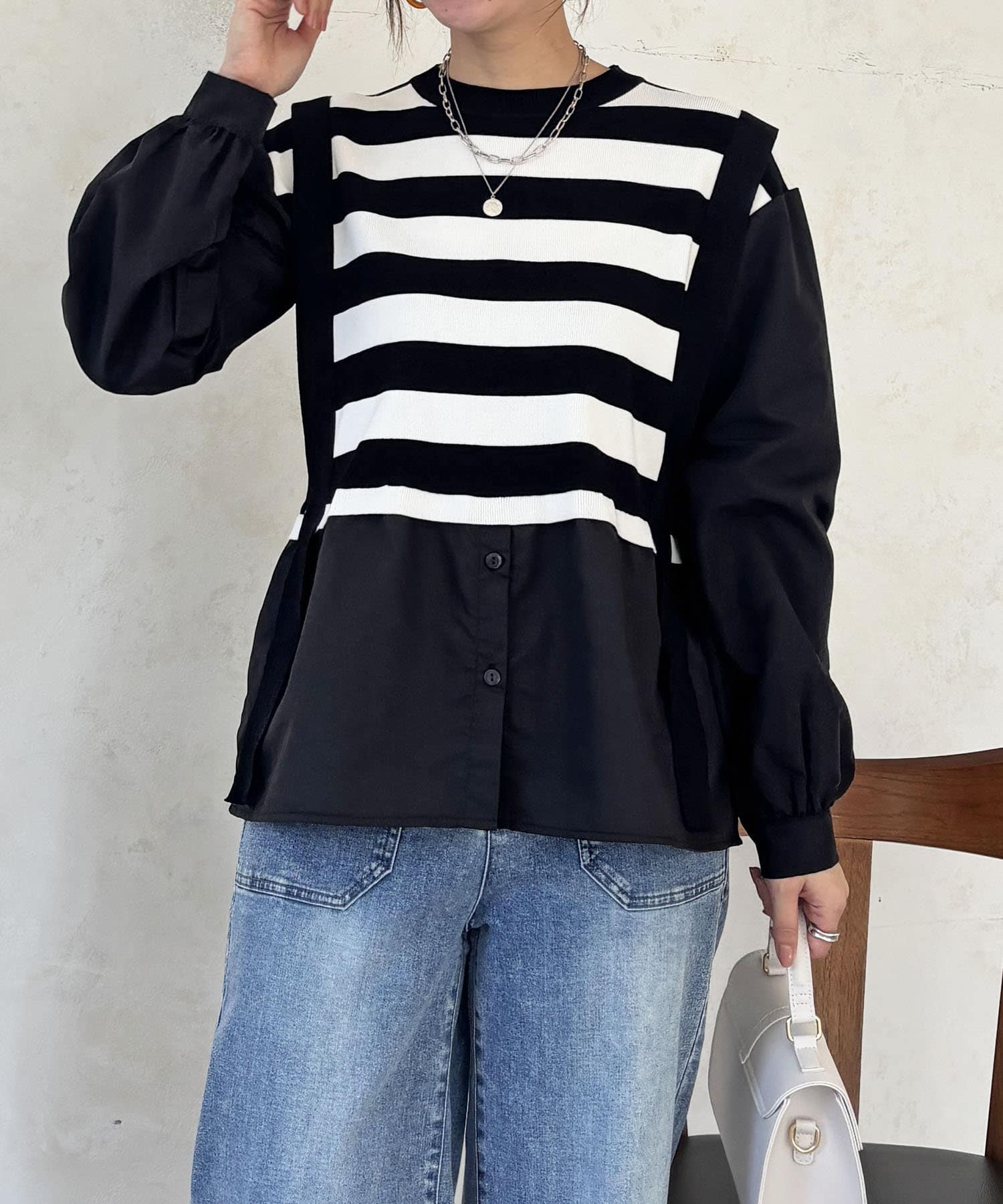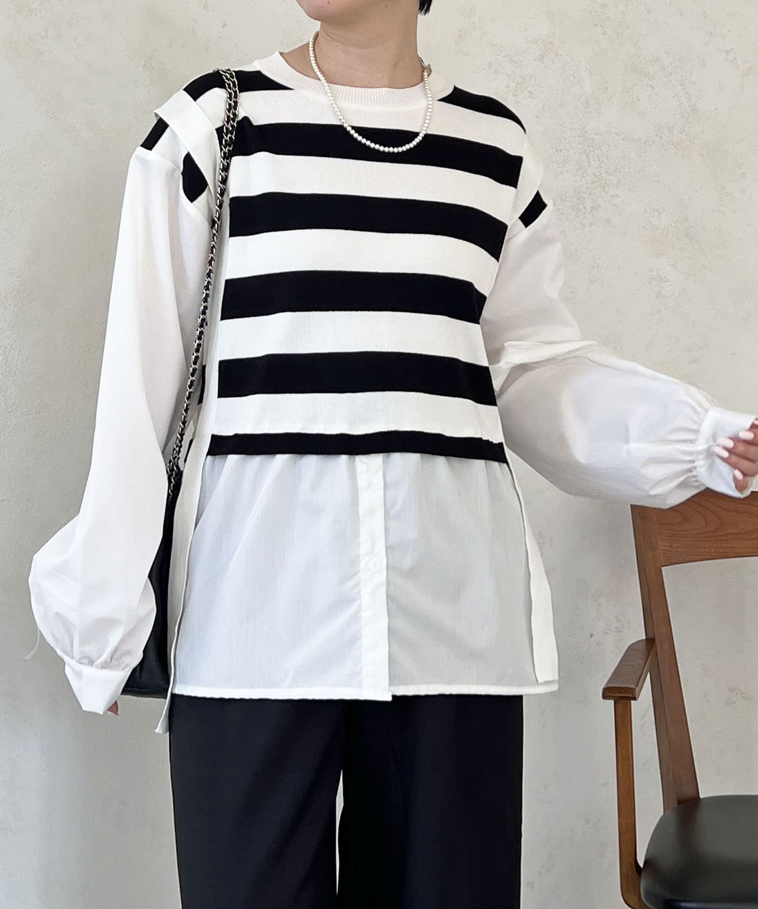 ニット×ブラウスのレイヤー風デザインが一枚でオシャレ見えする切替プルオーバー