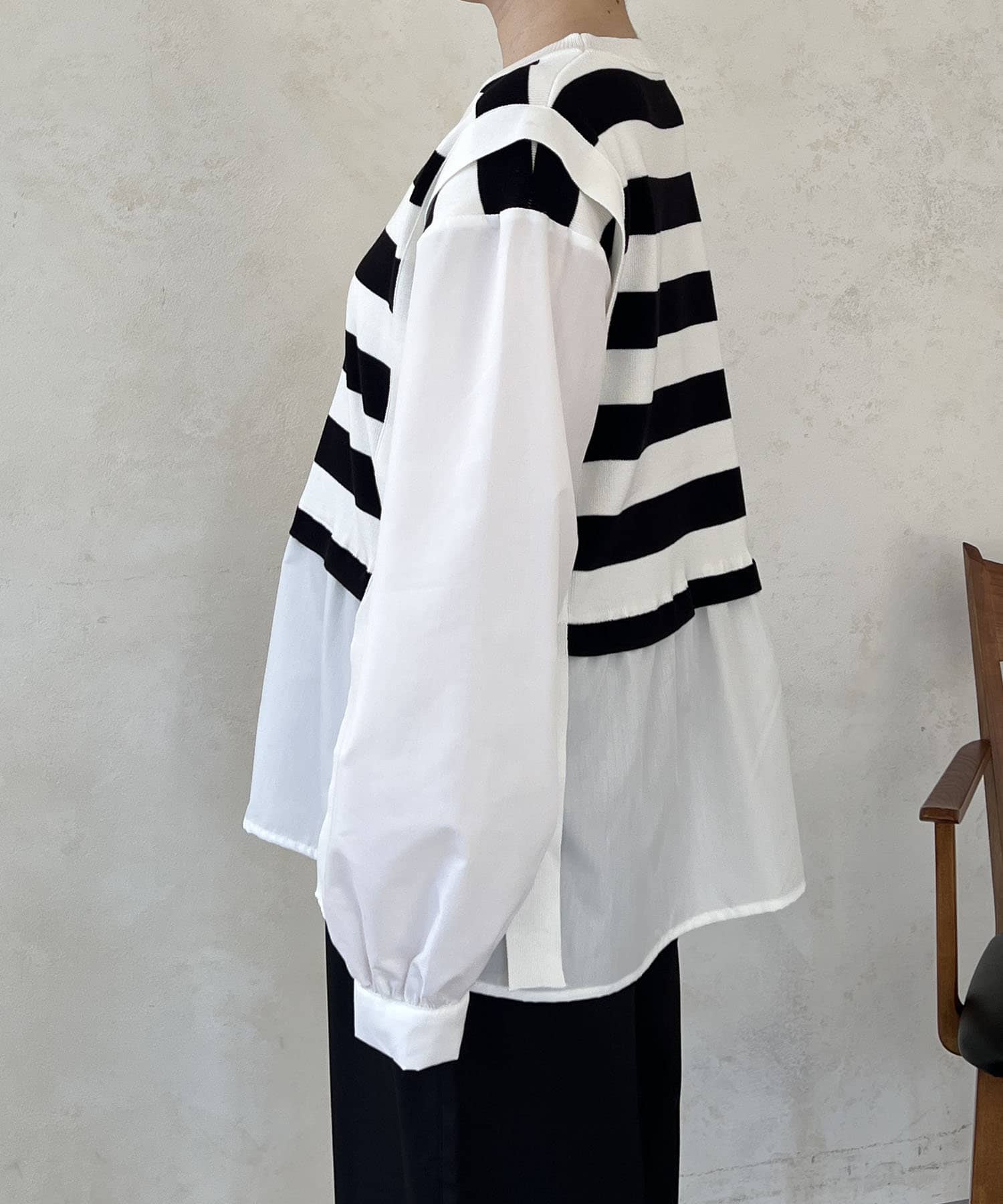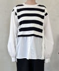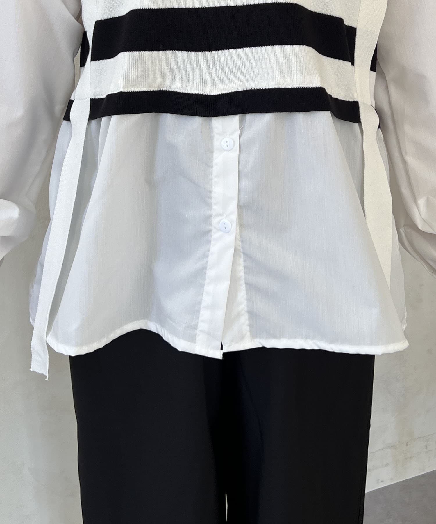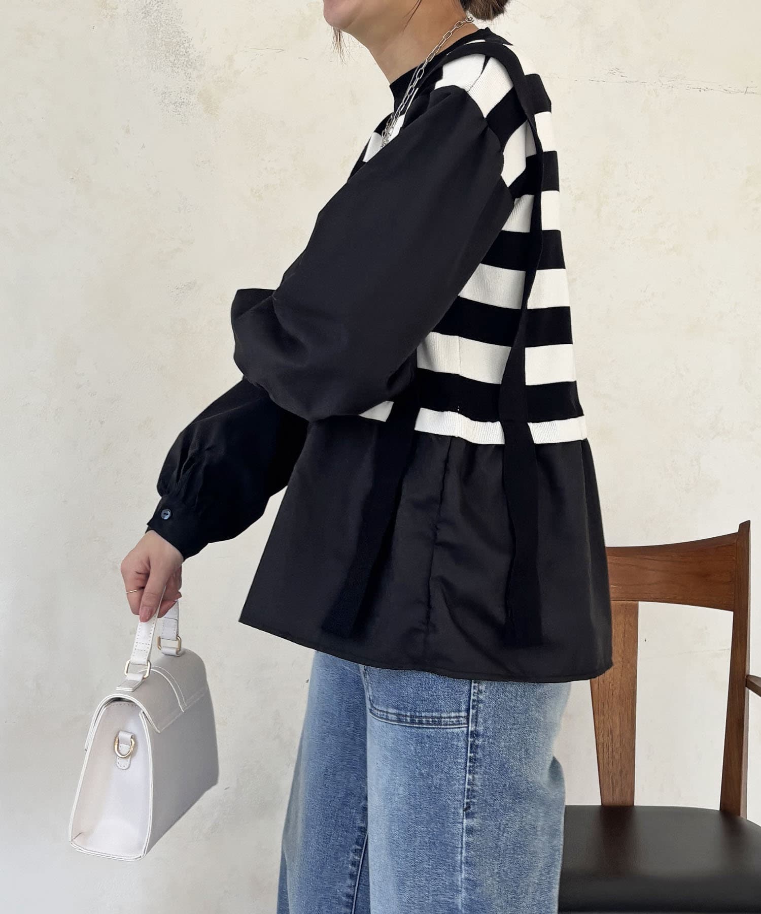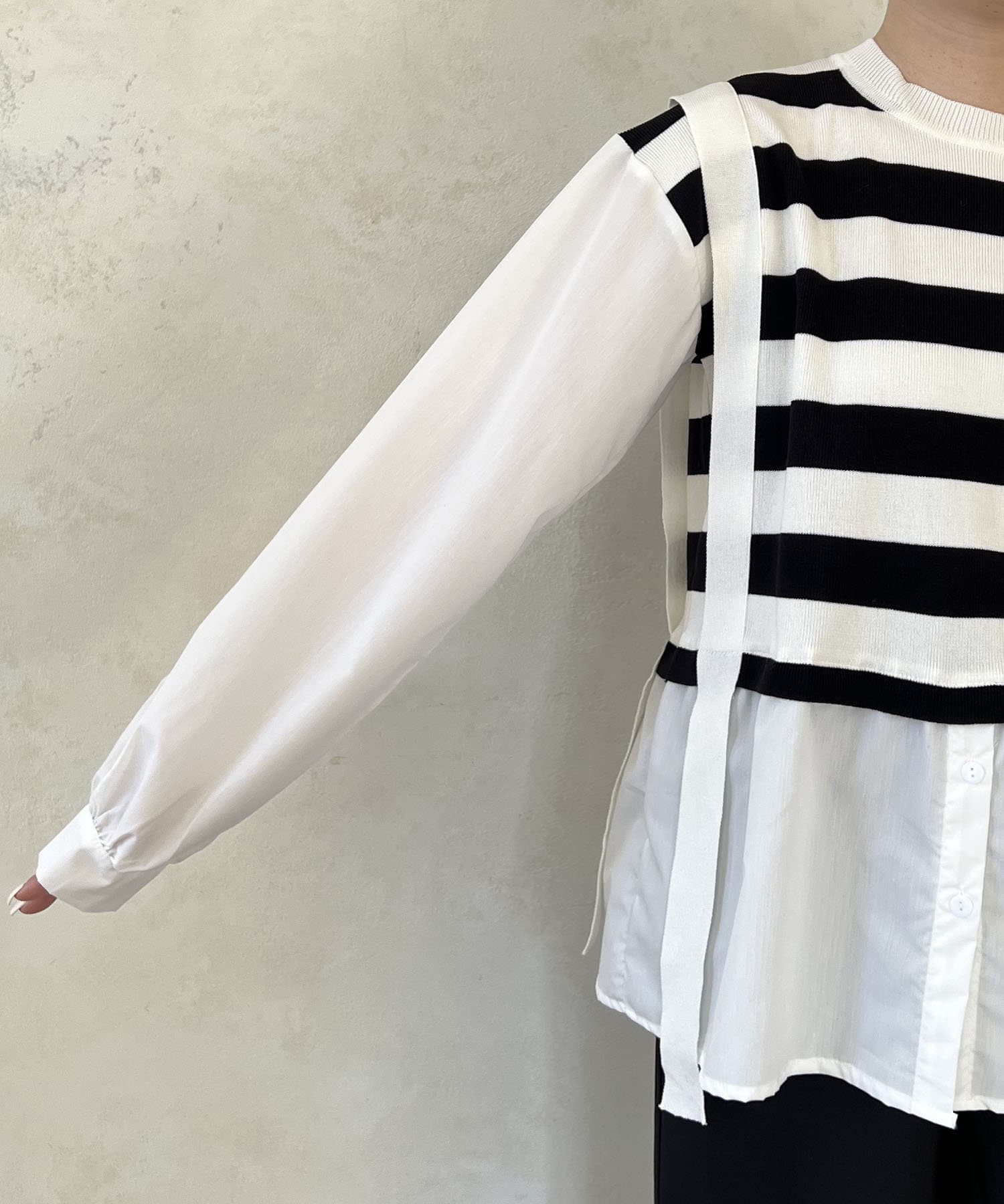 ニット×ブラウスのレイヤー風デザインが一枚でオシャレ見えする切替プルオーバー
