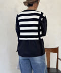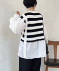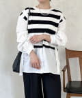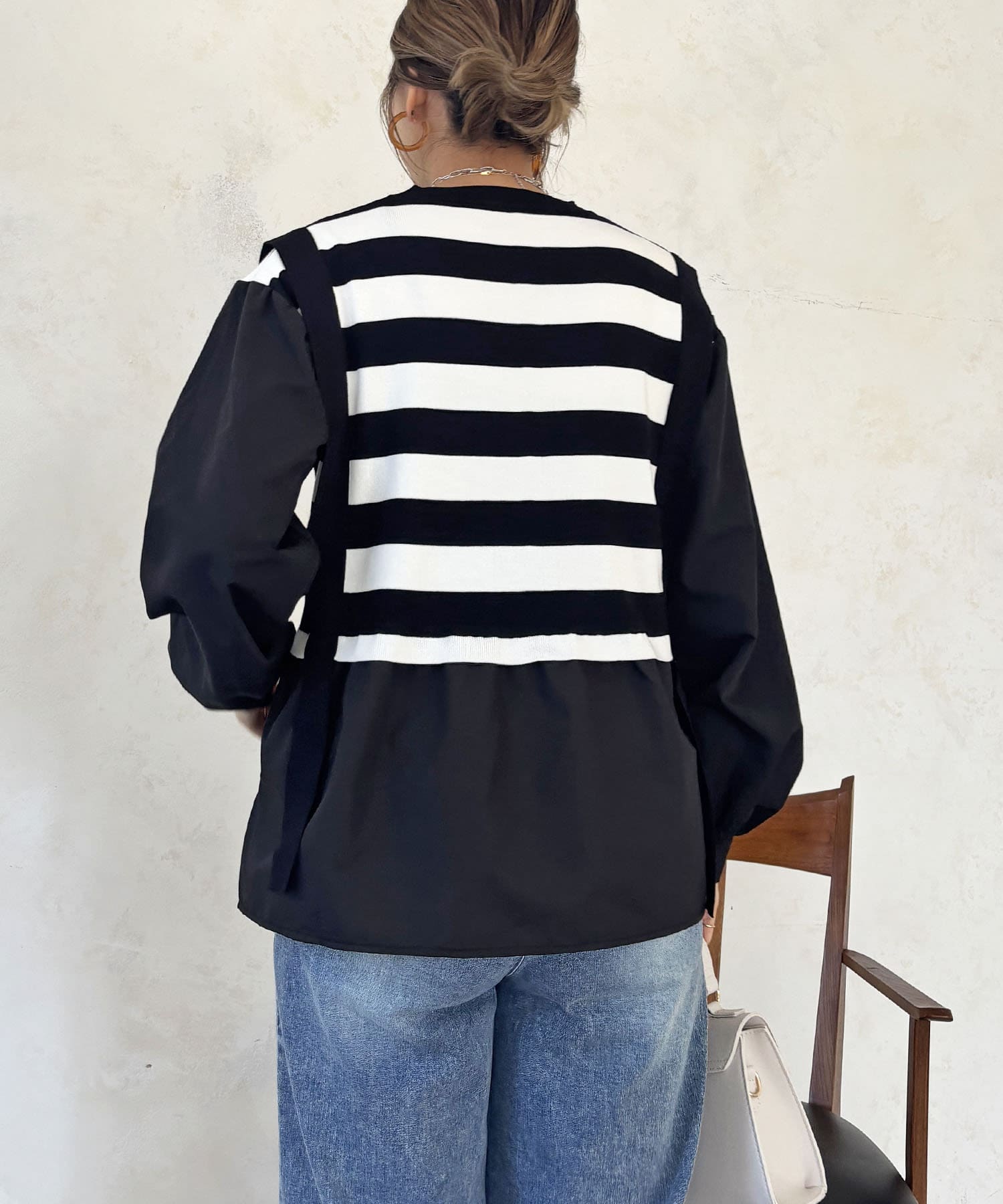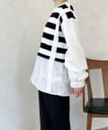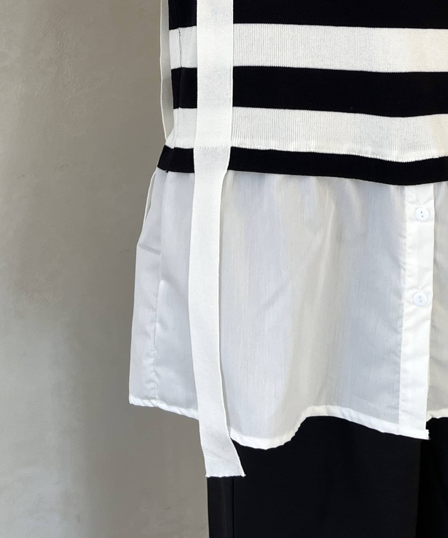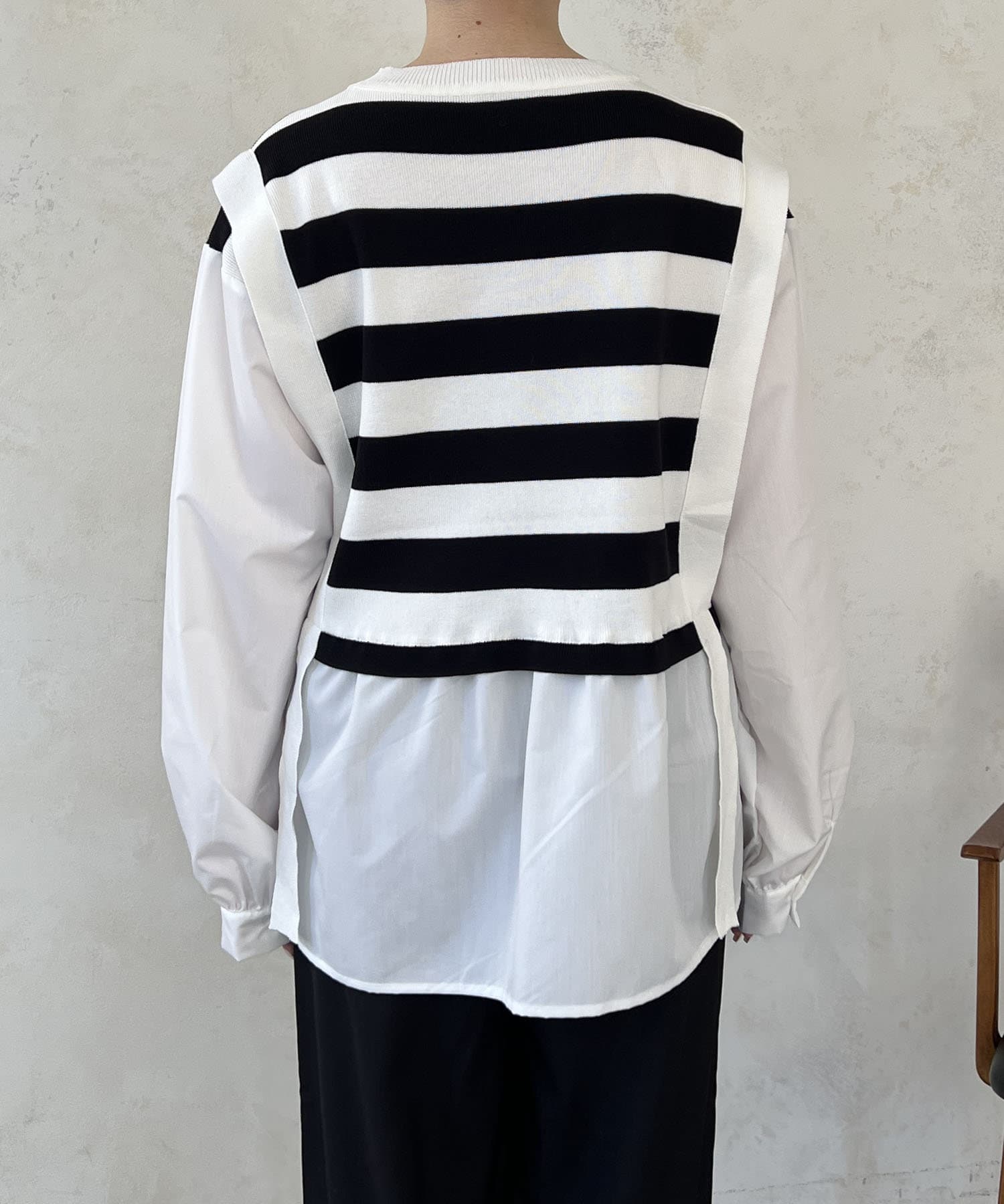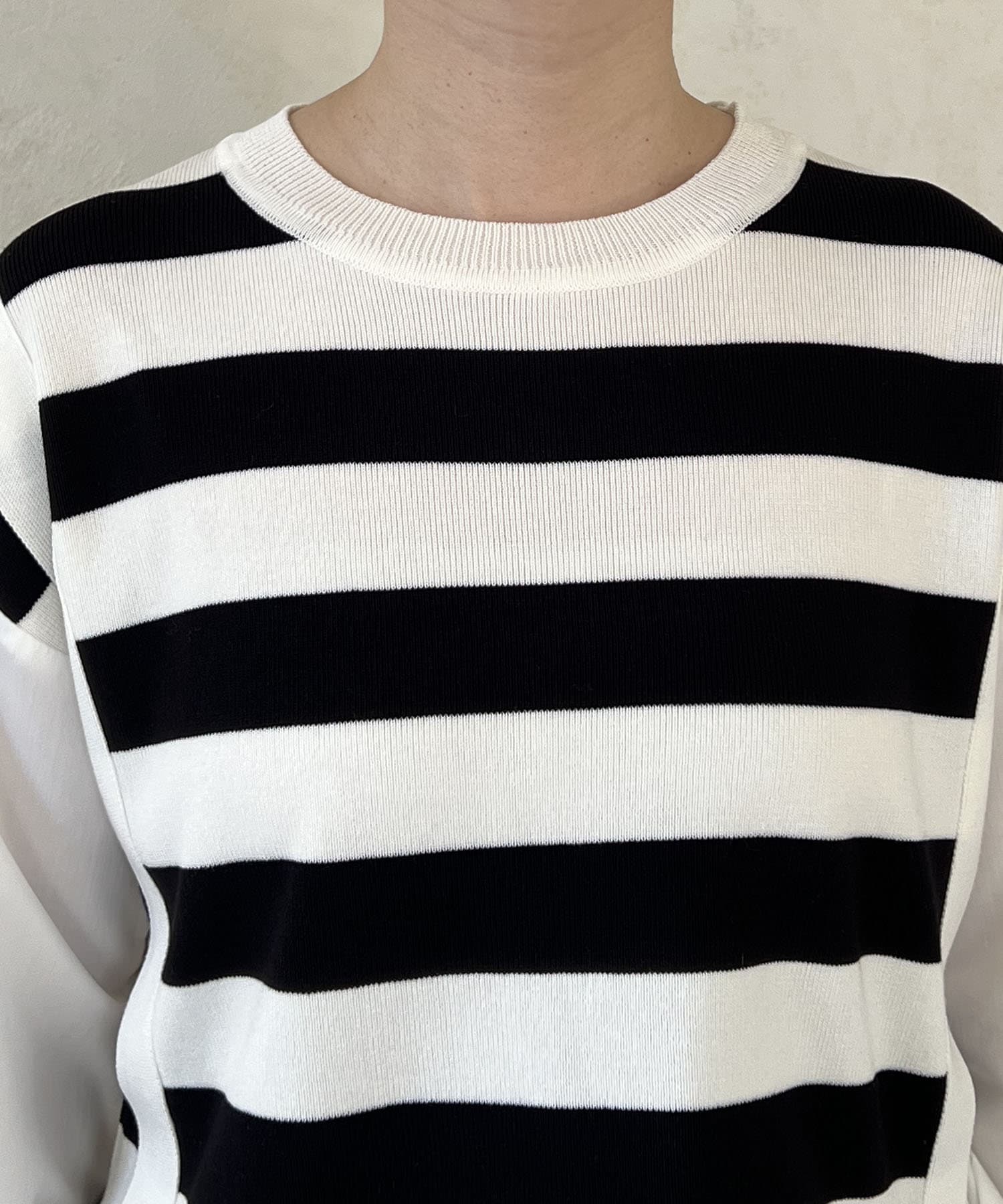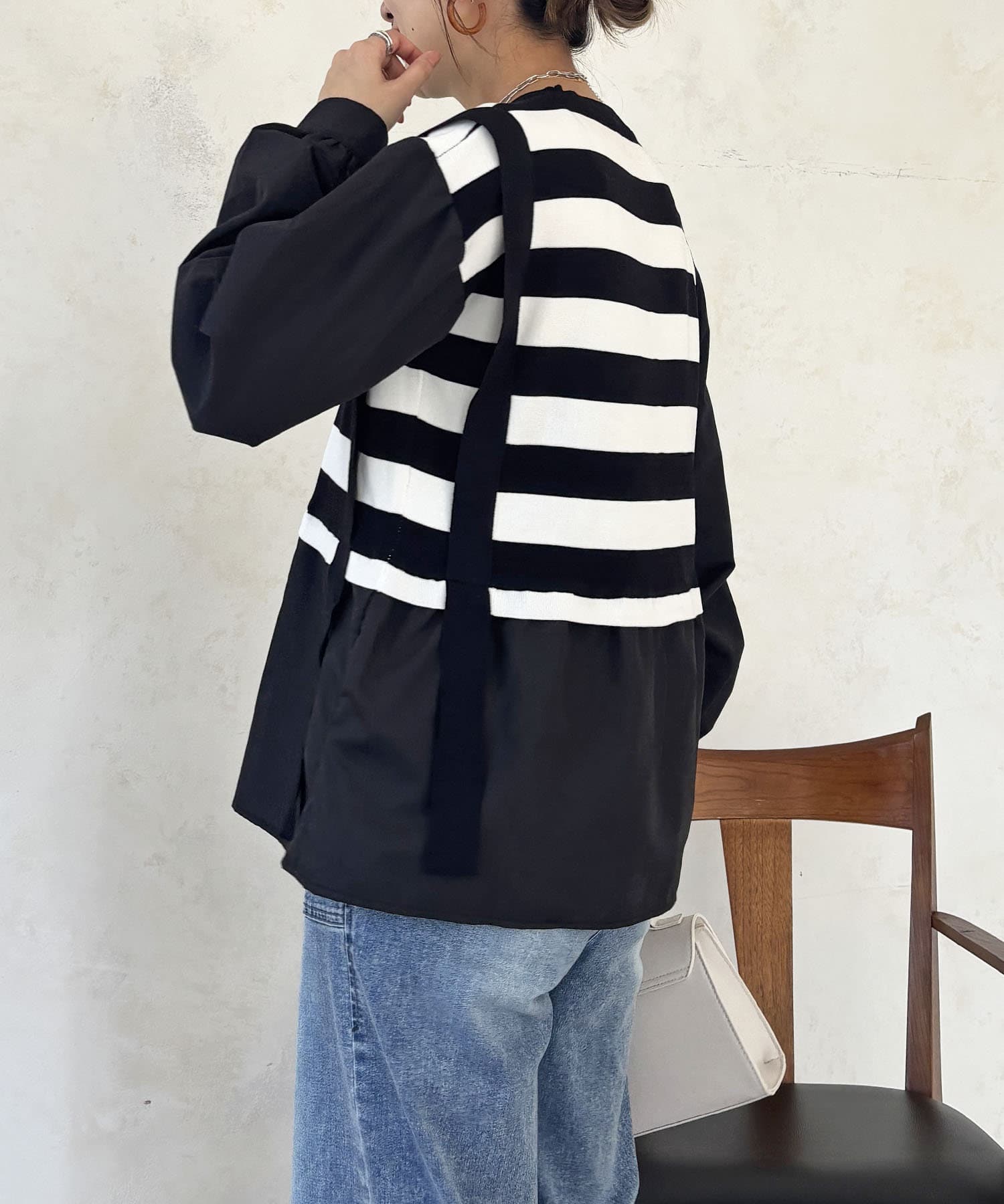 ニット×ブラウスのレイヤー風デザインが一枚でオシャレ見えする切替プルオーバー