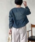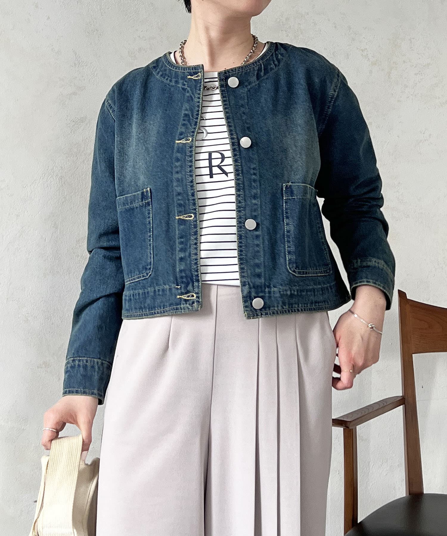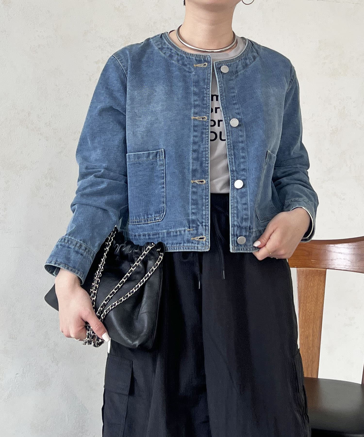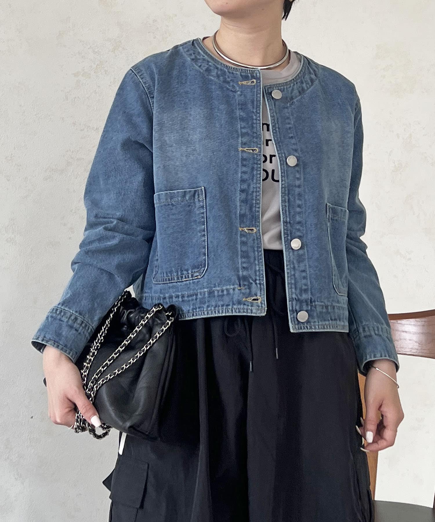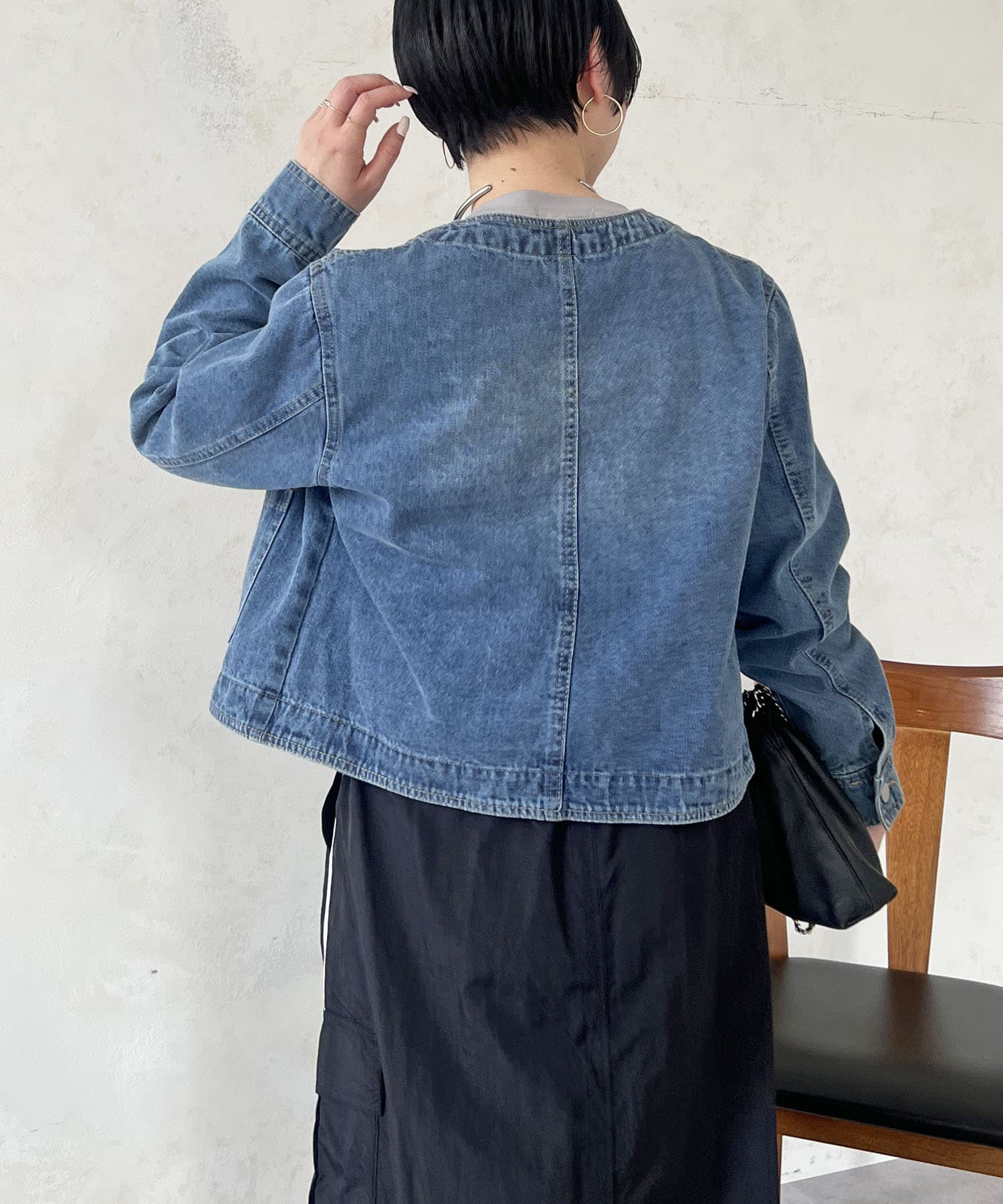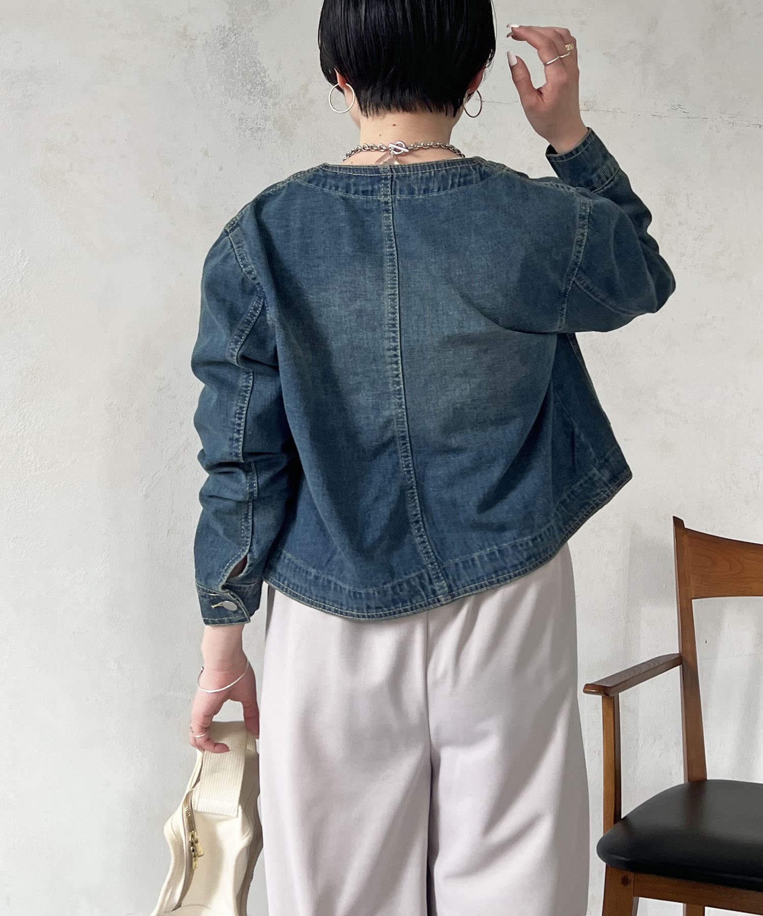 ・襟ぐりのあるアイテムとも相性抜群なノーカラーデザイン