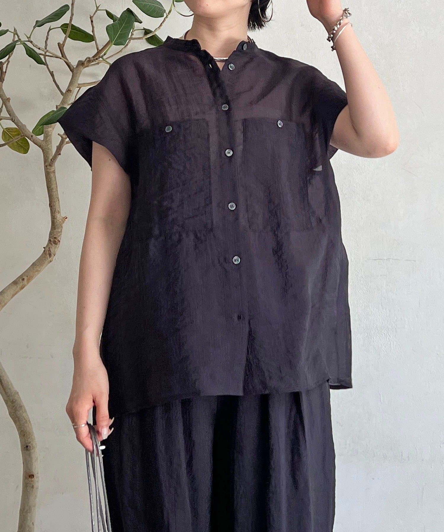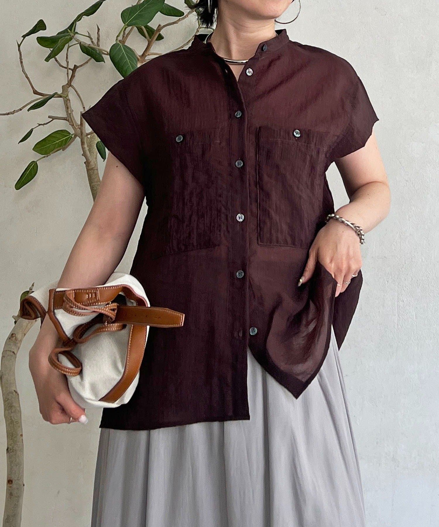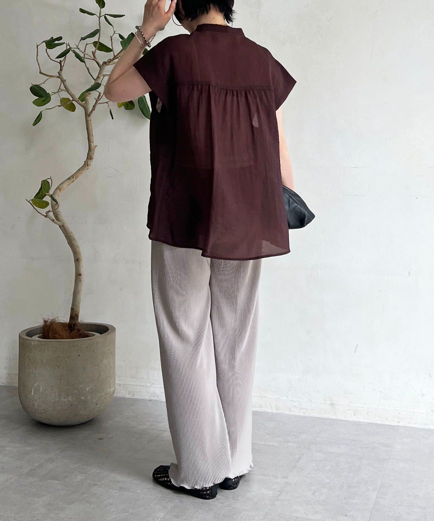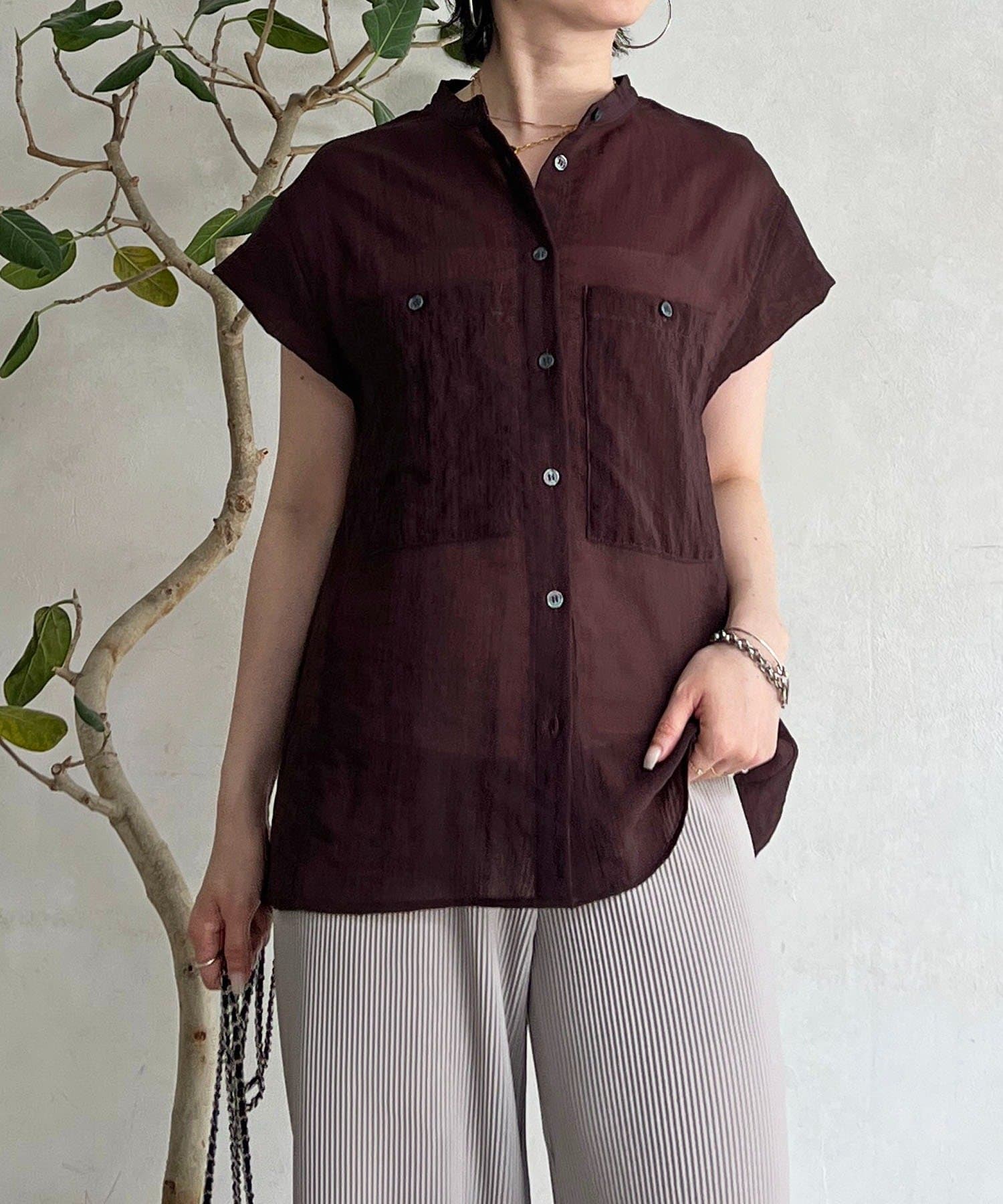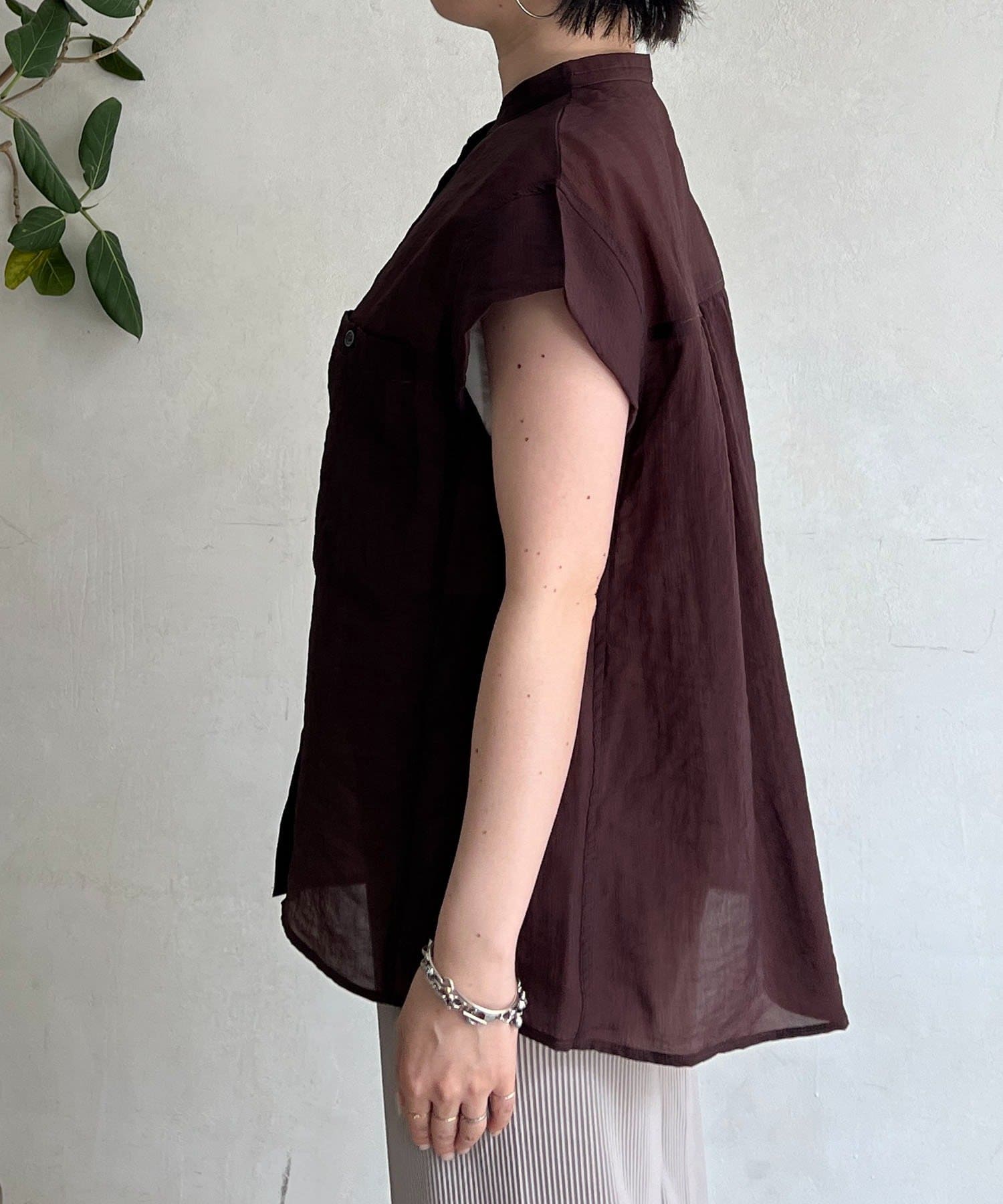 ・開けても閉めても着回しやすいフレンチスリーブのバンドカラーブラウス