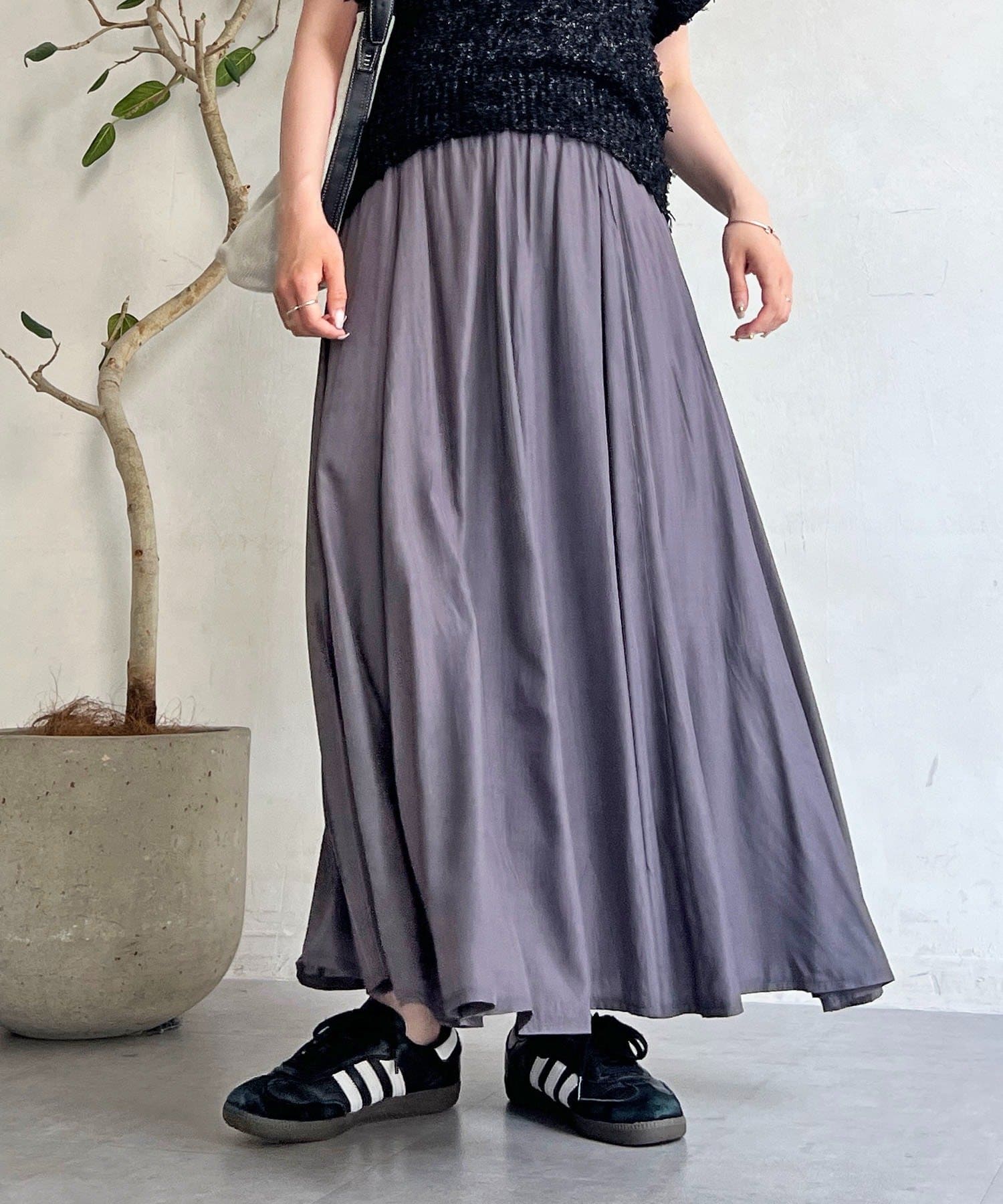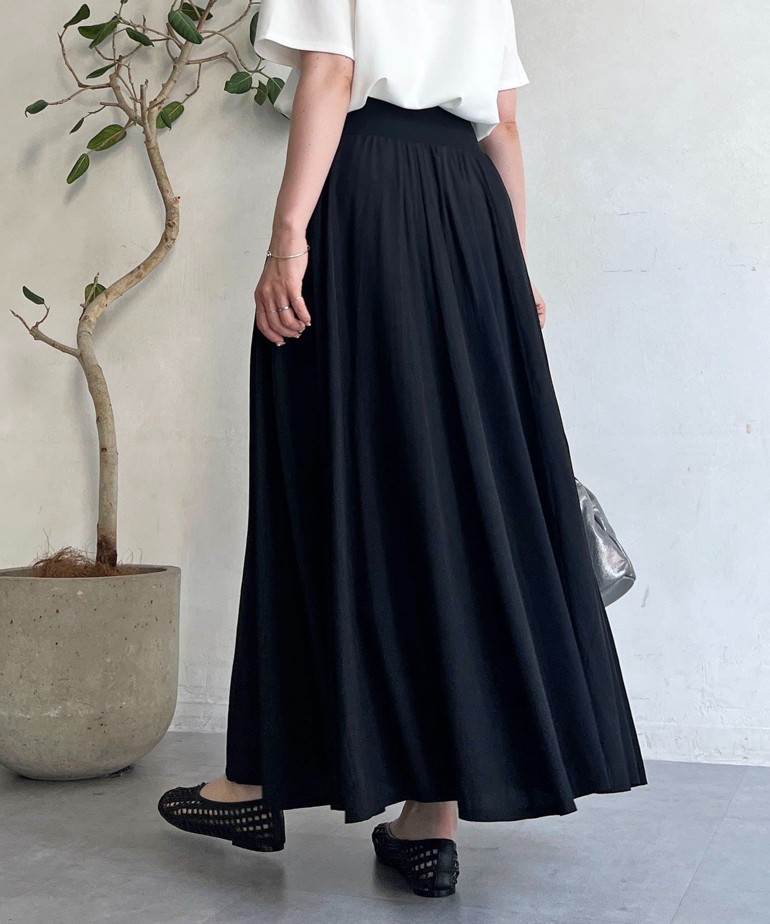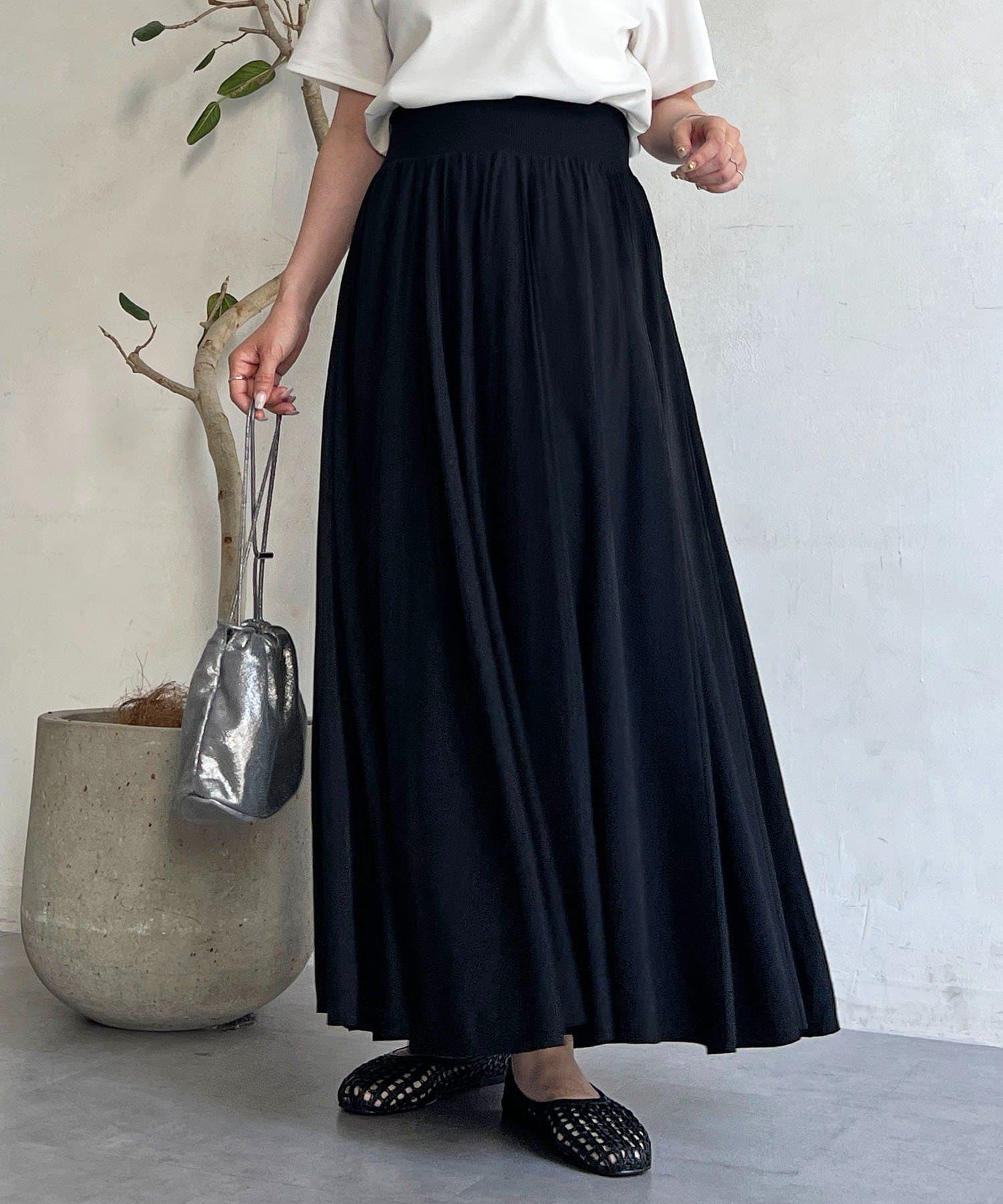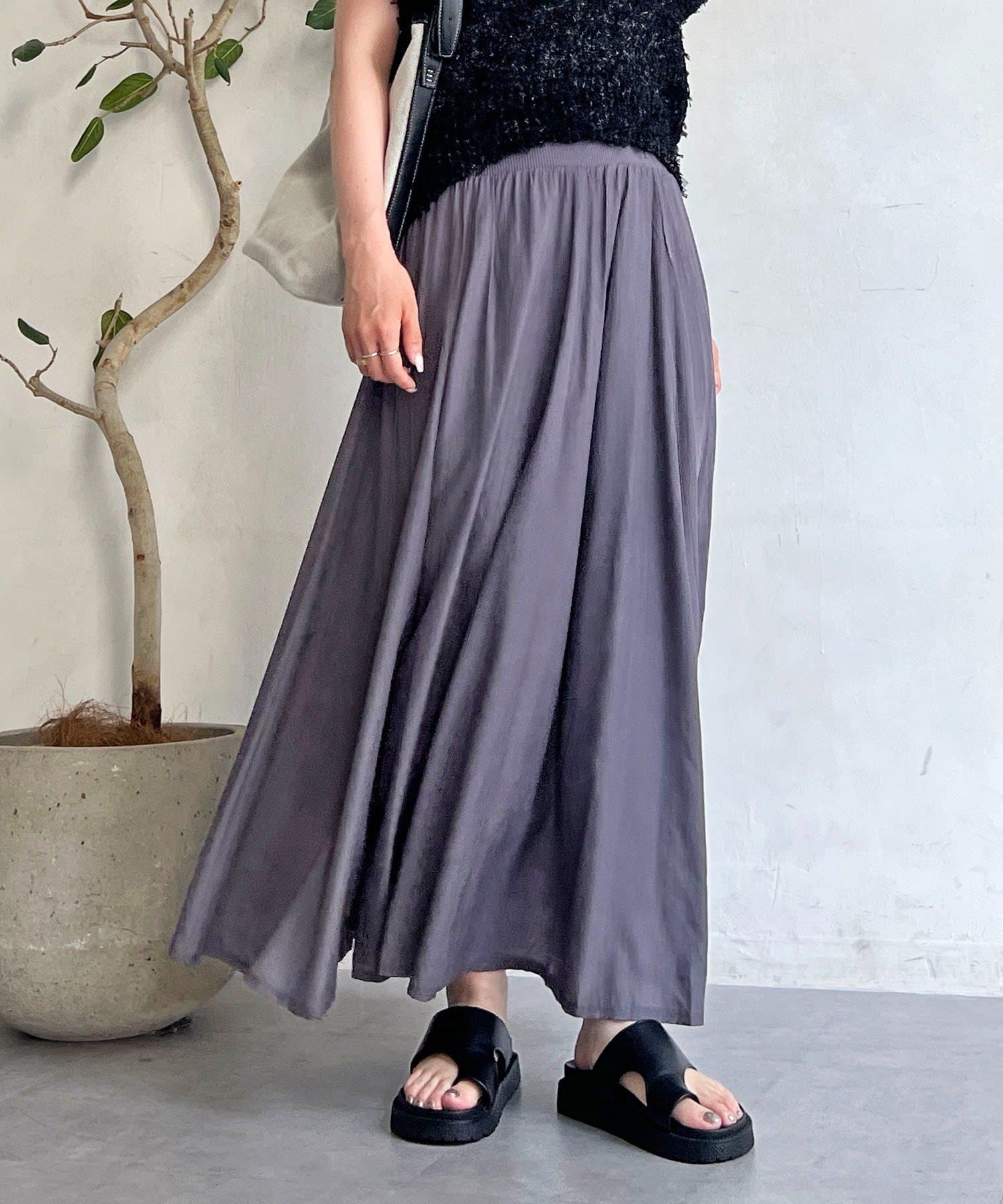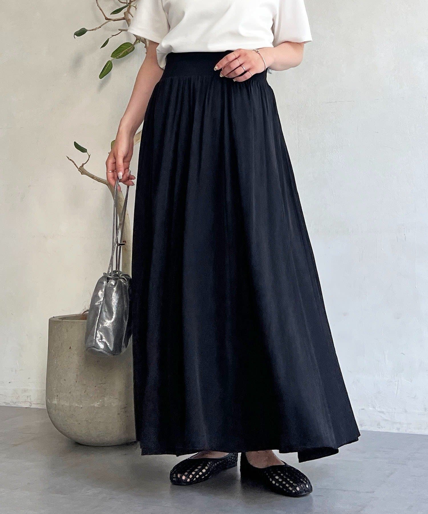 ・ほんのりツヤ感のある素材で作られたフレアスカート