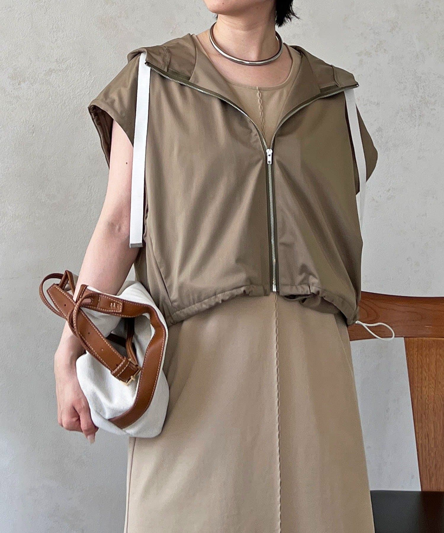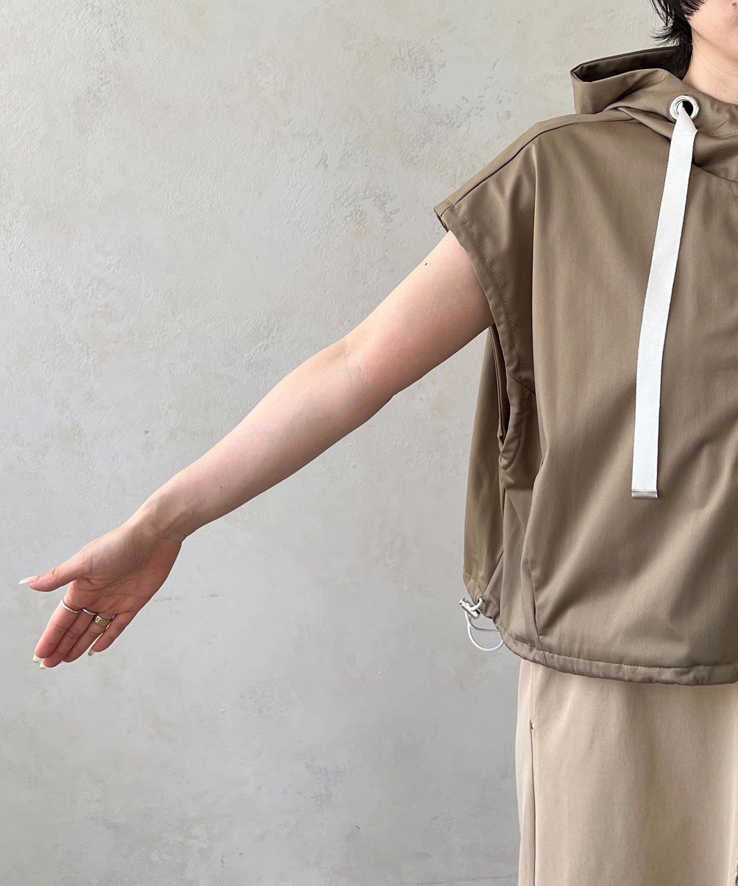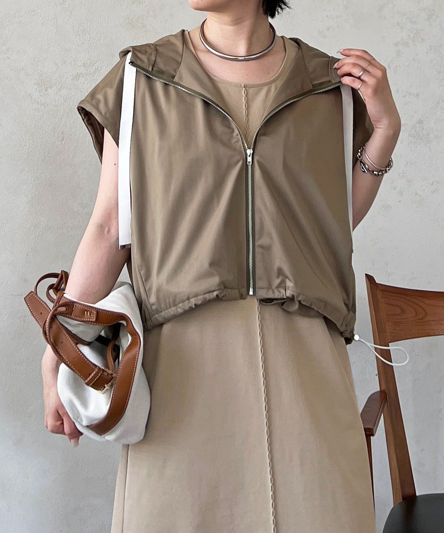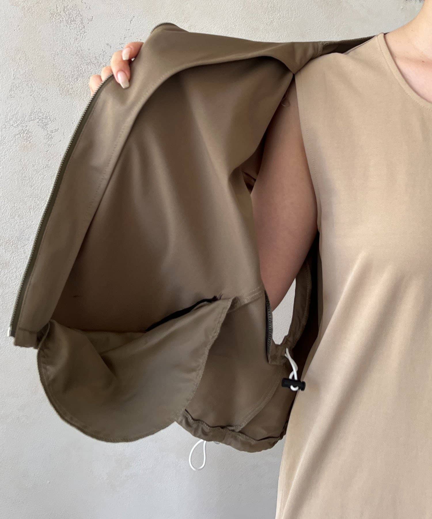 ・袖や裾のドロストでお好みの形に調節可能なジップ付きベスト