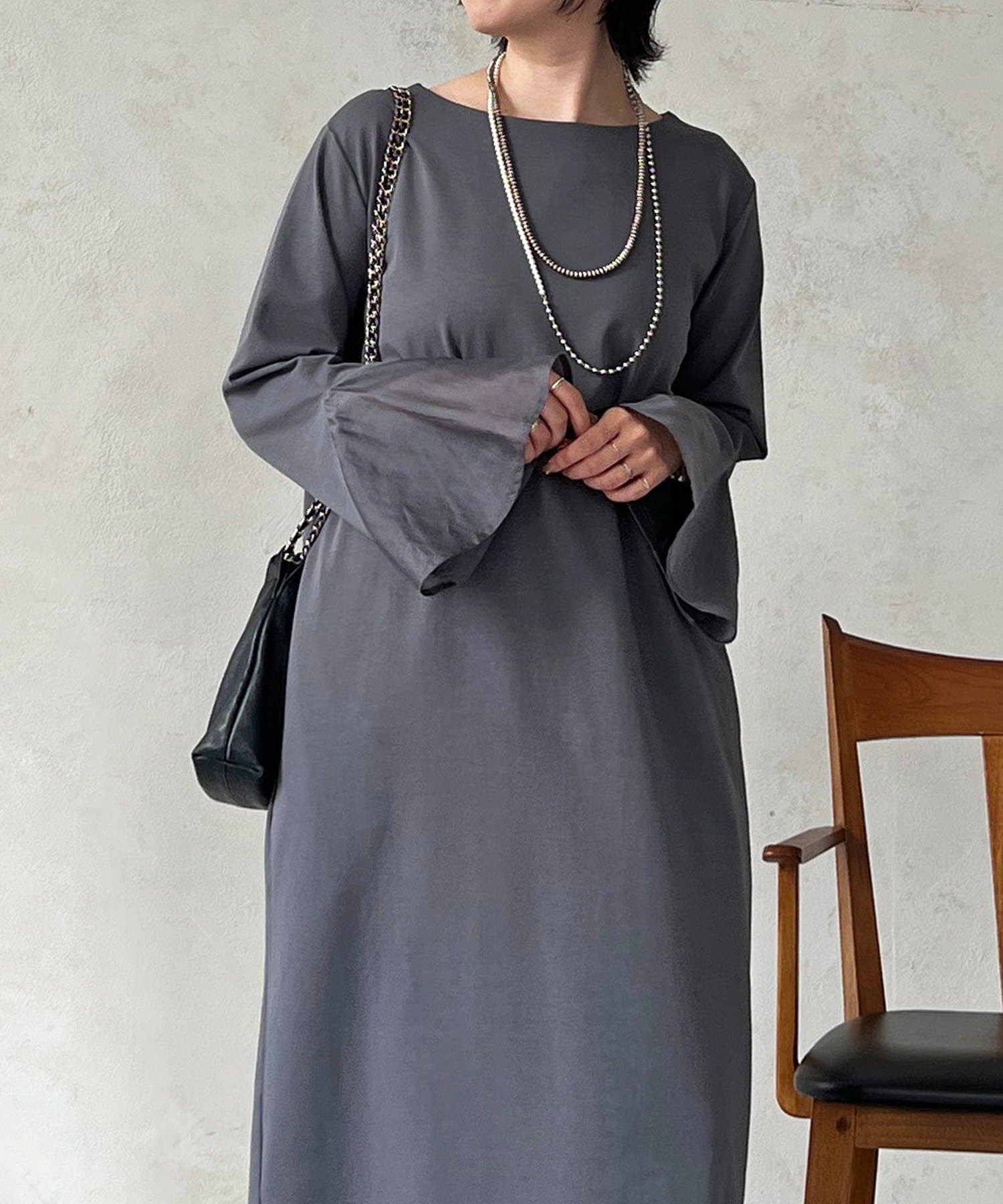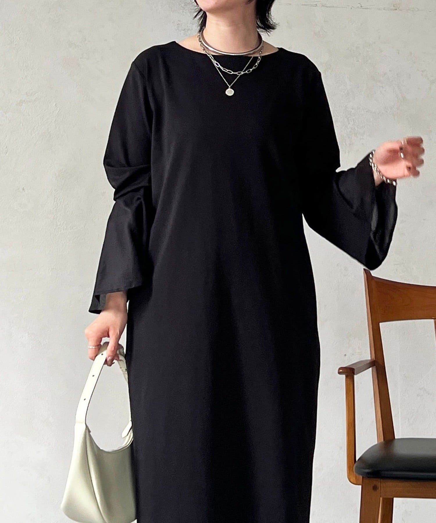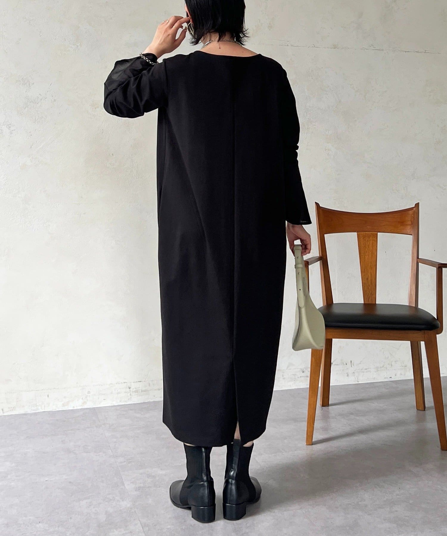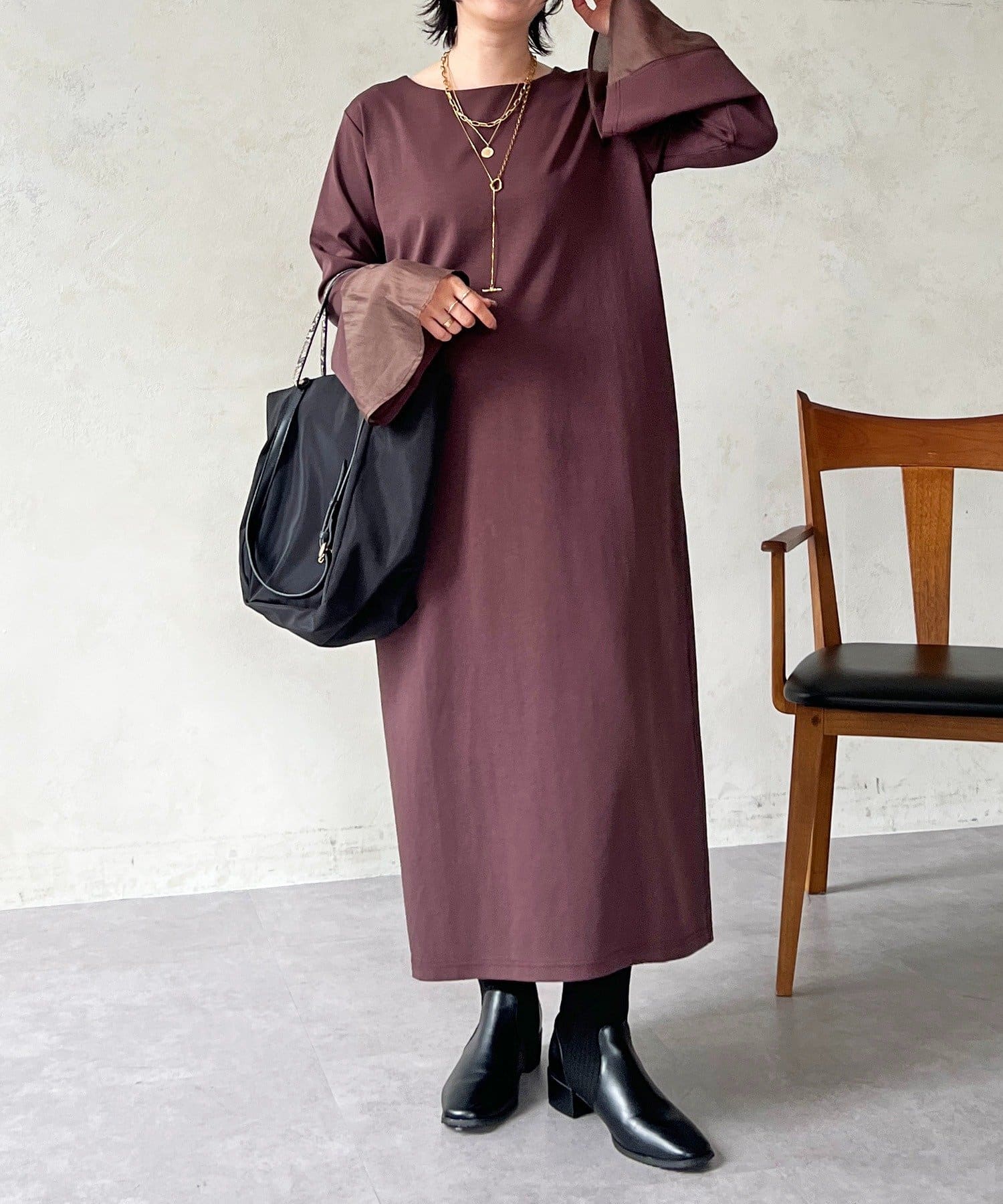 シンプルながら、シルエットと袖口の異素材切替でモダンに着こなせるコクーンワンピ