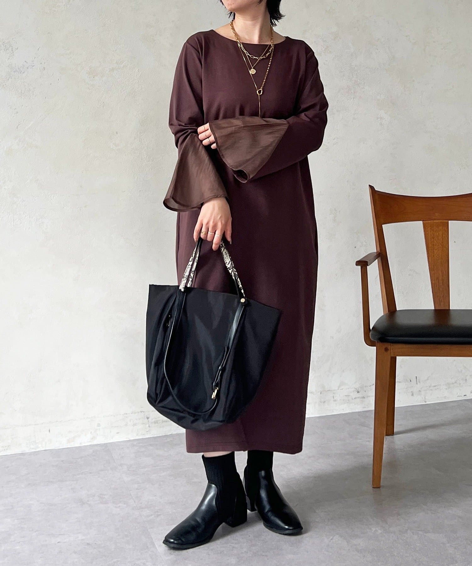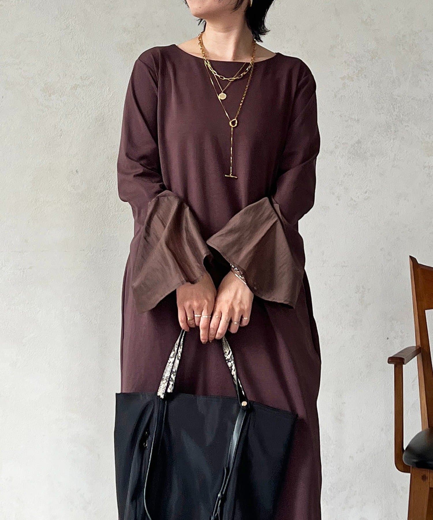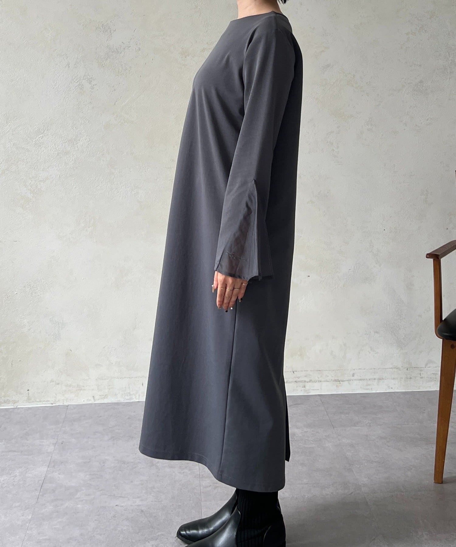 シンプルながら、シルエットと袖口の異素材切替でモダンに着こなせるコクーンワンピ