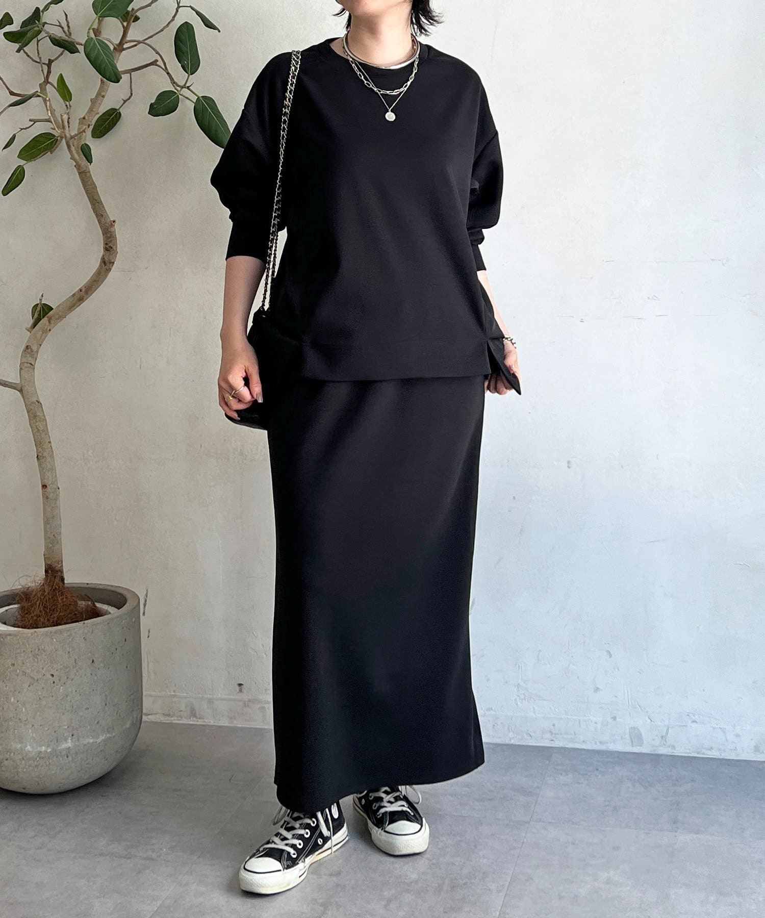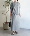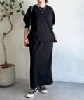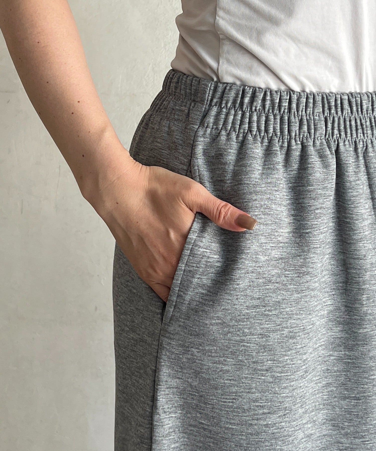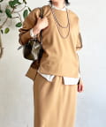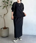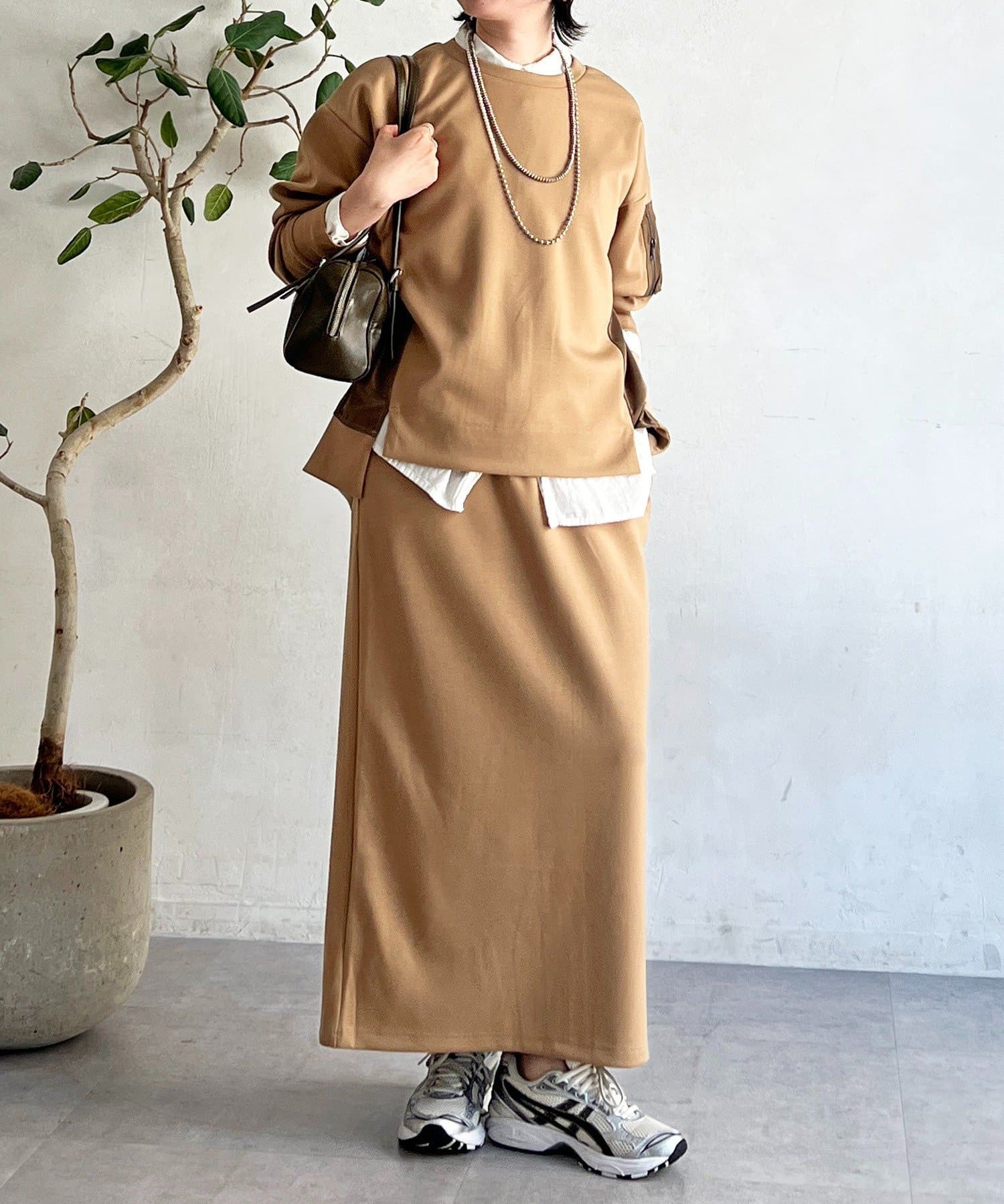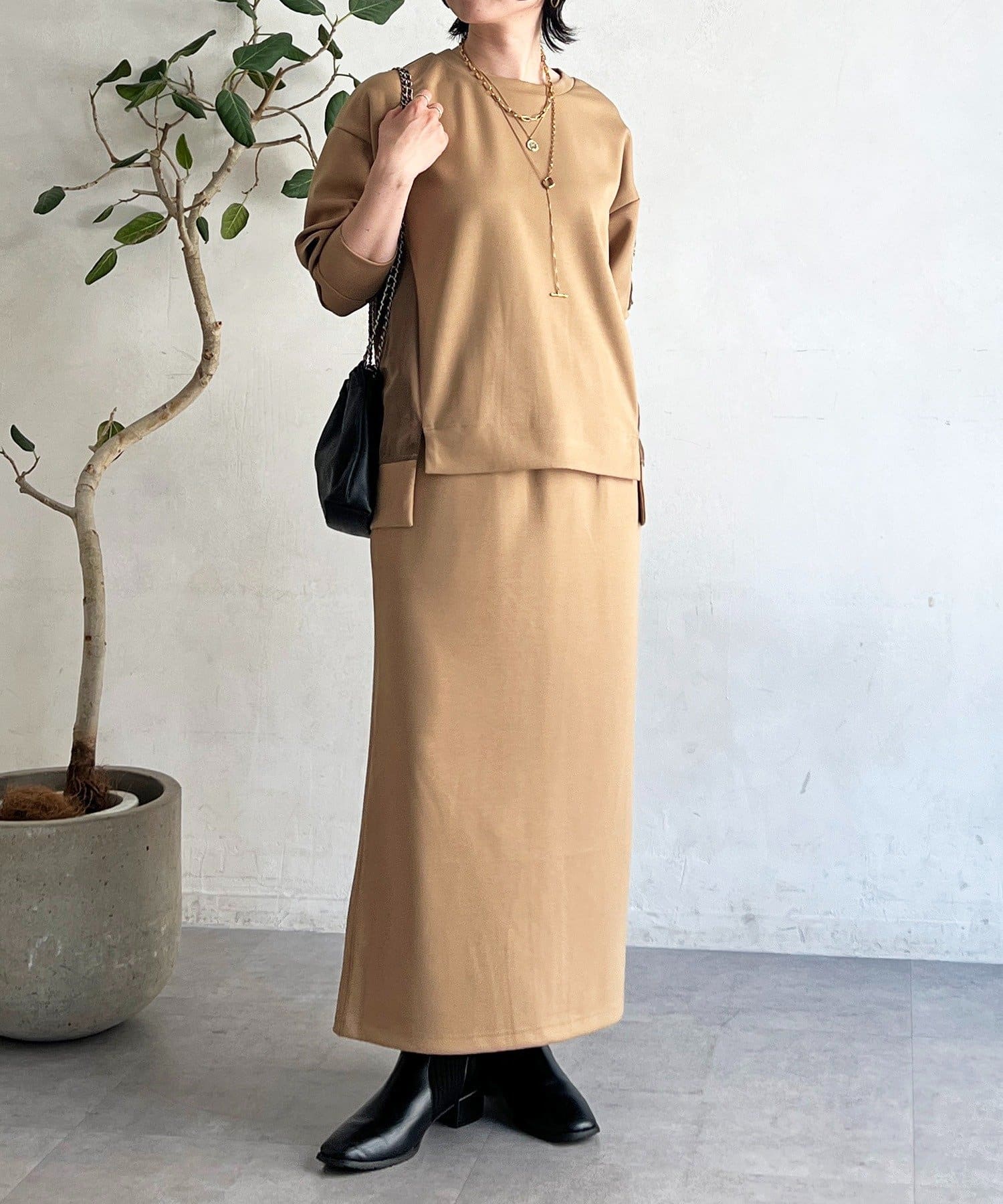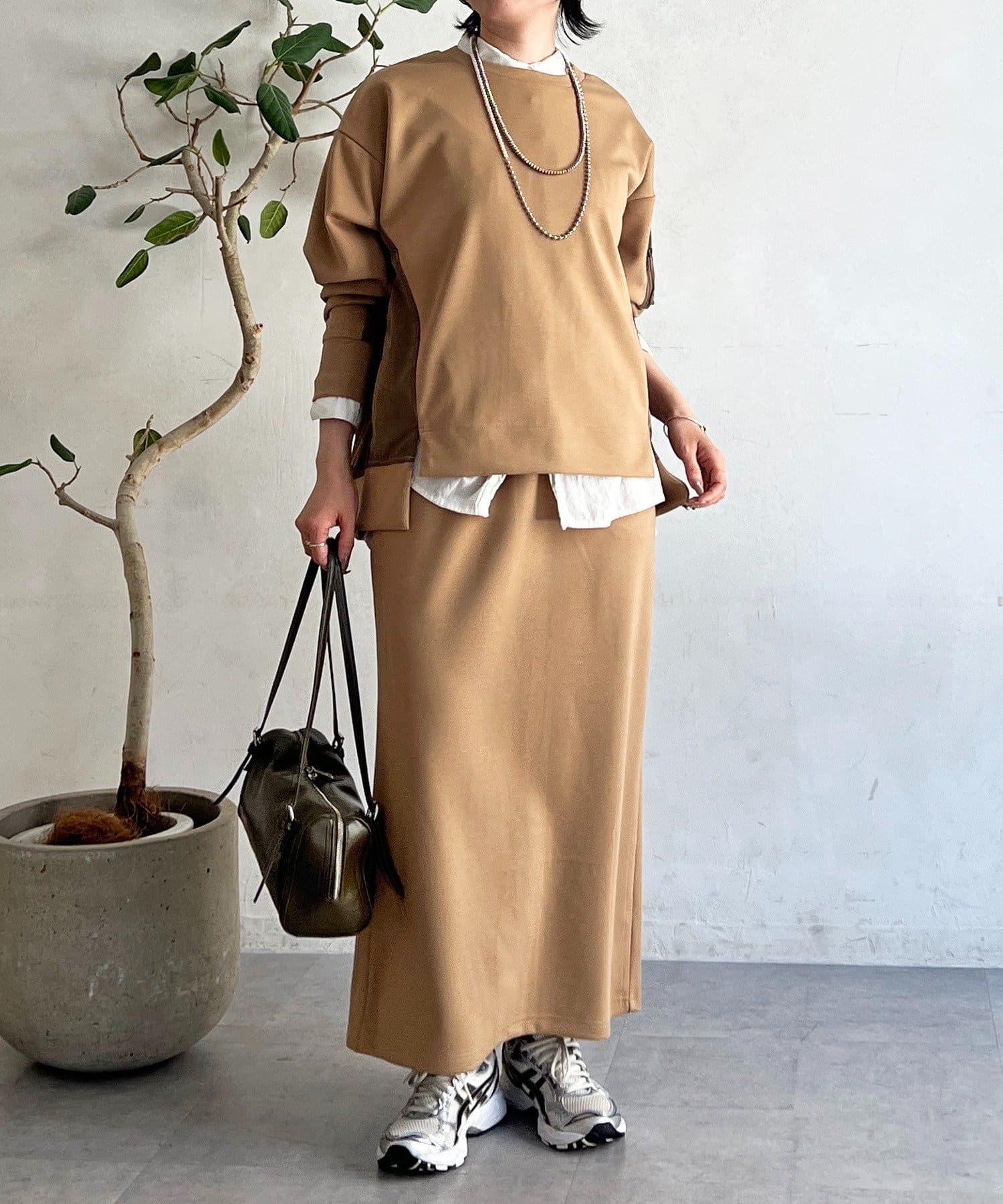・スカートは総ゴム仕様でストレスフリー+落ち感のあるタイトスカートで細見え効果◎