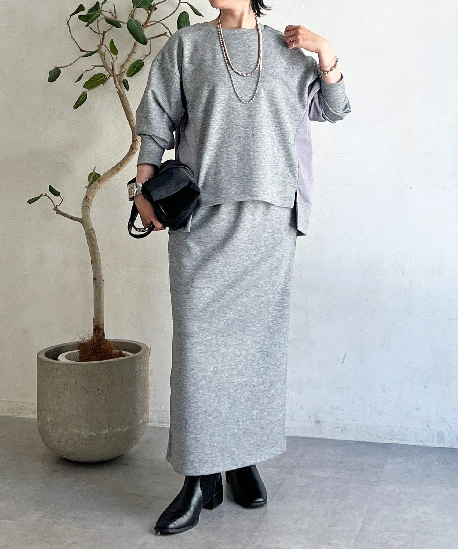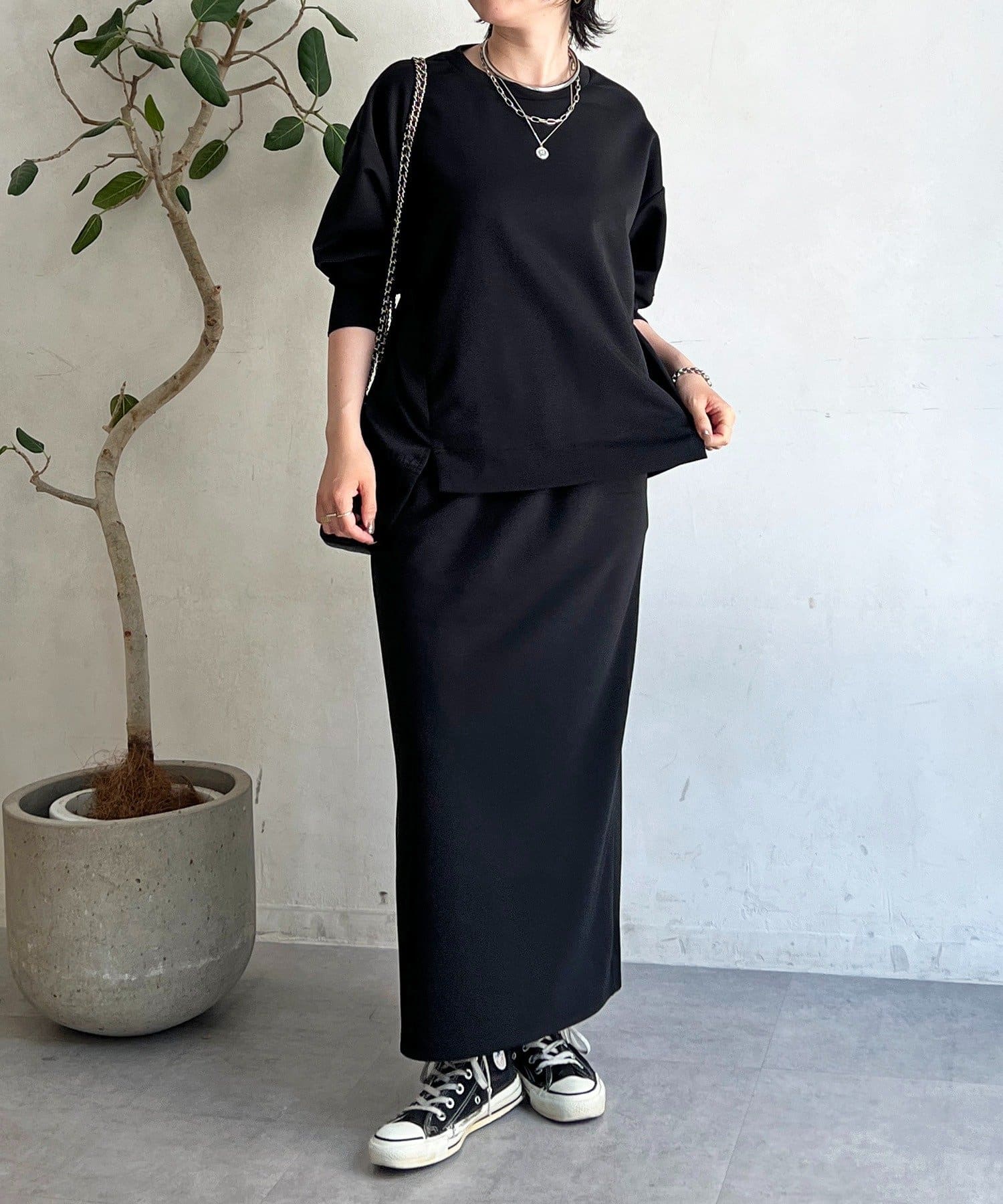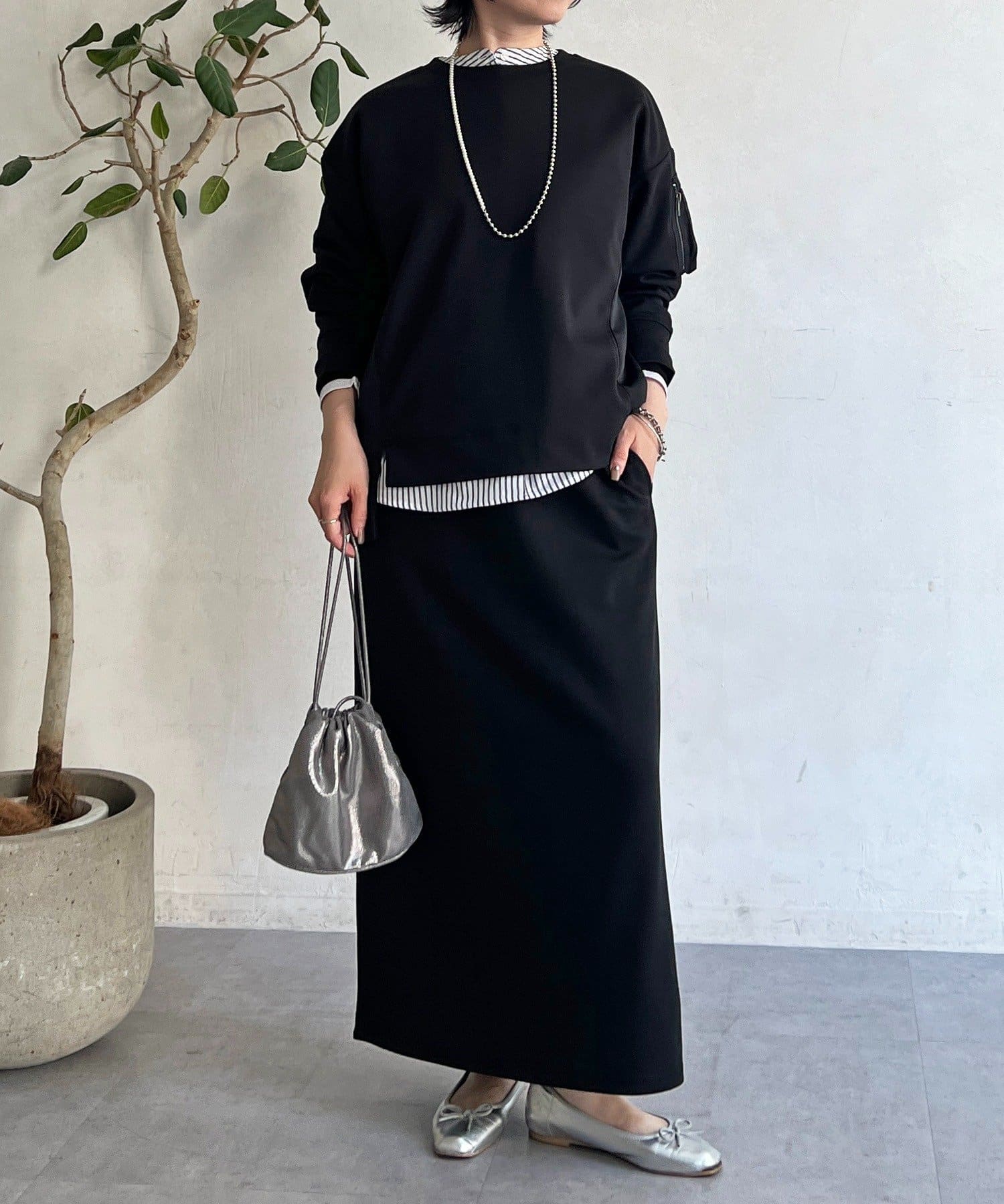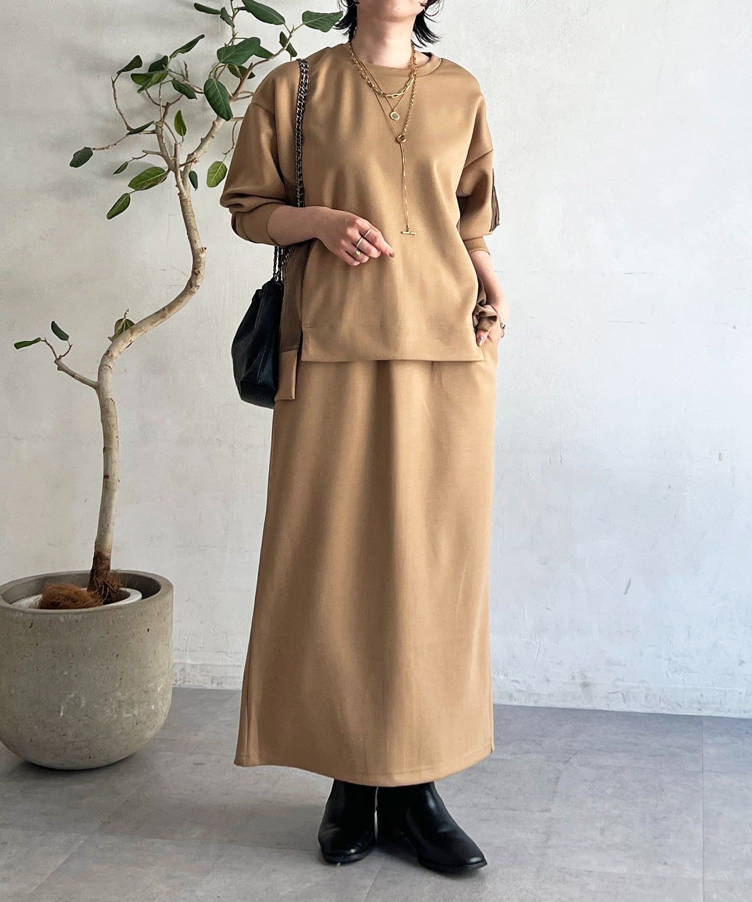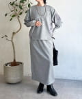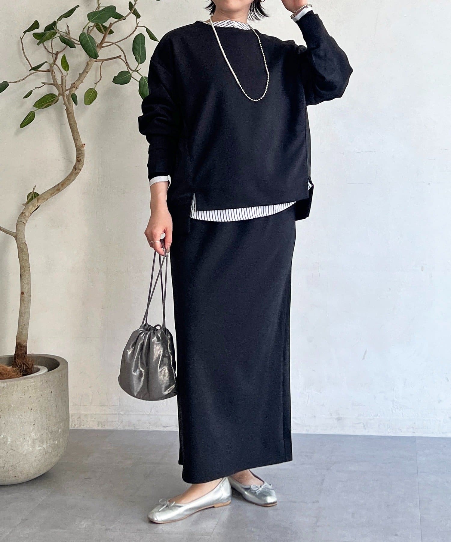 ・スカートは総ゴム仕様でストレスフリー+落ち感のあるタイトスカートで細見え効果◎