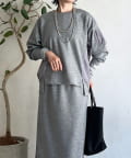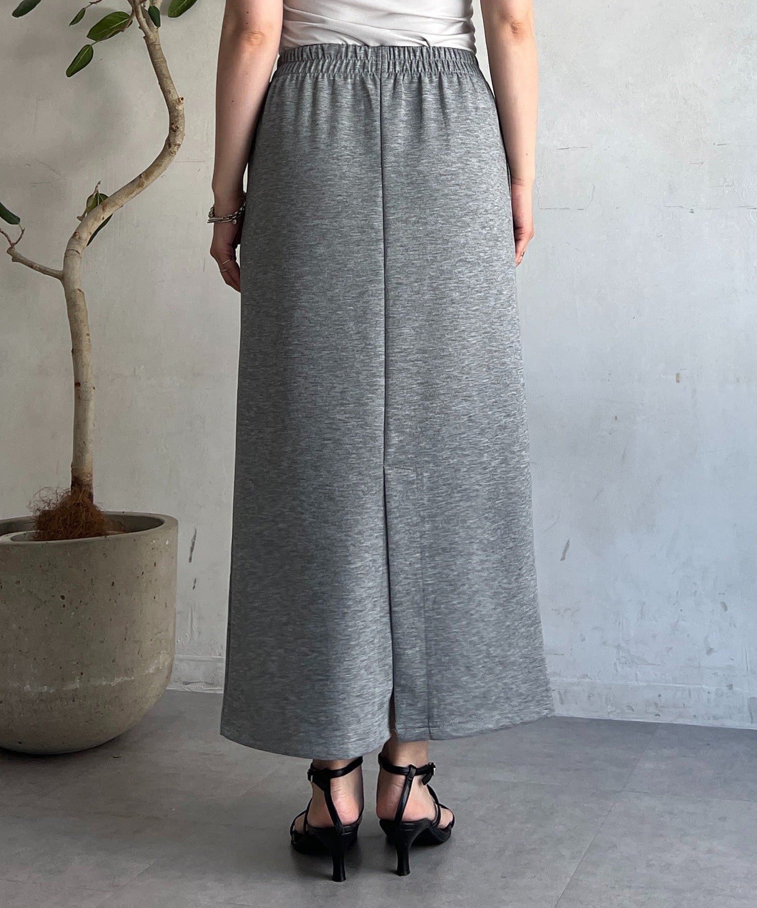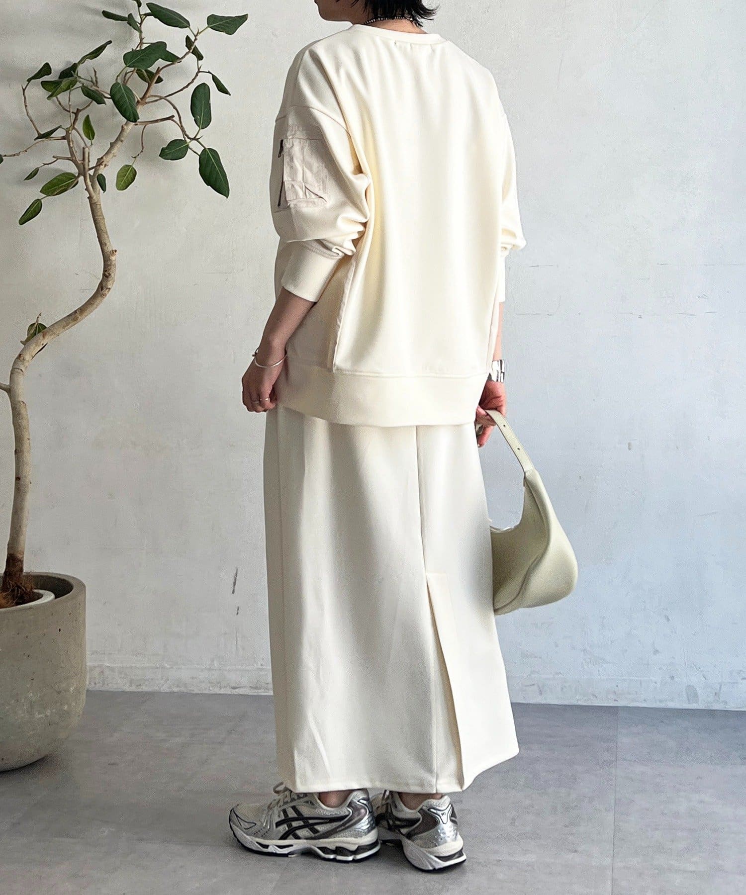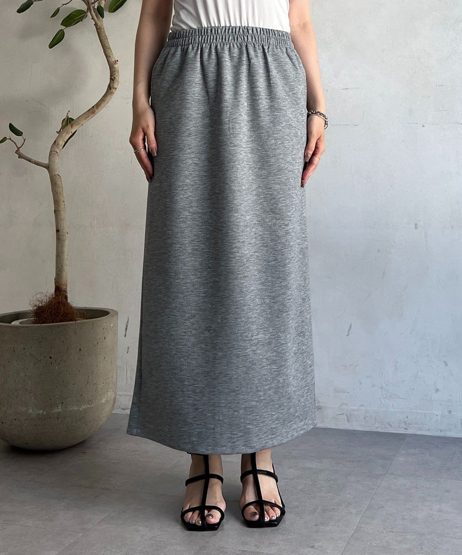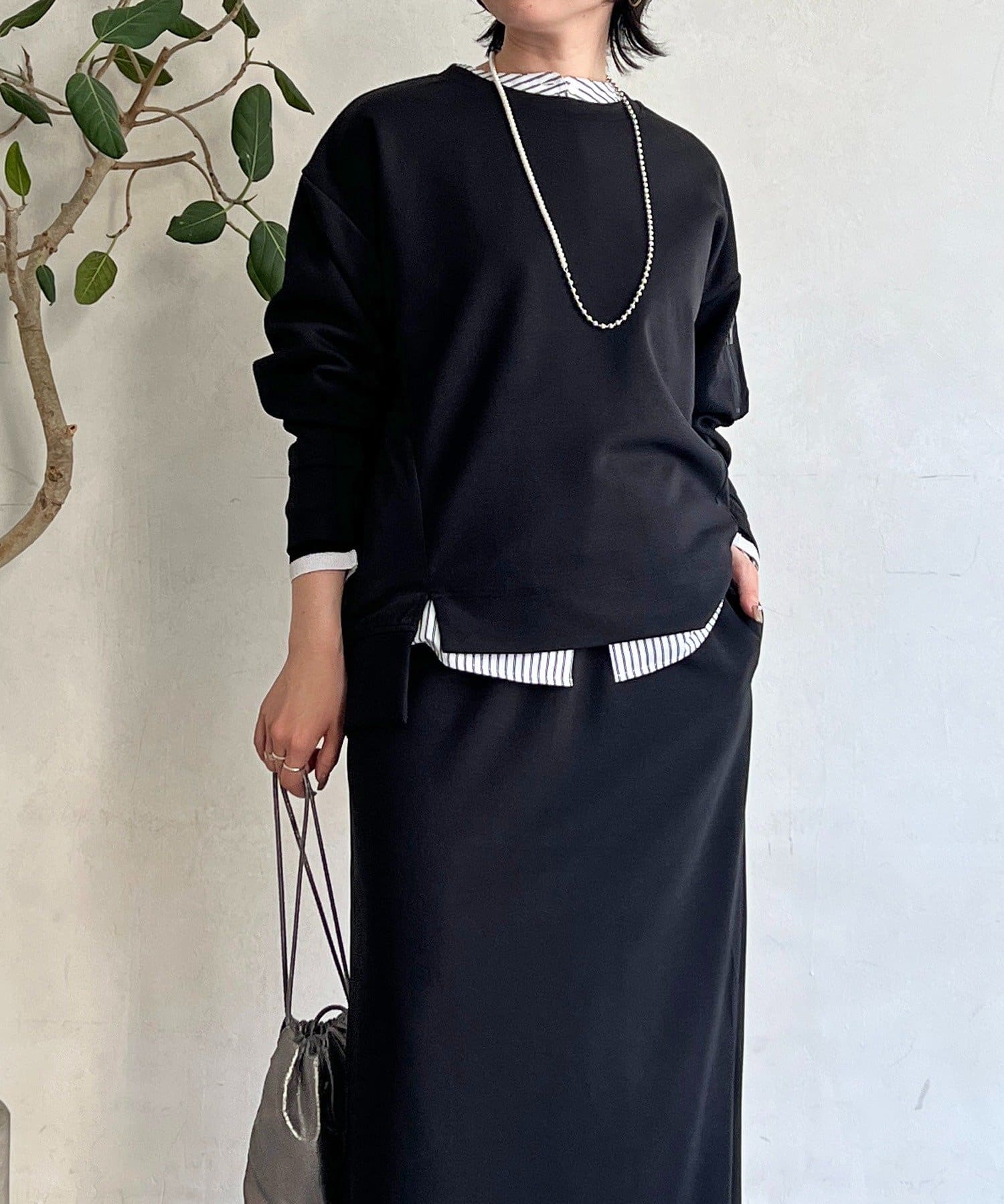 ・スカートは総ゴム仕様でストレスフリー+落ち感のあるタイトスカートで細見え効果◎