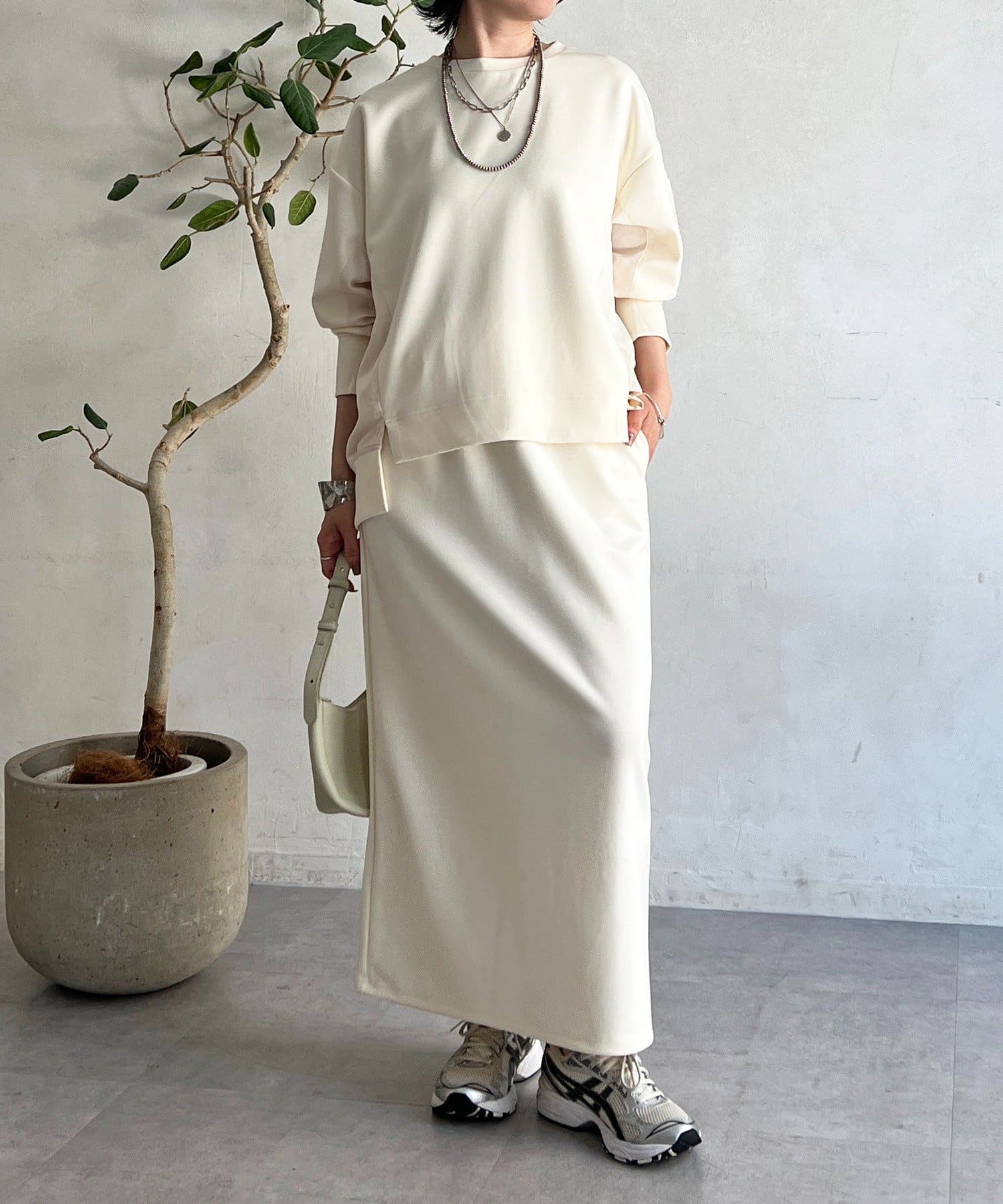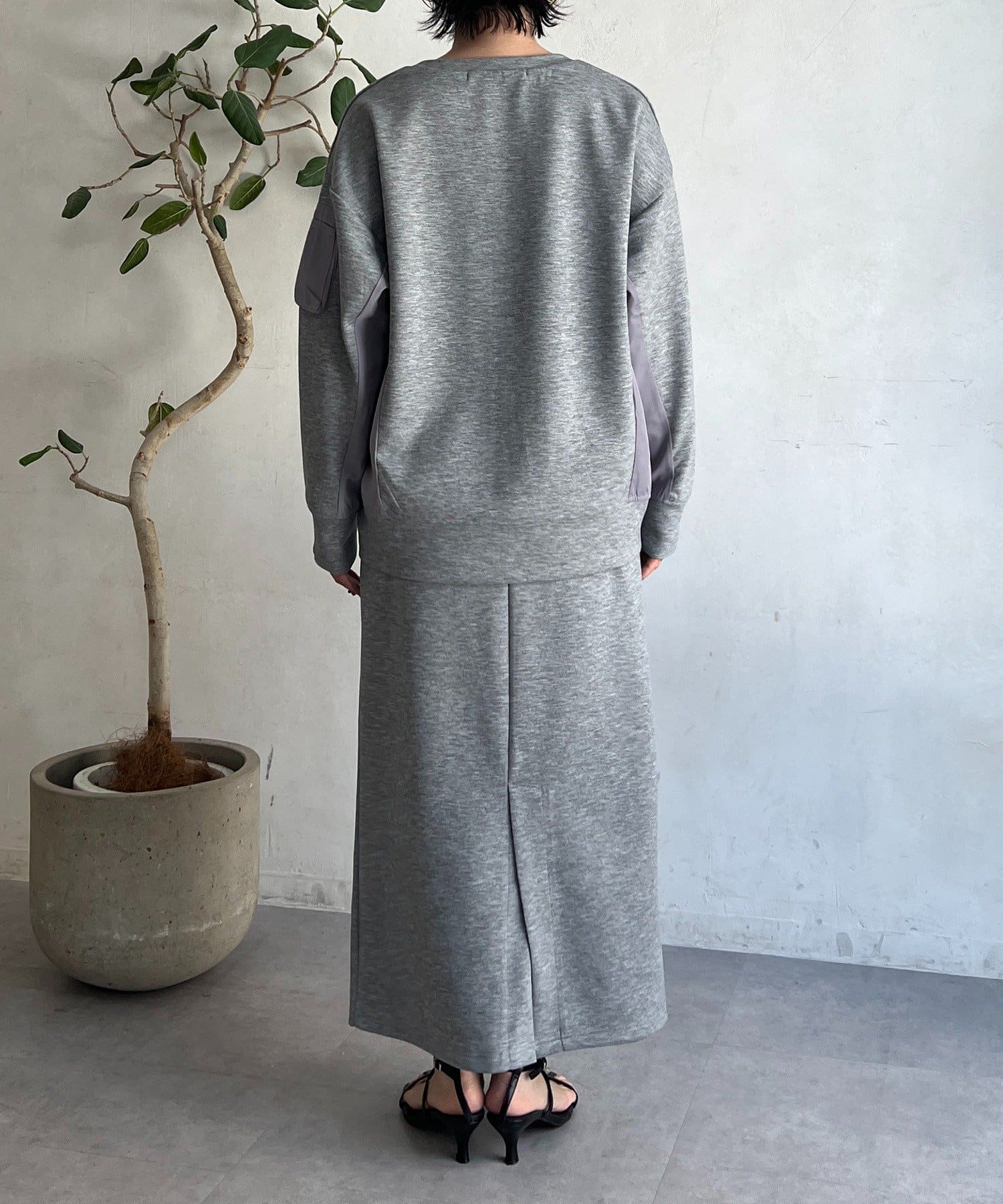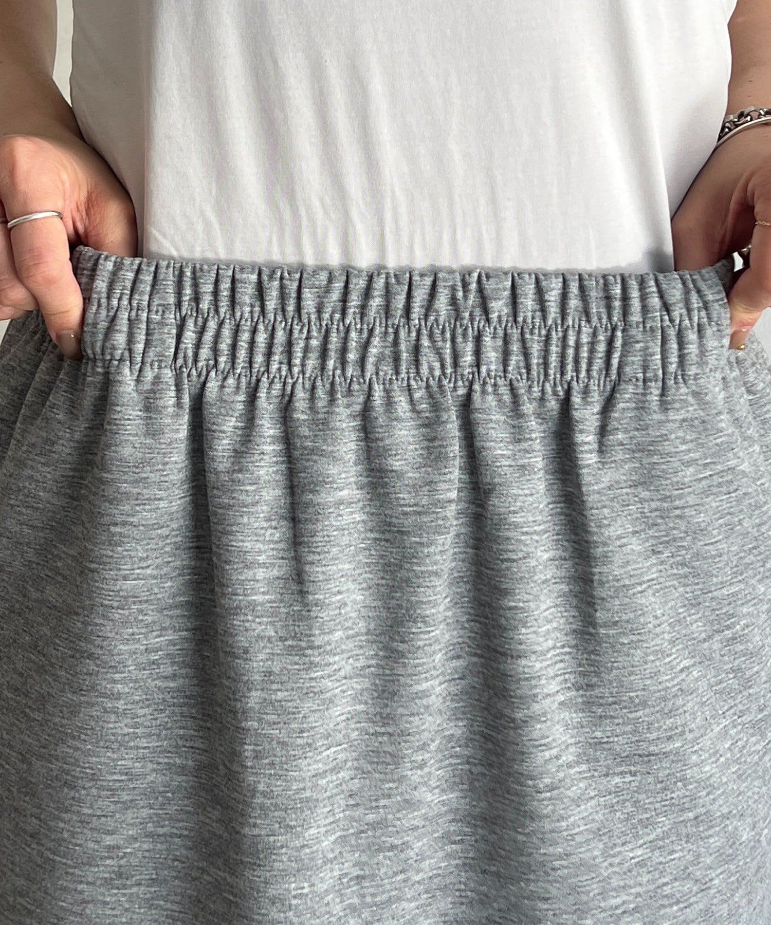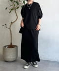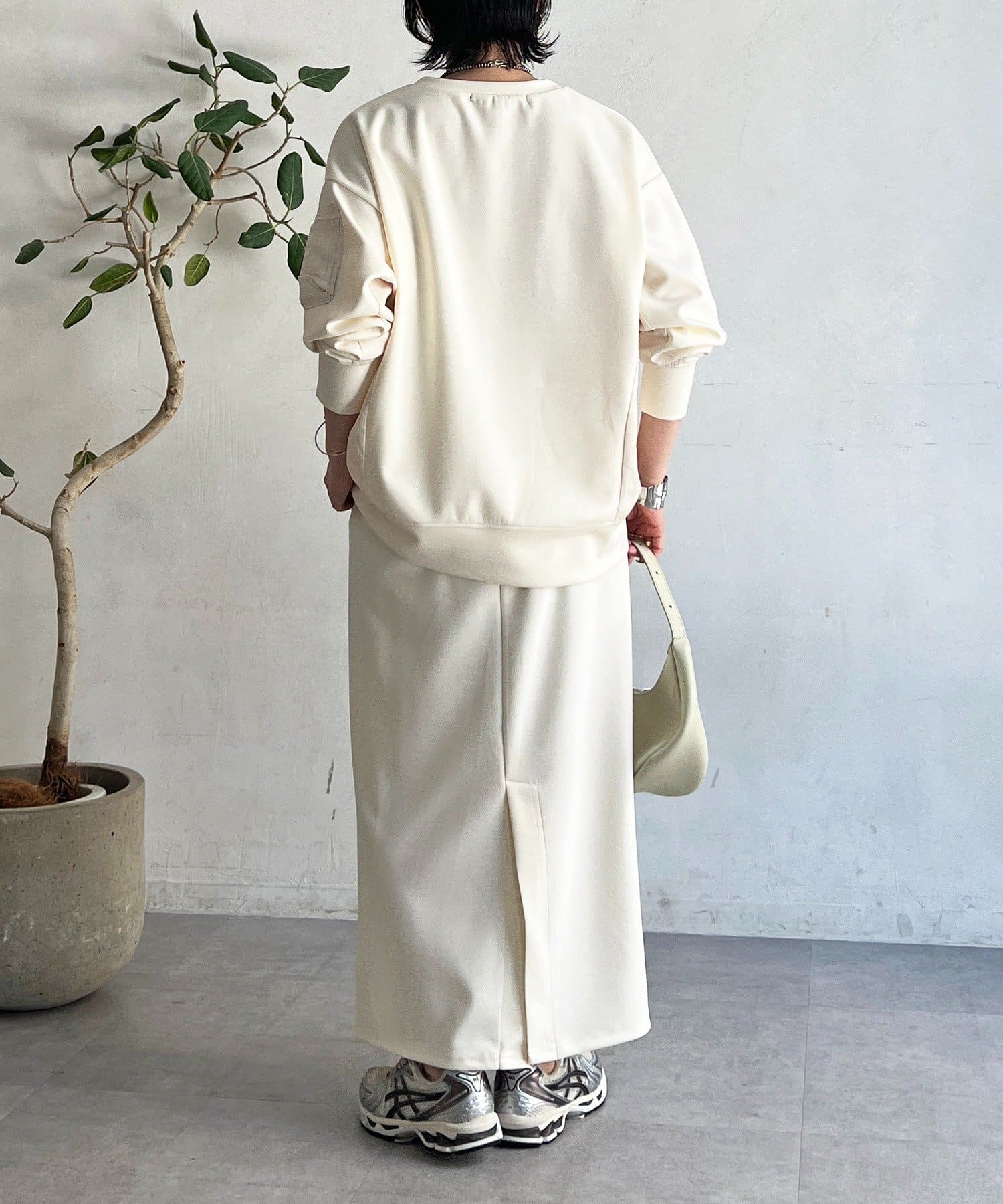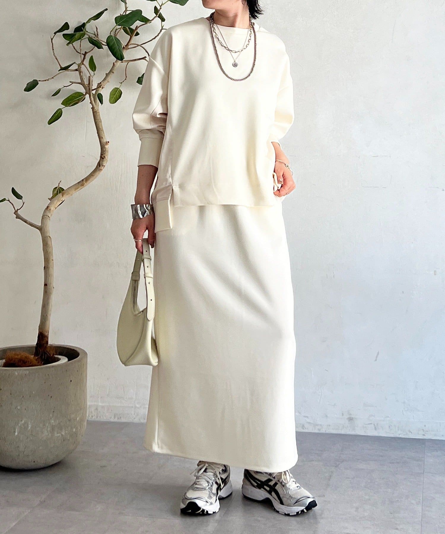 ・スカートは総ゴム仕様でストレスフリー+落ち感のあるタイトスカートで細見え効果◎