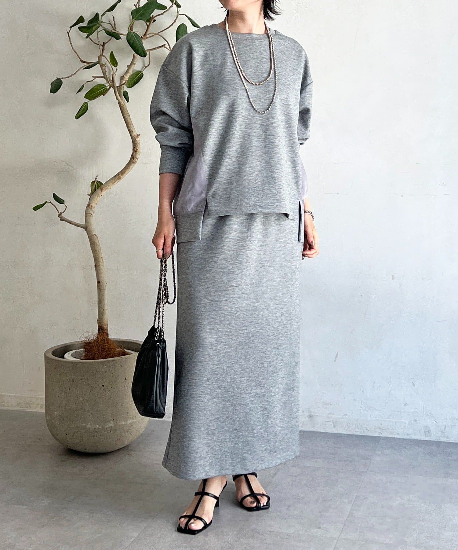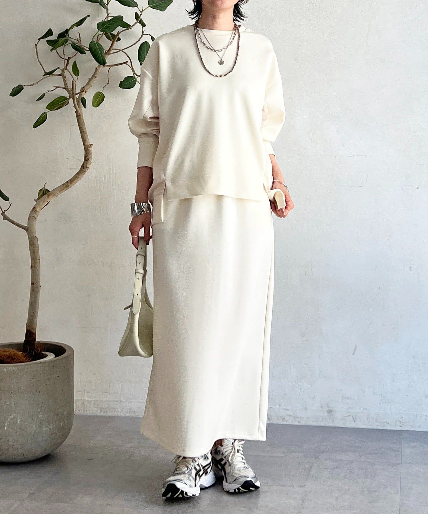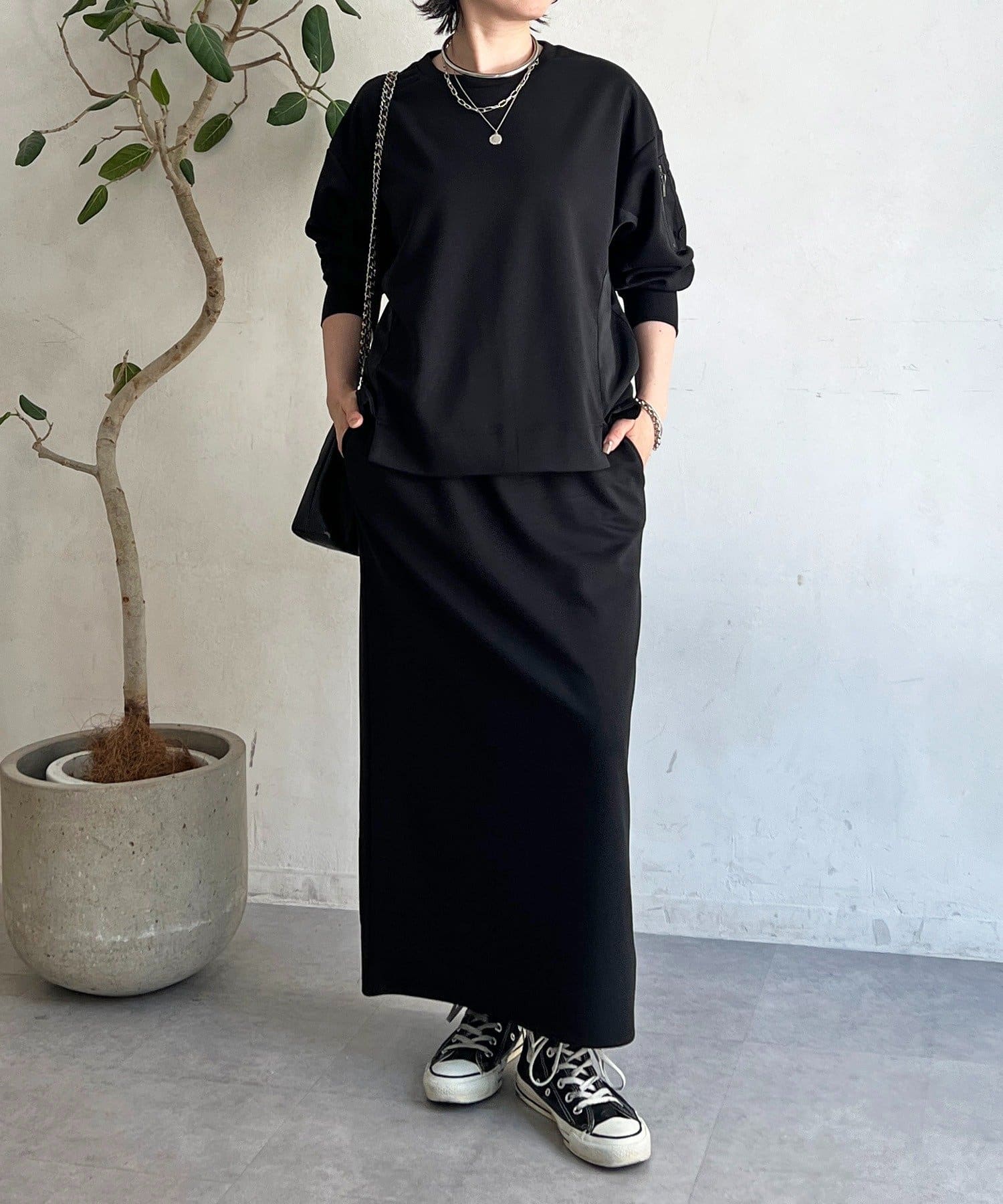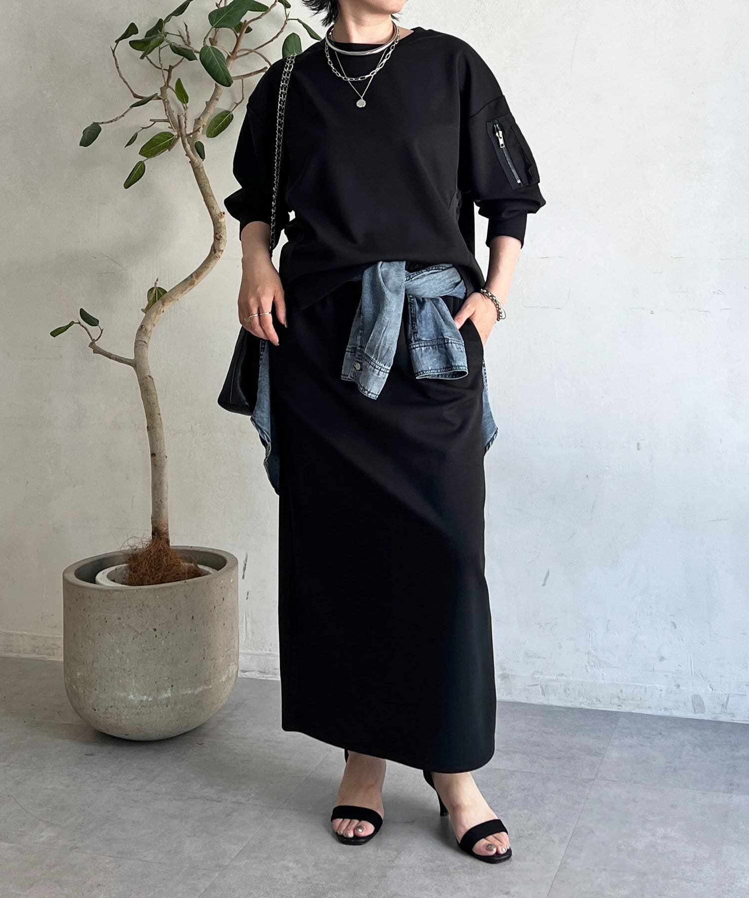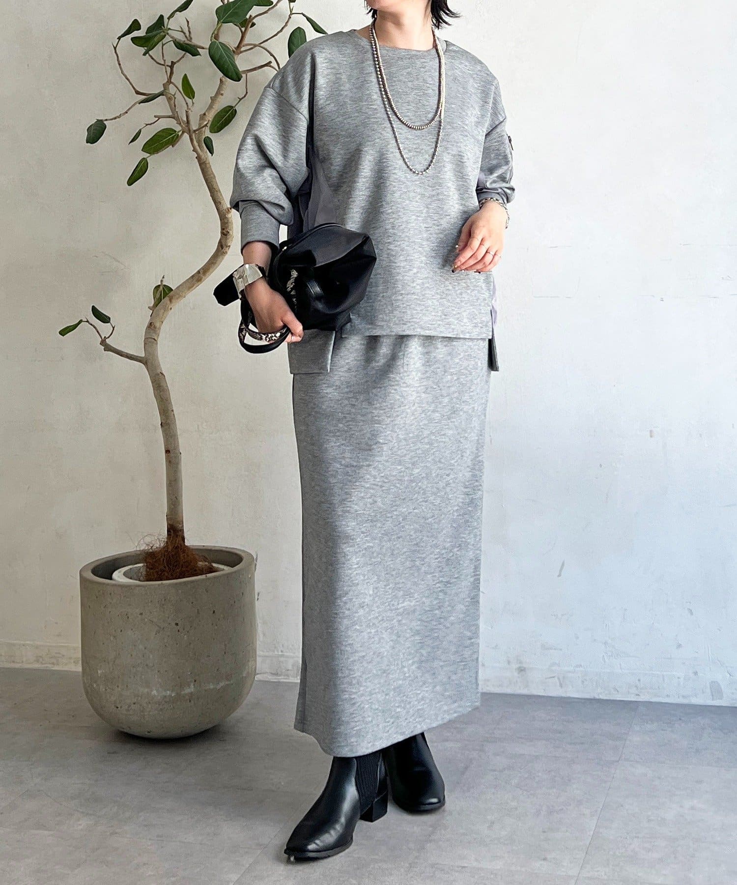 ・スカートは総ゴム仕様でストレスフリー+落ち感のあるタイトスカートで細見え効果◎