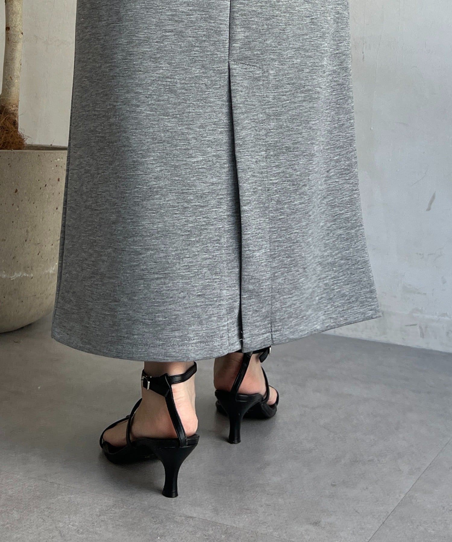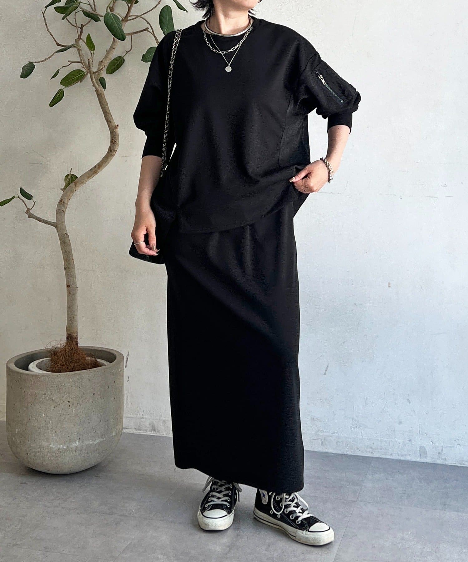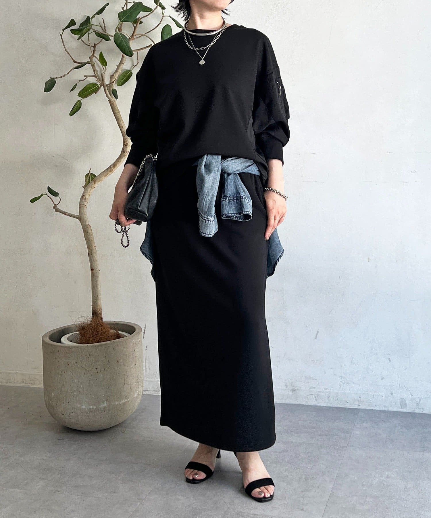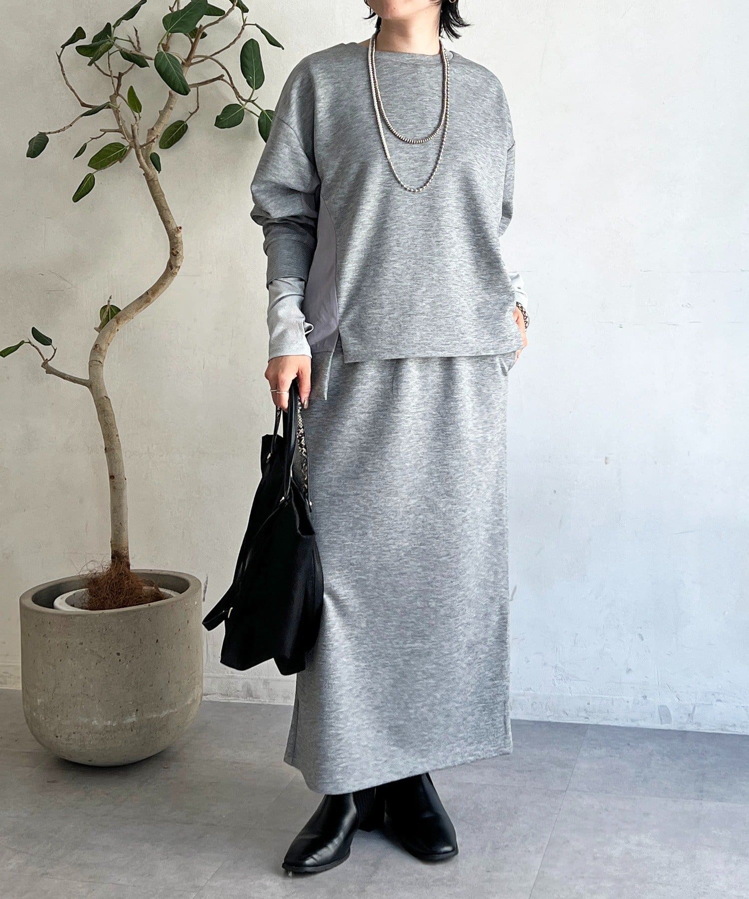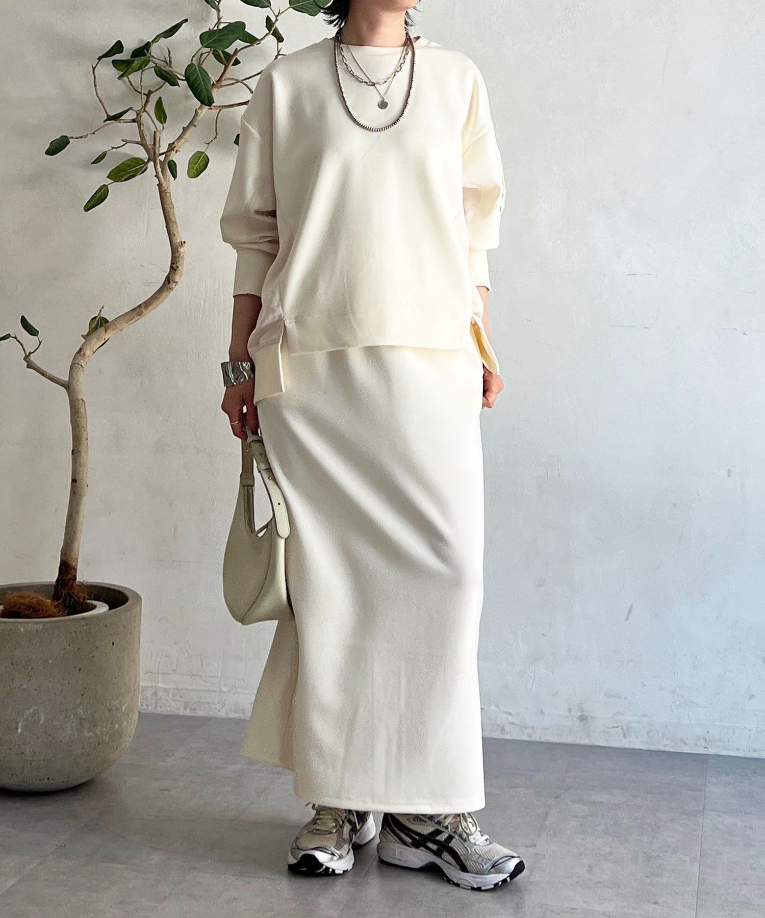・スカートは総ゴム仕様でストレスフリー+落ち感のあるタイトスカートで細見え効果◎