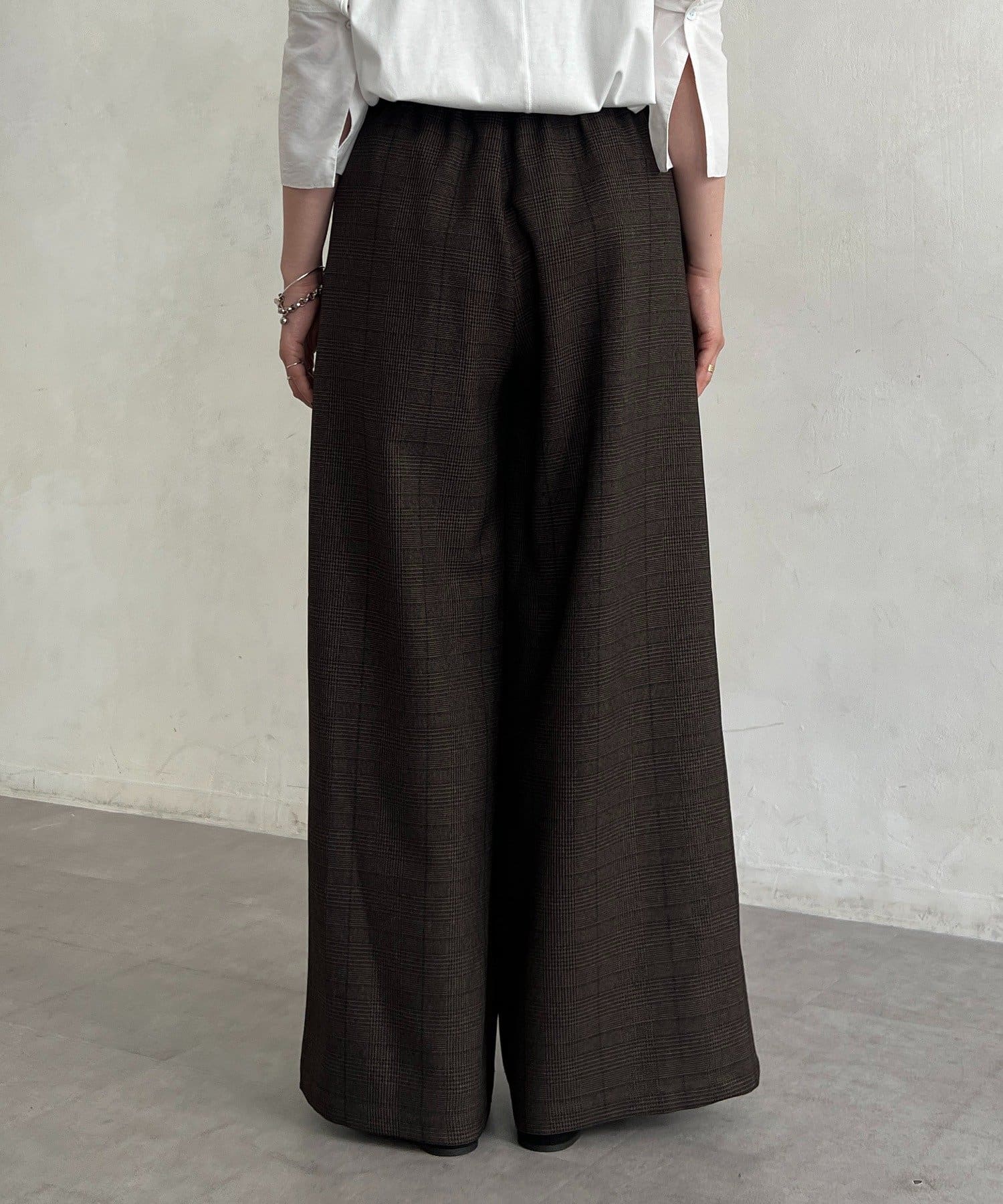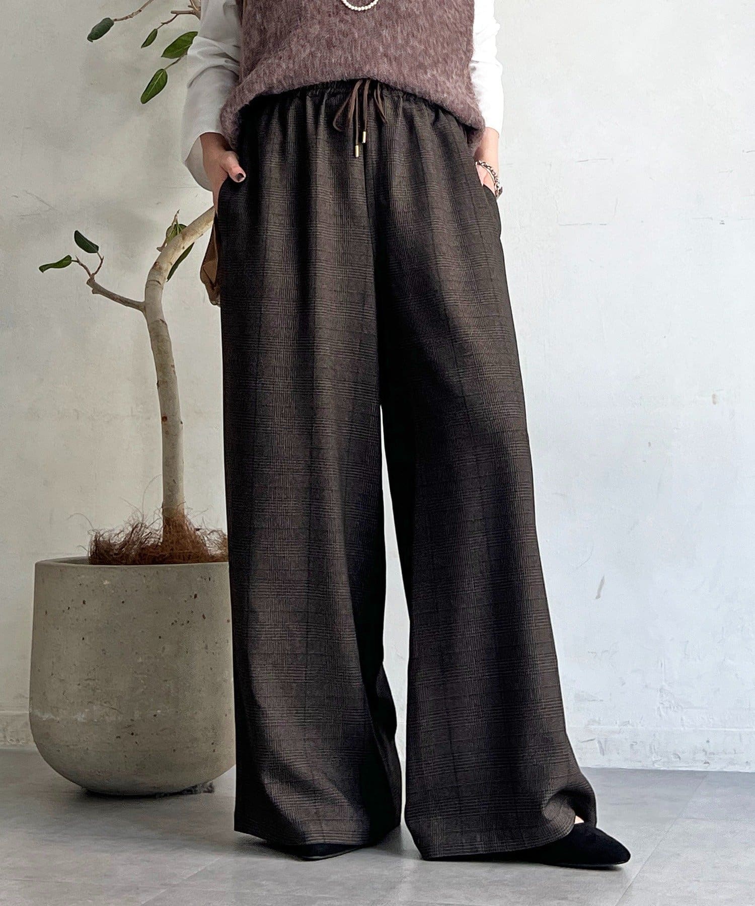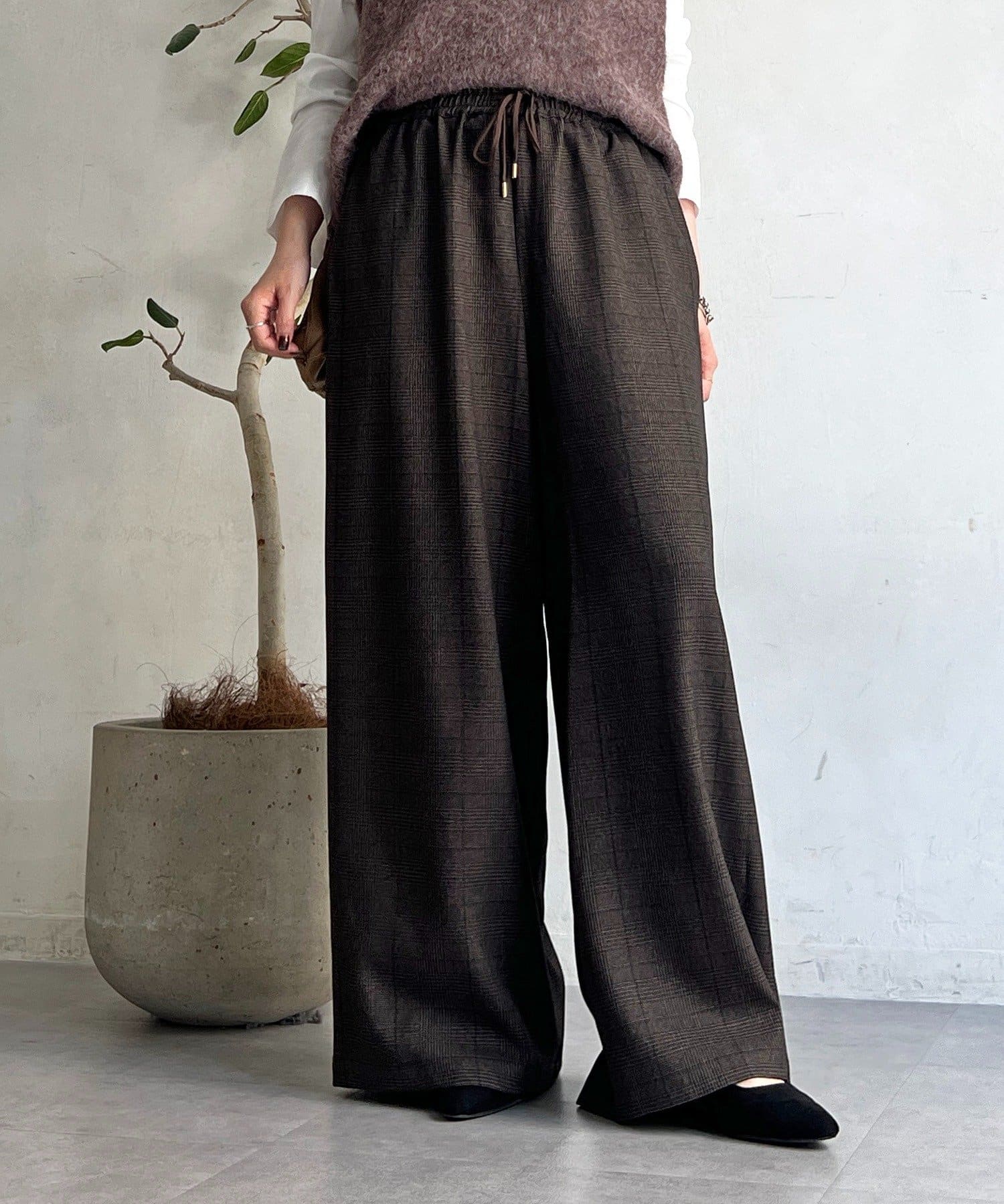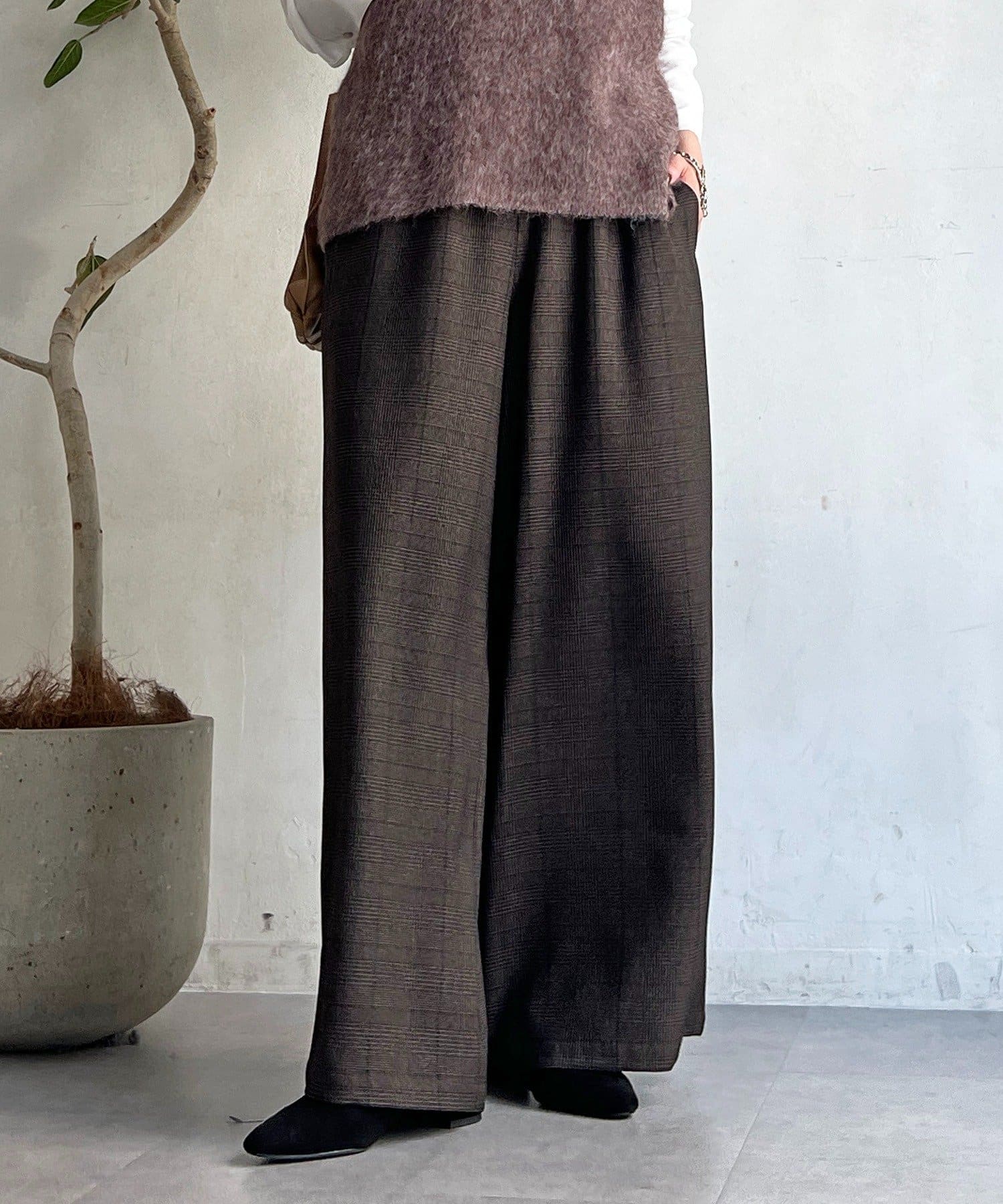 ・季節感のあるチェック柄を、落ち感のあるワイドパンツで仕上げた一着。
