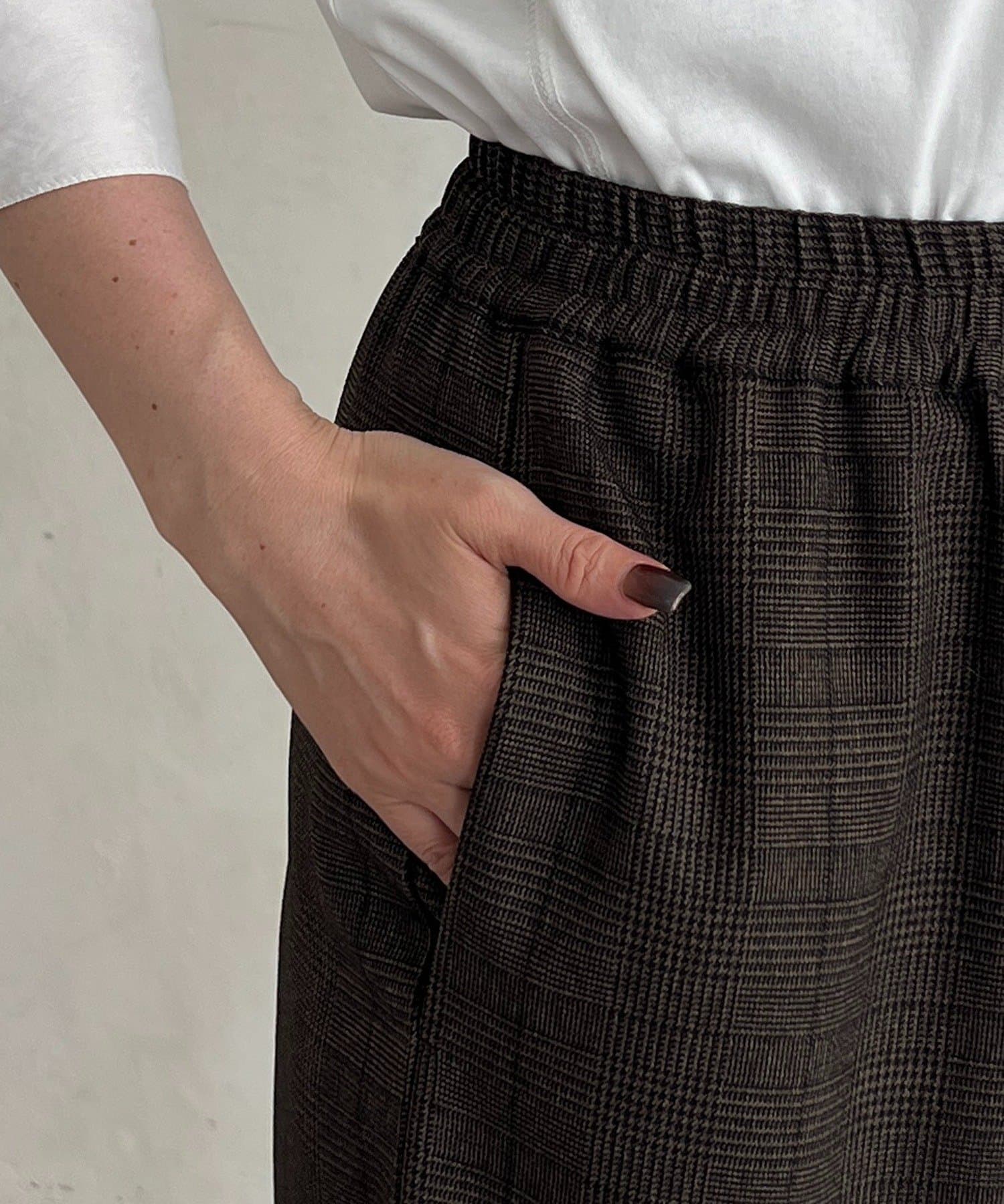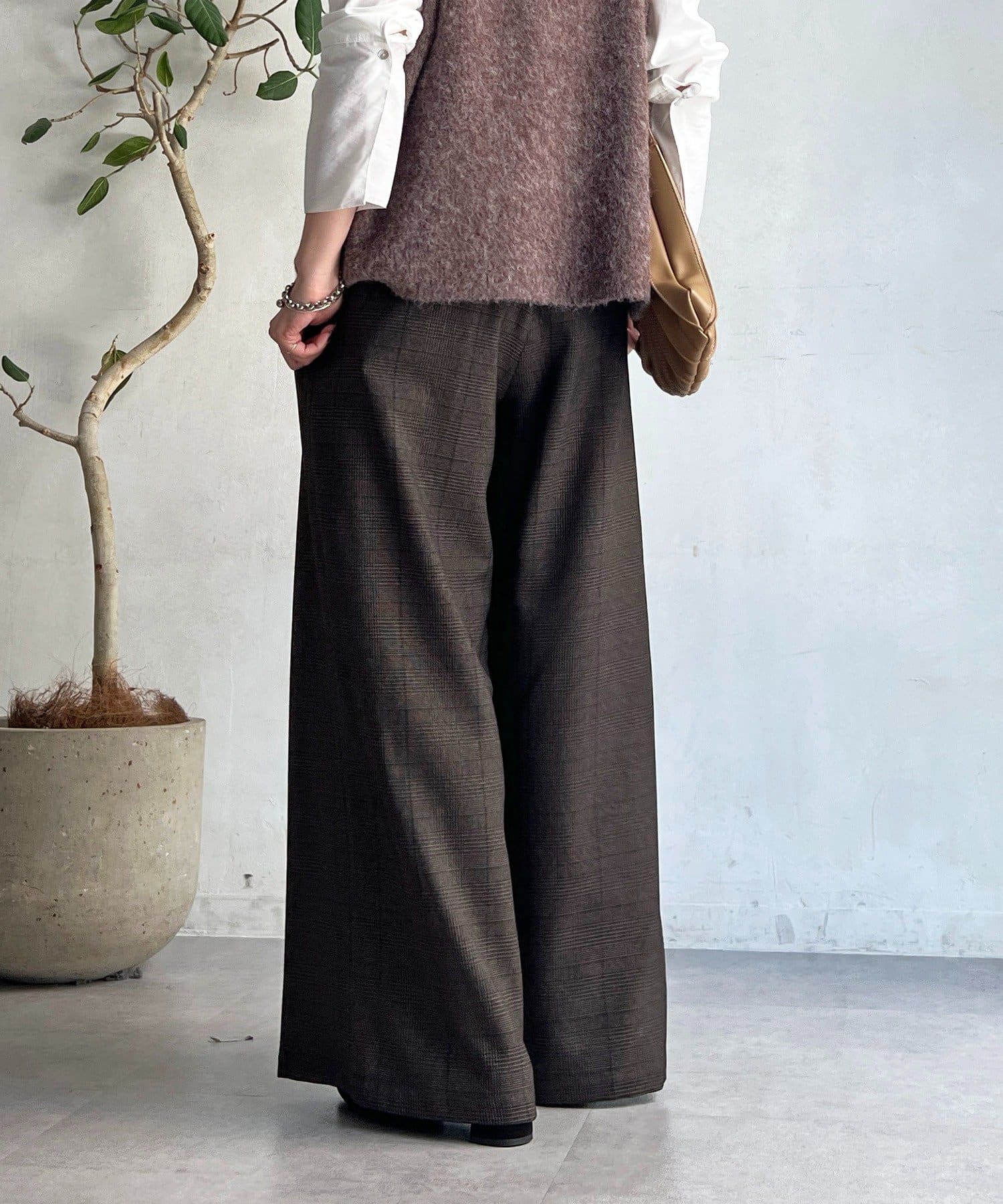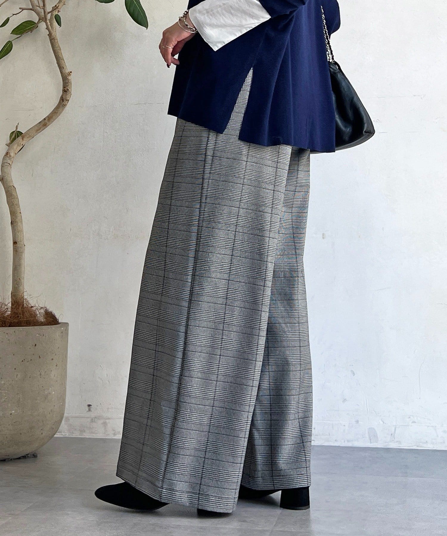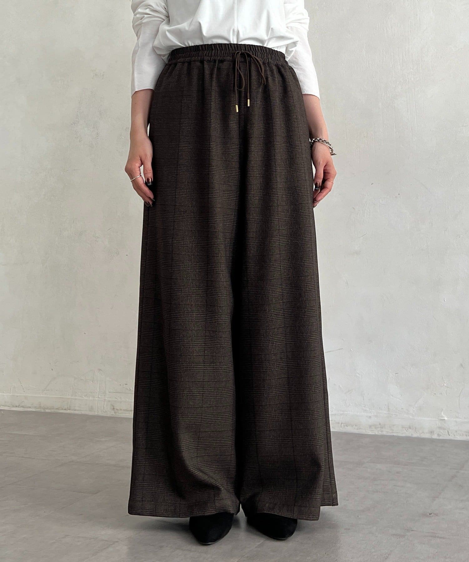 ・季節感のあるチェック柄を、落ち感のあるワイドパンツで仕上げた一着。