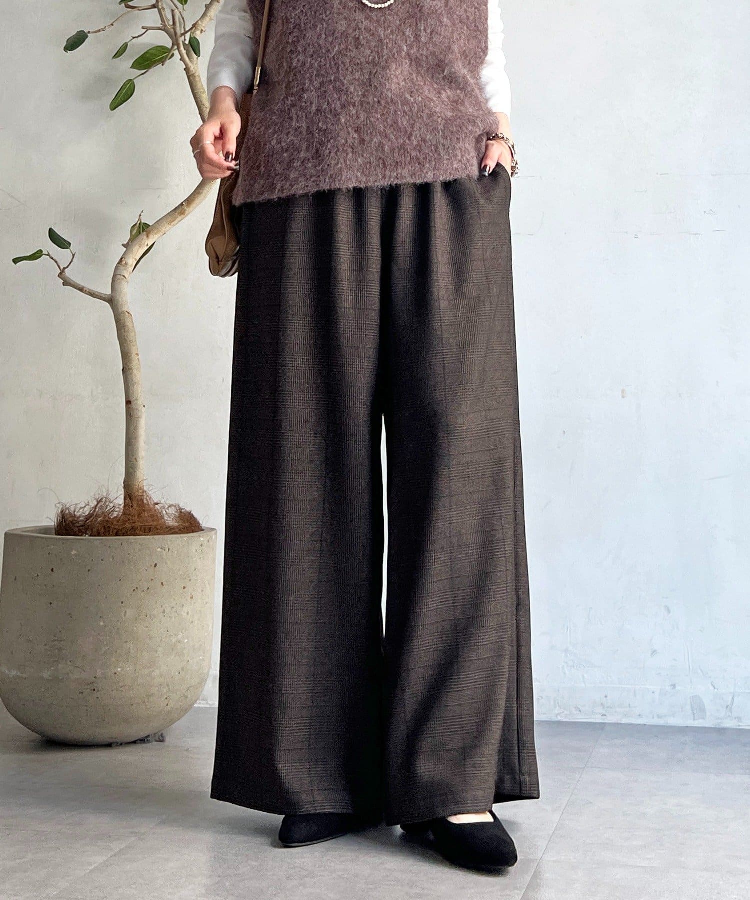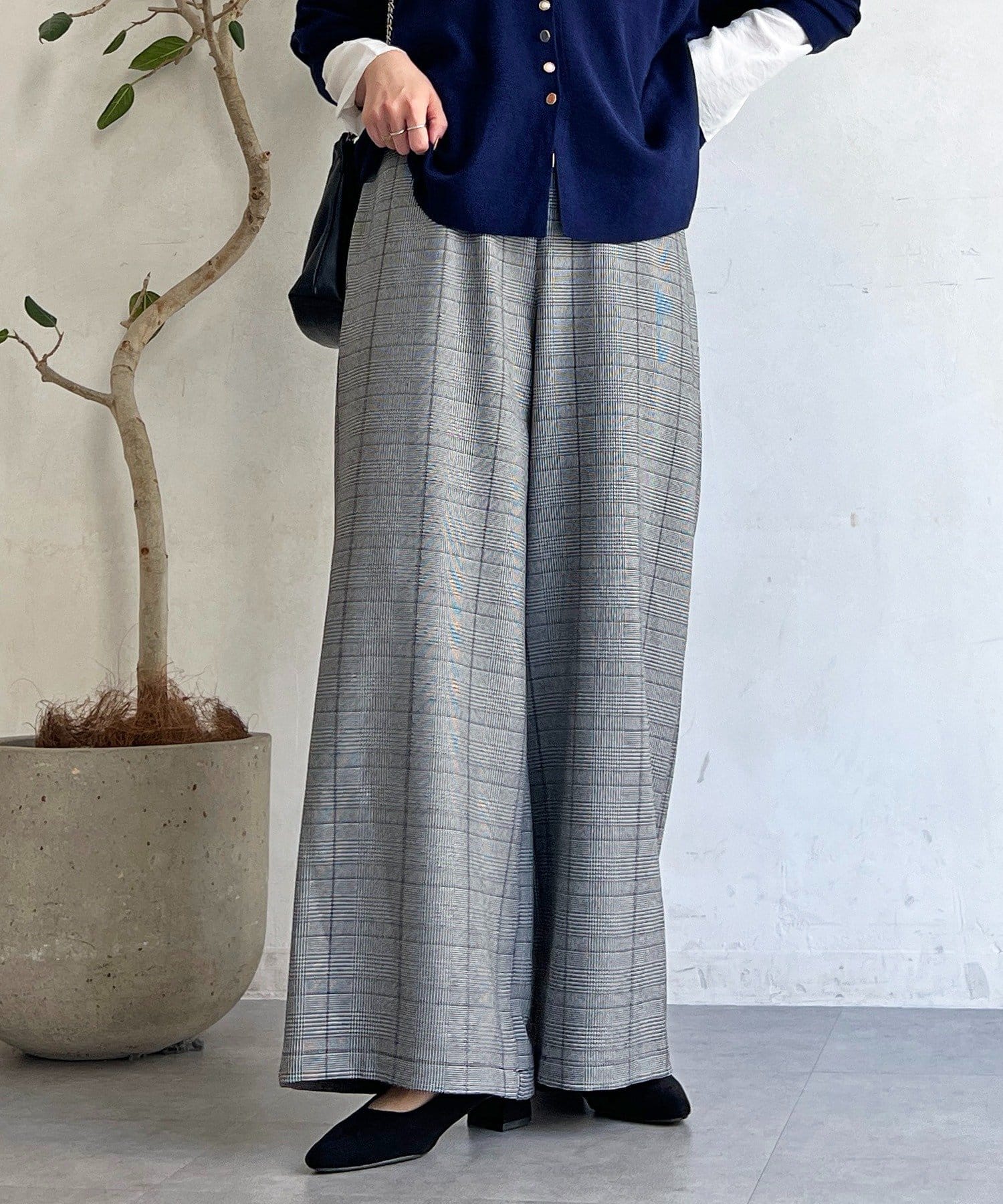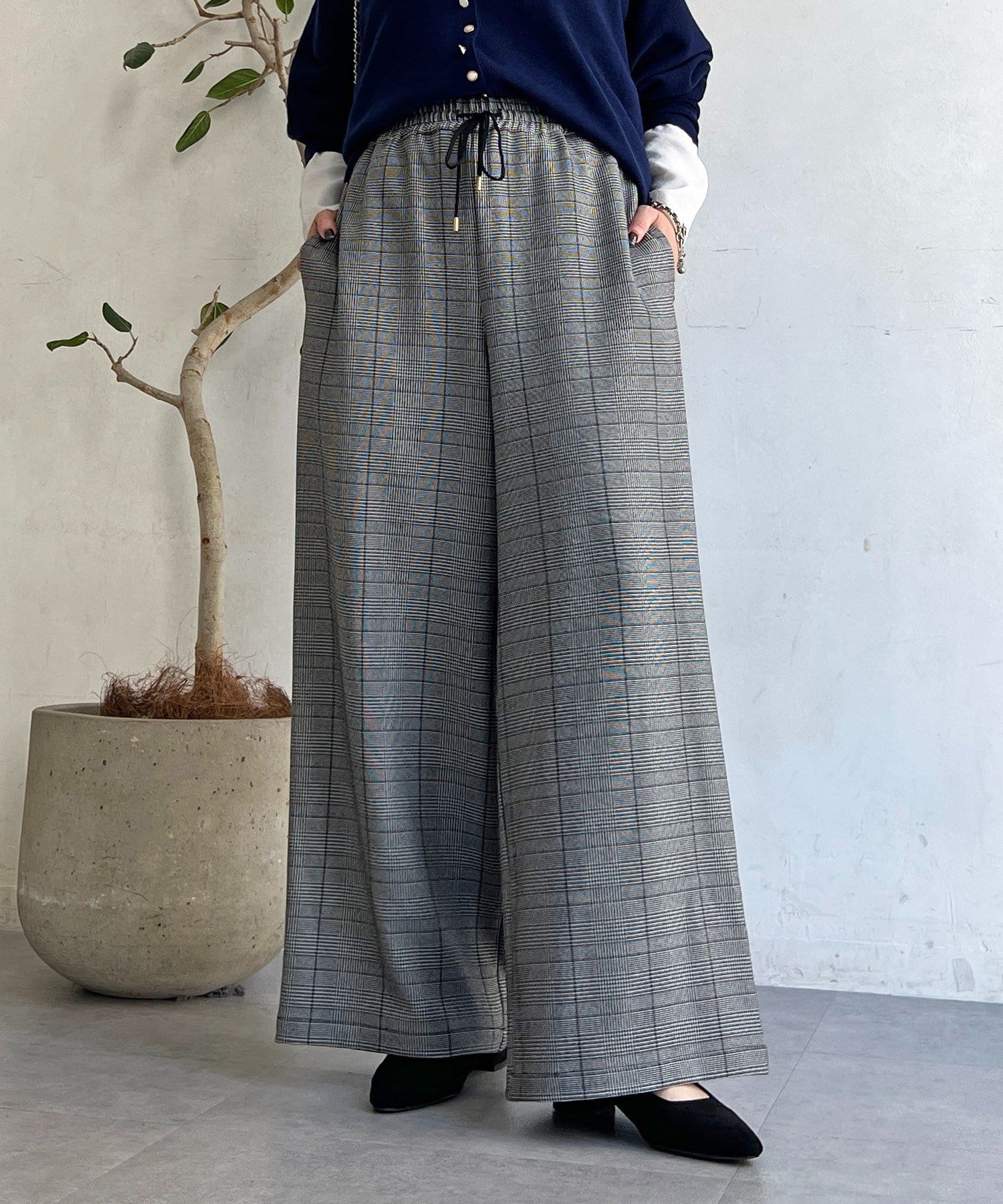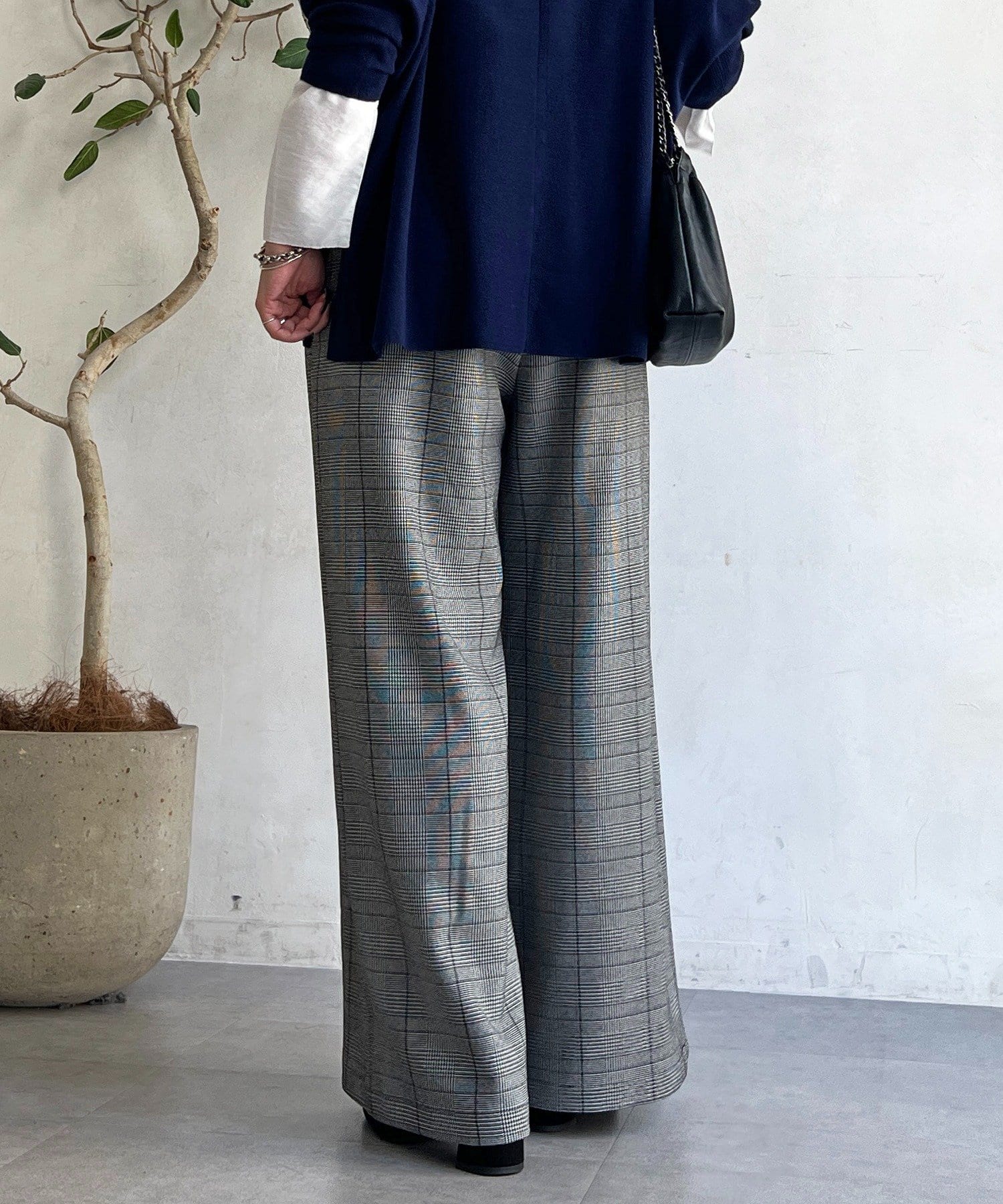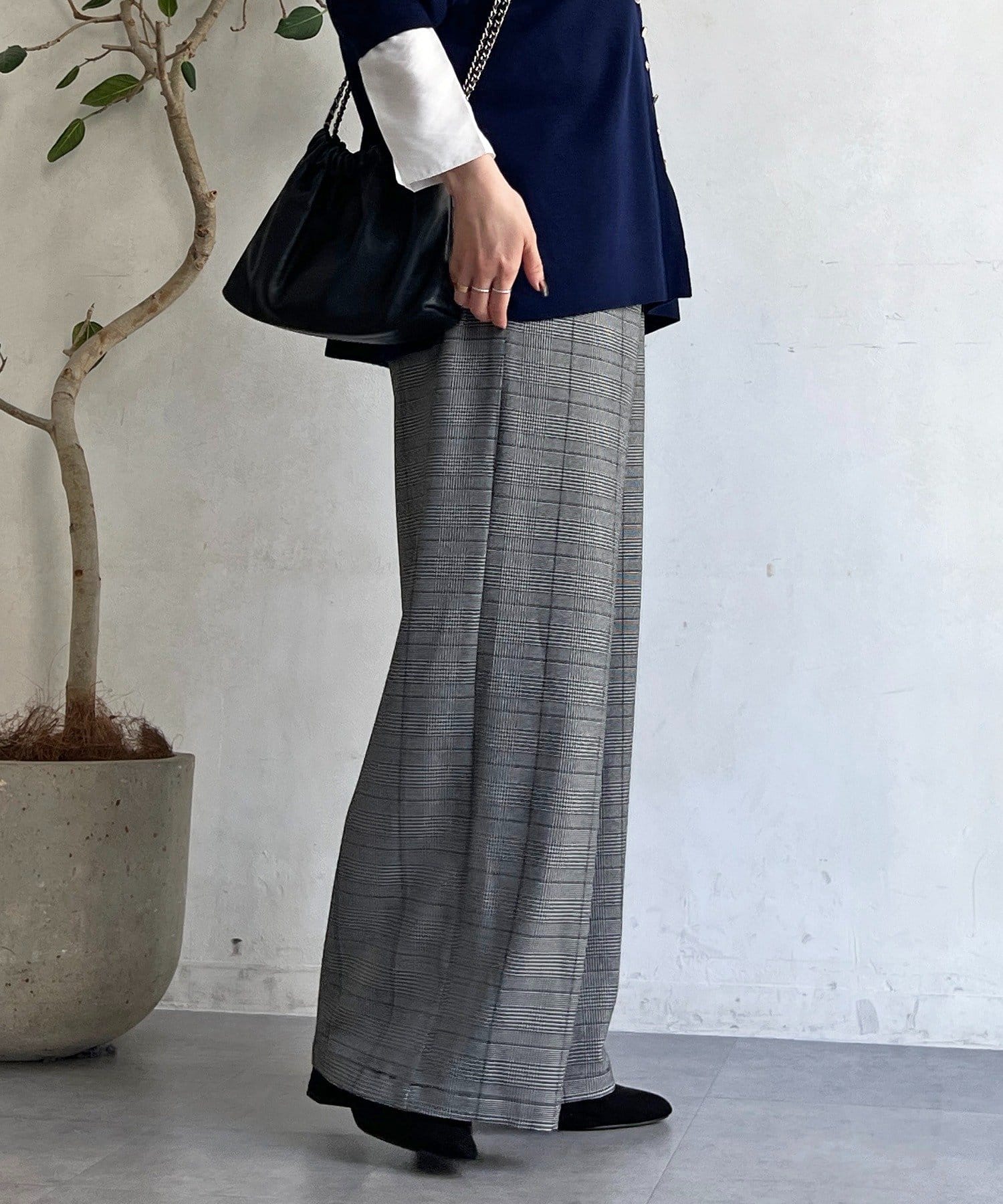 ・季節感のあるチェック柄を、落ち感のあるワイドパンツで仕上げた一着。