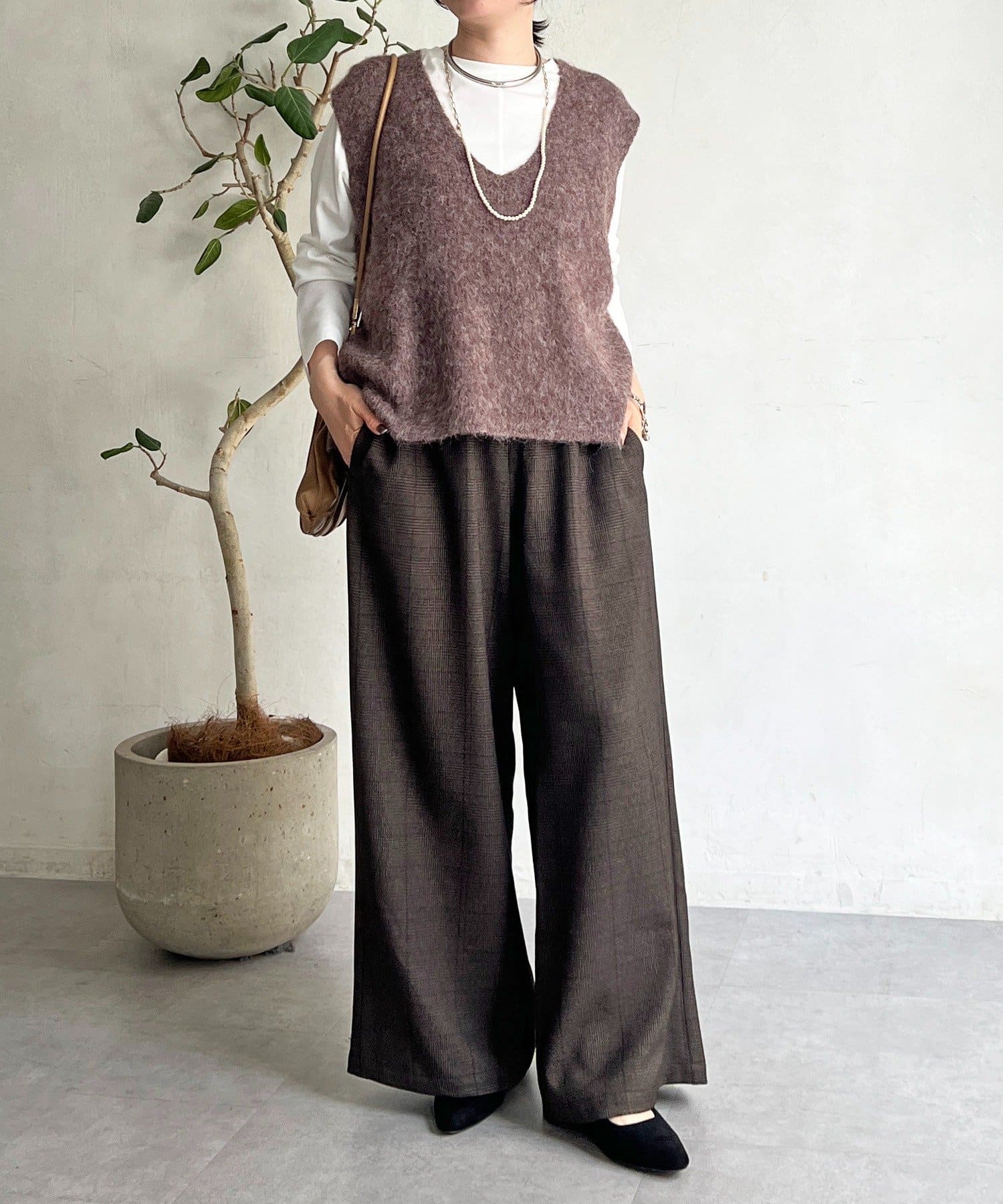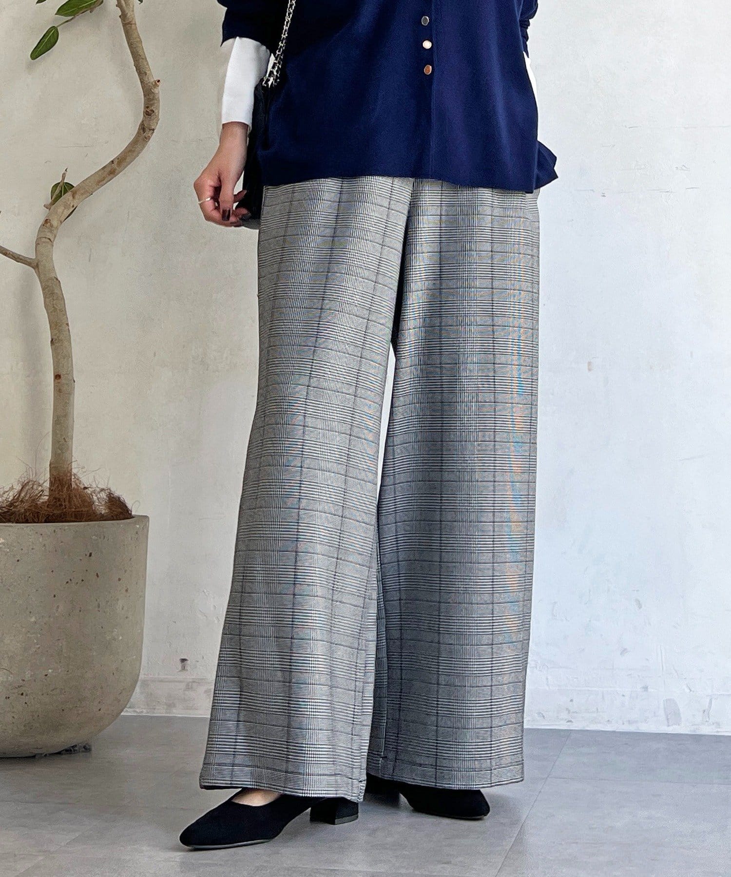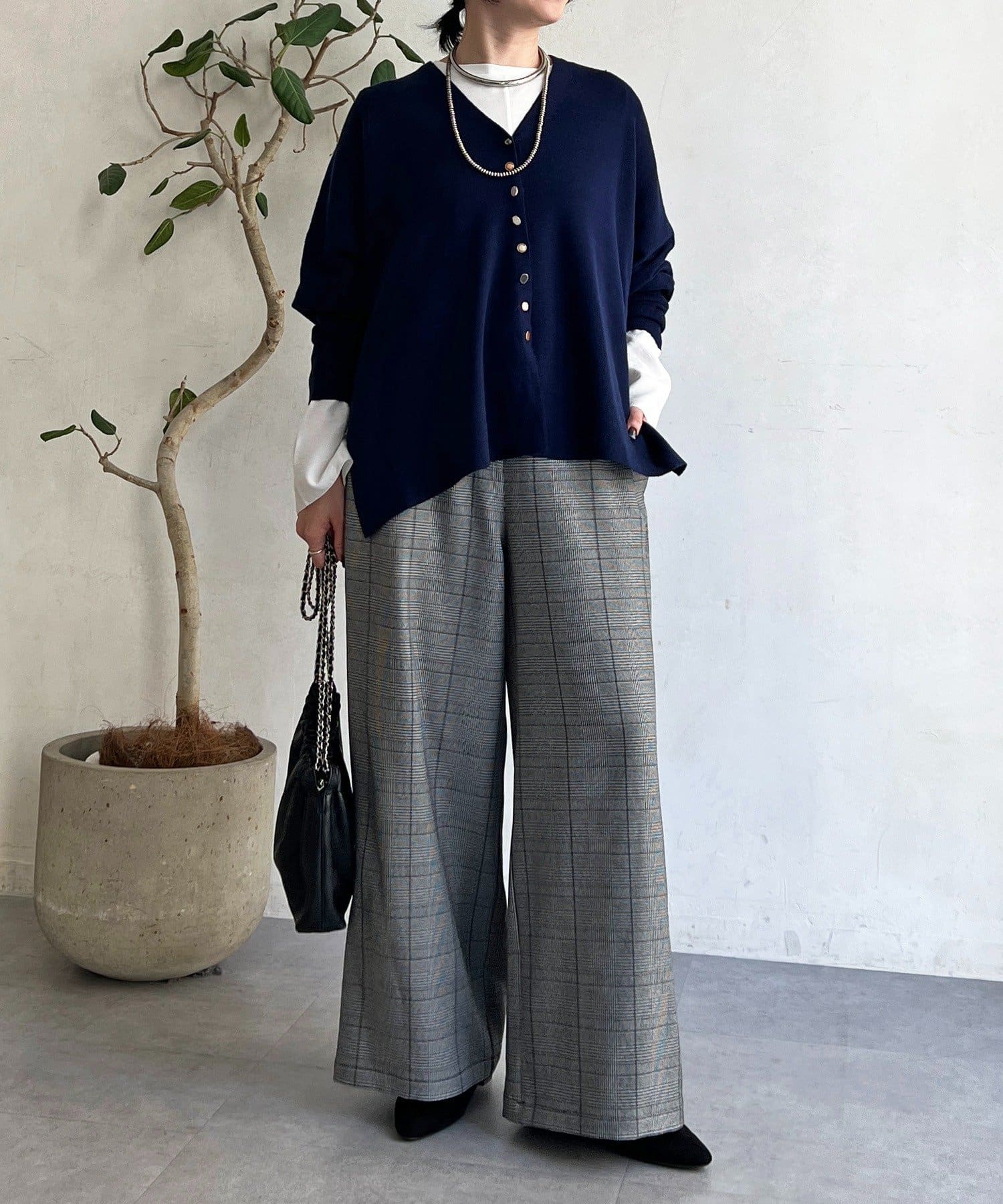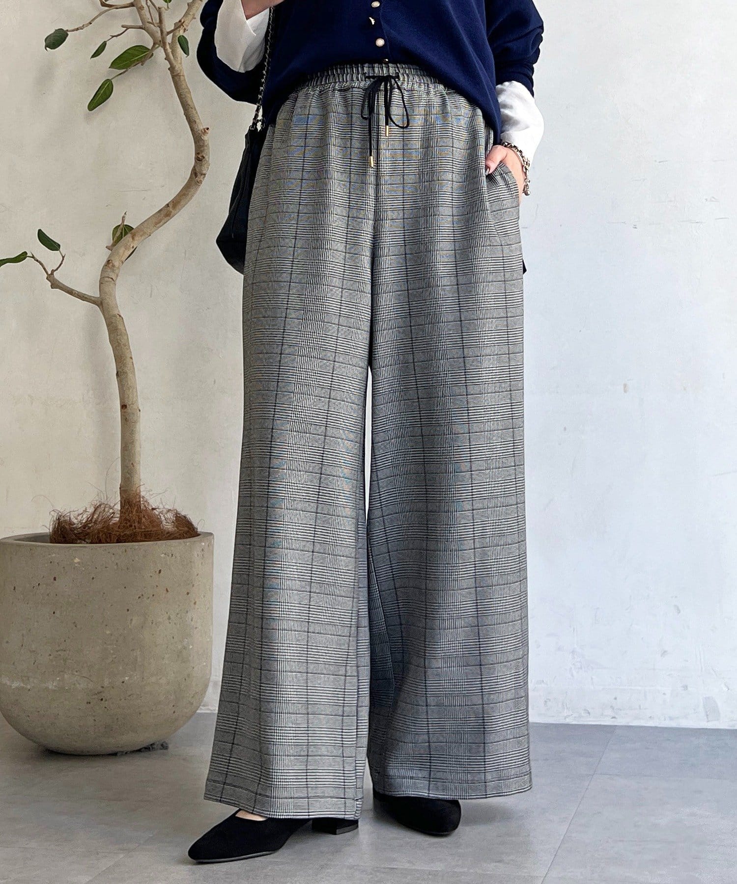 ・季節感のあるチェック柄を、落ち感のあるワイドパンツで仕上げた一着。