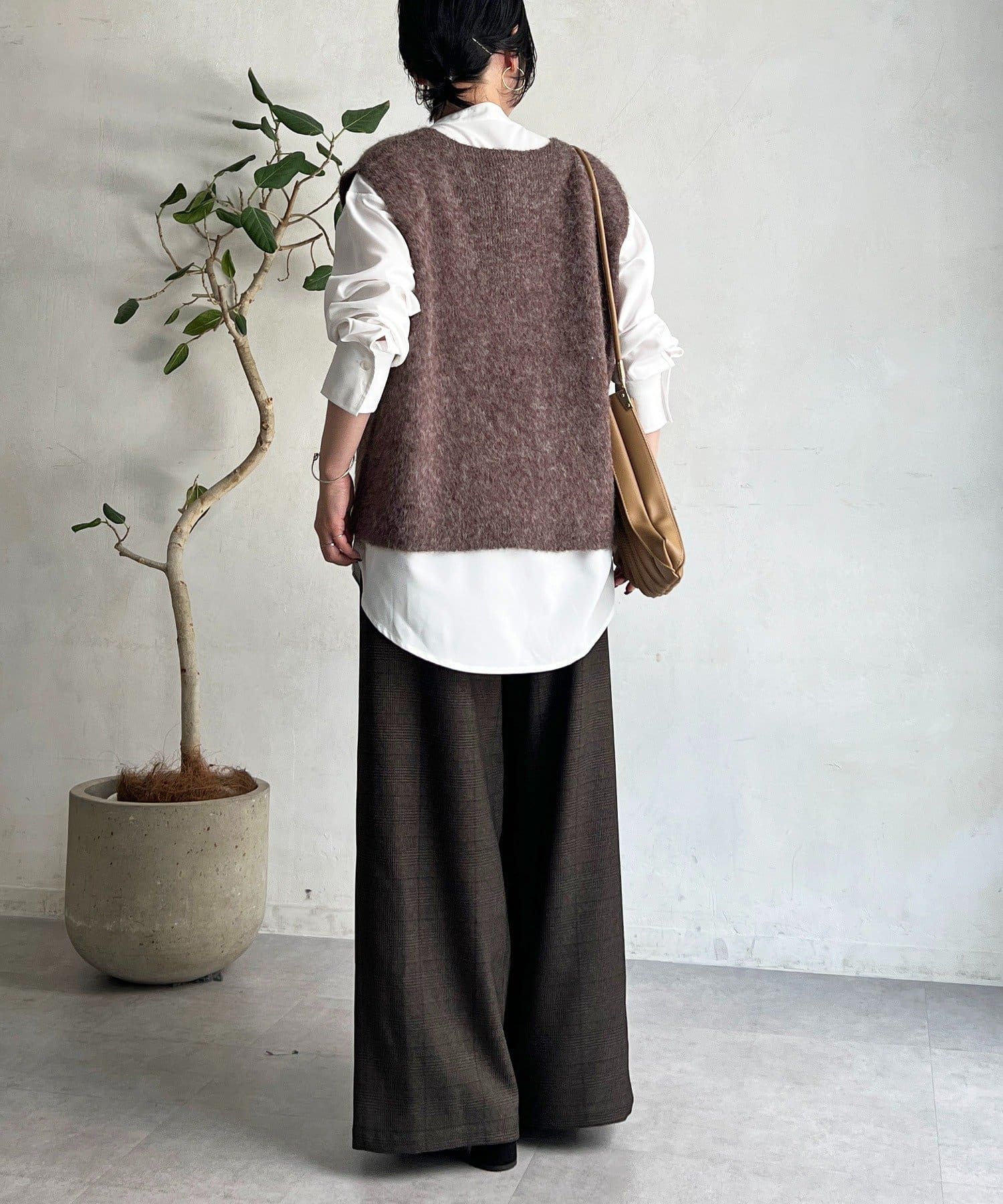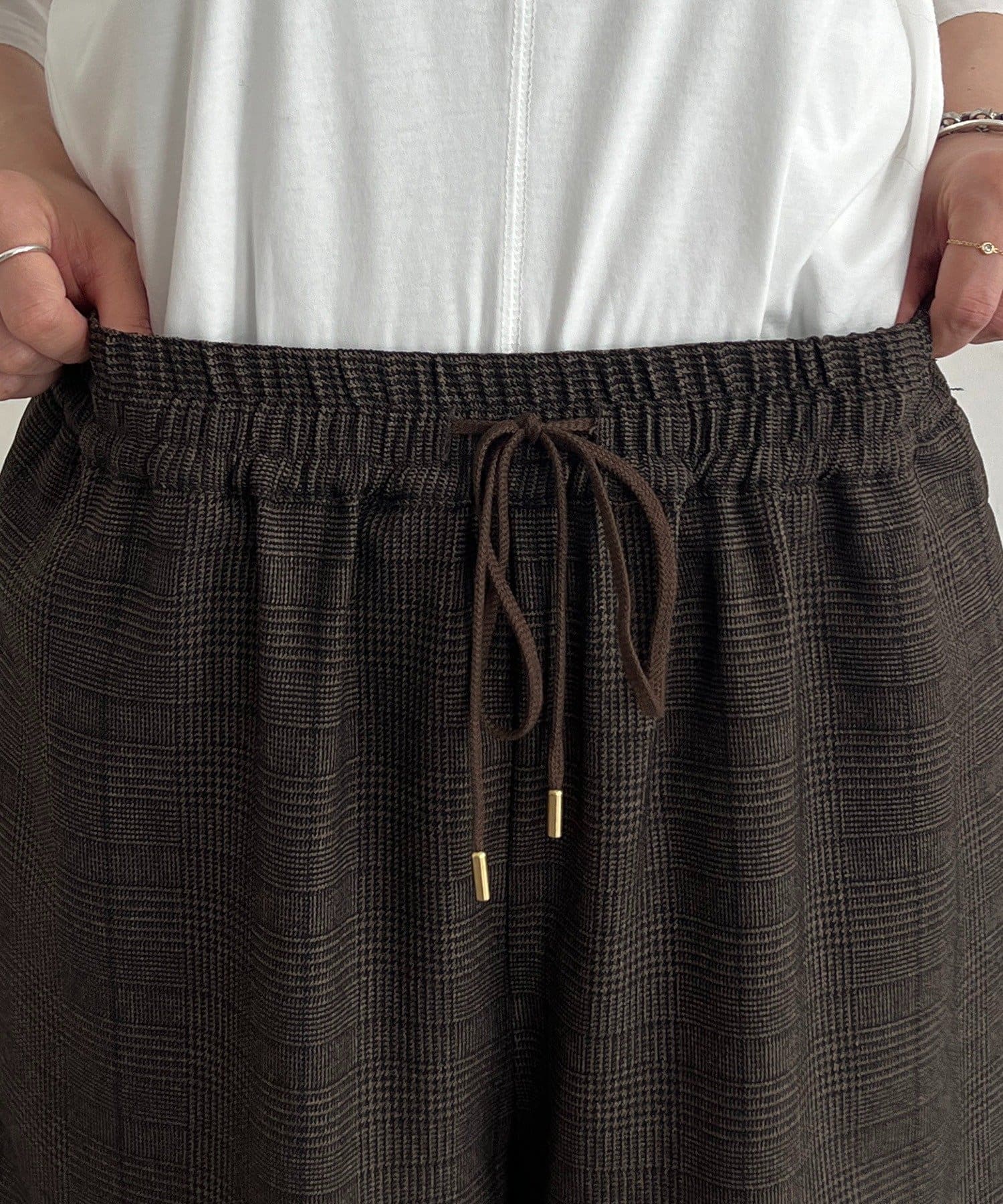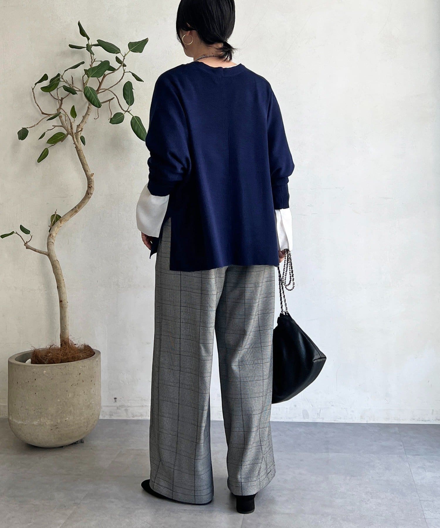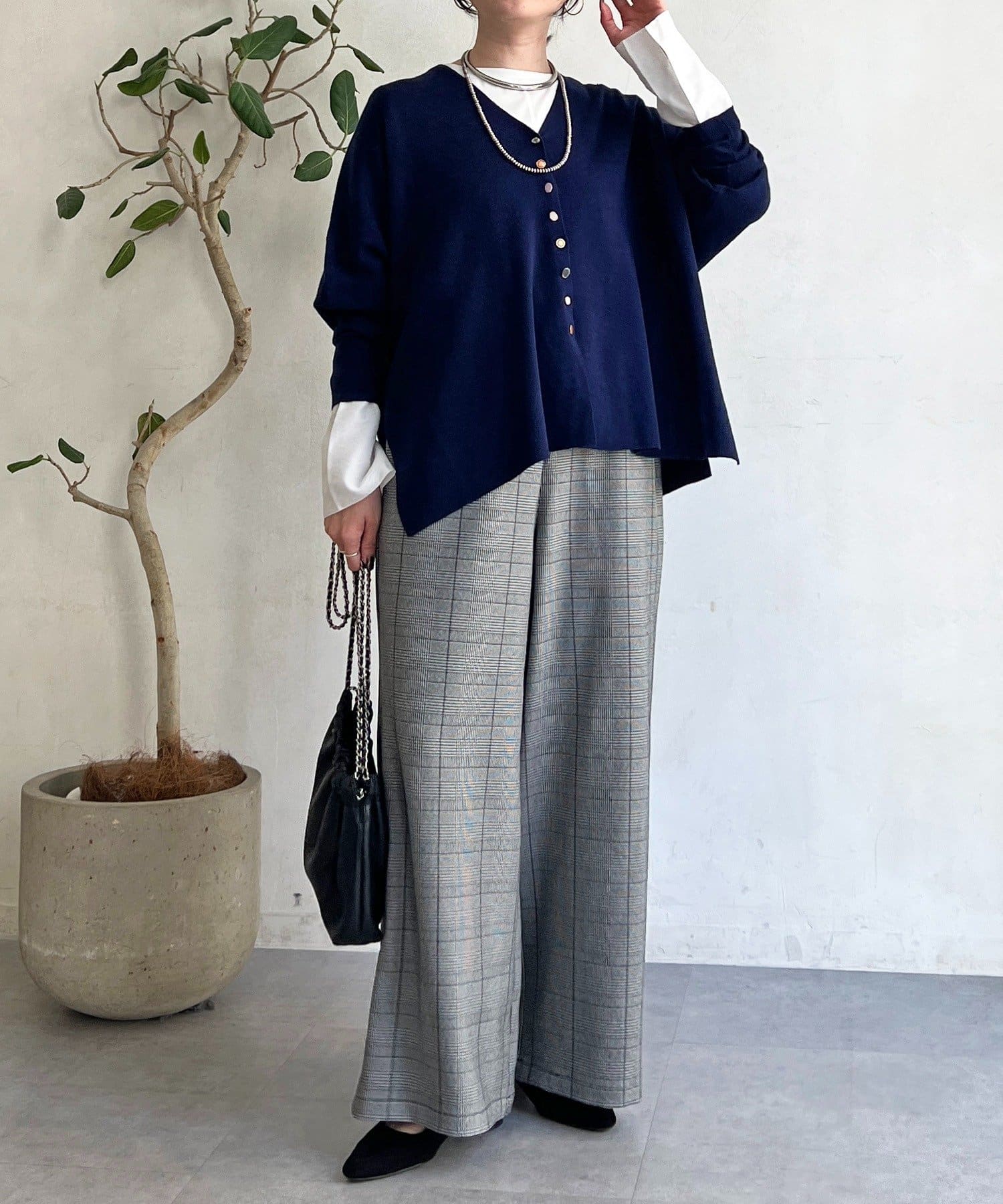 ・季節感のあるチェック柄を、落ち感のあるワイドパンツで仕上げた一着。