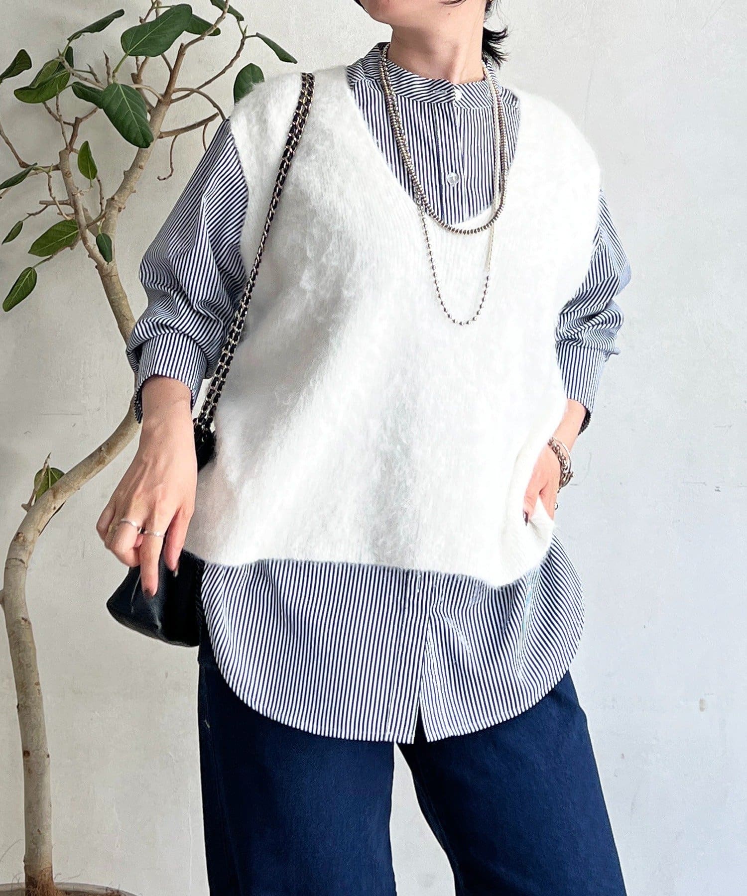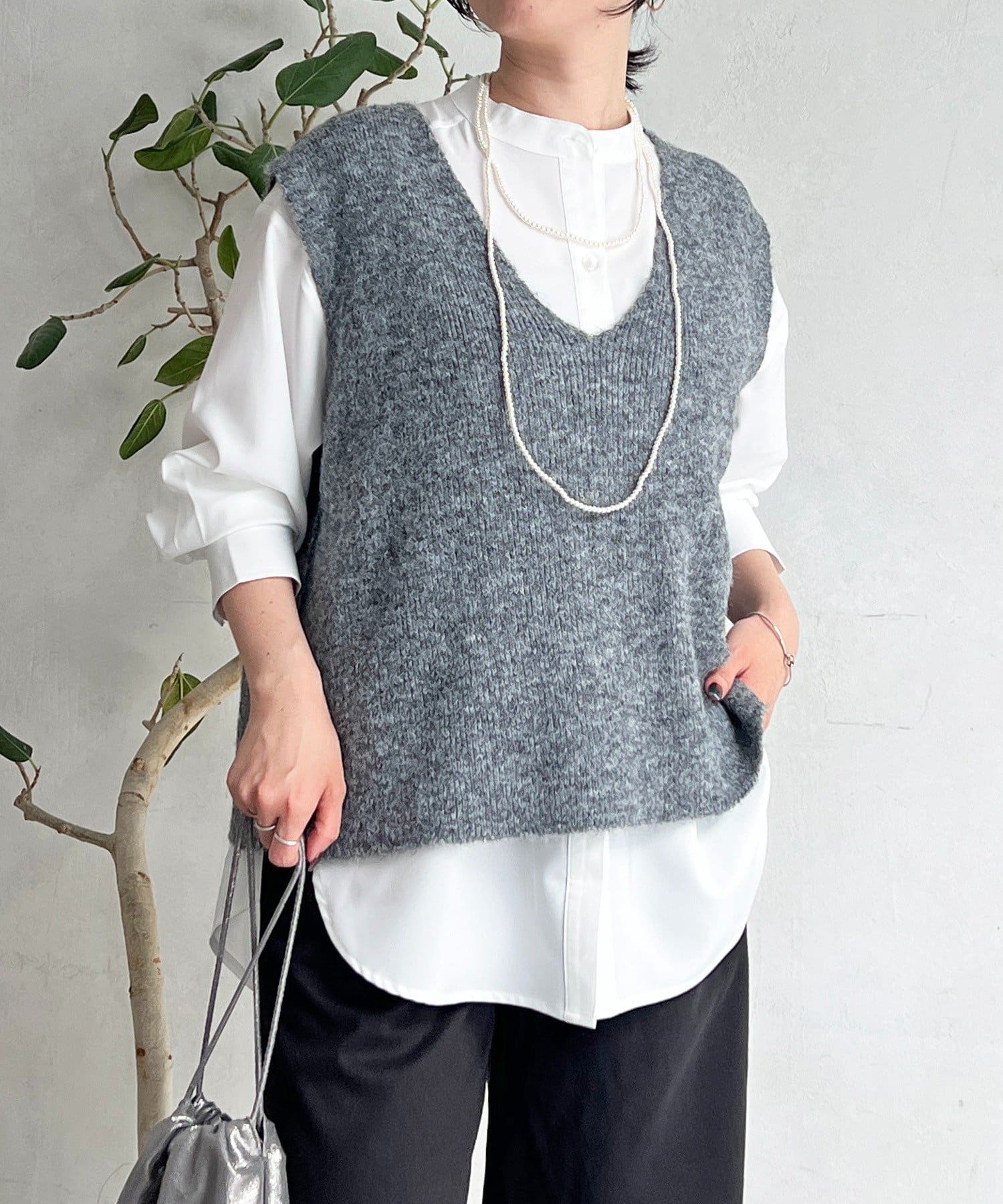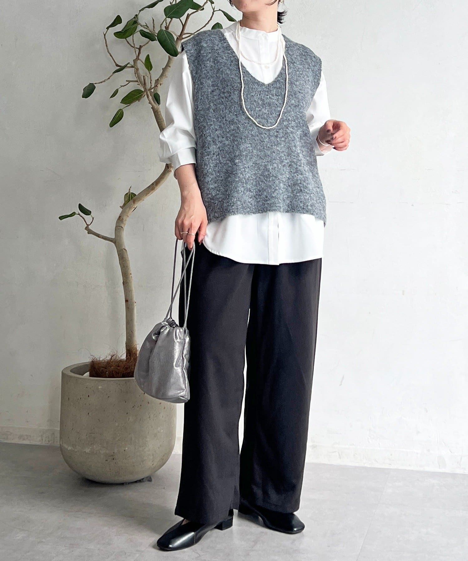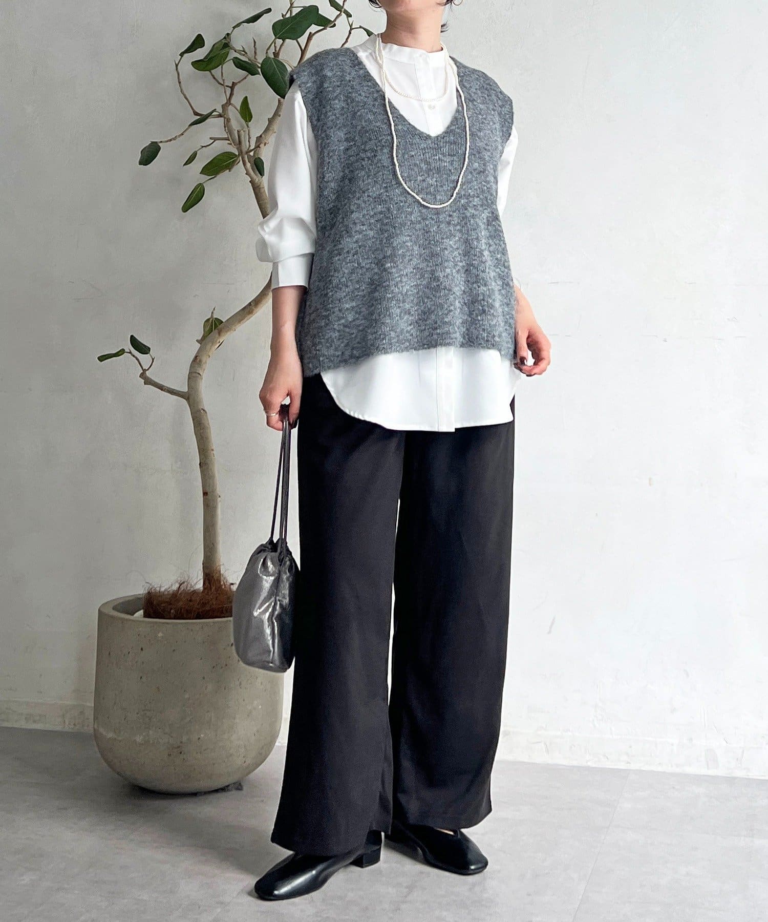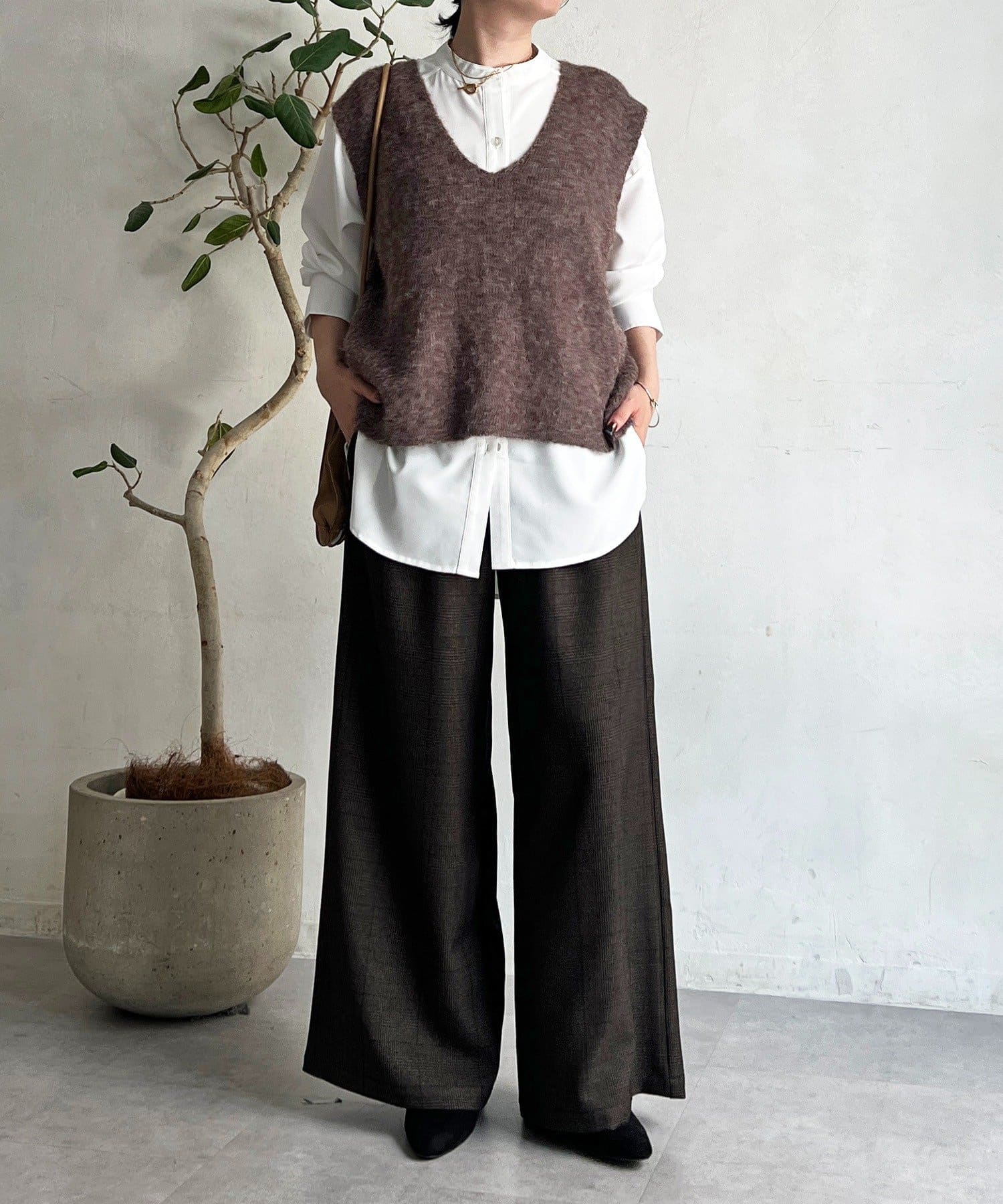 ・シーズンムード満載のニットベストと、バンドカラーシャツでこなれ感あるレイヤードスタイルに◎