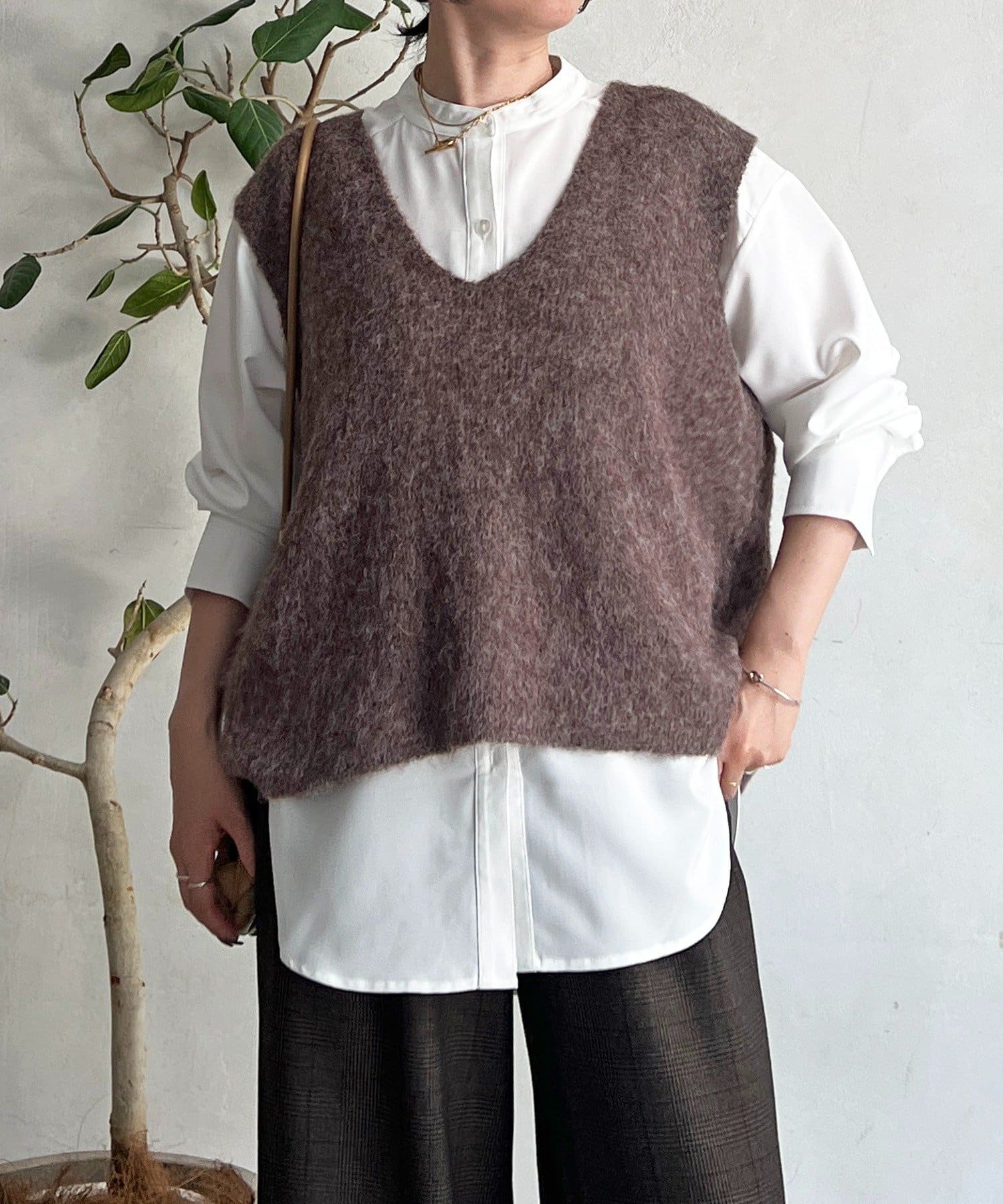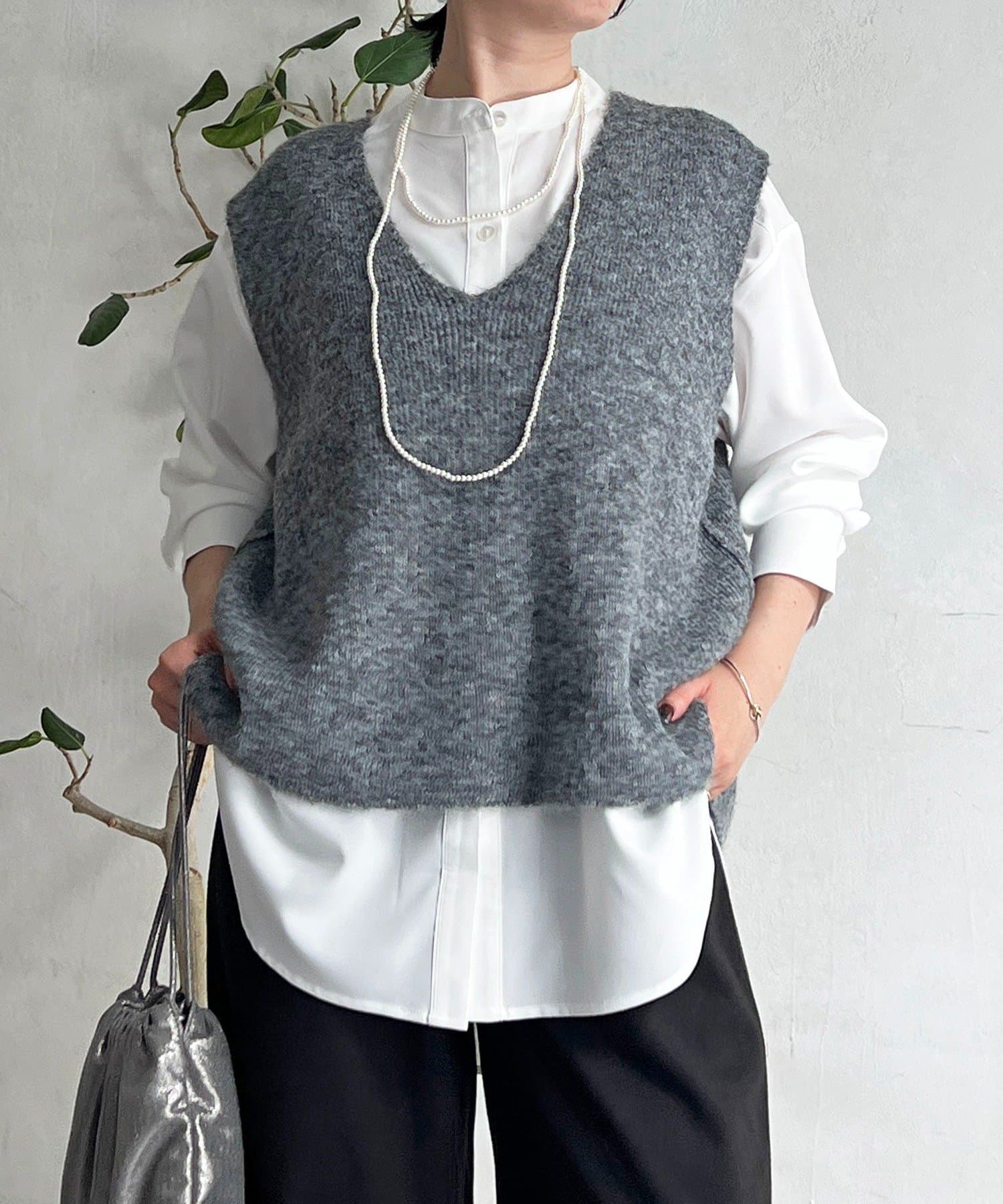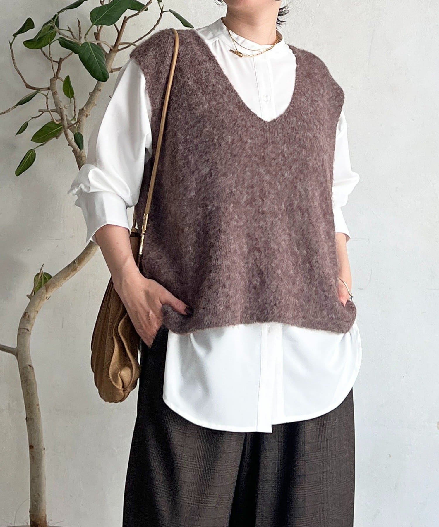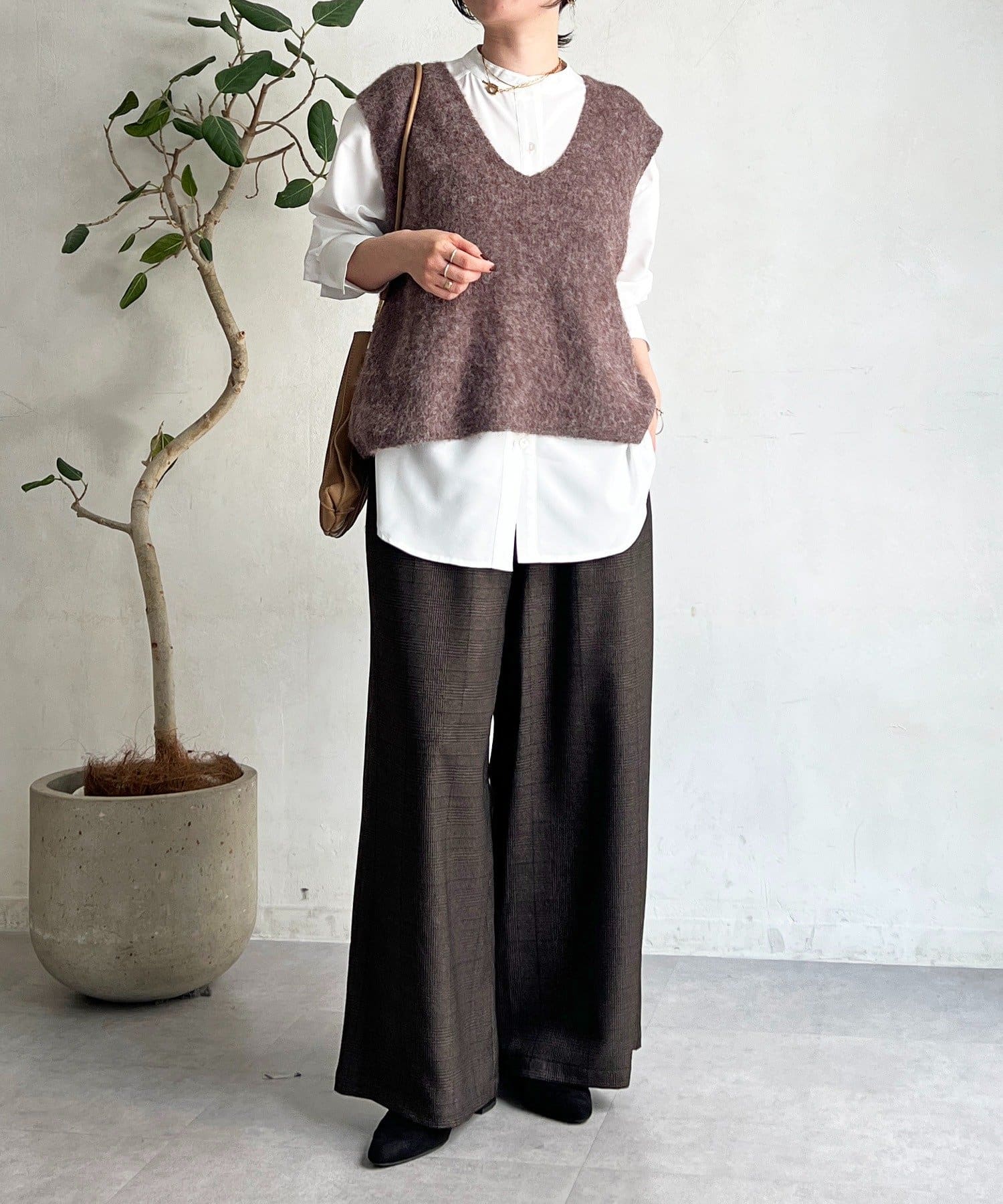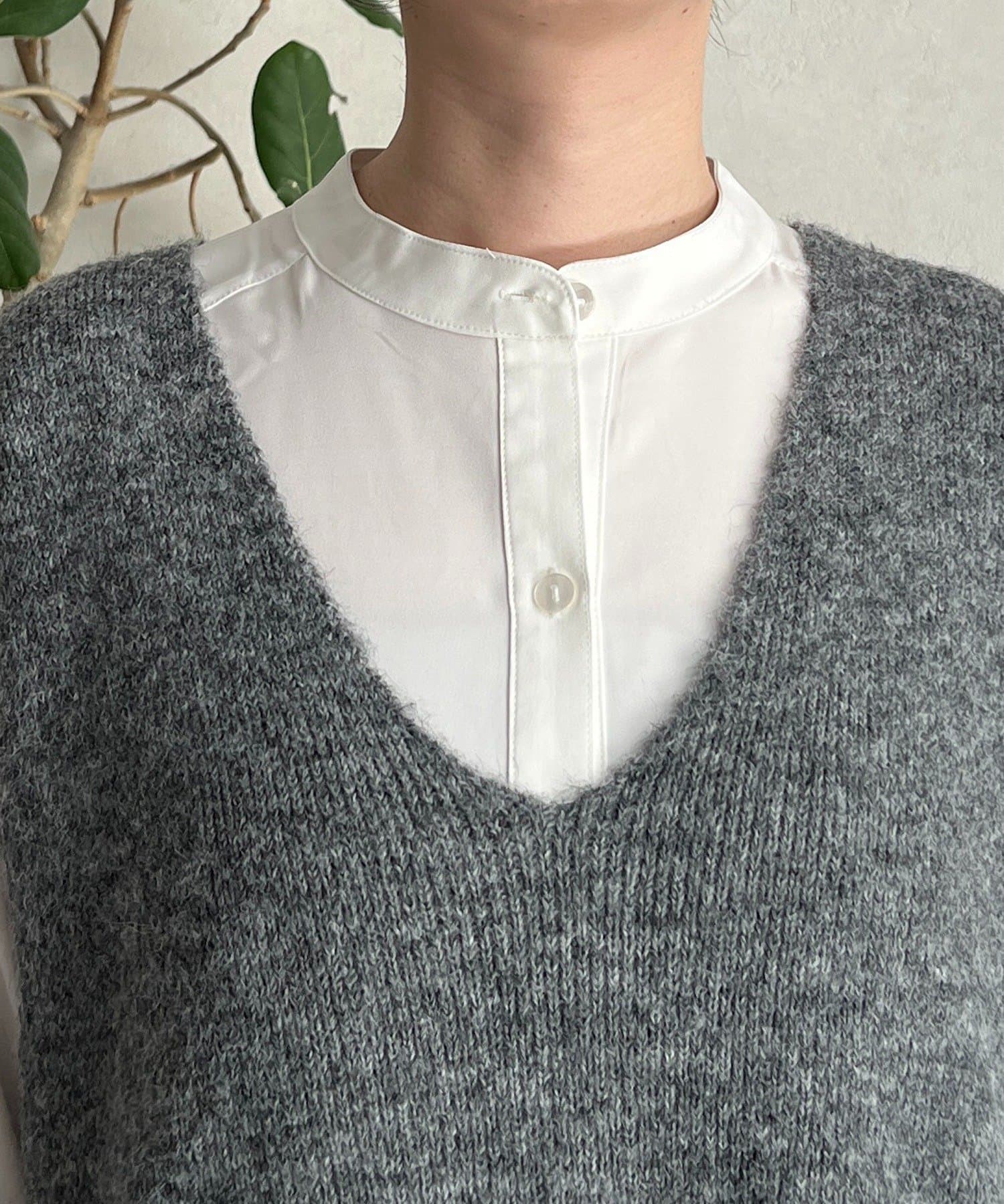 ・シーズンムード満載のニットベストと、バンドカラーシャツでこなれ感あるレイヤードスタイルに◎