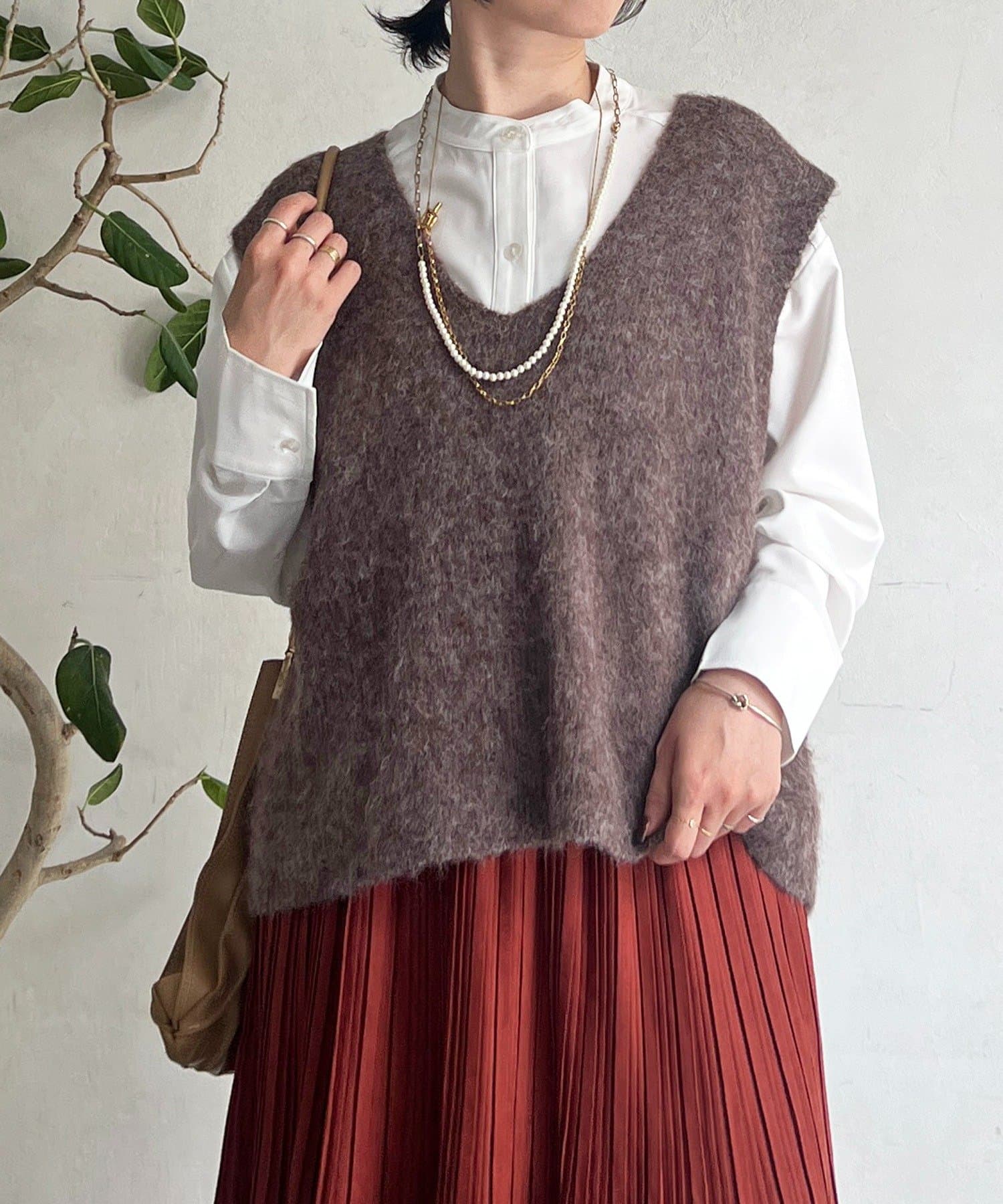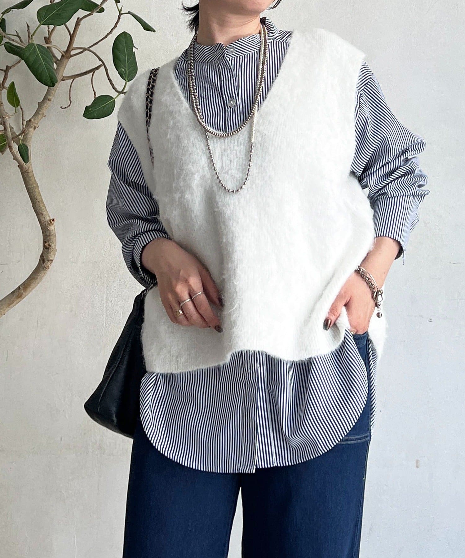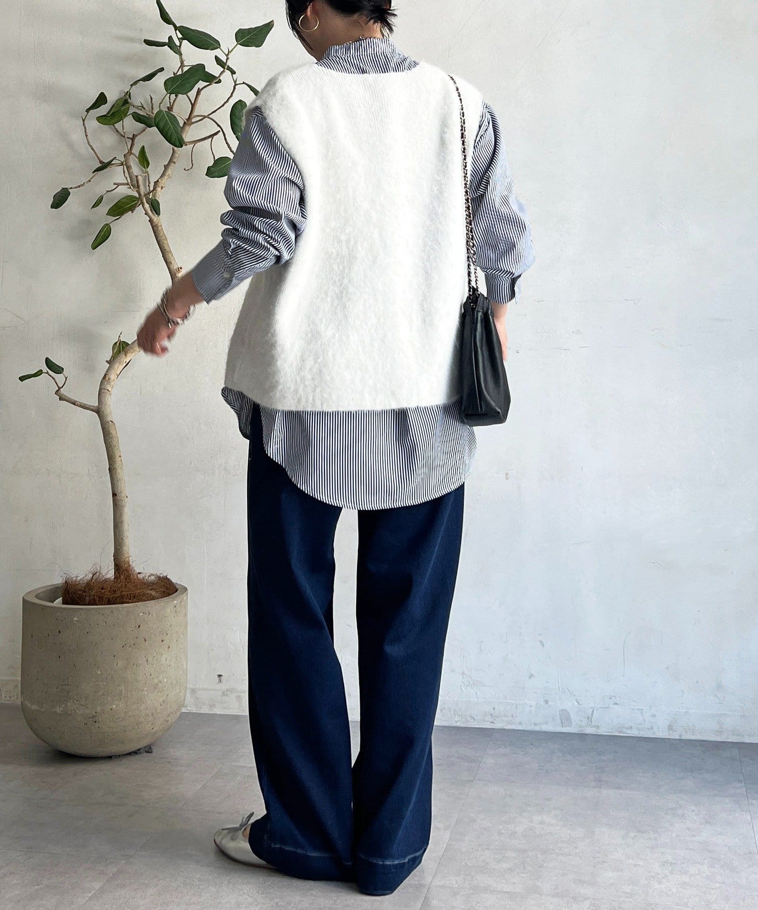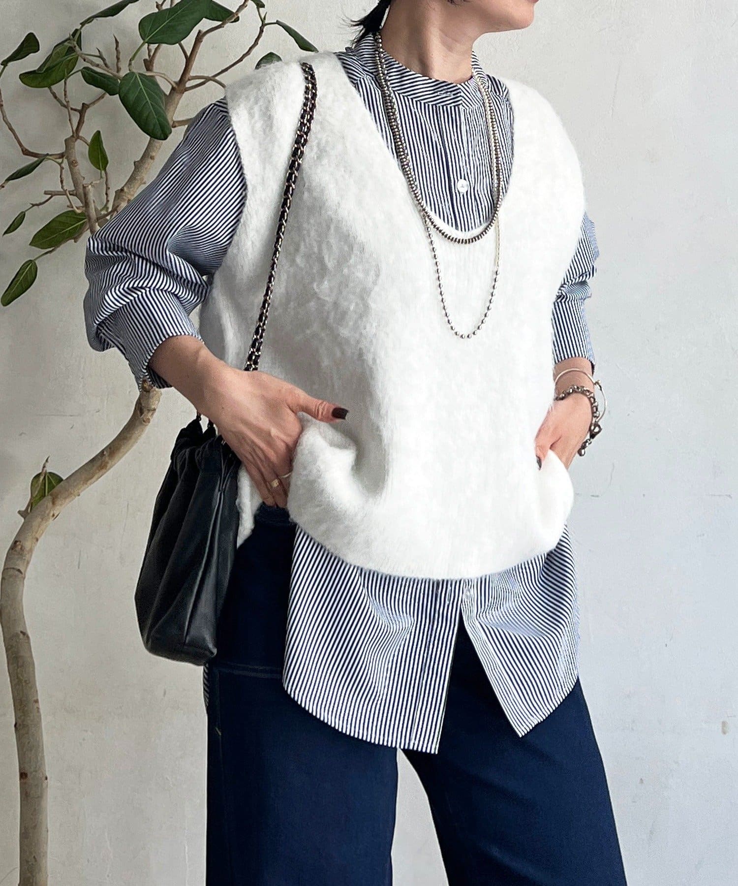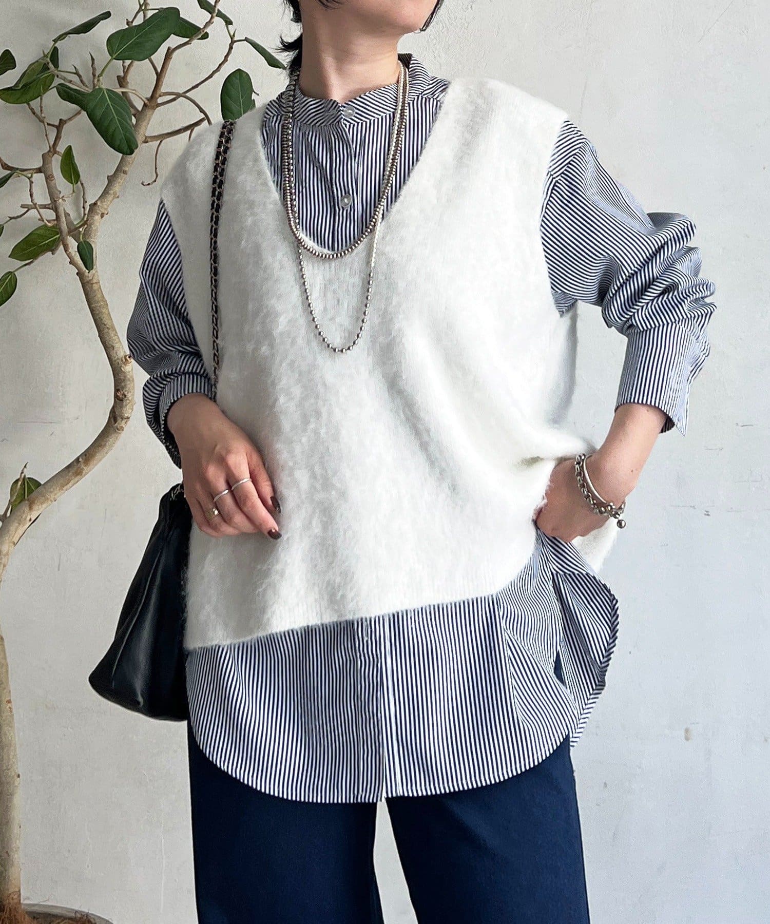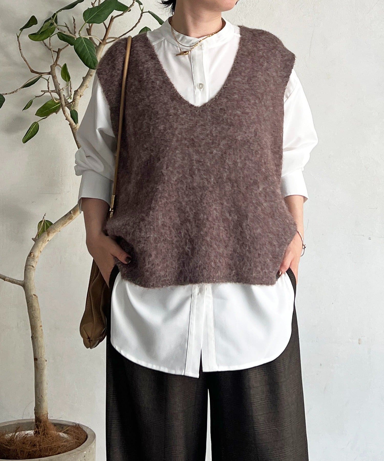 ・シーズンムード満載のニットベストと、バンドカラーシャツでこなれ感あるレイヤードスタイルに◎