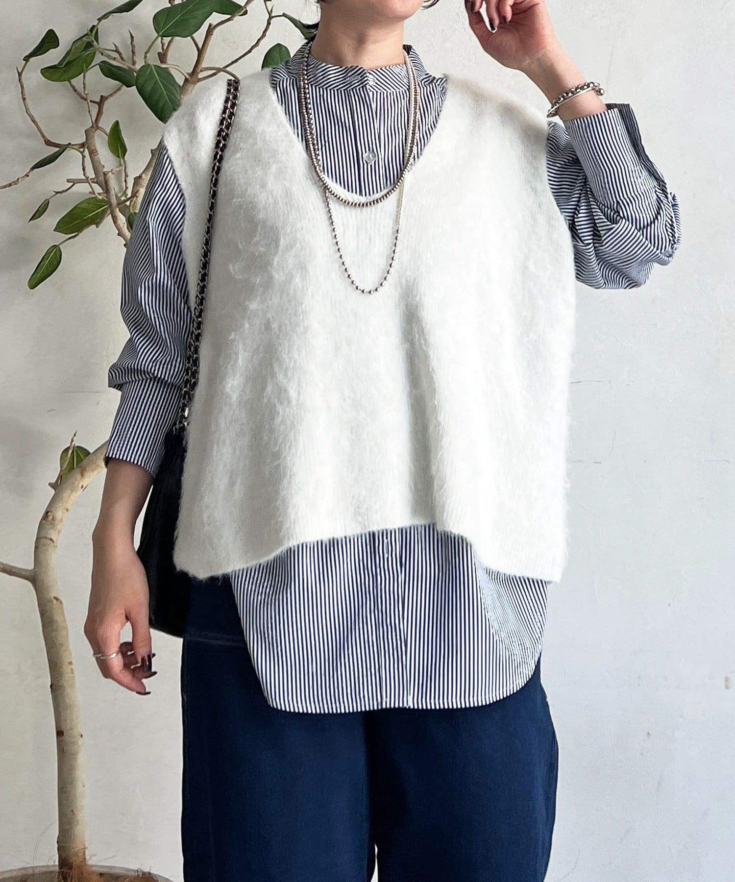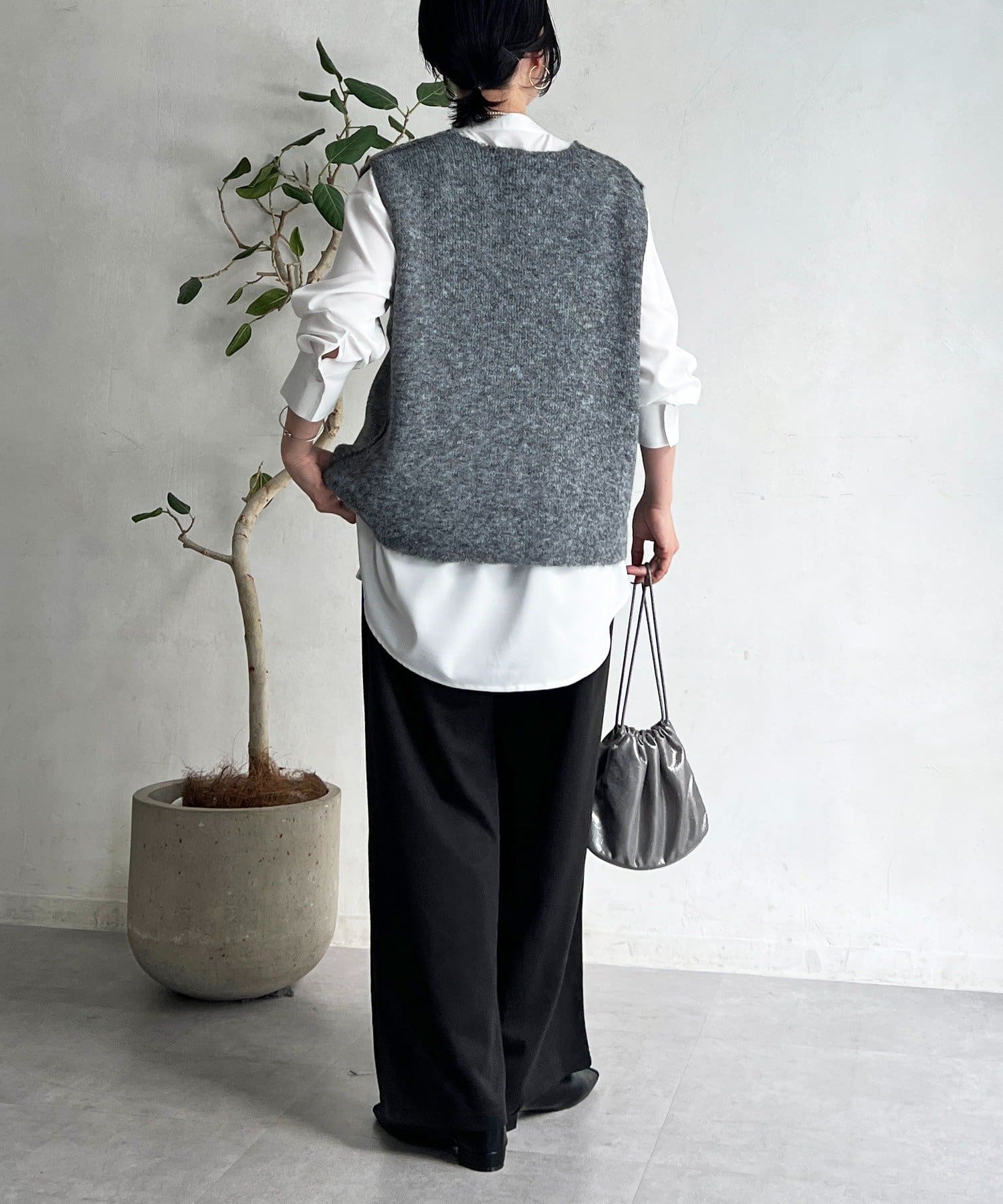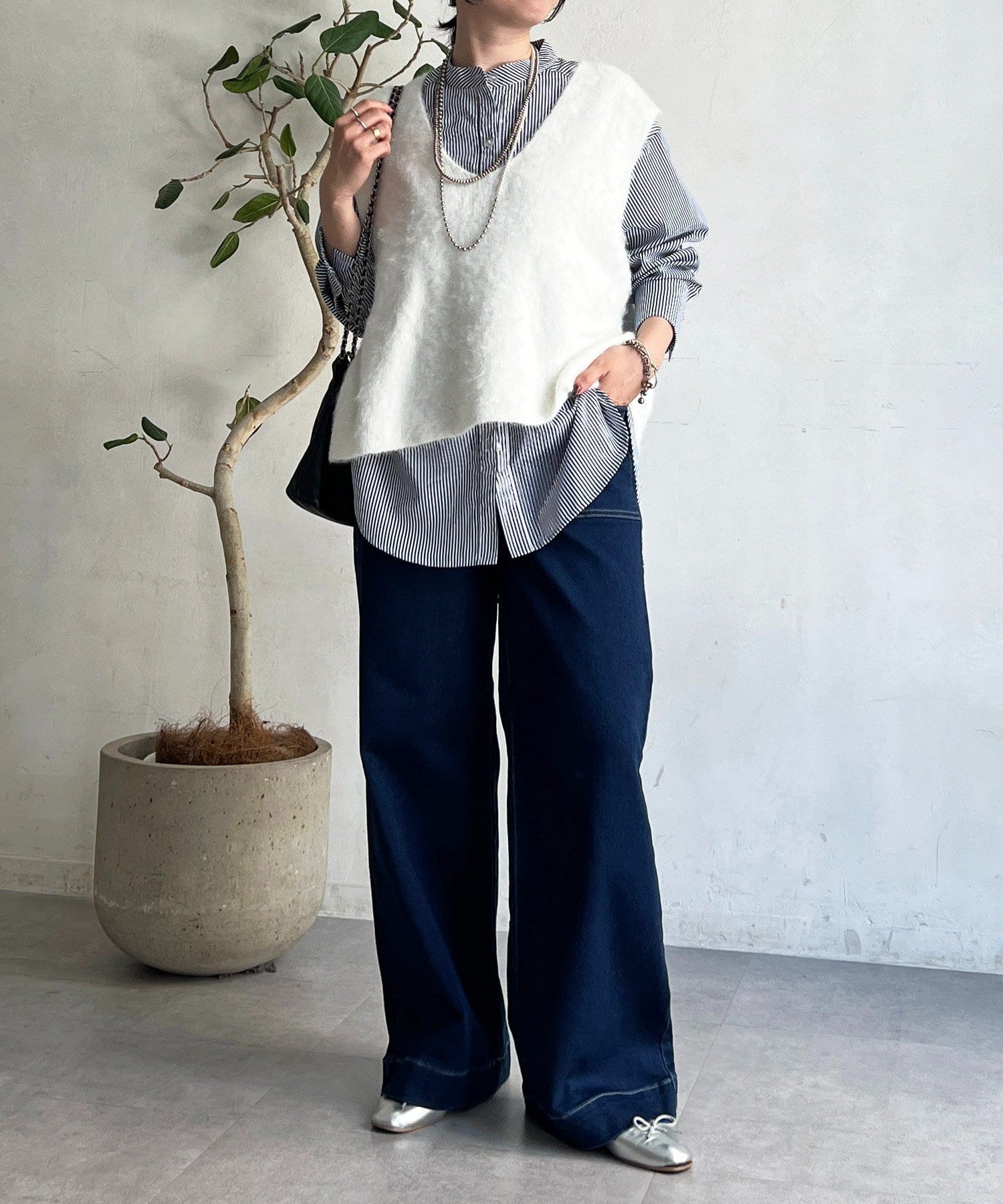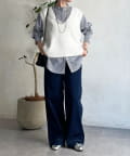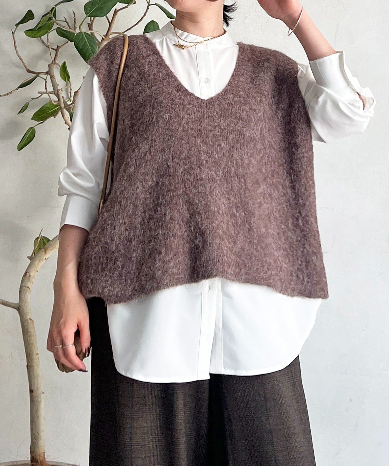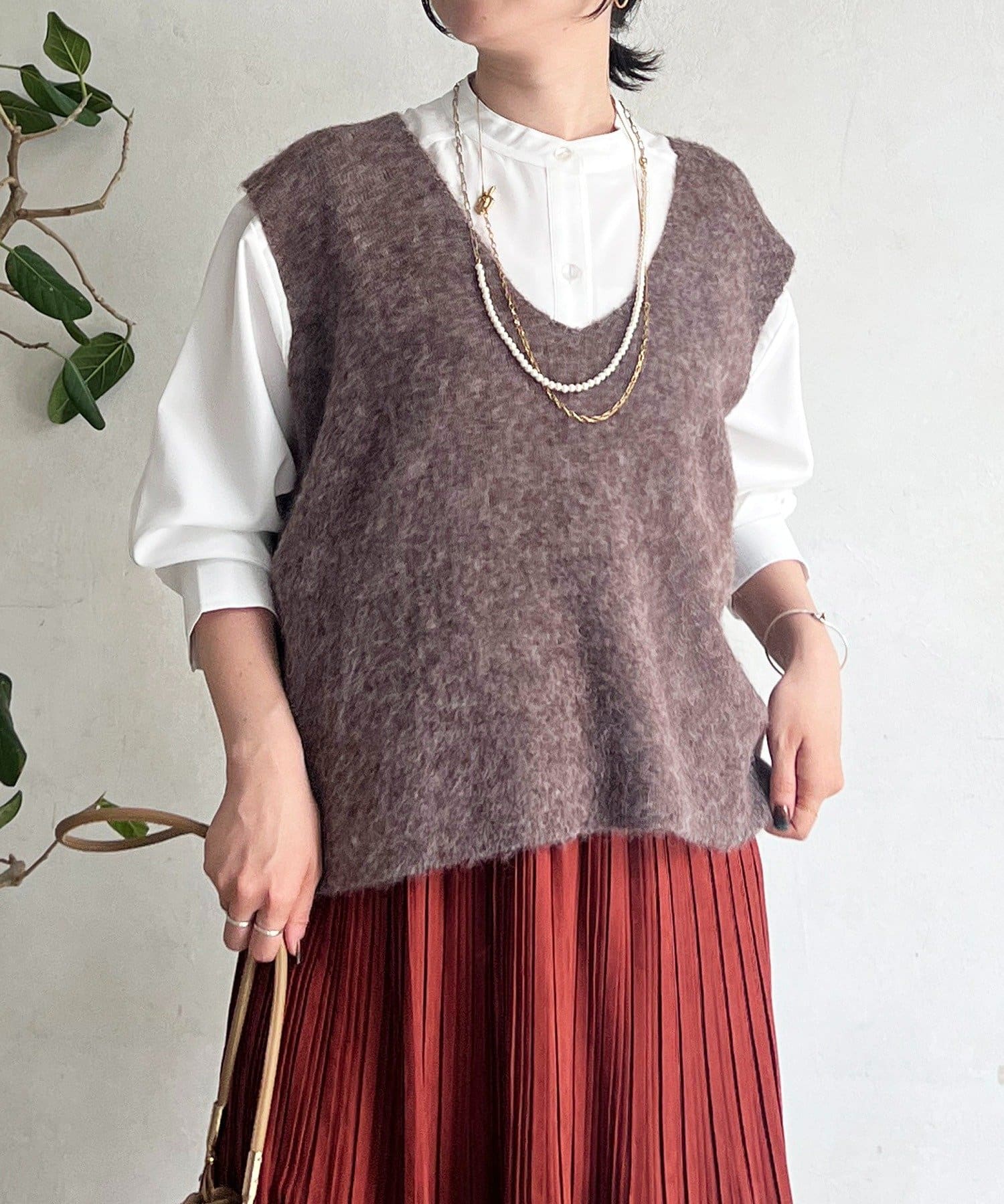・シーズンムード満載のニットベストと、バンドカラーシャツでこなれ感あるレイヤードスタイルに◎