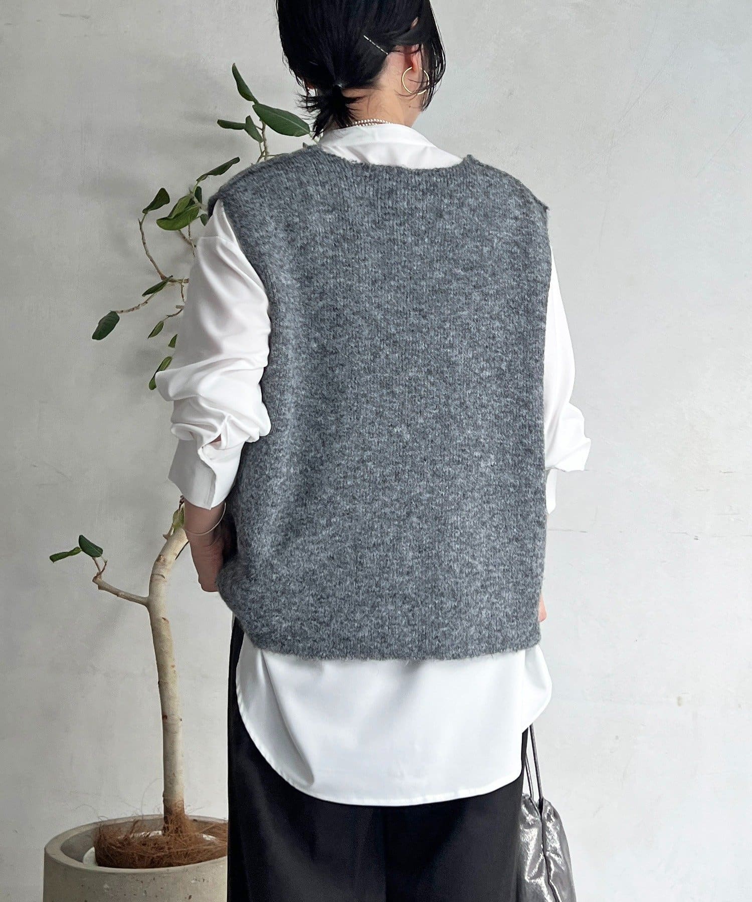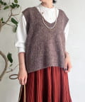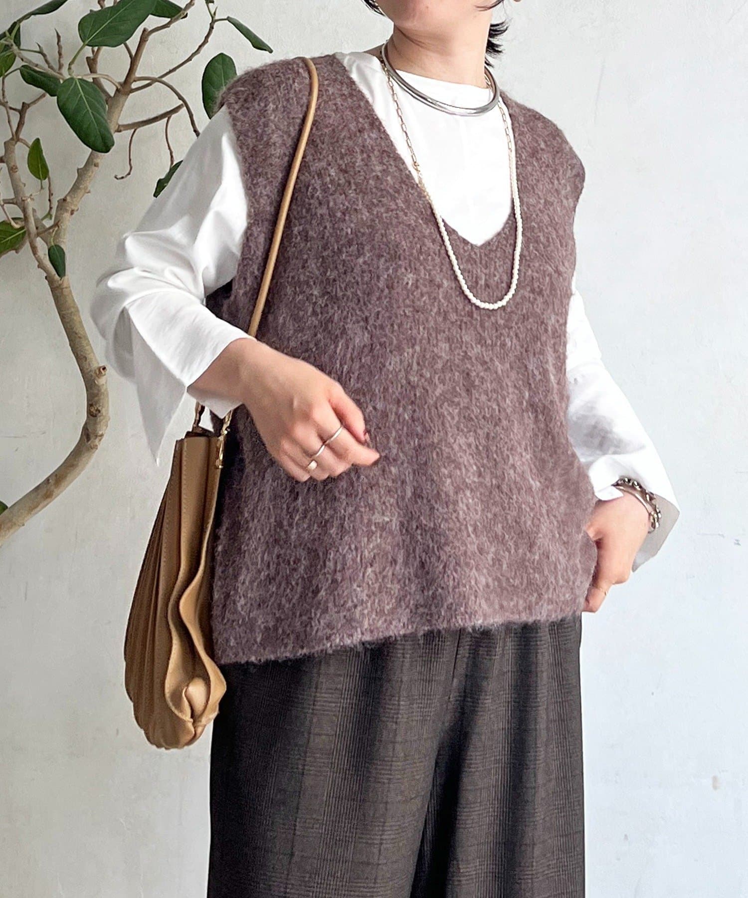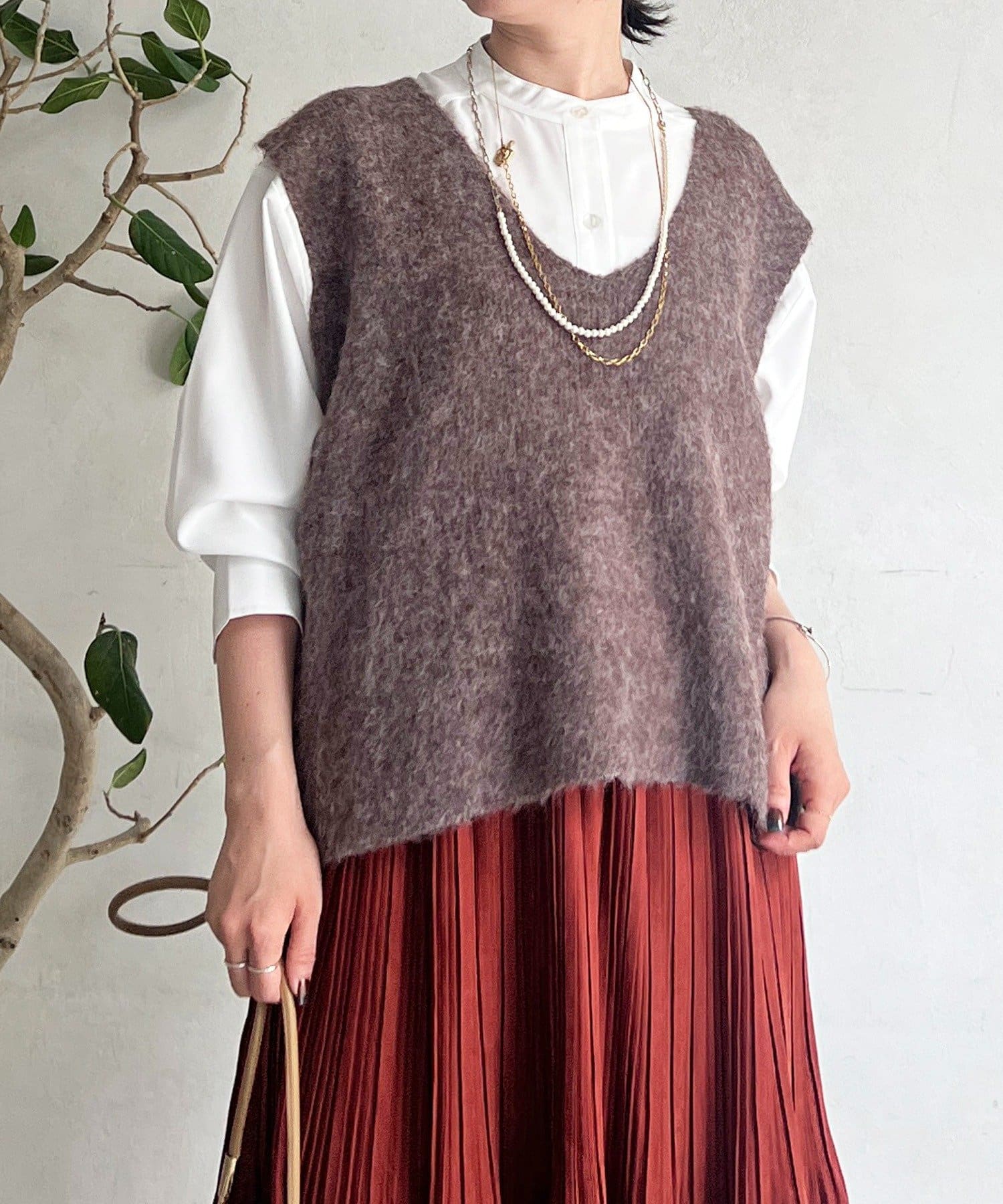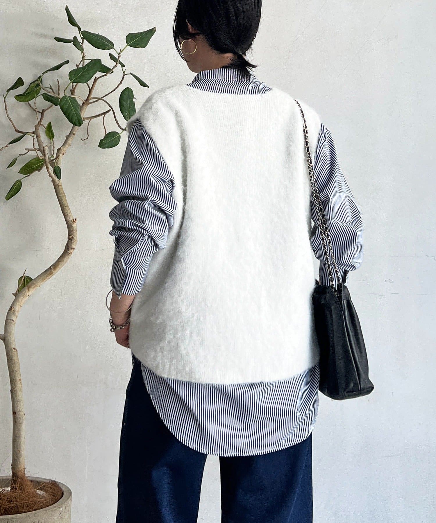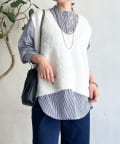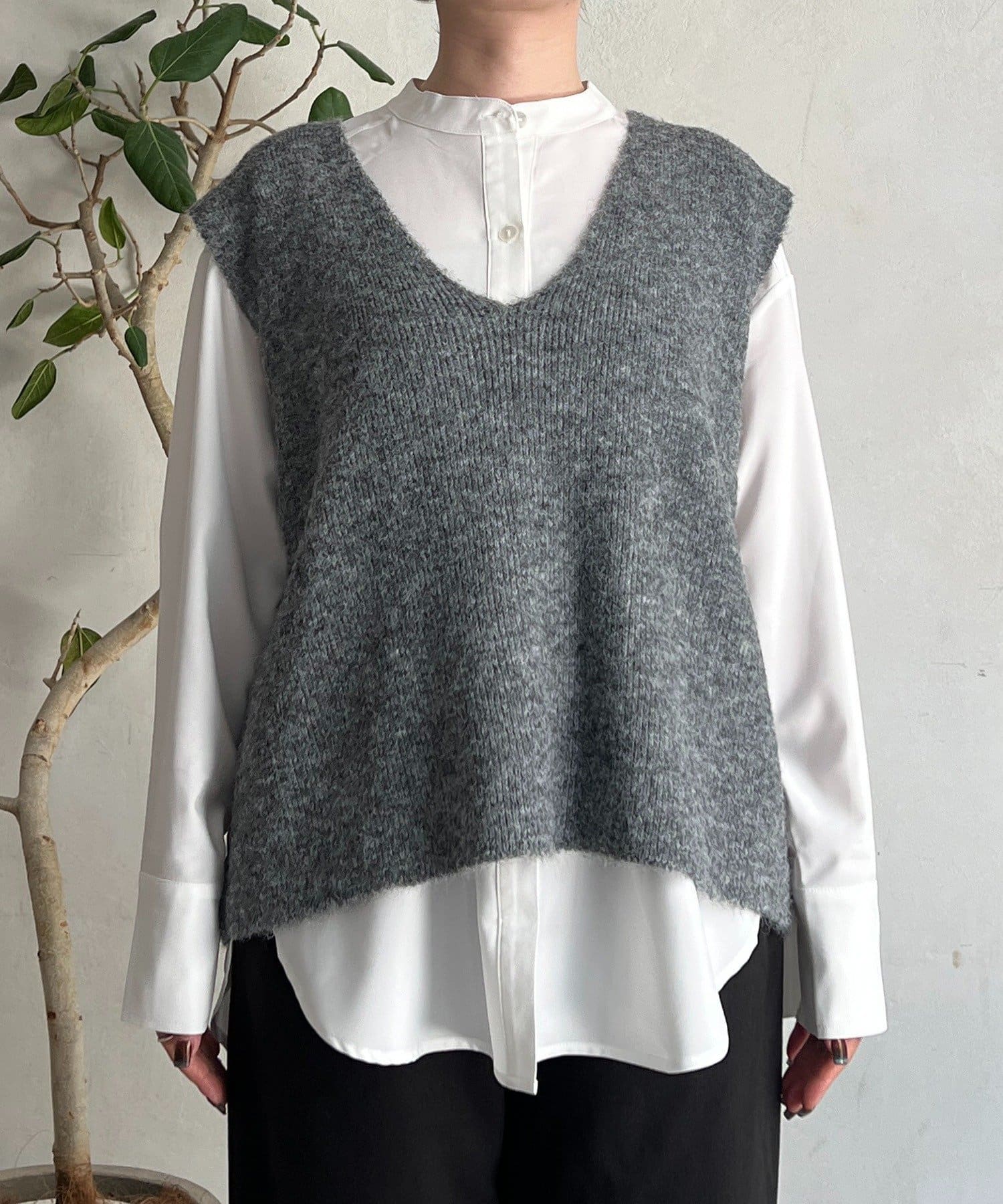 ・シーズンムード満載のニットベストと、バンドカラーシャツでこなれ感あるレイヤードスタイルに◎