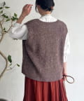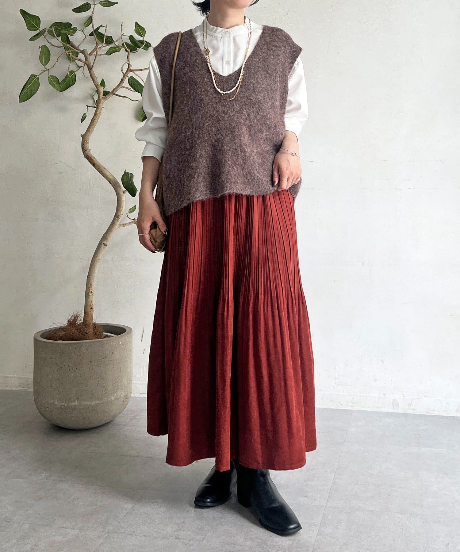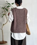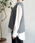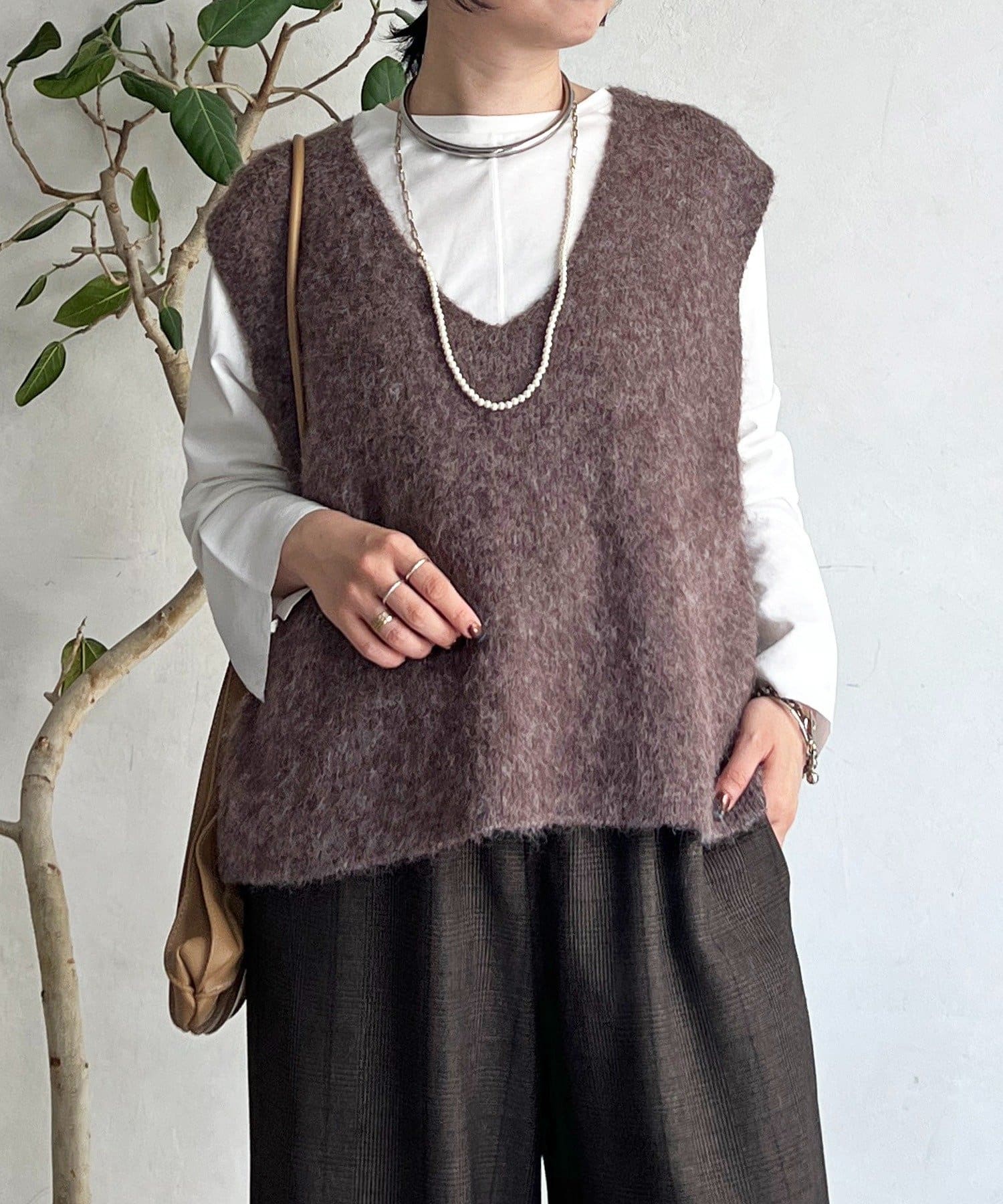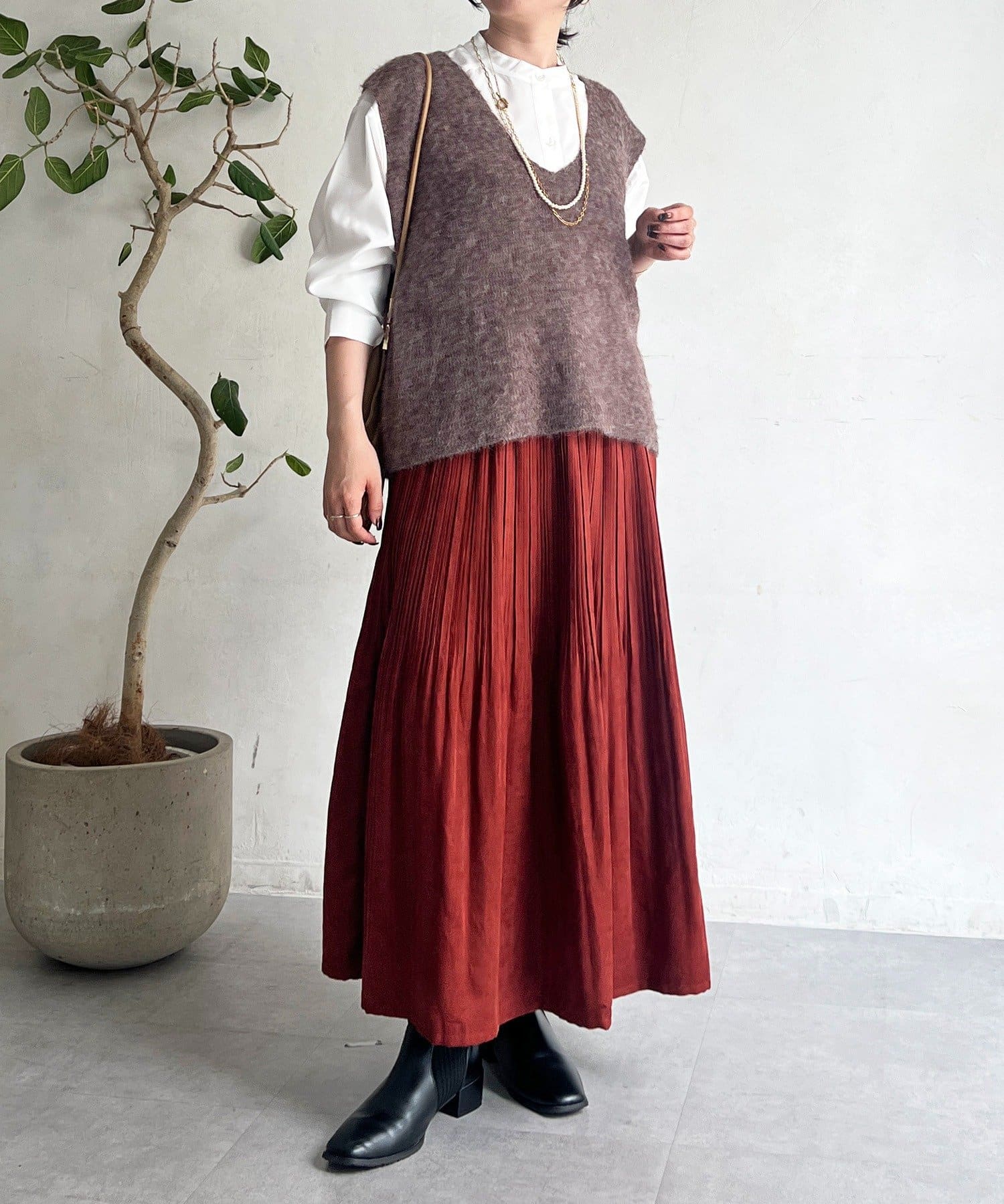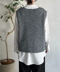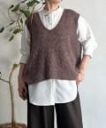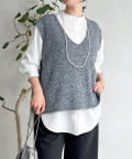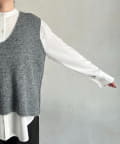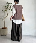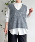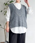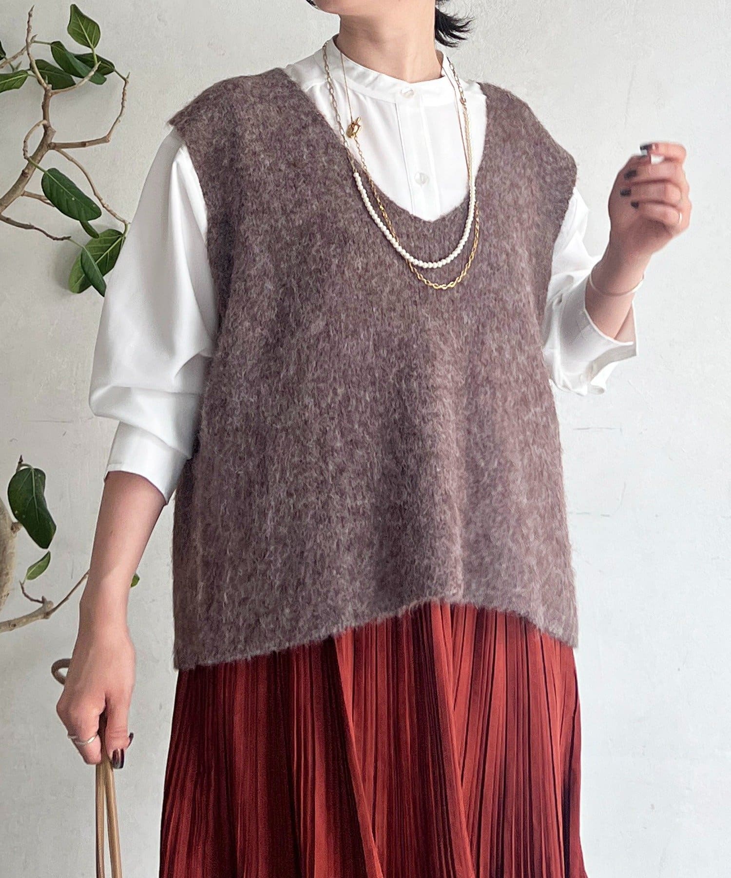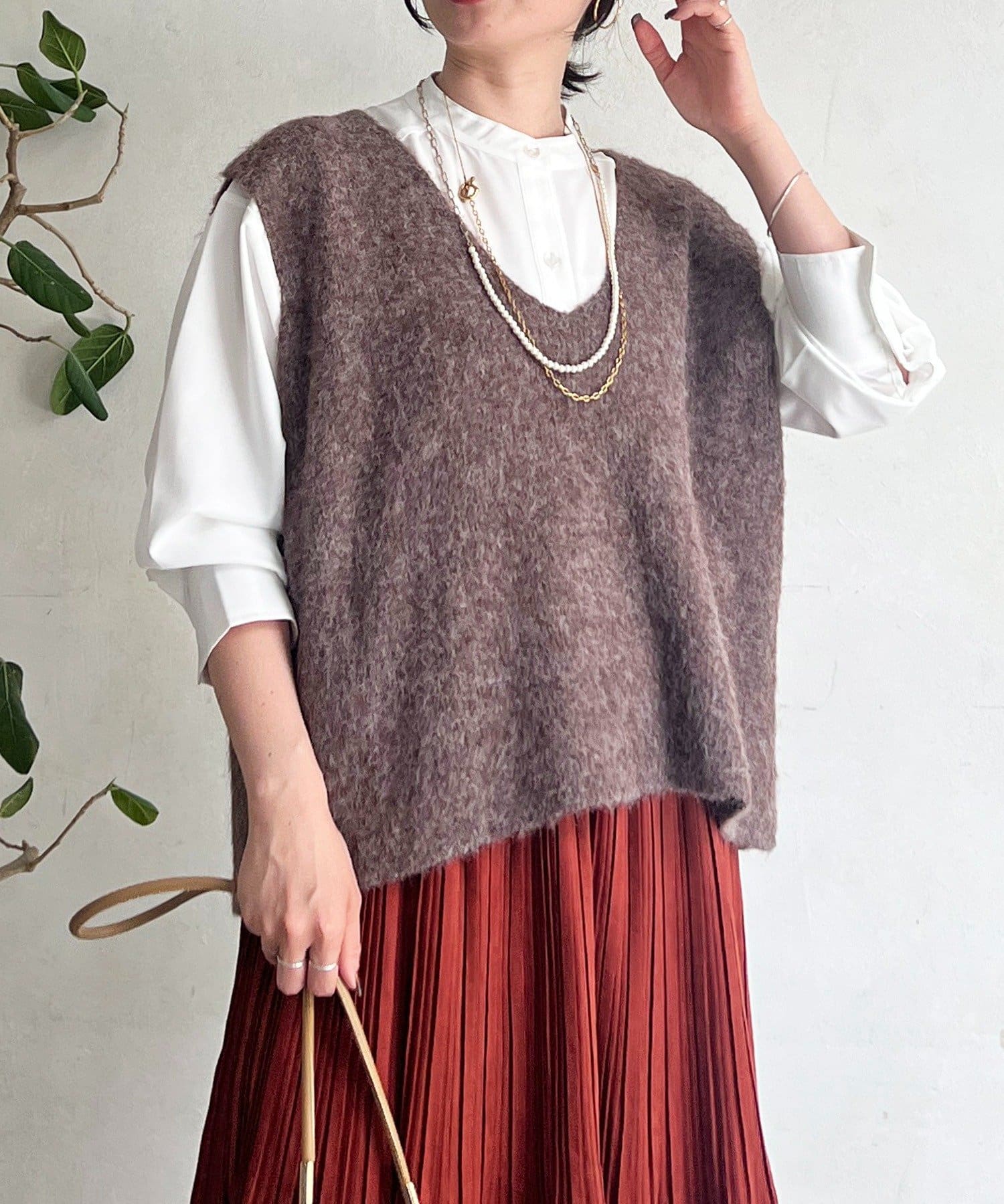 ・シーズンムード満載のニットベストと、バンドカラーシャツでこなれ感あるレイヤードスタイルに◎