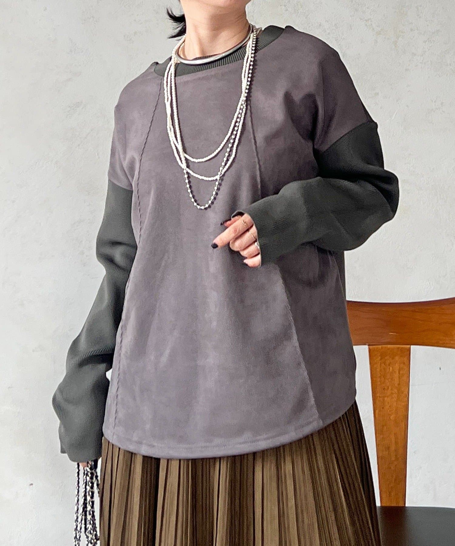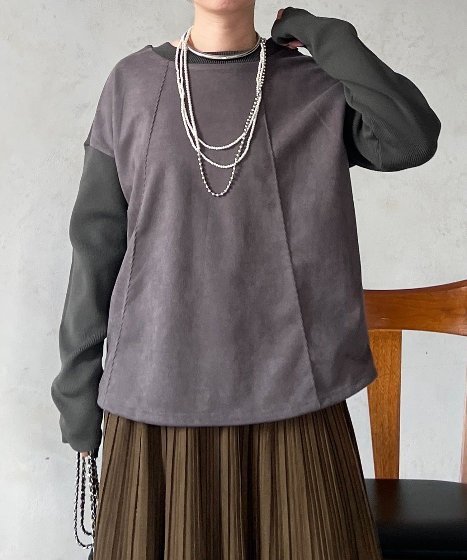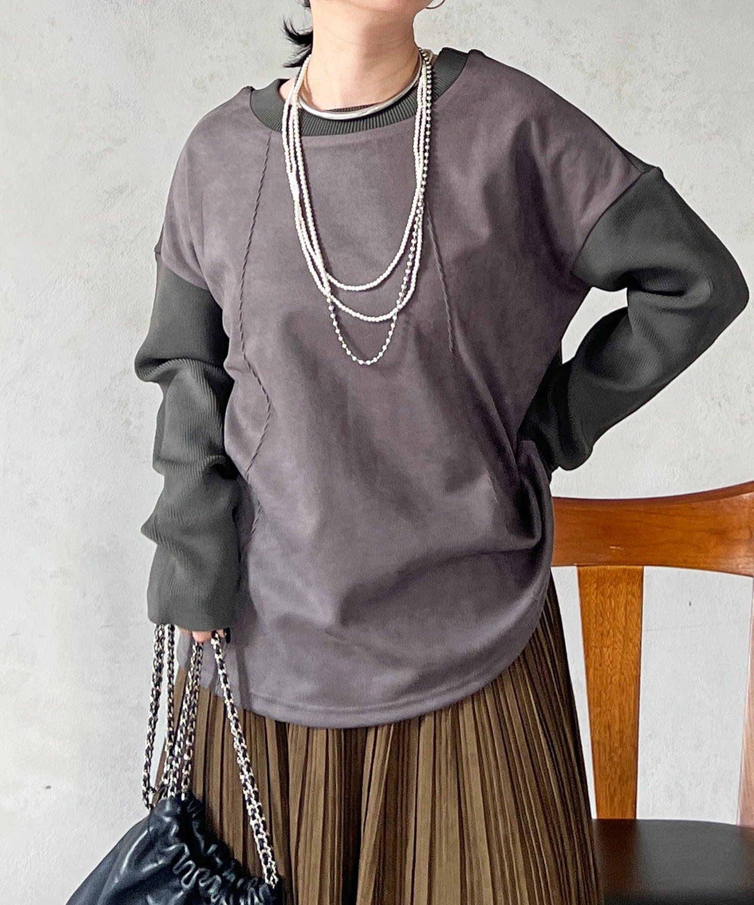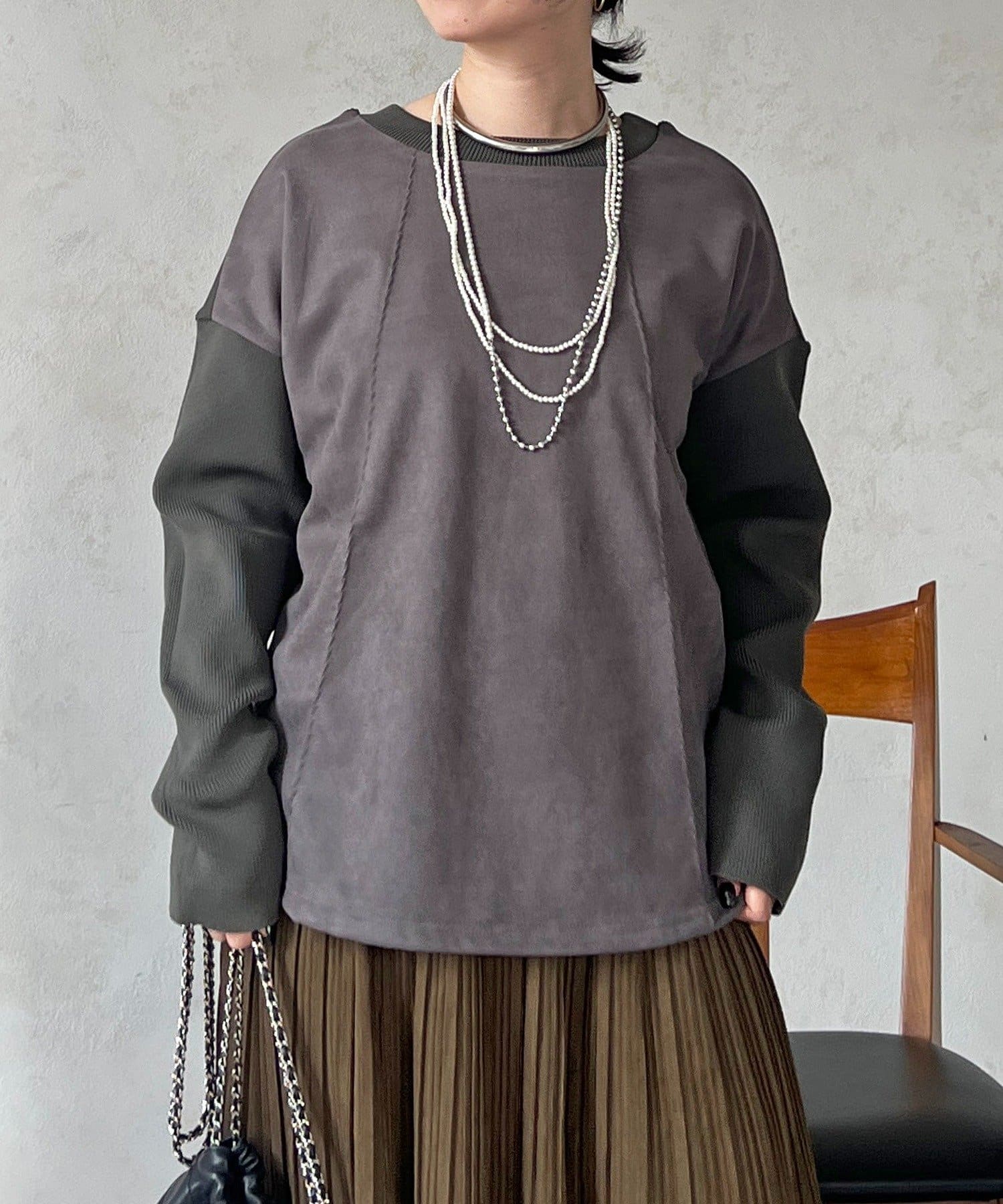 スエードと袖リブニットの切替デザインが一枚でこなれ感を演出