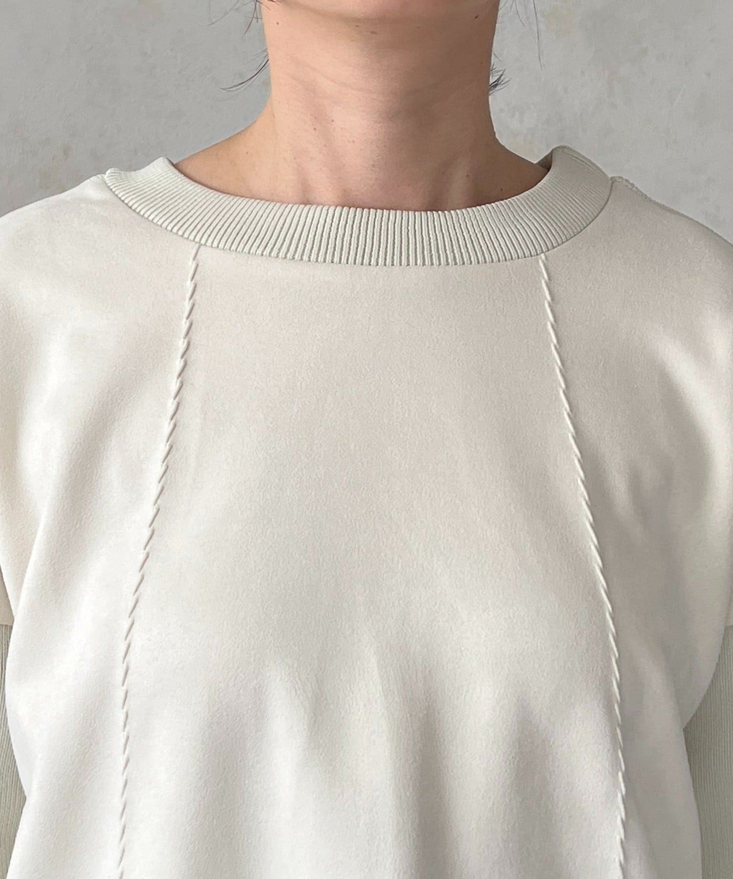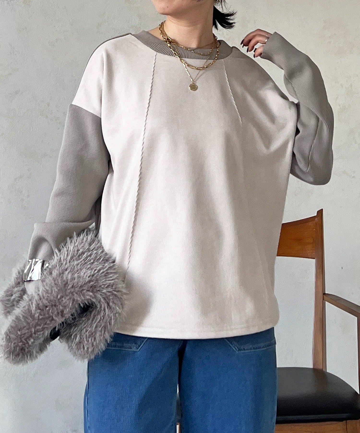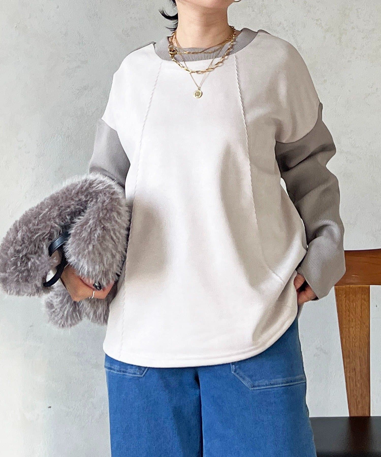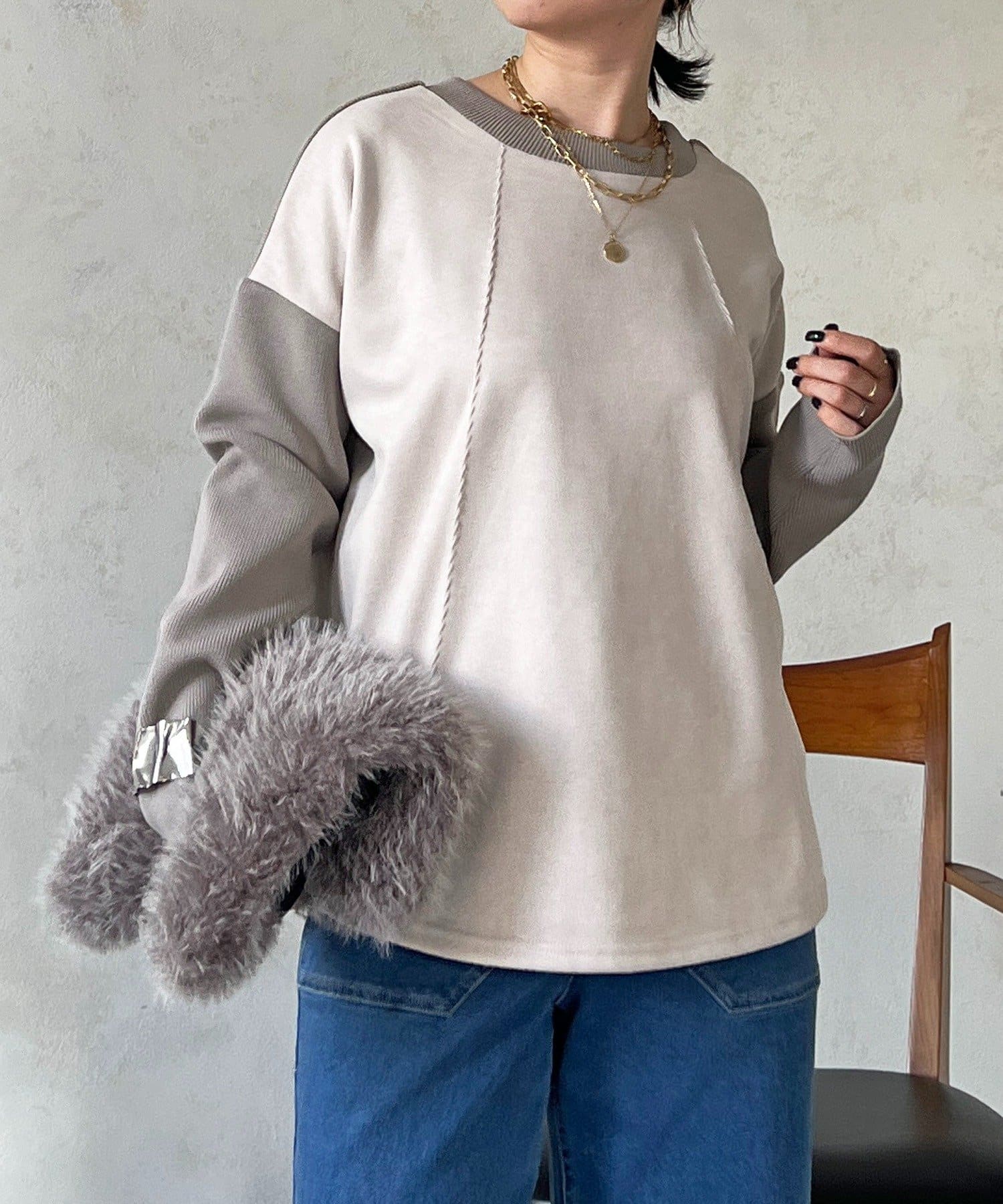 スエードと袖リブニットの切替デザインが一枚でこなれ感を演出